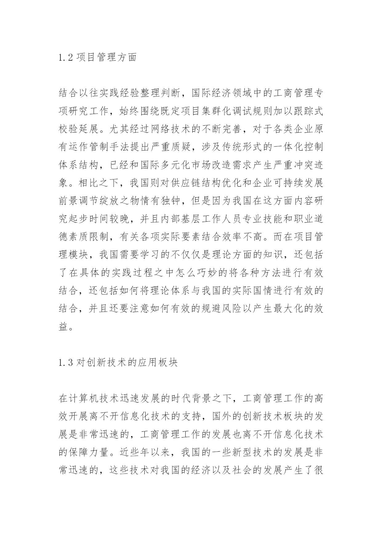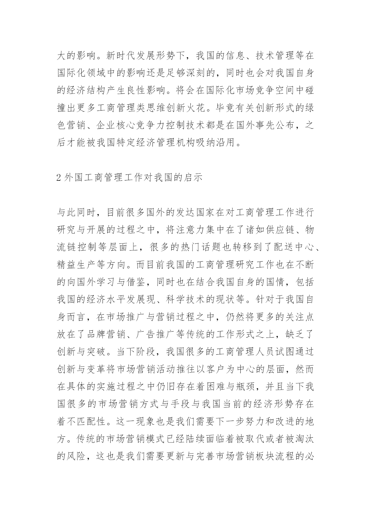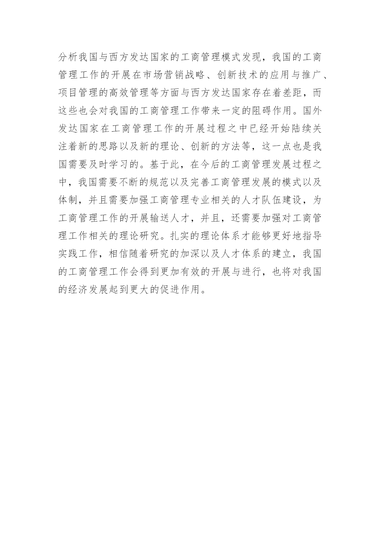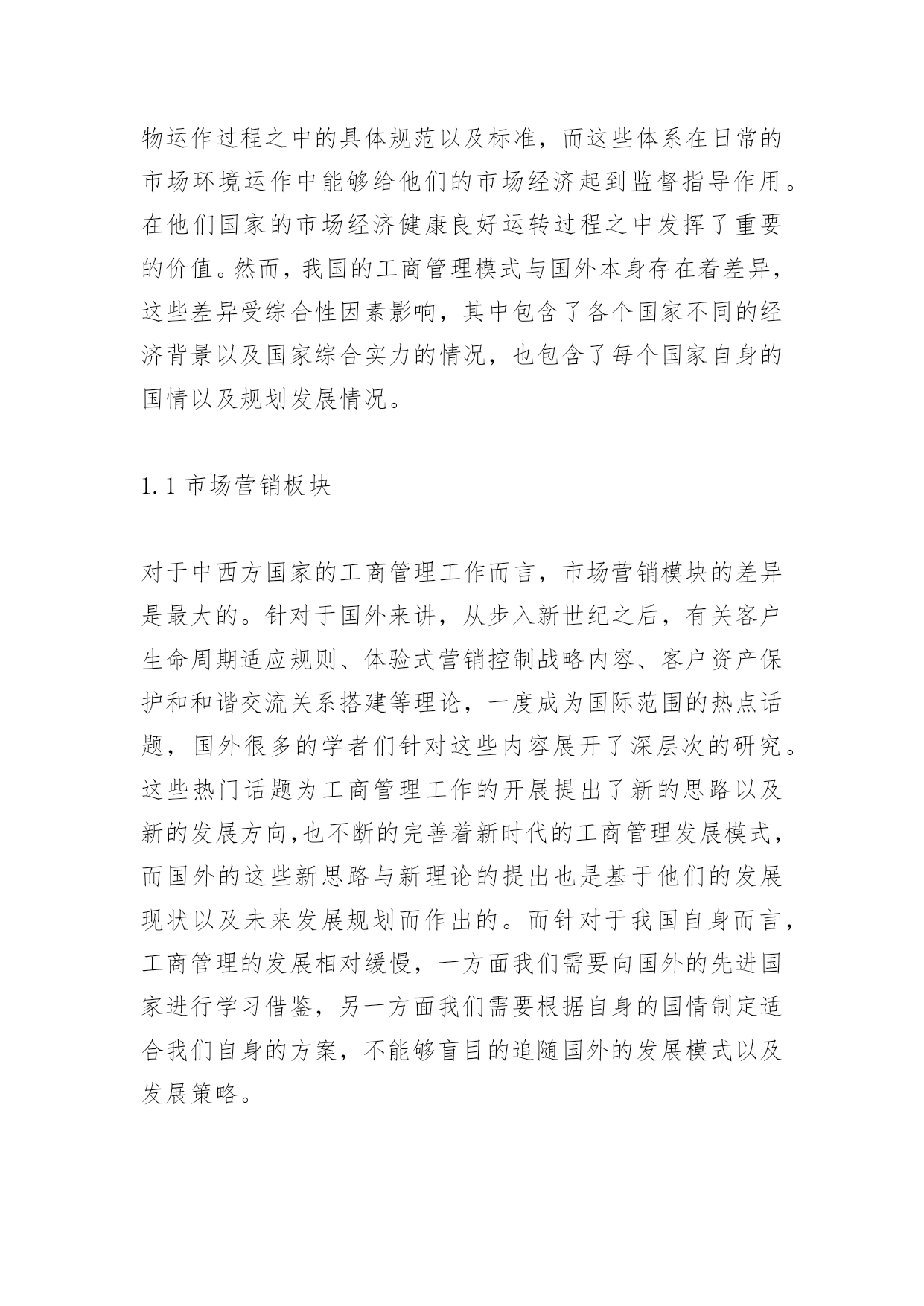 中外工商管理模式比较中外工商管理模式比较摘要:随着经济全球化的进程,我国的市场经济发展也取得了很大的进步,国内市场经济的发展迎来了新形势以及新机遇。并且,当前阶段,我国的国际贸易增多,逐步开始与国际上的很多国家展开合作,对这些国家的市场工商管理模式进行研究对于我国的经济发展至关重要。然而,目前我国的工商管理过程之中尚且存在着一些问题与不足,这些问题也对我国的工商管理工作的开展带来了不良的影响。与此同时,我国自身的工商管理模式与国外的工商管理模式是存在差异的,这些差异与不同的国情有关。本文在研究国内外工商管理模式的不同的基础之上,对规范我国的工商管理的发展提出了建议与政策,以期对我国的市场经济的发展起到促进作用。关键词:工商管理模式;发展现状;问题及对策1中外工商管理模式的特点以及差异对于西方发达国家来说,其综合实力相对较强、经济发展水平比较高。在处理特定的工商管理事务上具有自身的特色。截止目前,很多的西方发达国家已经建立起了自身的一套比较完善的学科规范体系,这些体系指出了在日常工商管理事物运作过程之中的具体规范以及标准,而这些体系在日常的市场环境运作中能够给他们的市场经济起到监督指导作用。在他们国家的市场经济健康良好运转过程之中发挥了重要的价值。然而,我国的工商管理模式与国外本身存在着差异,这些差异受综合性因素影响,其中包含了各个国家不同的经济背景以及国家综合实力的情况,也包含了每个国家自身的国情以及规划发展情况。1.1市场营销板块对于中西方国家的工商管理工作而言,市场营销模块的差异是最大的。针对于国外来讲,从步入新世纪之后,有关客户生命周期适应规则、体验式营销控制战略内容、客户资产保护和和谐交流关系搭建等理论,一度成为国际范围的热点话题,国外很多的学者们针对这些内容展开了深层次的研究。这些热门话题为工商管理工作的开展提出了新的思路以及新的发展方向,也不断的完善着新时代的工商管理发展模式,而国外的这些新思路与新理论的提出也是基于他们的发展现状以及未来发展规划而作出的。而针对于我国自身而言,工商管理的发展相对缓慢,一方面我们需要向国外的先进国家进行学习借鉴,另一方面我们需要根据自身的国情制定适合我们自身的方案,不能够盲目的追随国外的发展模式以及发展策略。1.2项目管理方面结合以往实践经验整理判断,国际经济领域中的工商管理专项研究工作,始终围绕既定项目集群化调试规则加以跟踪式校验延展。尤其经过网络技术的不断完善,对于各类企业原有运作管制手法提出严重质疑,涉及传统形式的一体化控制体系结构,已经和国际多元化市场改造需求产生严重冲突迹象。相比之下,我国则对供应链结构优化和企业可持续发展前景调节绽放之物情有独钟,但是因为我国在这方面内容研究起步时间较晚,并且内部基层工作人员专业技能和职业道德素质限制,有关各项实际要素结合效率不高。而在项目管理模块,我国需要学习的不仅仅是理论方面的知识,还包括了在具体的实践过程之中怎么巧妙的将各种方法进行有效结合,还包括如何将理论体系与我国的实际国情进行有效的结合,并且还要注意如何有效的规避风险以产生最大化的效益。1.3对创新技术的应用板块在计算机技术迅速发展的时代背景之下,工商管理工作的高效开展离不开信息化技术的支持,国外的创新技术板块的发展是非常迅速的,工商管理工作的发展也离不开信息化技术的保障力量。近些年以来,我国的一些新型技术的发展是非常迅速的,这些技术对我国的经济以及社会的发展产生了很大的影响。新时代发展形势下,我国的信息、技术管理等在国际化领域中的影响还是足够深刻的,同时也会对我国自身的经济结构产生良性影响。将会在国际化市场竞争空间中碰撞出更多工商管理类思维创新火花。毕竟有关创新形式的绿色营销、企业核心竞争力控制技术都是在国外事先公布,之后才能被我国特定经济管理机构吸纳沿用。2外国工商管理工作对我国的启示与此同时,目前很多国外的发达国家在对工商管理工作进行研究与开展的过程之中,将注意力集中在了诸如供应链、物流链控制等层面上,很多的热门话题也转移到了配送中心、精益生产等方向。而目前我国的工商管理研究工作也在不断的向国外学习与借鉴,同时也在结合我国自身的国情,包括我国的经济水平发展现、科学技术的现状等。针对于我国自身而言,在市场推广与营销过程之中,仍然将更多的关注点放在了品牌营销、广告推广等传统的工作形式之上,缺乏了创新与突破。当下阶段,我国很多的工商管理人员试图通过创新与变革将市场营销活动推往以客户为中心的层面,然而在具体的实施过程之中仍旧存在着困难与瓶颈,并且当下我国很多的市场营销方式与手段与我国当前的经济形势存在着不匹配性。这一现象也是我们需要下一步努力和改进的地方。传统的市场营销模式已经陆续面临着被取代或者被淘汰的风险,这也是我们需要更新与完善市场营销板块流程的必要性。目前国内工商管理研