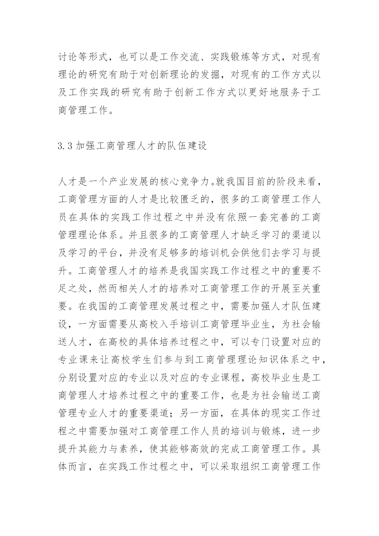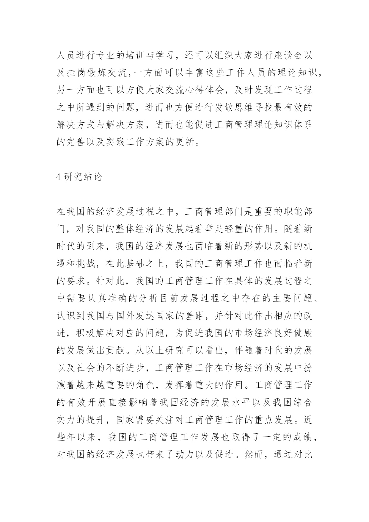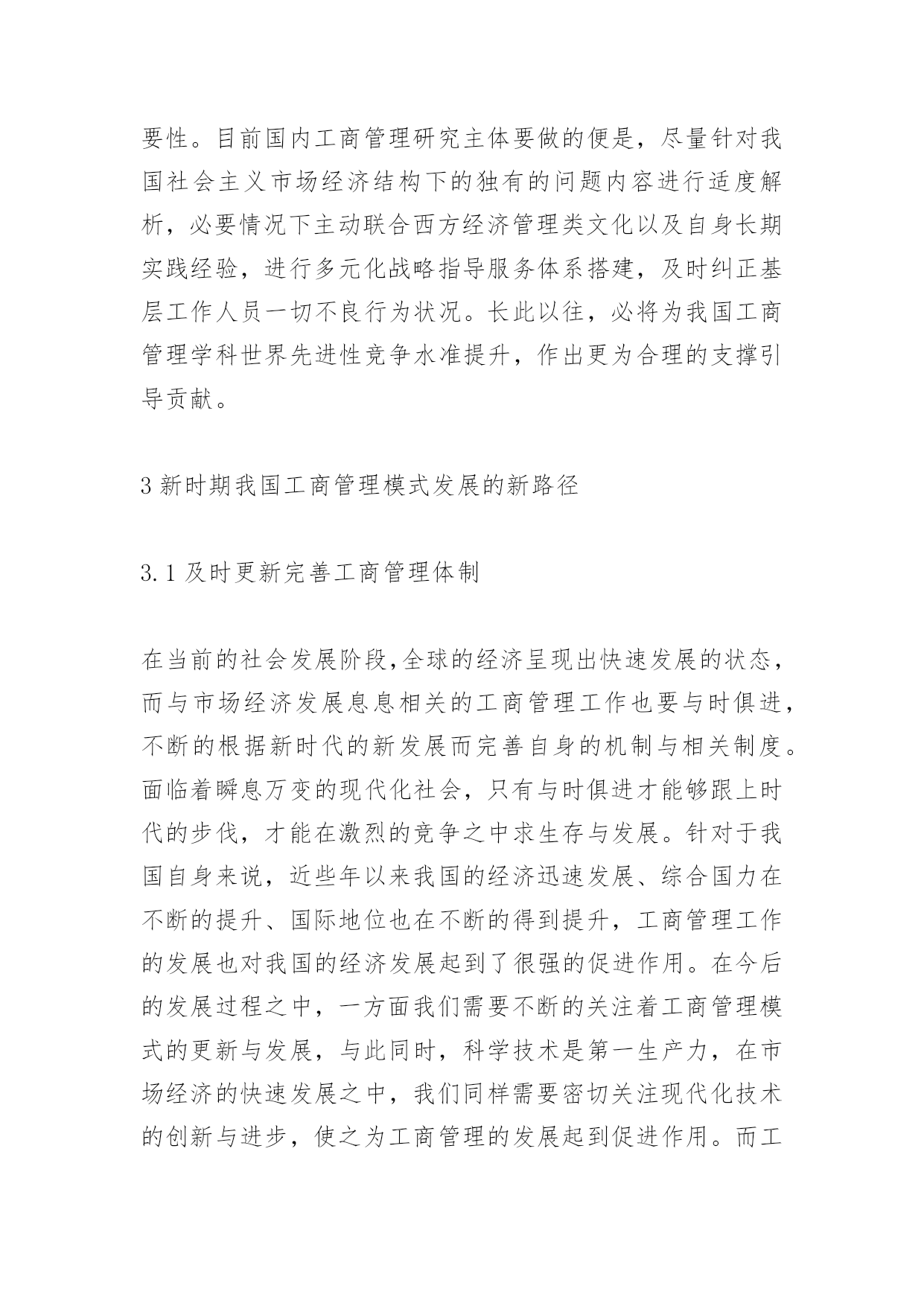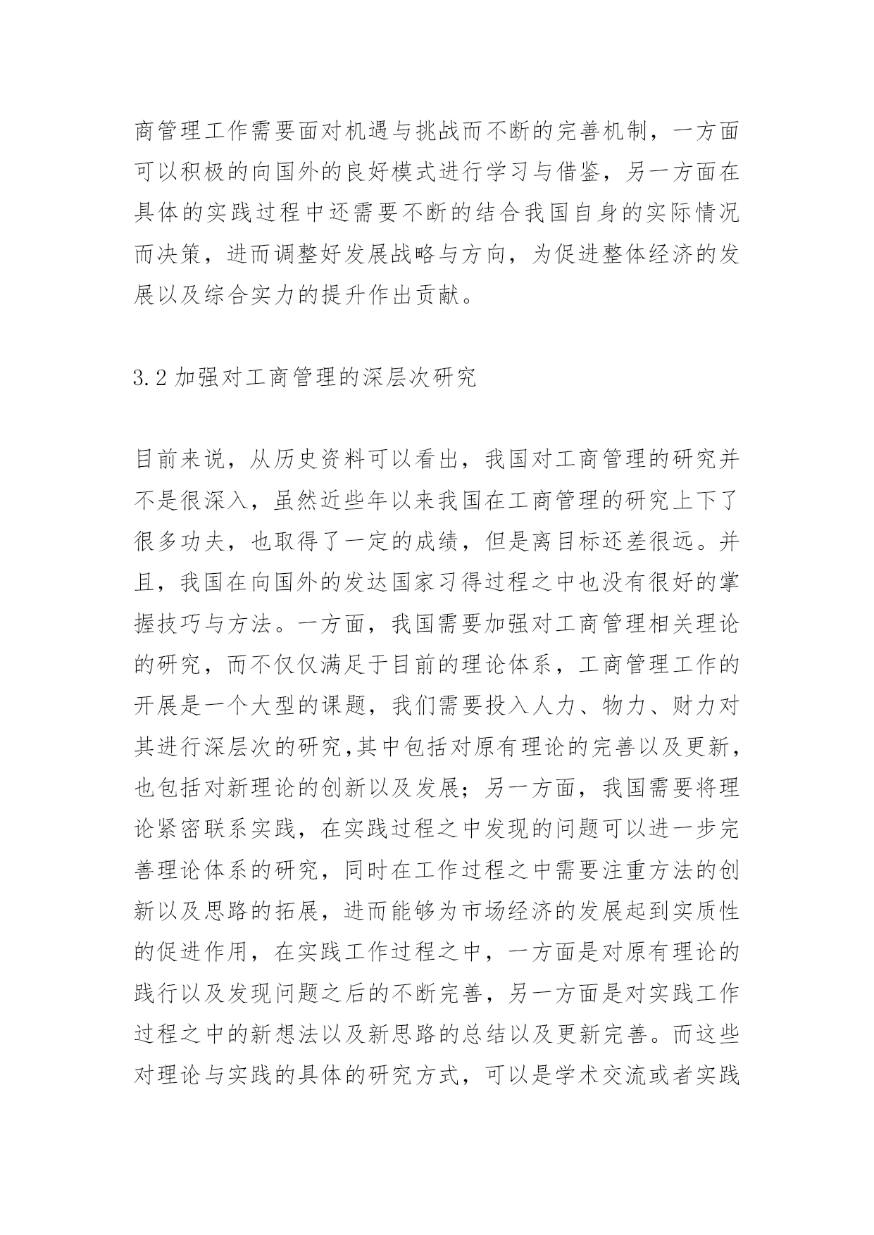 中外工商管理模式比较中外工商管理模式比较摘要:随着经济全球化的进程,我国的市场经济发展也取得了很大的进步,国内市场经济的发展迎来了新形势以及新机遇。并且,当前阶段,我国的国际贸易增多,逐步开始与国际上的很多国家展开合作,对这些国家的市场工商管理模式进行研究对于我国的经济发展至关重要。然而,目前我国的工商管理过程之中尚且存在着一些问题与不足,这些问题也对我国的工商管理工作的开展带来了不良的影响。与此同时,我国自身的工商管理模式与国外的工商管理模式是存在差异的,这些差异与不同的国情有关。本文在研究国内外工商管理模式的不同的基础之上,对规范我国的工商管理的发展提出了建议与政策,以期对我国的市场经济的发展起到促进作用。关键词:工商管理模式;发展现状;问题及对策1中外工商管理模式的特点以及差异对于西方发达国家来说,其综合实力相对较强、经济发展水平比较高。在处理特定的工商管理事务上具有自身的特色。截止目前,很多的西方发达国家已经建立起了自身的一套比较完善的学科规范体系,这些体系指出了在日常工商管理事物运作过程之中的具体规范以及标准,而这些体系在日常的市场环境运作中能够给他们的市场经济起到监督指导作用。在他们国家的市场经济健康良好运转过程之中发挥了重要的价值。然而,我国的工商管理模式与国外本身存在着差异,这些差异受综合性因素影响,其中包含了各个国家不同的经济背景以及国家综合实力的情况,也包含了每个国家自身的国情以及规划发展情况。1.1市场营销板块对于中西方国家的工商管理工作而言,市场营销模块的差异是最大的。针对于国外来讲,从步入新世纪之后,有关客户生命周期适应规则、体验式营销控制战略内容、客户资产保护和和谐交流关系搭建等理论,一度成为国际范围的热点话题,国外很多的学者们针对这些内容展开了深层次的研究。这些热门话题为工商管理工作的开展提出了新的思路以及新的发展方向,也不断的完善着新时代的工商管理发展模式,而国外的这些新思路与新理论的提出也是基于他们的发展现状以及未来发展规划而作出的。而针对于我国自身而言,工商管理的发展相对缓慢,一方面我们需要向国外的先进国家进行学习借鉴,另一方面我们需要根据自身的国情制定适合我们自身的方案,不能够盲目的追随国外的发展模式以及发展策略。1.2项目管理方面结合以往实践经验整理判断,国际经济领域中的工商管理专项研究工作,始终围绕既定项目集群化调试规则加以跟踪式校验延展。尤其经过网络技术的不断完善,对于各类企业原有运作管制手法提出严重质疑,涉及传统形式的一体化控制体系结构,已经和国际多元化市场改造需求产生严重冲突迹象。相比之下,我国则对供应链结构优化和企业可持续发展前景调节绽放之物情有独钟,但是因为我国在这方面内容研究起步时间较晚,并且内部基层工作人员专业技能和职业道德素质限制,有关各项实际要素结合效率不高。而在项目管理模块,我国需要学习的不仅仅是理论方面的知识,还包括了在具体的实践过程之中怎么巧妙的将各种方法进行有效结合,还包括如何将理论体系与我国的实际国情进行有效的结合,并且还要注意如何有效的规避风险以产生最大化的效益。1.3对创新技术的应用板块在计算机技术迅速发展的时代背景之下,工商管理工作的高效开展离不开信息化技术的支持,国外的创新技术板块的发展是非常迅速的,工商管理工作的发展也离不开信息化技术的保障力量。近些年以来,我国的一些新型技术的发展是非常迅速的,这些技术对我国的经济以及社会的发展产生了很大的影响。新时代发展形势下,我国的信息、技术管理等在国际化领域中的影响还是足够深刻的,同时也会对我国自身的经济结构产生良性影响。将会在国际化市场竞争空间中碰撞出更多工商管理类思维创新火花。毕竟有关创新形式的绿色营销、企业核心竞争力控制技术都是在国外事先公布,之后才能被我国特定经济管理机构吸纳沿用。2外国工商管理工作对我国的启示与此同时,目前很多国外的发达国家在对工商管理工作进行研究与开展的过程之中,将注意力集中在了诸如供应链、物流链控制等层面上,很多的热门话题也转移到了配送中心、精益生产等方向。而目前我国的工商管理研究工作也在不断的向国外学习与借鉴,同时也在结合我国自身的国情,包括我国的经济水平发展现、科学技术的现状等。针对于我国自身而言,在市场推广与营销过程之中,仍然将更多的关注点放在了品牌营销、广告推广等传统的工作形式之上,缺乏了创新与突破。当下阶段,我国很多的工商管理人员试图通过创新与变革将市场营销活动推往以客户为中心的层面,然而在具体的实施过程之中仍旧存在着困难与瓶颈,并且当下我国很多的市场营销方式与手段与我国当前的经济形势存在着不匹配性。这一现象也是我们需要下一步努力和改进的地方。传统的市场营销模式已经陆续面临着被取代或者被淘汰的风险,这也是我们需要更新与完善市场营销板块流程的必要性。目前国内工商管理研