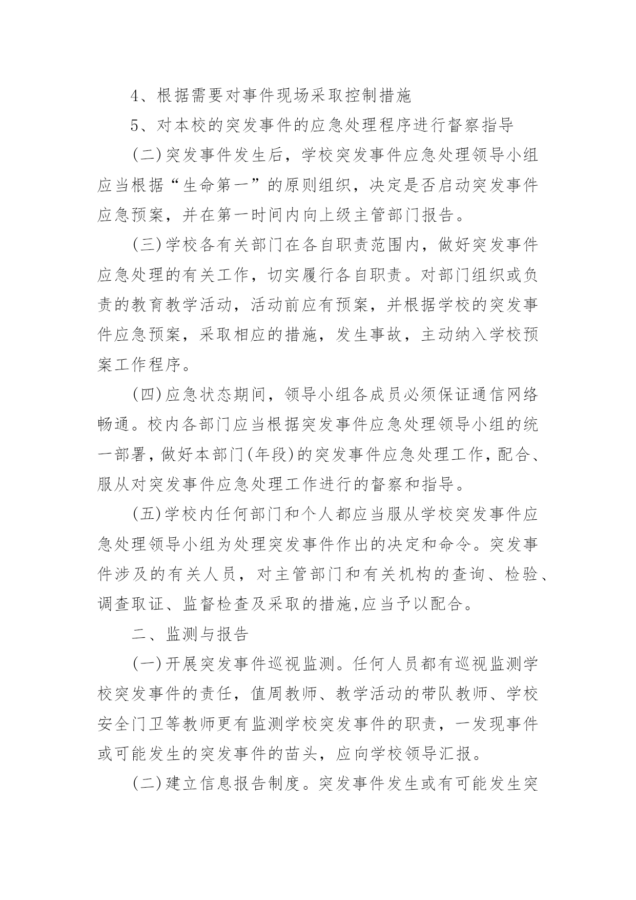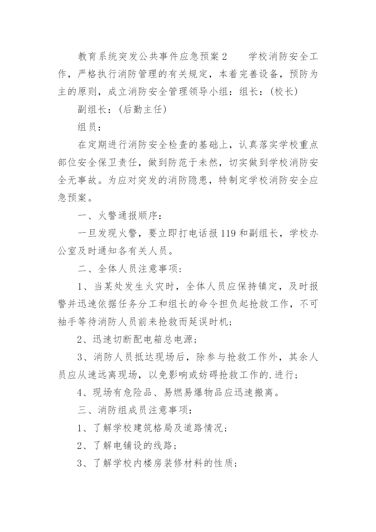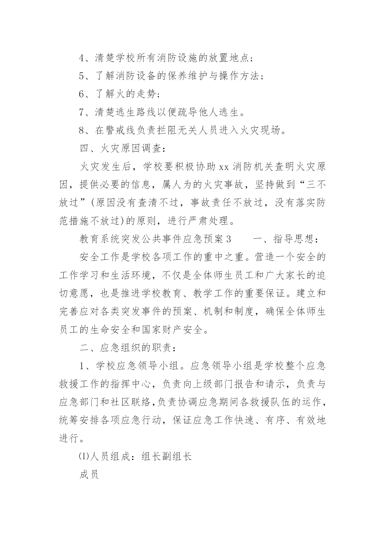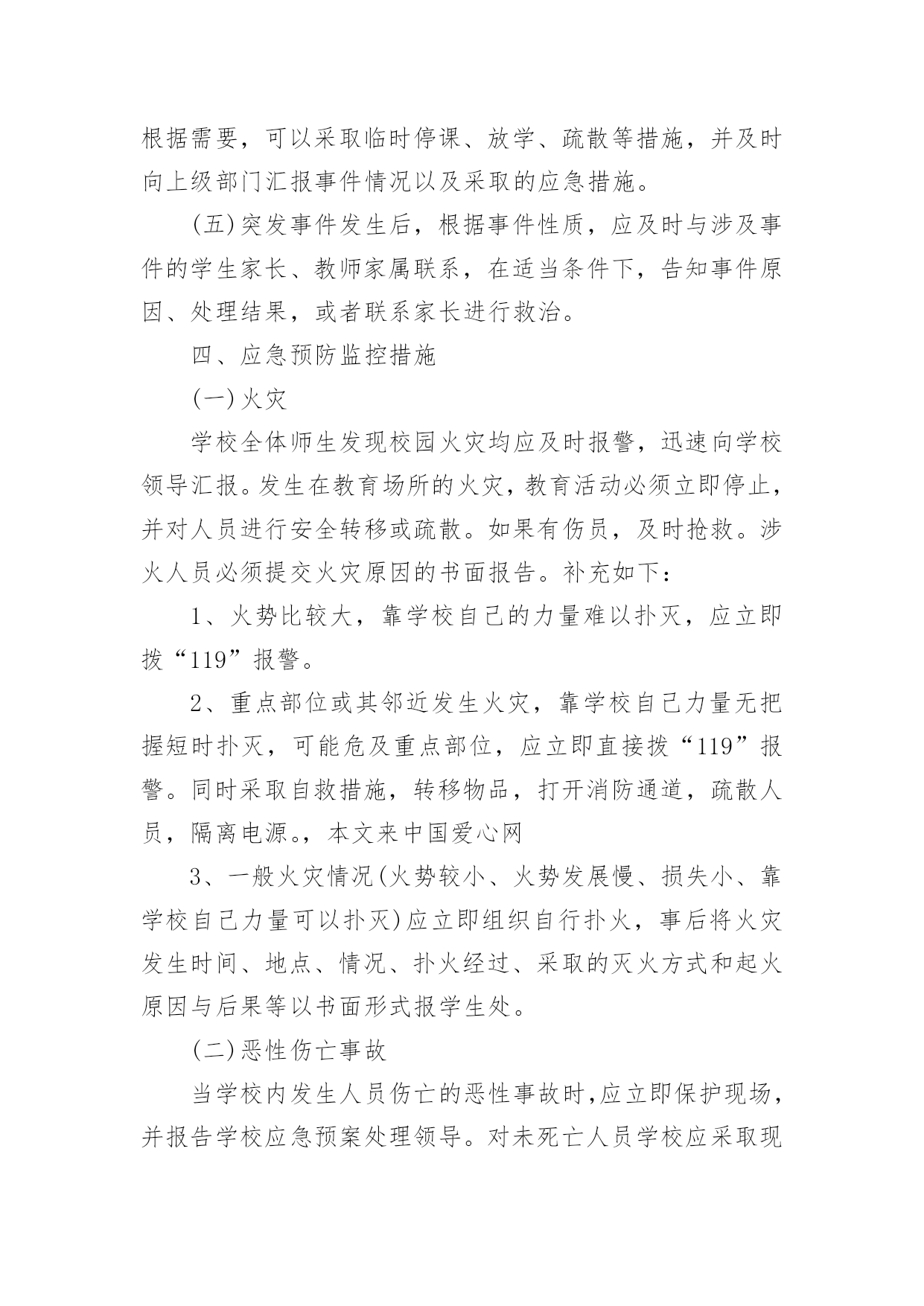 教育系统突发公共事件应急预案教育系统突发公共事件应急预案范文在学校抑或是社会中,难免会有事故发生,为了降低事故后果,可能需要提前进行应急预案编制工作。那么应当如何编制应急预案呢?下面是小编帮大家整理的教育系统突发公共事件应急预案范文,希望能够帮助到大家。教育系统突发公共事件应急预案1为确保校园各类突发事件能够及时、迅速、高效、有序地得到处理,保障我校全体师生生命财产安全和身心健康,维护社会稳定,根据上级有关部门要求,结合我校实际,特制定本预案。本预案所称突发事件,是指突然发生的,造成或者可能造成校园内师生员工生命财产和身心健康的火灾、地震、洪灾、公共卫生、环境污染以及人为的破坏等重大安全事件。一、组织与指挥(一)学校成立突发事件应急处理领导小组,统一领导全校突发事件的应急处理工作。突发事件应急处理领导小组由学校领导及相关科室、教研组主要负责人组成,校长任组长。1、指挥有关教师立即到达规定岗位,采取相应的应对措施2、安排教师开展相关的抢险排危或者实施求救工作3、根据需要对师生员工进行疏散,并根据事件性质,报请上级部门迅速依法采取紧急措施4、根据需要对事件现场采取控制措施5、对本校的突发事件的应急处理程序进行督察指导(二)突发事件发生后,学校突发事件应急处理领导小组应当根据“生命第一”的原则组织,决定是否启动突发事件应急预案,并在第一时间内向上级主管部门报告。(三)学校各有关部门在各自职责范围内,做好突发事件应急处理的有关工作,切实履行各自职责。对部门组织或负责的教育教学活动,活动前应有预案,并根据学校的突发事件应急预案,采取相应的措施,发生事故,主动纳入学校预案工作程序。(四)应急状态期间,领导小组各成员必须保证通信网络畅通。校内各部门应当根据突发事件应急处理领导小组的统一部署,做好本部门(年段)的突发事件应急处理工作,配合、服从对突发事件应急处理工作进行的督察和指导。(五)学校内任何部门和个人都应当服从学校突发事件应急处理领导小组为处理突发事件作出的决定和命令。突发事件涉及的有关人员,对主管部门和有关机构的查询、检验、调查取证、监督检查及采取的措施,应当予以配合。二、监测与报告(一)开展突发事件巡视监测。任何人员都有巡视监测学校突发事件的责任,值周教师、教学活动的带队教师、学校安全门卫等教师更有监测学校突发事件的职责,一发现事件或可能发生的突发事件的苗头,应向学校领导汇报。(二)建立信息报告制度。突发事件发生或有可能发生突发事件的信息,采用逐级汇报制度,事件第一发现人应及时向学校汇报,学校应在第一时间向学校主管部门汇报,并随时与上级单位保持密切联系。(三)严格执行学校重大事件报告程序。对于各类突发事件,应迅速判断事件性质,根据事件性质,及时向社会、政府各救治排险机构求救,并向相关的政府职能部门、上级主管部门逐级汇报。在得到指示和未得到指示前,对事故可能影响善后处理的现场、证件证物等要进行保护。(四)突发事件向外发布情况,需要经校突发事件处理领导小组同意,在确定性质的基础上以集体形式发布,不得主观臆测、夸大其词,或者须经上级有关部门鉴定核实后作出决定。任何人员都不得瞒报、谎报或者授意他人隐瞒、缓报、谎报突发事件。三、应急调查与救治(一)突发事件发生后,校应急处理领导小组及有关部门,负责组织对突发事件进行调查处理。通过对突发事件调查、现场勘验,采取控制措施等,对危害程度做出评估。(二)突发事件发生后,在进行事件调查和现场处理的同时,学校应当立即将突发事件所致的伤亡病人送向就近医院,对无法判断伤情的伤病员,应及时报警求救求援。(三)突发事件发生后,学生管理部门、保卫部门应立即保护现场、采取疏散、隔离等措施,加强学生管理,并做好学生思想政治工作,确保学生心态和情绪稳定。(四)突发事件发生后,突发事件应急处理工作领导小组根据需要,可以采取临时停课、放学、疏散等措施,并及时向上级部门汇报事件情况以及采取的应急措施。(五)突发事件发生后,根据事件性质,应及时与涉及事件的学生家长、教师家属联系,在适当条件下,告知事件原因、处理结果,或者联系家长进行救治。四、应急预防监控措施(一)火灾学校全体师生发现校园火灾均应及时报警,迅速向学校领导汇报。发生在教育场所的火灾,教育活动必须立即停止,并对人员进行安全转移或疏散。如果有伤员,及时抢救。涉火人员必须提交火灾原因的书面报告。补充如下:1、火势比较大,靠学校自己的力量难以扑灭,应立即拨“119”报警。2、重点部位或其邻近发生火灾,靠学校自己力量无把握短时扑灭,可能危及重点部位,应立即直接拨“119”报警。同时采取自救措施,转移物品,打开消防通道,疏散人员,隔离电源。,本文来中国爱心网3、一般火灾情况(火势较小、火势发展慢、损失小、靠学校自己力量可以扑灭)应立即组织自行扑火,事后将火灾发生时间、地点