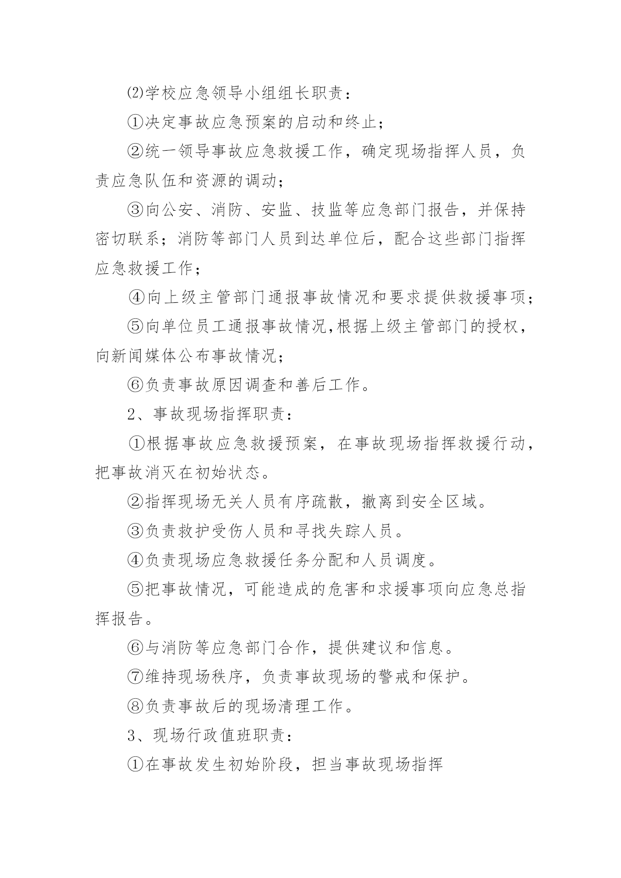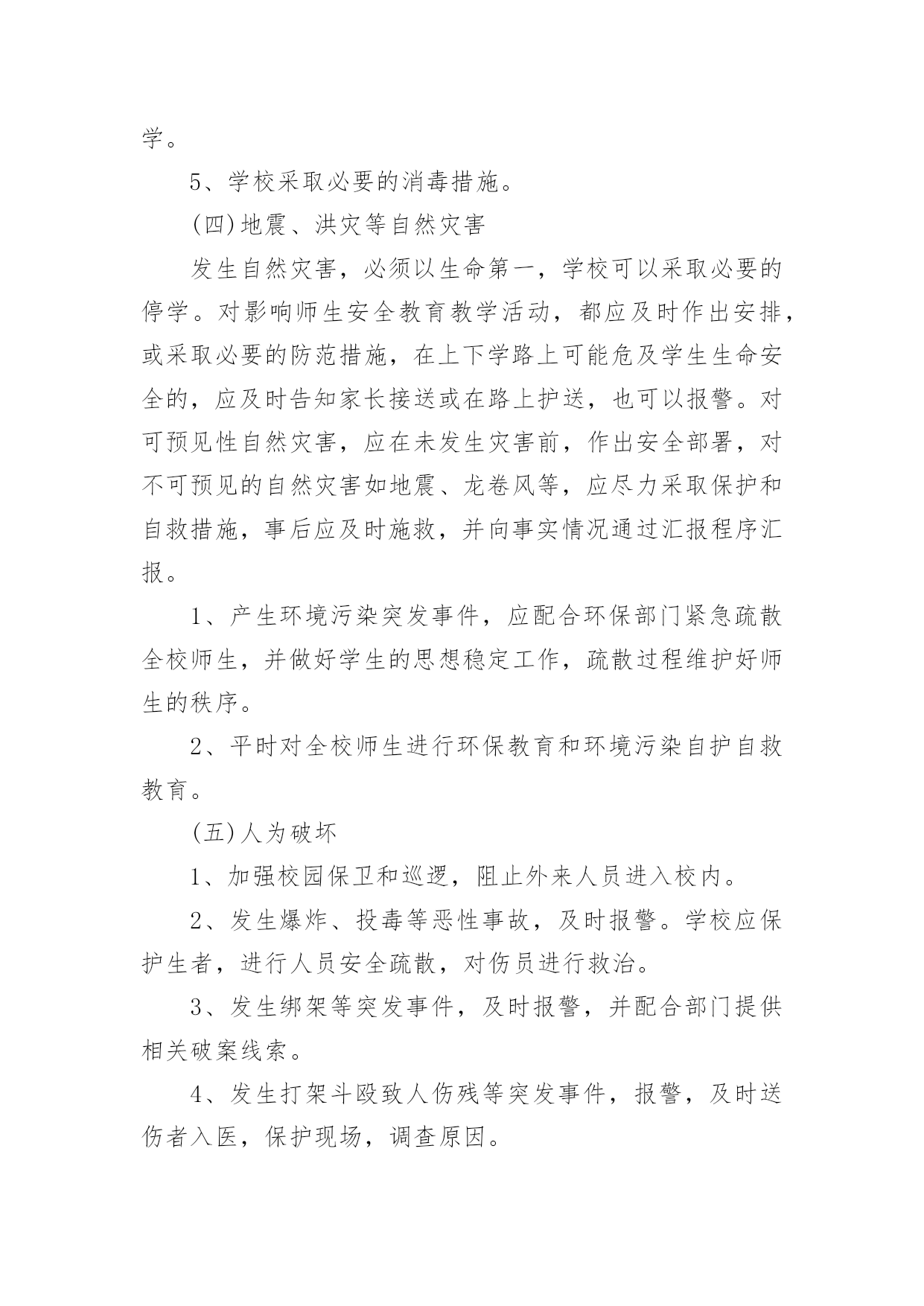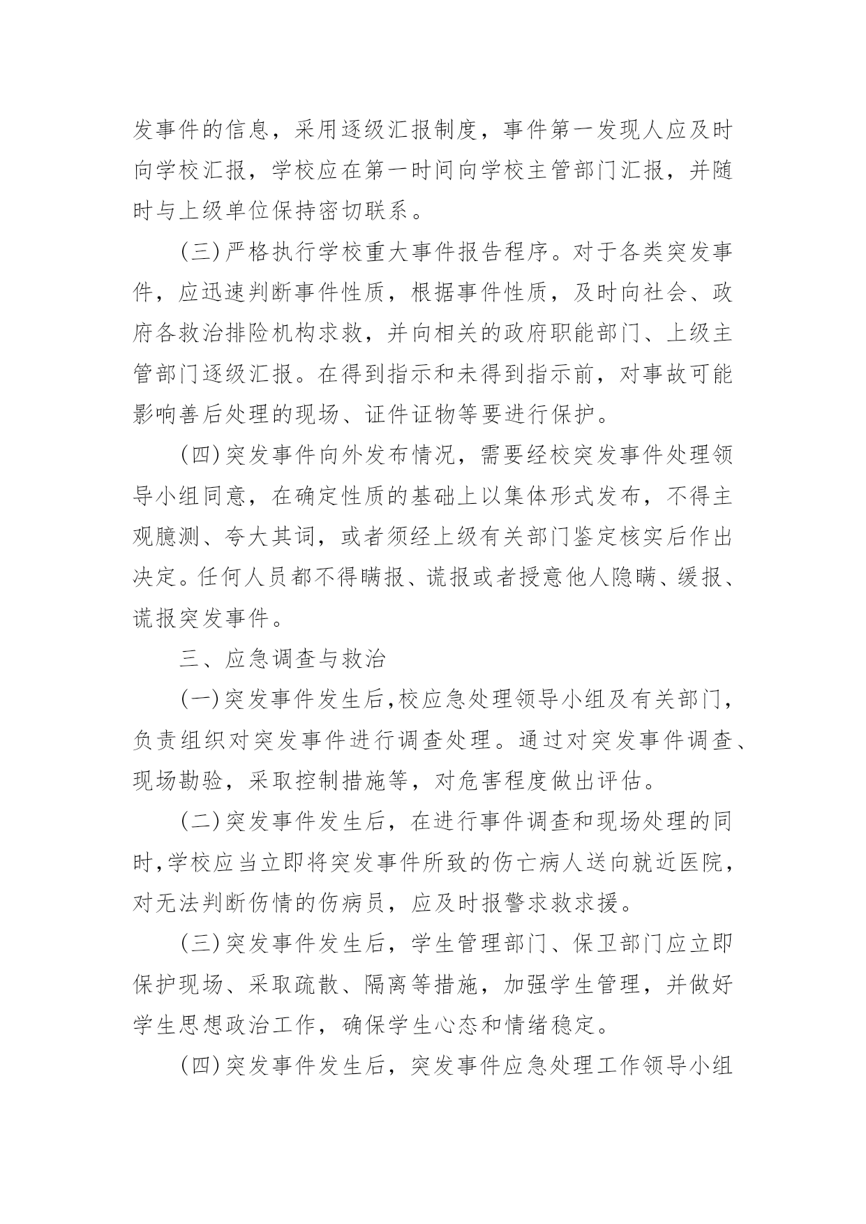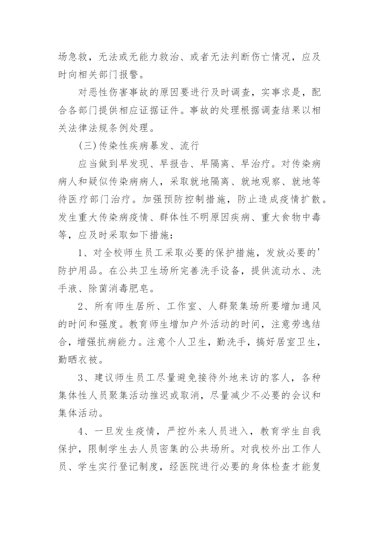 教育系统突发公共事件应急预案教育系统突发公共事件应急预案范文在学校抑或是社会中,难免会有事故发生,为了降低事故后果,可能需要提前进行应急预案编制工作。那么应当如何编制应急预案呢?下面是小编帮大家整理的教育系统突发公共事件应急预案范文,希望能够帮助到大家。教育系统突发公共事件应急预案1为确保校园各类突发事件能够及时、迅速、高效、有序地得到处理,保障我校全体师生生命财产安全和身心健康,维护社会稳定,根据上级有关部门要求,结合我校实际,特制定本预案。本预案所称突发事件,是指突然发生的,造成或者可能造成校园内师生员工生命财产和身心健康的火灾、地震、洪灾、公共卫生、环境污染以及人为的破坏等重大安全事件。一、组织与指挥(一)学校成立突发事件应急处理领导小组,统一领导全校突发事件的应急处理工作。突发事件应急处理领导小组由学校领导及相关科室、教研组主要负责人组成,校长任组长。1、指挥有关教师立即到达规定岗位,采取相应的应对措施2、安排教师开展相关的抢险排危或者实施求救工作3、根据需要对师生员工进行疏散,并根据事件性质,报请上级部门迅速依法采取紧急措施4、根据需要对事件现场采取控制措施5、对本校的突发事件的应急处理程序进行督察指导(二)突发事件发生后,学校突发事件应急处理领导小组应当根据“生命第一”的原则组织,决定是否启动突发事件应急预案,并在第一时间内向上级主管部门报告。(三)学校各有关部门在各自职责范围内,做好突发事件应急处理的有关工作,切实履行各自职责。对部门组织或负责的教育教学活动,活动前应有预案,并根据学校的突发事件应急预案,采取相应的措施,发生事故,主动纳入学校预案工作程序。(四)应急状态期间,领导小组各成员必须保证通信网络畅通。校内各部门应当根据突发事件应急处理领导小组的统一部署,做好本部门(年段)的突发事件应急处理工作,配合、服从对突发事件应急处理工作进行的督察和指导。(五)学校内任何部门和个人都应当服从学校突发事件应急处理领导小组为处理突发事件作出的决定和命令。突发事件涉及的有关人员,对主管部门和有关机构的查询、检验、调查取证、监督检查及采取的措施,应当予以配合。二、监测与报告(一)开展突发事件巡视监测。任何人员都有巡视监测学校突发事件的责任,值周教师、教学活动的带队教师、学校安全门卫等教师更有监测学校突发事件的职责,一发现事件或可能发生的突发事件的苗头,应向学校领导汇报。(二)建立信息报告制度。突发事件发生或有可能发生突发事件的信息,采用逐级汇报制度,事件第一发现人应及时向学校汇报,学校应在第一时间向学校主管部门汇报,并随时与上级单位保持密切联系。(三)严格执行学校重大事件报告程序。对于各类突发事件,应迅速判断事件性质,根据事件性质,及时向社会、政府各救治排险机构求救,并向相关的政府职能部门、上级主管部门逐级汇报。在得到指示和未得到指示前,对事故可能影响善后处理的现场、证件证物等要进行保护。(四)突发事件向外发布情况,需要经校突发事件处理领导小组同意,在确定性质的基础上以集体形式发布,不得主观臆测、夸大其词,或者须经上级有关部门鉴定核实后作出决定。任何人员都不得瞒报、谎报或者授意他人隐瞒、缓报、谎报突发事件。三、应急调查与救治(一)突发事件发生后,校应急处理领导小组及有关部门,负责组织对突发事件进行调查处理。通过对突发事件调查、现场勘验,采取控制措施等,对危害程度做出评估。(二)突发事件发生后,在进行事件调查和现场处理的同时,学校应当立即将突发事件所致的伤亡病人送向就近医院,对无法判断伤情的伤病员,应及时报警求救求援。(三)突发事件发生后,学生管理部门、保卫部门应立即保护现场、采取疏散、隔离等措施,加强学生管理,并做好学生思想政治工作,确保学生心态和情绪稳定。(四)突发事件发生后,突发事件应急处理工作领导小组根据需要,可以采取临时停课、放学、疏散等措施,并及时向上级部门汇报事件情况以及采取的应急措施。(五)突发事件发生后,根据事件性质,应及时与涉及事件的学生家长、教师家属联系,在适当条件下,告知事件原因、处理结果,或者联系家长进行救治。四、应急预防监控措施(一)火灾学校全体师生发现校园火灾均应及时报警,迅速向学校领导汇报。发生在教育场所的火灾,教育活动必须立即停止,并对人员进行安全转移或疏散。如果有伤员,及时抢救。涉火人员必须提交火灾原因的书面报告。补充如下:1、火势比较大,靠学校自己的力量难以扑灭,应立即拨“119”报警。2、重点部位或其邻近发生火灾,靠学校自己力量无把握短时扑灭,可能危及重点部位,应立即直接拨“119”报警。同时采取自救措施,转移物品,打开消防通道,疏散人员,隔离电源。,本文来中国爱心网3、一般火灾情况(火势较小、火势发展慢、损失小、靠学校自己力量可以扑灭)应立即组织自行扑火,事后将火灾发生时间、地点