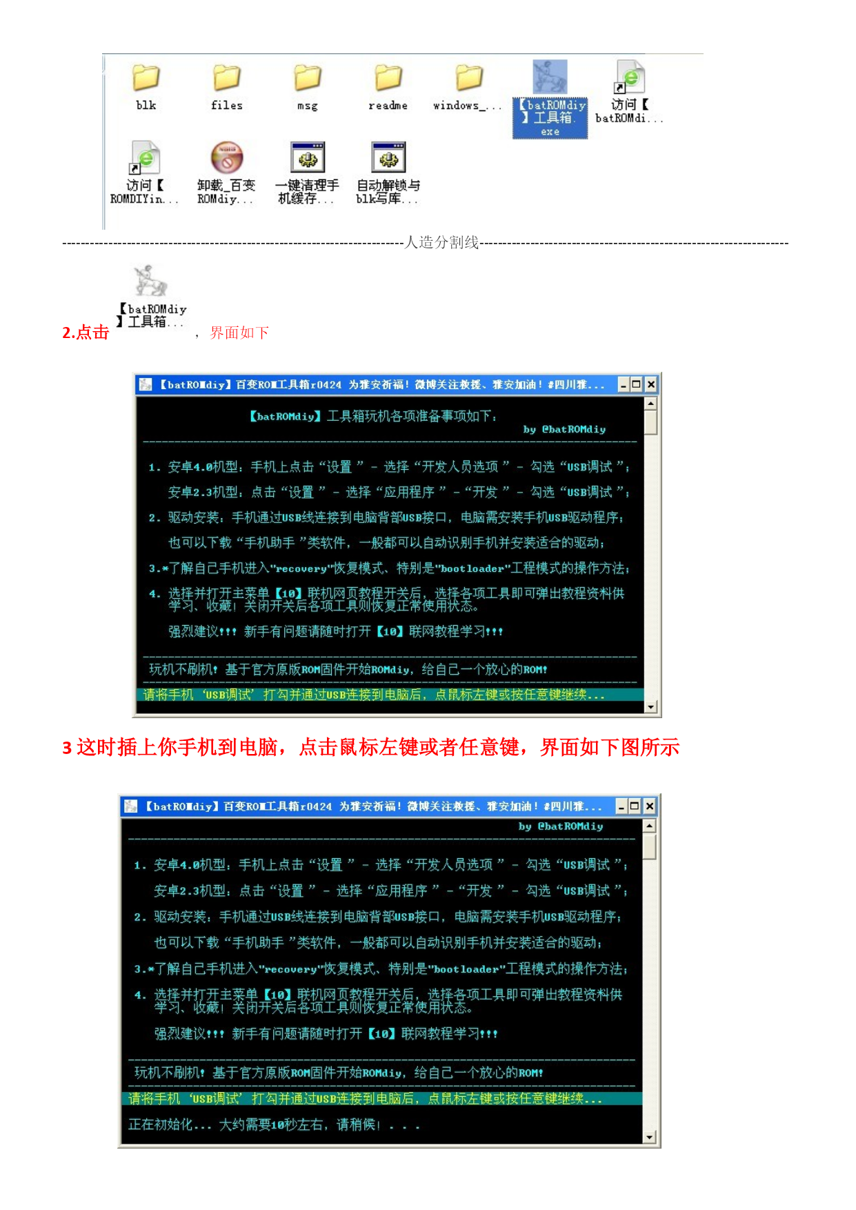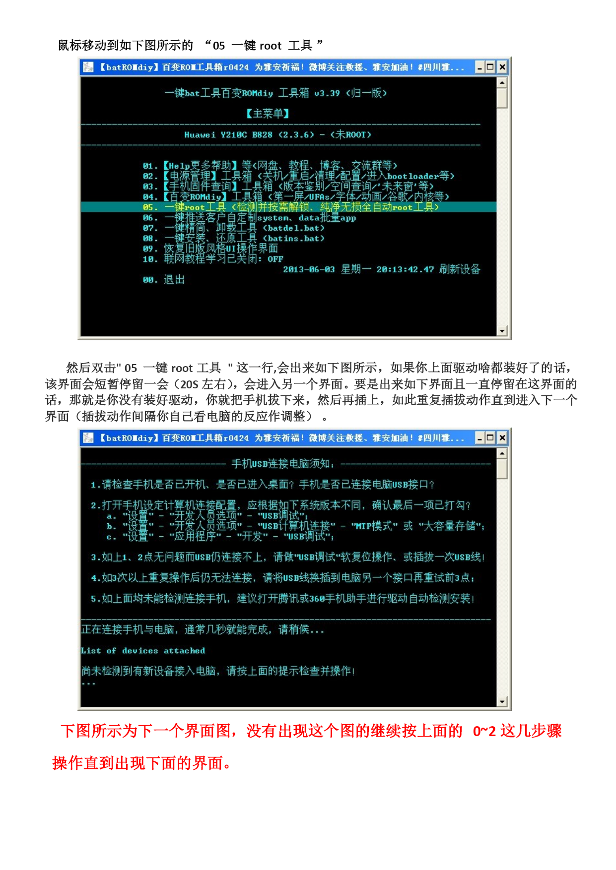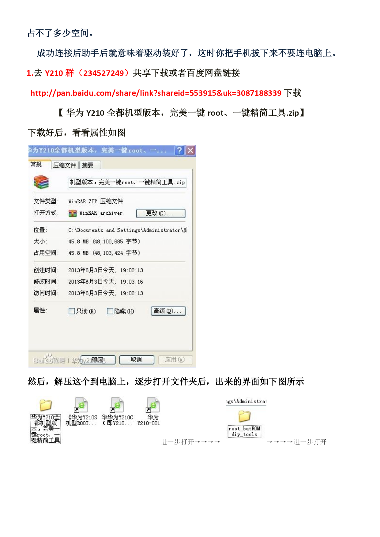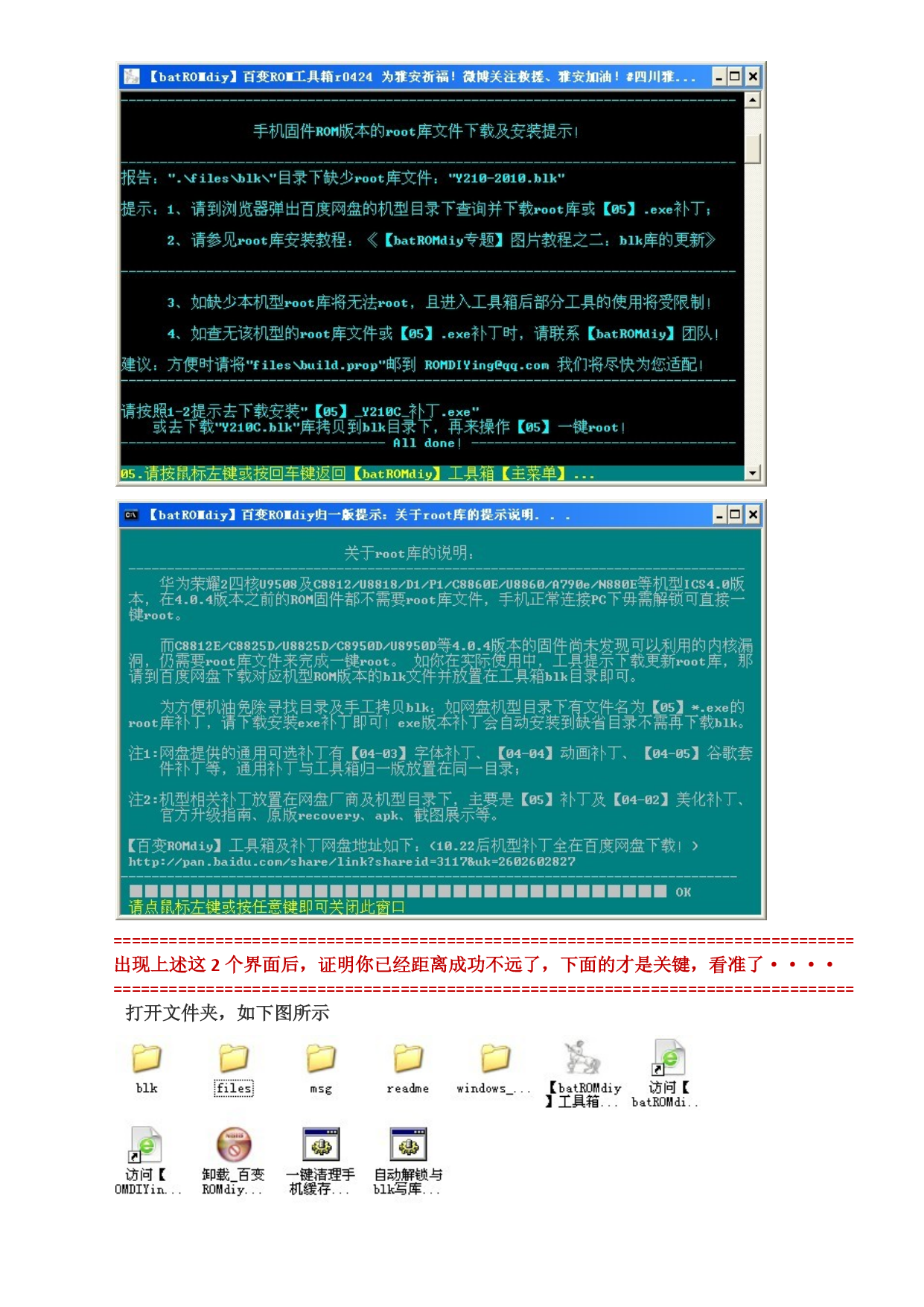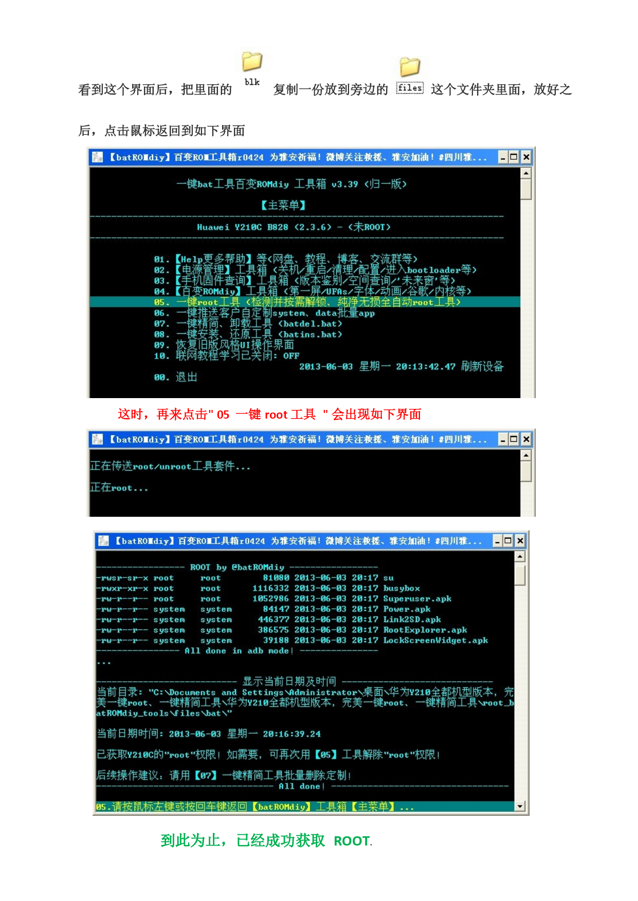 不会root的必看----华为电信版Y210C-B828版本root全过程首先,看看我的手机截图-有图有真相!不相信有这个版本的的看到这里可以走起,不送!-----------------------------------------------------------------------------人造分割线-------------------------------------------------------------------上面就是我手机截屏的图,通过第一幅图可以知道我的手机版本现在是B828(省略前面那些字符串),目前我还没见过多少人是这种版本的,但是我手机买来就是这个版本。root过的朋友看到我第二副图的程序里面的SUPERUSER跟RE管理器,就知道我这手机是成功root过了。经我测试,wifi功能在root前后没有变化,不会出现无法使用的情况。下面,我就我的操作过程(图文并茂)给大家陈述一遍。0.基本前提:手机USB调试跟未知源要打勾,而且手机已经在你电脑上成功连接360/豌豆荚/91等手机助手,你可以在电脑上查看你手机的信息还有安装的程序。这样做的目的就是通过这些助手在电脑上安装好手机驱动。没有这些工具的赶紧去下,这个占不了多少空间。成功连接后助手后就意味着驱动装好了,这时你把手机拔下来不要连电脑上。1.去Y210群(234527249)共享下载或者百度网盘链接http://pan.baidu.com/share/link?shareid=553915&uk=3087188339下载【华为Y210全都机型版本,完美一键root、一键精简工具.zip】下载好后,看看属性如图然后,解压这个到电脑上,逐步打开文件夹后,出来的界面如下图所示进一步打开→→→→→→→→进一步打开--------------------------------------------------------------------------人造分割线-------------------------------------------------------------------2.点击,界面如下3这时插上你手机到电脑,点击鼠标左键或者任意键,界面如下图所示鼠标移动到如下图所示的“05一键root工具”然后双击"05一键root工具"这一行,会出来如下图所示,如果你上面驱动啥都装好了的话,该界面会短暂停留一会(20S左右),会进入另一个界面。要是出来如下界面且一直停留在这界面的话,那就是你没有装好驱动,你就把手机拔下来,然后再插上,如此重复插拔动作直到进入下一个界面(插拔动作间隔你自己看电脑的反应作调整)。下图所示为下一个界面图,没有出现这个图的继续按上面的0~2这几步骤操作直到出现下面的界面。================================================================================出现上述这2个界面后,证明你已经距离成功不远了,下面的才是关键,看准了····================================================================================打开文件夹,如下图所示看到这个界面后,把里面的复制一份放到旁边的这个文件夹里面,放好之后,点击鼠标返回到如下界面这时,再来点击"05一键root工具"会出现如下界面到此为止,已经成功获取ROOT.