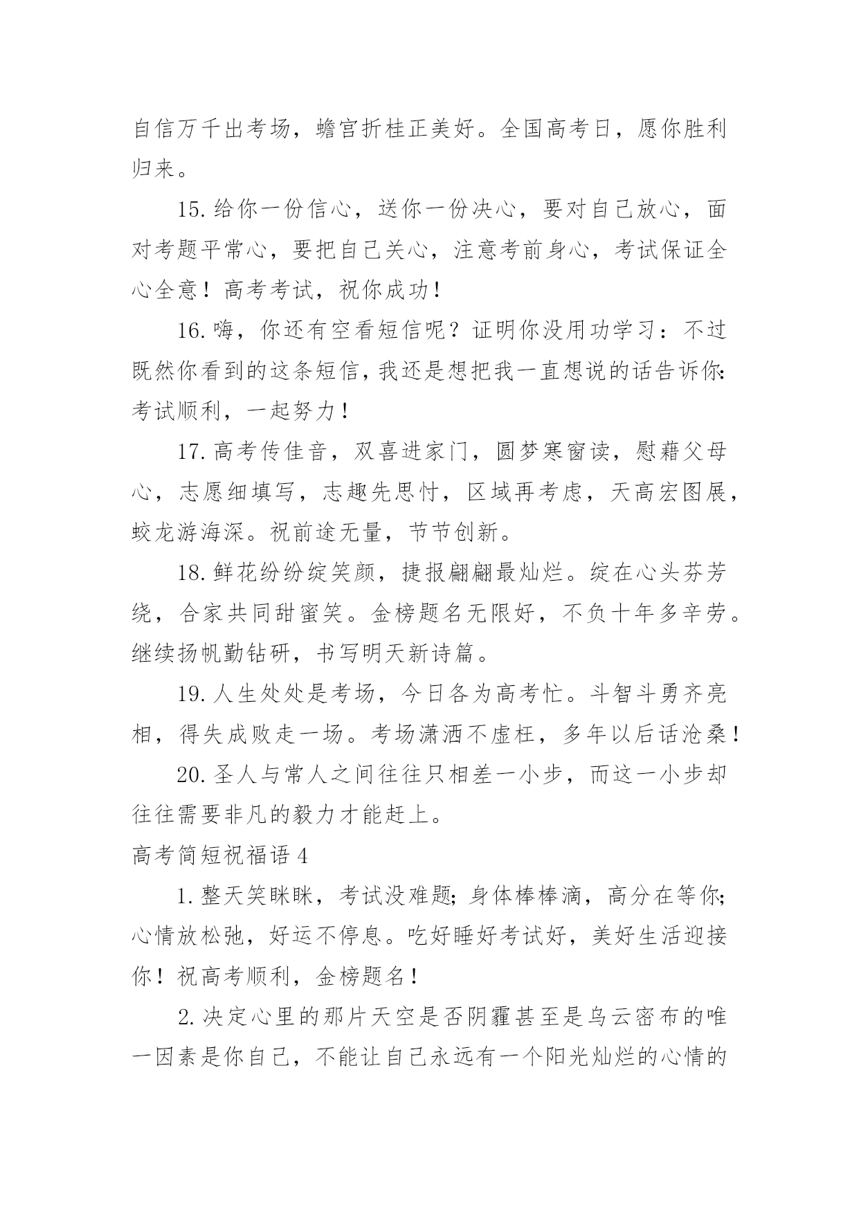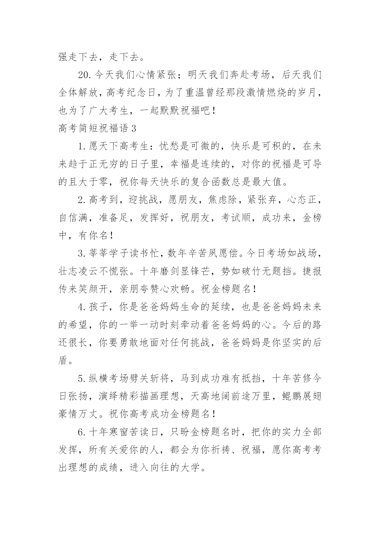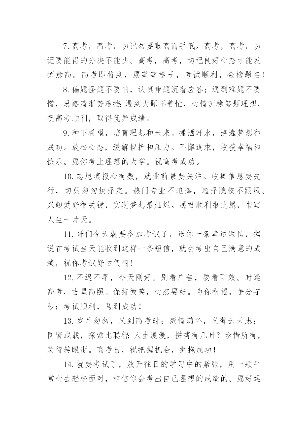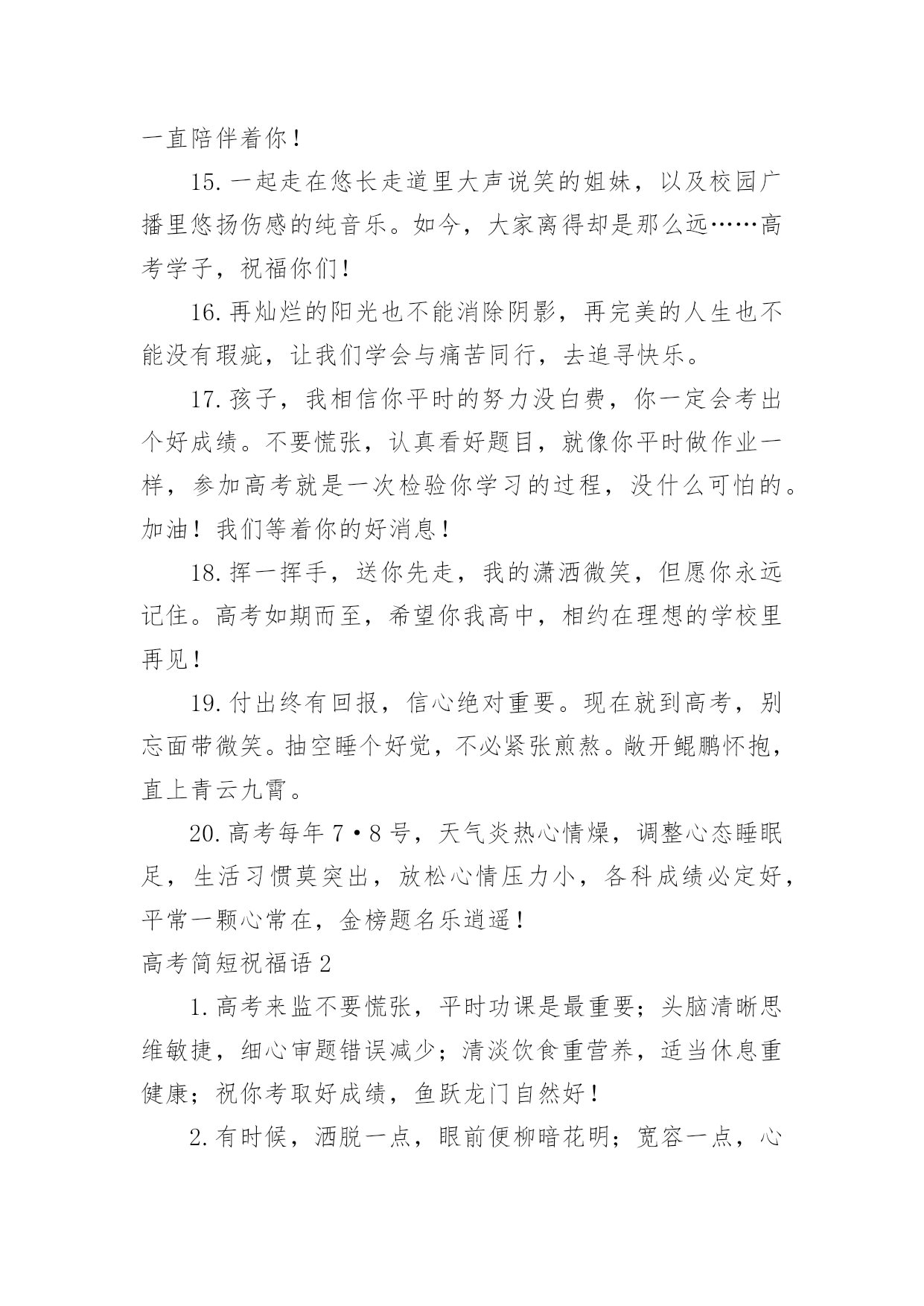 高考简短祝福语高考简短祝福语在日常学习、工作抑或是生活中,大家都写过祝福语吧,祝福语是人们表达心中祝福的话语。你知道祝福语怎样写才合适吗?下面是小编精心整理的高考简短祝福语,欢迎大家分享。高考简短祝福语11.第一行歪斜的脚印,已被岁月的风尘抹平;而生活的道路呀,还在你的脚下延伸。我祝愿你:大步迈上新的征程,并留下一串串闪光的脚印!高考顺利!2.“山登绝顶我为峰”应是我儿宋放的终生追求。相信自己,成功与好运相伴,祝高考大捷,胜利一定属于你,属于衡水二中!3.孩子,面对高考,保持你心灵的善良与纯洁,保持你情感的热情与丰富,保持你精神的进取与激昂!4.十年苦读闯雄关,心态平静莫慌乱。发挥才智更努力,鱼跃龙门终如愿。高考即将到来,望你在有限的时间内,朝着理想的目标前进,全家人为你加油!5.不要在忙碌中迷失了自己,在学习之余,欣赏一下生活,会让你的心情像花儿一样绽放。6.面对机遇,不犹豫;面对抉择,不彷徨;面对决战,不惧怕!7.高考,高考,切记勿要眼高而手低。高考,高考,切记要能得的分决不能少。高考,高考,切记良好心态才能发挥愈高。高考即将到,愿莘莘学子,考试顺利,金榜题名!8.偏题怪题不要怕,认真审题沉着应答;遇到难题不要慌,思路清晰势难挡;遇到大题不着忙,心情沉稳答题理想,祝高考顺利,取得优异成绩。9.种下希望,培育理想和未来。播洒汗水,浇灌梦想和成功。放松心态,缓解挫折和压力。不懈追求,收获幸福和快乐。愿你考上理想的大学。祝高考成功。10.志愿填报心有数,就业前景要关注。收集信息要先行,切莫匆匆抉择定。热门专业不追捧,选择院校不跟风。兴趣爱好很关键,实现梦想最灿烂。愿君顺利报志愿,书写人生一片天。11.哥们今天就要参加考试了,送你一条幸运短信,据说在考试当天能收到这样一条短信,就会考出自己满意的成绩,祝你考试好运气啊!12.不迟不早,今天刚好。别看广告,要看聊效。时逢高考,吉星高照。保持微笑,心态要好。为你祝福,争分夺秒:考试顺利,马到成功!13.岁月匆匆,又到高考时;豪情满怀,义薄云天志;同窗载载,探索比聪智;人生漫漫,拼搏有几时?珍惜所有,莫待转眼逝。高考日,祝把握机会,拥抱成功!14.就要考试了,放开往日的学习中的紧张,用一颗平常心去轻松面对,相信你会考出自己理想的成绩的。愿好运一直陪伴着你!15.一起走在悠长走道里大声说笑的姐妹,以及校园广播里悠扬伤感的纯音乐。如今,大家离得却是那么远……高考学子,祝福你们!16.再灿烂的阳光也不能消除阴影,再完美的人生也不能没有瑕疵,让我们学会与痛苦同行,去追寻快乐。17.孩子,我相信你平时的努力没白费,你一定会考出个好成绩。不要慌张,认真看好题目,就像你平时做作业一样,参加高考就是一次检验你学习的过程,没什么可怕的。加油!我们等着你的好消息!18.挥一挥手,送你先走,我的潇洒微笑,但愿你永远记住。高考如期而至,希望你我高中,相约在理想的学校里再见!19.付出终有回报,信心绝对重要。现在就到高考,别忘面带微笑。抽空睡个好觉,不必紧张煎熬。敞开鲲鹏怀抱,直上青云九霄。20.高考每年7·8号,天气炎热心情燥,调整心态睡眠足,生活习惯莫突出,放松心情压力小,各科成绩必定好,平常一颗心常在,金榜题名乐逍遥!高考简短祝福语21.高考来监不要慌张,平时功课是最重要;头脑清晰思维敏捷,细心审题错误减少;清淡饮食重营养,适当休息重健康;祝你考取好成绩,鱼跃龙门自然好!2.有时候,洒脱一点,眼前便柳暗花明;宽容一点,心中便海阔天空。身边的世界往往比我们想象的要睿智与宽容。3.高考了,不要紧的,过了这个关头你就好了,像我上次和你说的那样,你到了大学以后真的会很有优势的,加油!等着你的大学酒!4.试卷一张一张,下发的是希望;考试一场一场,考的是能力;笔尖一动一动,动的是梦想;问候一声一声,道的是真情;高考日,愿你快乐照心间,高考迎来艳阳天!5.年年岁岁花相似,岁岁年年人不同,年年高考亦如此,今年有你而不同,祝你高中耀门楣,短信祝福已送到,录取通知紧跟来。6.要对自己有信心,答题时候要细心,考出水平才安心,金榜题名得欢心,亲朋好友都开心。愿你高考顺心!7.十年寒窗,百日风雨,行遍书山,航终树海,千磨百炼,铁杵成针,浪淘水洗,沙尽金见。祝愿高考金榜题名。8.天道酬勤,曾经的每一分付出,必将收到百倍回报。不管揭晓的答案是什么,只要努力过奋斗过,就不会后悔。9.快到考试的日子了,希望你干自愿事,吃顺口饭,听轻松话,睡安心觉。使自己保持良好平静的心态,不要太紧张,相信你的梦想会实现的!10.升学考试近了,寒窗苦读为前途,望子成龙父母情。我发短信传祝福:放下包袱开动脑筋,勤于思考好好复习,祝你取得好成绩,期待你的成功!11.爸妈和千万个家长一样,时刻在关注着即将到来的那一天。我们相信:儿子,你肯定会成功的。我们在北京