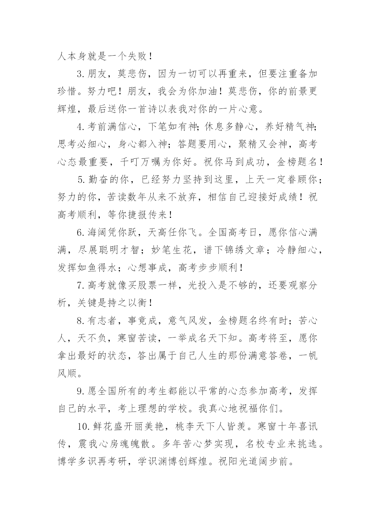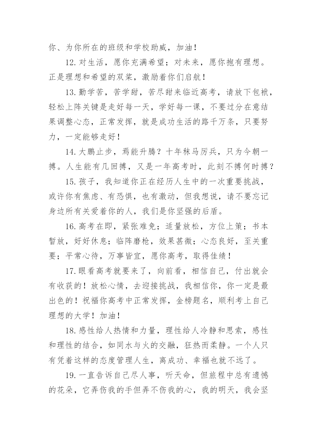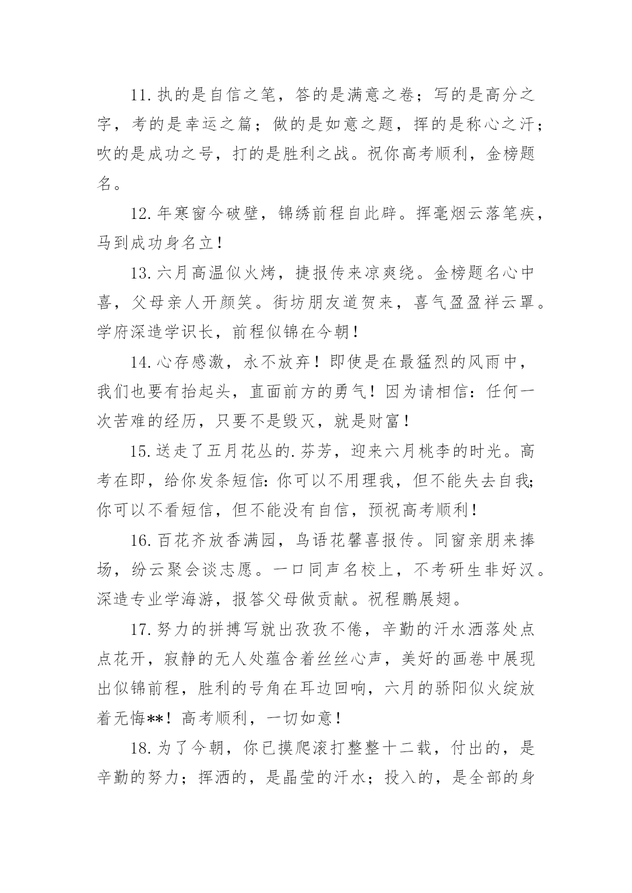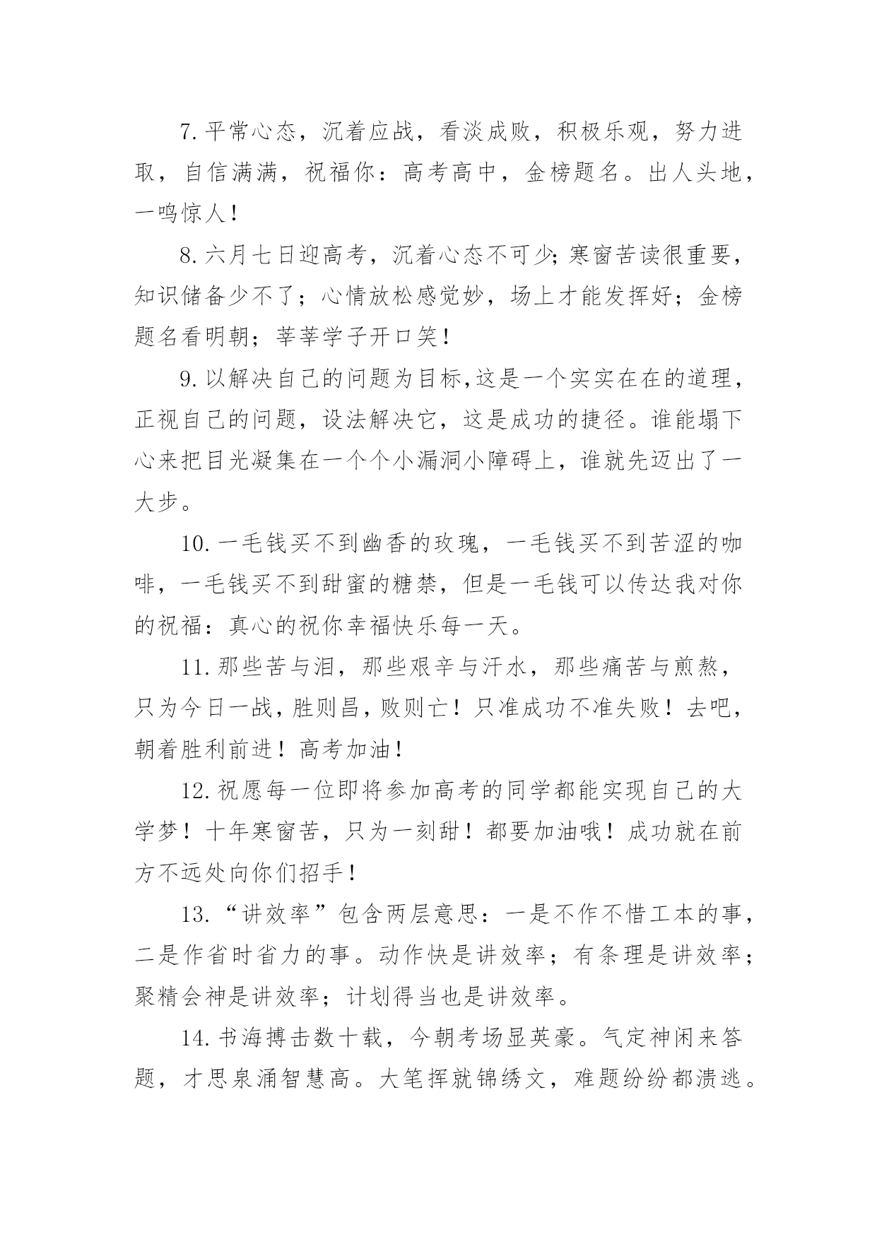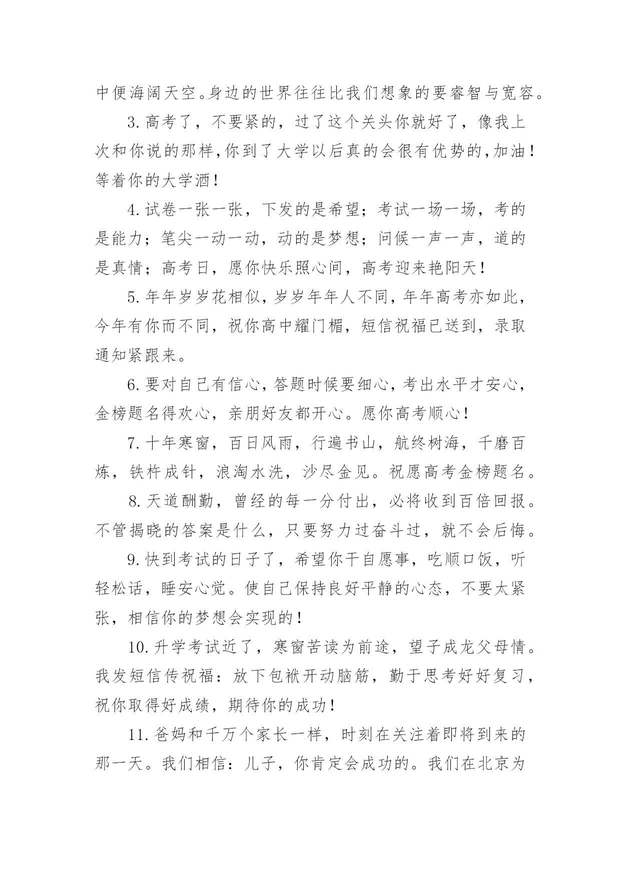 高考简短祝福语高考简短祝福语在日常学习、工作抑或是生活中,大家都写过祝福语吧,祝福语是人们表达心中祝福的话语。你知道祝福语怎样写才合适吗?下面是小编精心整理的高考简短祝福语,欢迎大家分享。高考简短祝福语11.第一行歪斜的脚印,已被岁月的风尘抹平;而生活的道路呀,还在你的脚下延伸。我祝愿你:大步迈上新的征程,并留下一串串闪光的脚印!高考顺利!2.“山登绝顶我为峰”应是我儿宋放的终生追求。相信自己,成功与好运相伴,祝高考大捷,胜利一定属于你,属于衡水二中!3.孩子,面对高考,保持你心灵的善良与纯洁,保持你情感的热情与丰富,保持你精神的进取与激昂!4.十年苦读闯雄关,心态平静莫慌乱。发挥才智更努力,鱼跃龙门终如愿。高考即将到来,望你在有限的时间内,朝着理想的目标前进,全家人为你加油!5.不要在忙碌中迷失了自己,在学习之余,欣赏一下生活,会让你的心情像花儿一样绽放。6.面对机遇,不犹豫;面对抉择,不彷徨;面对决战,不惧怕!7.高考,高考,切记勿要眼高而手低。高考,高考,切记要能得的分决不能少。高考,高考,切记良好心态才能发挥愈高。高考即将到,愿莘莘学子,考试顺利,金榜题名!8.偏题怪题不要怕,认真审题沉着应答;遇到难题不要慌,思路清晰势难挡;遇到大题不着忙,心情沉稳答题理想,祝高考顺利,取得优异成绩。9.种下希望,培育理想和未来。播洒汗水,浇灌梦想和成功。放松心态,缓解挫折和压力。不懈追求,收获幸福和快乐。愿你考上理想的大学。祝高考成功。10.志愿填报心有数,就业前景要关注。收集信息要先行,切莫匆匆抉择定。热门专业不追捧,选择院校不跟风。兴趣爱好很关键,实现梦想最灿烂。愿君顺利报志愿,书写人生一片天。11.哥们今天就要参加考试了,送你一条幸运短信,据说在考试当天能收到这样一条短信,就会考出自己满意的成绩,祝你考试好运气啊!12.不迟不早,今天刚好。别看广告,要看聊效。时逢高考,吉星高照。保持微笑,心态要好。为你祝福,争分夺秒:考试顺利,马到成功!13.岁月匆匆,又到高考时;豪情满怀,义薄云天志;同窗载载,探索比聪智;人生漫漫,拼搏有几时?珍惜所有,莫待转眼逝。高考日,祝把握机会,拥抱成功!14.就要考试了,放开往日的学习中的紧张,用一颗平常心去轻松面对,相信你会考出自己理想的成绩的。愿好运一直陪伴着你!15.一起走在悠长走道里大声说笑的姐妹,以及校园广播里悠扬伤感的纯音乐。如今,大家离得却是那么远……高考学子,祝福你们!16.再灿烂的阳光也不能消除阴影,再完美的人生也不能没有瑕疵,让我们学会与痛苦同行,去追寻快乐。17.孩子,我相信你平时的努力没白费,你一定会考出个好成绩。不要慌张,认真看好题目,就像你平时做作业一样,参加高考就是一次检验你学习的过程,没什么可怕的。加油!我们等着你的好消息!18.挥一挥手,送你先走,我的潇洒微笑,但愿你永远记住。高考如期而至,希望你我高中,相约在理想的学校里再见!19.付出终有回报,信心绝对重要。现在就到高考,别忘面带微笑。抽空睡个好觉,不必紧张煎熬。敞开鲲鹏怀抱,直上青云九霄。20.高考每年7·8号,天气炎热心情燥,调整心态睡眠足,生活习惯莫突出,放松心情压力小,各科成绩必定好,平常一颗心常在,金榜题名乐逍遥!高考简短祝福语21.高考来监不要慌张,平时功课是最重要;头脑清晰思维敏捷,细心审题错误减少;清淡饮食重营养,适当休息重健康;祝你考取好成绩,鱼跃龙门自然好!2.有时候,洒脱一点,眼前便柳暗花明;宽容一点,心中便海阔天空。身边的世界往往比我们想象的要睿智与宽容。3.高考了,不要紧的,过了这个关头你就好了,像我上次和你说的那样,你到了大学以后真的会很有优势的,加油!等着你的大学酒!4.试卷一张一张,下发的是希望;考试一场一场,考的是能力;笔尖一动一动,动的是梦想;问候一声一声,道的是真情;高考日,愿你快乐照心间,高考迎来艳阳天!5.年年岁岁花相似,岁岁年年人不同,年年高考亦如此,今年有你而不同,祝你高中耀门楣,短信祝福已送到,录取通知紧跟来。6.要对自己有信心,答题时候要细心,考出水平才安心,金榜题名得欢心,亲朋好友都开心。愿你高考顺心!7.十年寒窗,百日风雨,行遍书山,航终树海,千磨百炼,铁杵成针,浪淘水洗,沙尽金见。祝愿高考金榜题名。8.天道酬勤,曾经的每一分付出,必将收到百倍回报。不管揭晓的答案是什么,只要努力过奋斗过,就不会后悔。9.快到考试的日子了,希望你干自愿事,吃顺口饭,听轻松话,睡安心觉。使自己保持良好平静的心态,不要太紧张,相信你的梦想会实现的!10.升学考试近了,寒窗苦读为前途,望子成龙父母情。我发短信传祝福:放下包袱开动脑筋,勤于思考好好复习,祝你取得好成绩,期待你的成功!11.爸妈和千万个家长一样,时刻在关注着即将到来的那一天。我们相信:儿子,你肯定会成功的。我们在北京