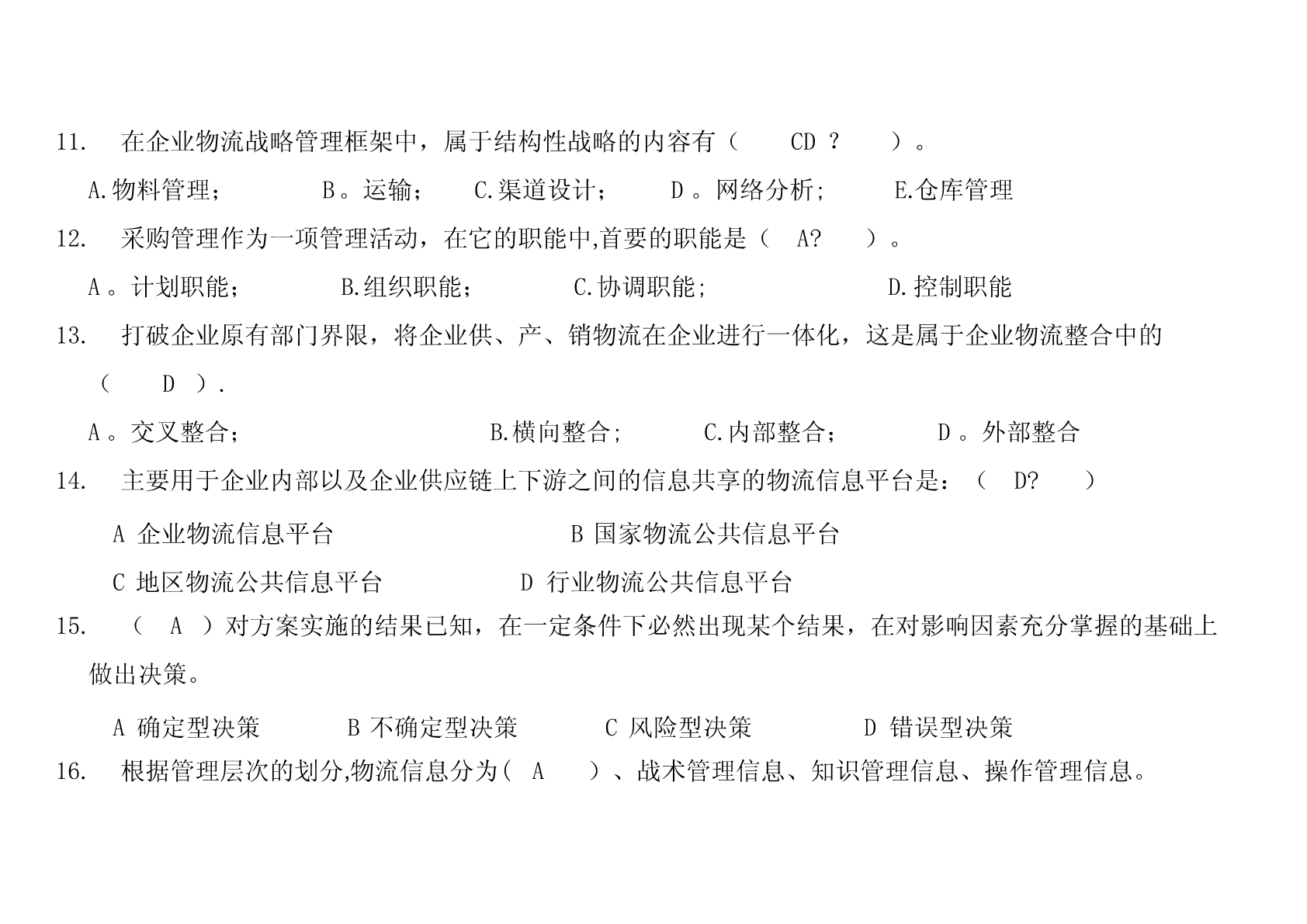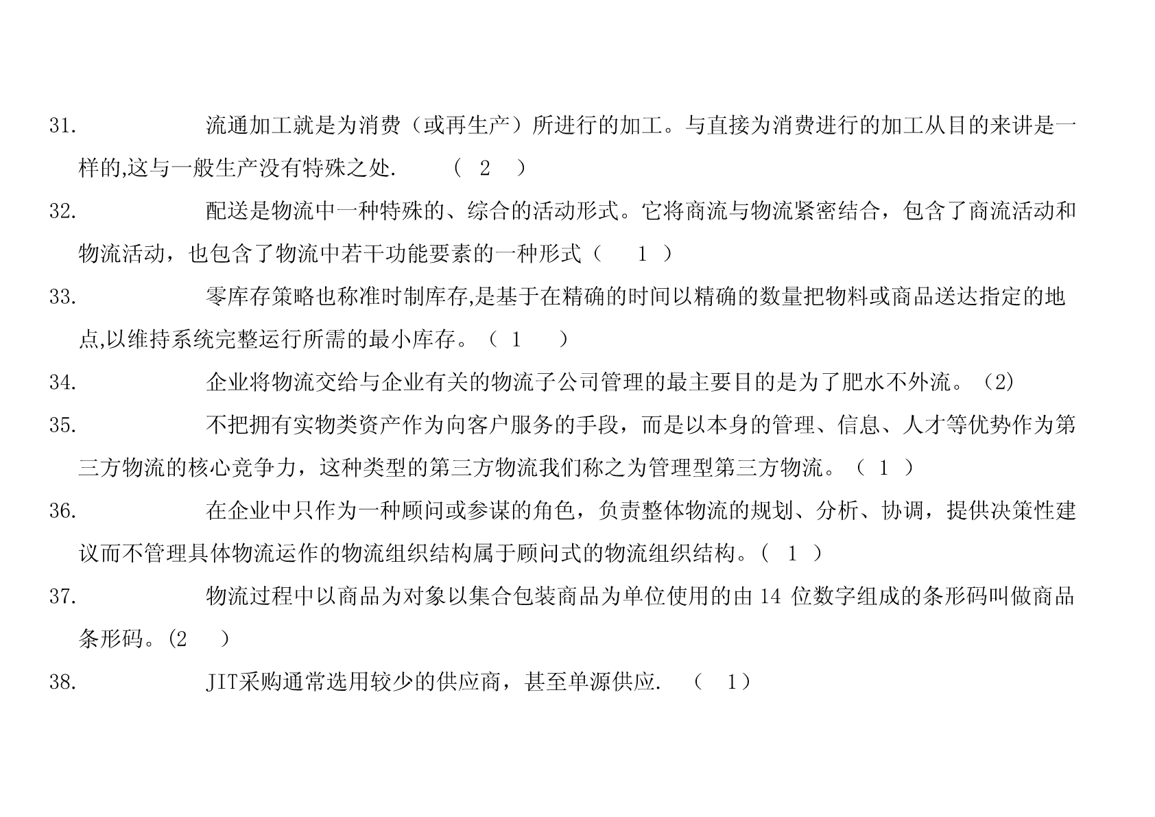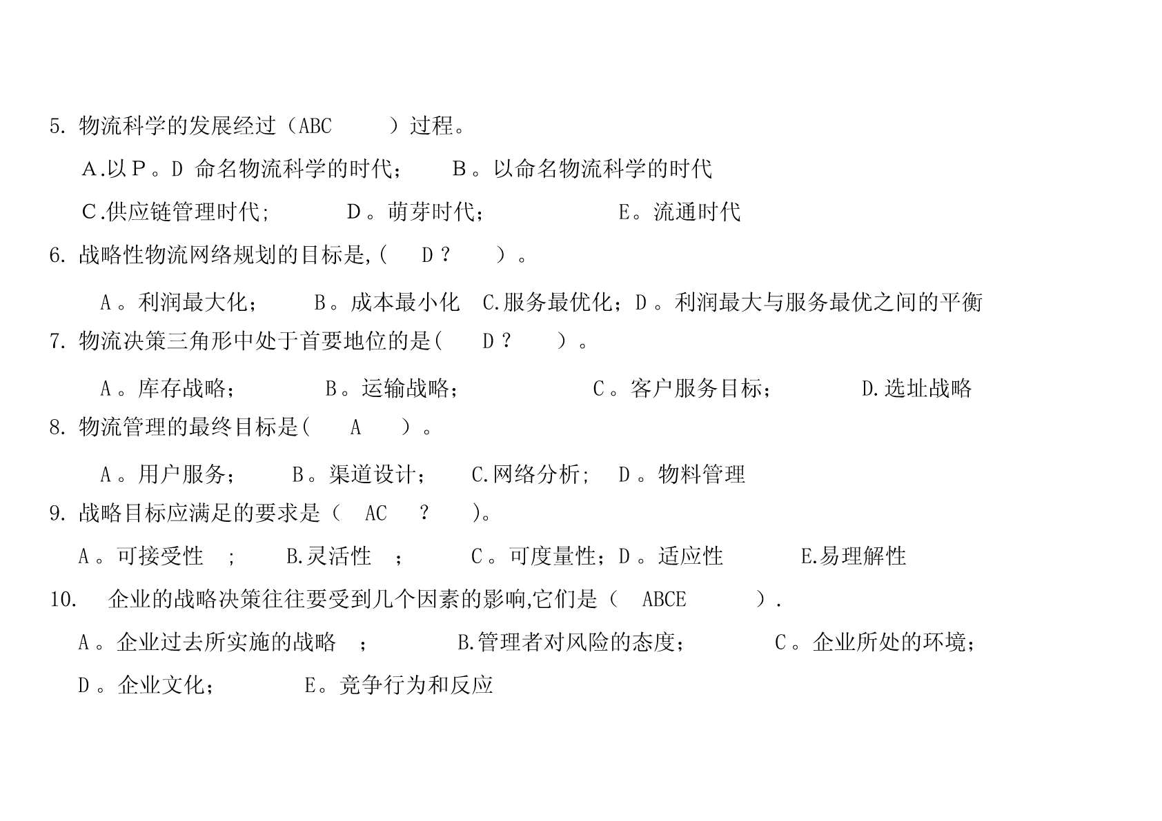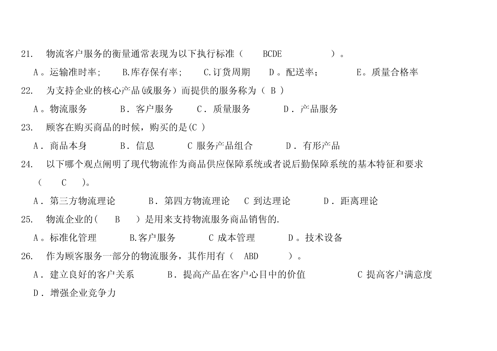 物流管理总复习题一、判断题1.流通实际上就是物流.(2)2.商流和物流的关系非常密切,两者都具有相同的活动内容和规律。(2)3.商流是产生物流的物质基础。(2)4.物流活动克服了供给方和需求方在空间和时间方面的距离.(1)5.企业制定物流战略的意义在于降低成本、减少资金占用、改进服务。(1)6.物流战略的第四层为基础型的,包括组织、信息系统、政策与策略、设施。(1)7.物流战略的第三层功能性的,包括物料管理、运输、仓库管理。(1)8.采购是商流,而不是物流.(2)9.采购是指通过商品交换和物流手段从资源市场取得资源的过程.(1)10.采购的基本作用是将资源从资源市场的供应者手中转移到用户手中的过程。(1)11.所谓客户服务是指为支持企业的核心产品(或服务)而提供的服务。(1)12.物流客户服务是企业物流系统的输出,它是由物流系统的一系列功能的活动实现的。这些功能活动的展开,需要投入生产要素,运用一定技术方法,按照作业流程进行操作,并需要进行全过程质量控制。(1)13.物流客户服务表现为一种经营理念,就是通过努力降低成本,找到企业经营效益和顾客需求的最佳结合点。(1)14.商品库存服务率是指商品库存满足订货要求的程度。(1)15.物流企业提供的是一种服务,这种服务是独立的,和制造企业、商业企业的物流客户服务无关。(2)16.如果站在从事有形产品(或服务)制造或稍售的制造企业或商业企业(即货主企业)的角度观察物流服务的话,物流服务属于企业顾客服务的范畴(1)17.工商企业用于支持产品稍售的物流服务同物流企业为稍售提供的物流是同一个概念,不能相混淆。(2)18.利用可能性等于存货服务率的乘积。(1)19.物流客户服务表现为一种经营理念.(1)20.商品完好率决定了客户对于所需商品的可得率。(2)21.只有选择商业企业才能处理受托代销业务。(1)22.销售出库成本核算方式选项在销售单据的业务处理过程中可以随时进行修。(2)23.客户档案中客户档案和供应商可设置对应关系,这种对应关系只能一对一的对应.(1)24.建立在系统中的所有存货档案都可以被材料出库单参照调用.(2)25.ERP是从制造企业的生产需求出发开发完善的.(2)26.企业物流包括生产物流、供应物流和销售物流。(1)27.在商品流通过程中,物流和商流是不能够分离的。(2)28.高水平的物流服务是指尽量用储备大量的库存来满足客户订单。(2)29.概括地说,运输交易往往受五方面的影响,他们是:托运人(起始地)、收货人(目的地)、承运人、政府和公众.(1)30.现代物流观念中,仓库被看作是一种存储设施,仅仅担负着存储产品的功能,它增加了整个产品的配送成本,并产生了额外的仓库作业成本。(2)31.流通加工就是为消费(或再生产)所进行的加工。与直接为消费进行的加工从目的来讲是一样的,这与一般生产没有特殊之处.(2)32.配送是物流中一种特殊的、综合的活动形式。它将商流与物流紧密结合,包含了商流活动和物流活动,也包含了物流中若干功能要素的一种形式(1)33.零库存策略也称准时制库存,是基于在精确的时间以精确的数量把物料或商品送达指定的地点,以维持系统完整运行所需的最小库存。(1)34.企业将物流交给与企业有关的物流子公司管理的最主要目的是为了肥水不外流。(2)35.不把拥有实物类资产作为向客户服务的手段,而是以本身的管理、信息、人才等优势作为第三方物流的核心竞争力,这种类型的第三方物流我们称之为管理型第三方物流。(1)36.在企业中只作为一种顾问或参谋的角色,负责整体物流的规划、分析、协调,提供决策性建议而不管理具体物流运作的物流组织结构属于顾问式的物流组织结构。(1)37.物流过程中以商品为对象以集合包装商品为单位使用的由14位数字组成的条形码叫做商品条形码。(2)38.JIT采购通常选用较少的供应商,甚至单源供应.(1)39.一个企业设立了物流管理部门,那么企业降低物流成本的责任应该全部归于物流部门。(2)40.企业物流业务对企业经营的重要性越大,企业越应选择第三方物流服务(2)41.订单处理的一般过程为:订单准备→订单传输→订单录入→订单履行→订单状况报告。(1)42.分拣员或分拣工具巡回于各个储存点并将订单上的货物取出,完成配货任务的分拣工艺叫做分货式工艺。(2)43.企业既有遵循JIT采购原则的按需采购,同时也有先期采购或预测采购,这是一种混合采购策略。(1)44.从仓储成本上考虑,周转量较低时,公共仓储是最佳选择,随着周转量的增加,由于可以把固定成本均摊到大量存货中,因此使用自有仓库更经济(1)45.牛鞭效应是一种沿着