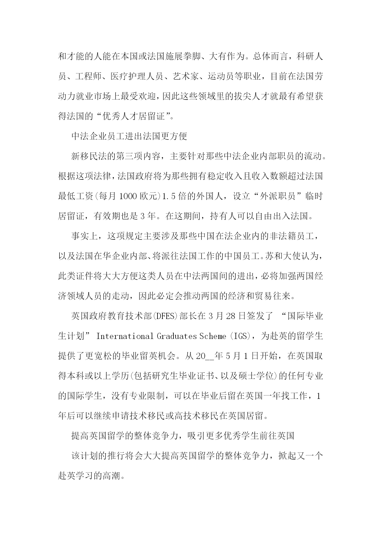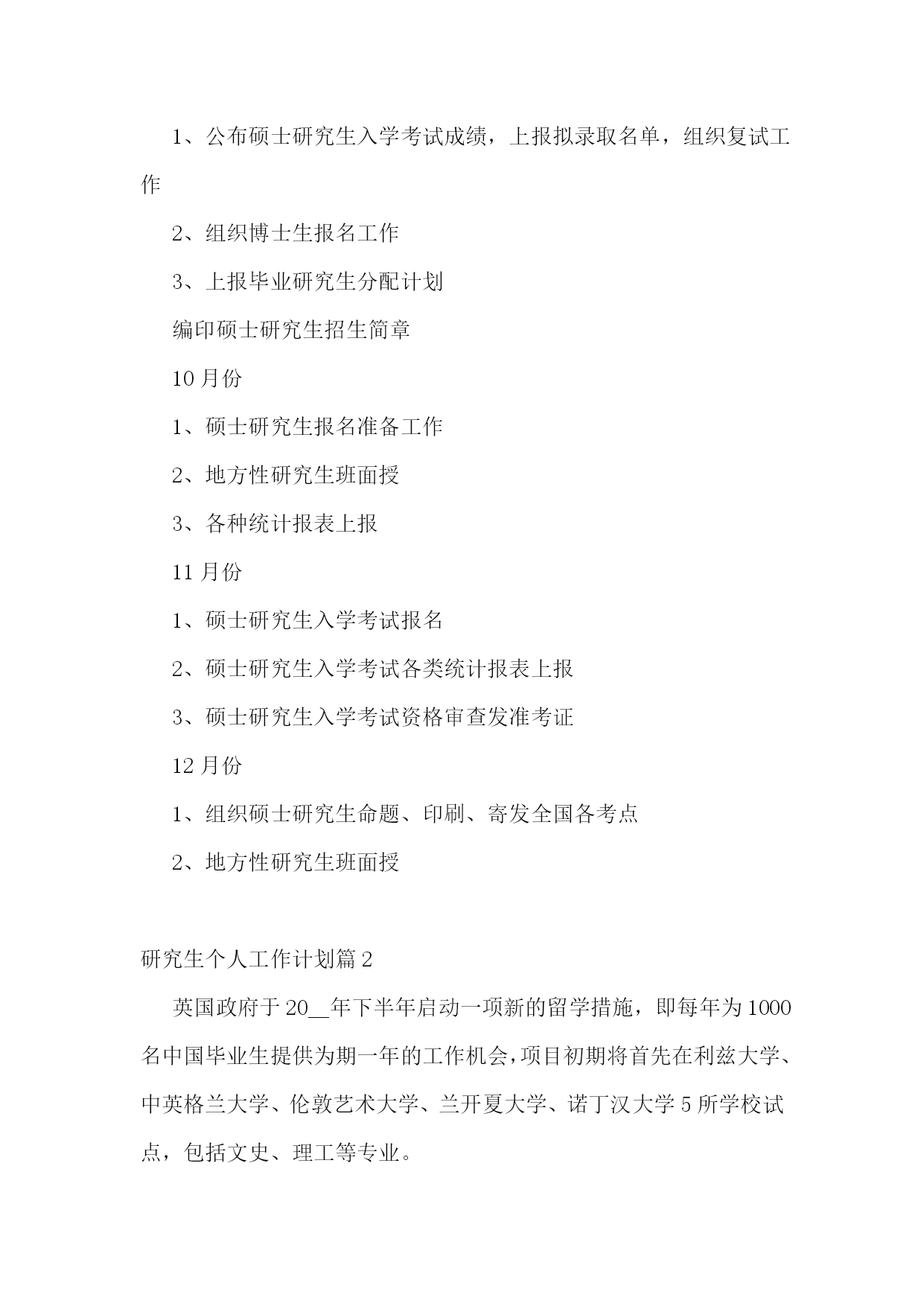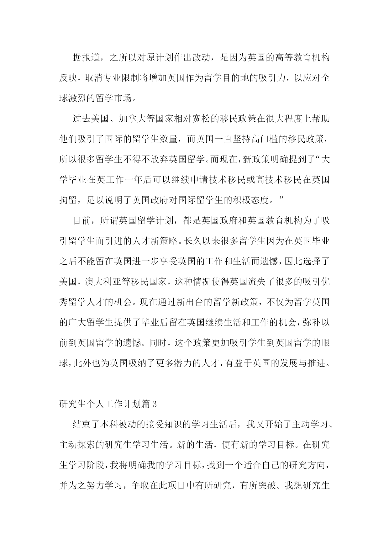 研究生个人工作计划10篇研究生个人工作计划篇1研究生处除了做好研究生工作发展规划的制定、检查落实、学位建设、管理规章制度的制定、执行及质量监控工作外,每年尚需要做好以下常规工作:月份及工作内容1月份1、组织研究生参加毕业“双选”会2、组织研究生入学考试3、回收研究生入学考试试卷4、学位点申报工作(二年一次)2月份1、地方性研究生班面授、考试工作2、研究生入学考试阅卷工作3、各类水平考试考务工作3月份1、各类水平考试考务工作2、研究生入学考试成绩录入、统计并上报3、将新导师申报表发送二级学院4、组织临床医学专业研究生下临床4月份1、公布硕士研究生入学考试成绩,上报拟录取名单,组织复试工作2、组织博士生报名工作3、上报毕业研究生分配计划编印硕士研究生招生简章10月份1、硕士研究生报名准备工作2、地方性研究生班面授3、各种统计报表上报11月份1、硕士研究生入学考试报名2、硕士研究生入学考试各类统计报表上报3、硕士研究生入学考试资格审查发准考证12月份1、组织硕士研究生命题、印刷、寄发全国各考点2、地方性研究生班面授研究生个人工作计划篇2英国政府于20__年下半年启动一项新的留学措施,即每年为1000名中国毕业生提供为期一年的工作机会,项目初期将首先在利兹大学、中英格兰大学、伦敦艺术大学、兰开夏大学、诺丁汉大学5所学校试点,包括文史、理工等专业。此外,作为英国留学理工科毕业生培养计划的扩展,英国政府又推出了“研究生一年延签工作计划”,所有拿到英国高校硕士及博士学位的学生,以及数理化和工程专业的本科生,可继续居留英国12个月进行求职。而继苏格兰地区最早对国际留学生推出两年工作签证、英格兰地区对理科学生推出一年工作签证后,威尔士地区也从去年6月开始对国际留学生的工作签证政策进行松绑。根据最新规定,国际留学生在威尔士公立大学攻读完任意专业硕士课程后,将获得一年工作延签,同时还推出了帮助学生解决就业问题的“GOWALES计划”。这一系列政策都旨在为留学生提供留英工作或实习的机会,而此举也必然吸引更多更为优秀的留学生赴英留学,用海外工作经历为自己将来的职业生涯发展打下良好的基础。通过就业市场引导专业选择来自英国的一份材料表明,20__年英国新就业机会比20__年多了11.3%,硕士毕业生的起薪大概在33万人民币左右,而在伦敦等知名城市则大概为39万左右。留学的目的最终仍然是为了就业,在英国读硕士仅需一年时间却花费不菲,这就更要求留学生在选择专业的时候要与职业生涯规划和对就业市场的了解以及自身专业背景相结合。20__年英国伦敦城市大学将开设“企业社会责任管理”、“数据仓储与挖掘”、“材料科学与市场营销”、“材料科学与管理”等新专业,以培养更为优秀的.复合型人才。“总之,法国颁布新移民法的目的就是使外国人进出法国和在法居住都更加方便。对中国而言,就是为了使中法人员流动、经济交往和其他各方面的合作都更加便利。”4月4日,法国驻华大使苏和在北京这样阐述了法国新移民法的颁布意图。20__年7月,法国议会通过了一项关于外国移民融入法国的新法律,并将于20__年8月26日起生效。由于当前赴法留学和工作的中国人越来越多,因此新移民法中所包含的多项新举措都与中国公民息息相关。分析人士认为,对外国人持更加欢迎、更加开放态度的法国新移民法,很可能带来中国人赴法留学和工作的新的“春天”。学生毕业后可再留法半年求职根据新移民法,所有赴法学习硕士或硕士以上课程并持有长期学习签证的外国学生,将在留法的第一年自动获得有效期为一年的“临时居留证”。与以往不同的是,从第二年起,这一证件将自动转为有效期为“多年居留证”。而在新法颁布以前,所有的此类学生只能一直持有一年有效的临时居留证,每年证件到期时都要再申请延长。此外,新移民法允许外国学生求学期间在法国打工,但工作时间以不超过法国的一个合法全日制岗位工时(通常为每周35小时)的60%为限,而无需经过特别批准。更具吸引力的是,当外国学生在法国学习结束并获得了硕士或硕士以上学位后,将被允许在法国再多居留6个月,以供其寻找或从事与所学专业有关的带薪工作。6个月结束后,如学生已获得一份工作或受聘承诺,将被允许在法继续居留。而根据以前的法律,外国留学生在学习结束后是不允许再在法国居留的。记者从法国驻华使馆了解到,目前在法国留学的中国人共有2.5万,而仅在20__年一年,法国驻华使馆就从中国收到了1万多份赴法留学签证申请,最终发放了8500份签证,拒签率为20%至25%。苏和大使表示,对中国赴法留学生群体来说,新移民法的实施无疑将使他们的学习、生活和工作都更加便利。高级人才权利接近法国国民新移民法除了对外国留法学生表现出更加开放的姿态外,还对