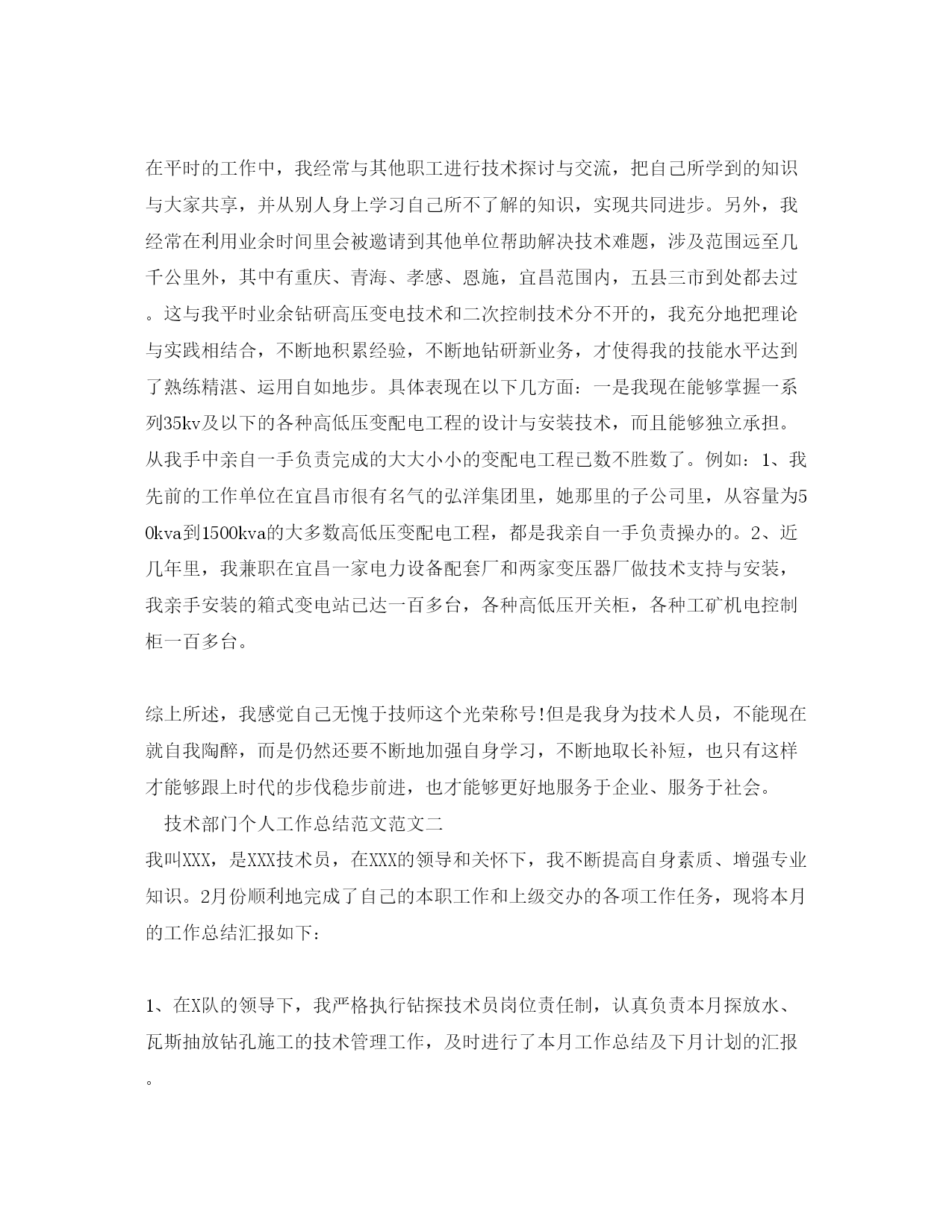 此资料由网络收集而来,如有侵权请告知上传者立即删除。资料共分享,我们负责传递知识。技术部门个人工作总结范文作为技术部的一名技术工作人员,不仅要有严谨的工作作风和认真细致的工作态度,还要充分发挥团队的合作精神,通过团队合作把自身工作能力发挥到最大。今天小编给大家为您整理了技术部门个人工作总结范文,希望对大家有所帮助。技术部门个人工作总结范文范文一一、自觉加强理论学习,努力提高个人素质没有坚定真确的政治方向,就不会有积极向上的指导思想。为了不断提高自己的政治思想素质,这几年来我一直非常关心国家大事,关注国内外形势,结合形势变化对企业的影响进行分析,并把这种思想付诸实际行动到生产过程中去,保证自己在思想和行动上始终与党和企业保持一致。同时,也把这种思想带入工作和学习中,不断追求自身进步。有人说:一个人要成才,必须得先做人,此话有理。这也就是说:一个人的事业要想得到成功,必须先要学会怎样做人!特别是干我们这项技术性很强的工作的,看事要用心、做事要专心、学习要虚心。容不得有半点马虎和出错。所有首先工作态度要端正,要有良好地职业素养,对工作要认真负责,服从领导安排,虚心听取别人的指点和建议,要团结同事、礼貌待人,服务热情。二、端正工作态度,起好带头作用自从进入公司参加工作开始,我就从事所有了所有的机电事务,包括所有基建时期的安全和质量的监督巡查。我深知机电管理工作在建设期间的重要性,特别是含有大部分隐形的电器基础设施与工程,要随时监督检查,发现问题就必须解决问题,决不能草草了事,否则后患无穷且再无法根除,这就摆机我们作机电管理的面前是一种考验和责任。作为我是一位机电班班长和一名电工技师,身上的责任和重担我义不容辞。因此,在平时的工作中,我不仅要求自己班组成员在监督巡查时,要认真仔细,做到一丝不苟,而且自己还深知打铁还须自身硬的道理。我对我自己做出了这样一些严格要求:一要在遇到脏累苦险的工作时抢在工人前头干,而且要比工人干的多、下得力;二要在遇到技术性难题是挺身而出,尽自己最大的努力攻克技术难关;我始终坚持以尽我最大努力做好每件事,以公司利益为重。包括建成后的生产过程中,有时是抢时间争分夺秒地处理了大大小小的电气设备故障有几十起,为公司赢取了宝贵的生产时间,为公司的发展打下了坚实的基础,为公司创造经美?婧蜕缁嵝б嫣峁┝思崆康暮蠖芎颓坑辛φ谋u稀h?俏乙?笞约耗苡掠诔械t鹑;我认为既然自己是一名技师,那么在业务水平等诸多方面就要比一般工人要强一些。在公司分配任务时,在一般工人完成起来比较困难的任务时,自己要主动踊跃承担,更不能与工人推诿扯皮,要做出师者风范,勇挑重担。平时我不仅是这样要求自己的,在实践中,我也是按这些要求去做的。所以我的这些表现也深深受到了公司领导和职工的一致好评,发挥了我作为一名技师应有的作用,树立了一名技师应有的良好形象。三、加强业务学习,提高技术水平长到老,学不了这句话是我的座右铭。科学技术不断发展的今天,一天不学,就被落后。特别是电气自动化这一块,没有谁能百分百的什么都精通完了,它是不断地在开发在更新,就和电脑软件一样,天天在更新,时时在发展。说不定你昨天还认识它,过两天它就变了样了,就有更先进的东东装进去了。所以我平时只要有时间就多看看专业书籍。一年来,我搜集了大量的新的专业书籍资料,不断地充实自己,不断地掌握新知。例如《电气设计制图》、《电子技术》、《现代变频技术》、《直流在工业中的应用》等等,在学习这些知识的过程中,我学到了很多新的知识,如:plc编程控制原理,abb变频器设置和控制原理、sipmos大功率双向可控硅的控制原理等等使我的确受益匪浅!不仅拓宽了我的知识面,还在很大程度上提高了我的技术水平,也使我对更高层次的理论及技术知识的学习产生了浓厚的兴趣。四、发展技艺互传,实现社会服务在平时的工作中,我经常与其他职工进行技术探讨与交流,把自己所学到的知识与大家共享,并从别人身上学习自己所不了解的知识,实现共同进步。另外,我经常在利用业余时间里会被邀请到其他单位帮助解决技术难题,涉及范围远至几千公里外,其中有重庆、青海、孝感、恩施,宜昌范围内,五县三市到处都去过。这与我平时业余钻研高压变电技术和二次控制技术分不开的,我充分地把理论与实践相结合,不断地积累经验,不断地钻研新业务,才使得我的技能水平达到了熟练精湛、运用自如地步。具体表现在以下几方面:一是我现在能够掌握一系列35kv及以下的各种高低压变配电工程的设计与安装技术,而且能够独立承担。从我手中亲自一手负责完成的大大小小的变配电工程已数不胜数了。例如:1、我先前的工作单位在宜昌市很有名气的弘洋集团里,她那里的子公司里,从容量为50kva到1500kva的大多数高低压变配电工程,都是我亲自一手负责操办的。2、近几年里,我兼职在宜昌一家电力设备