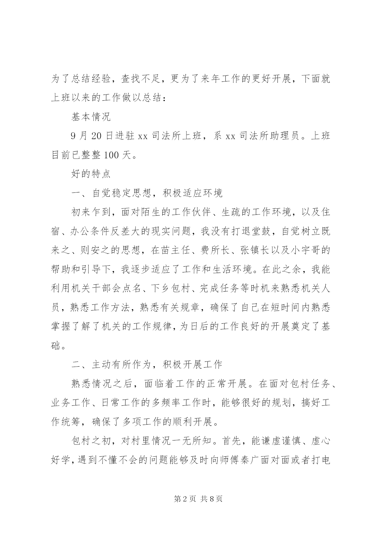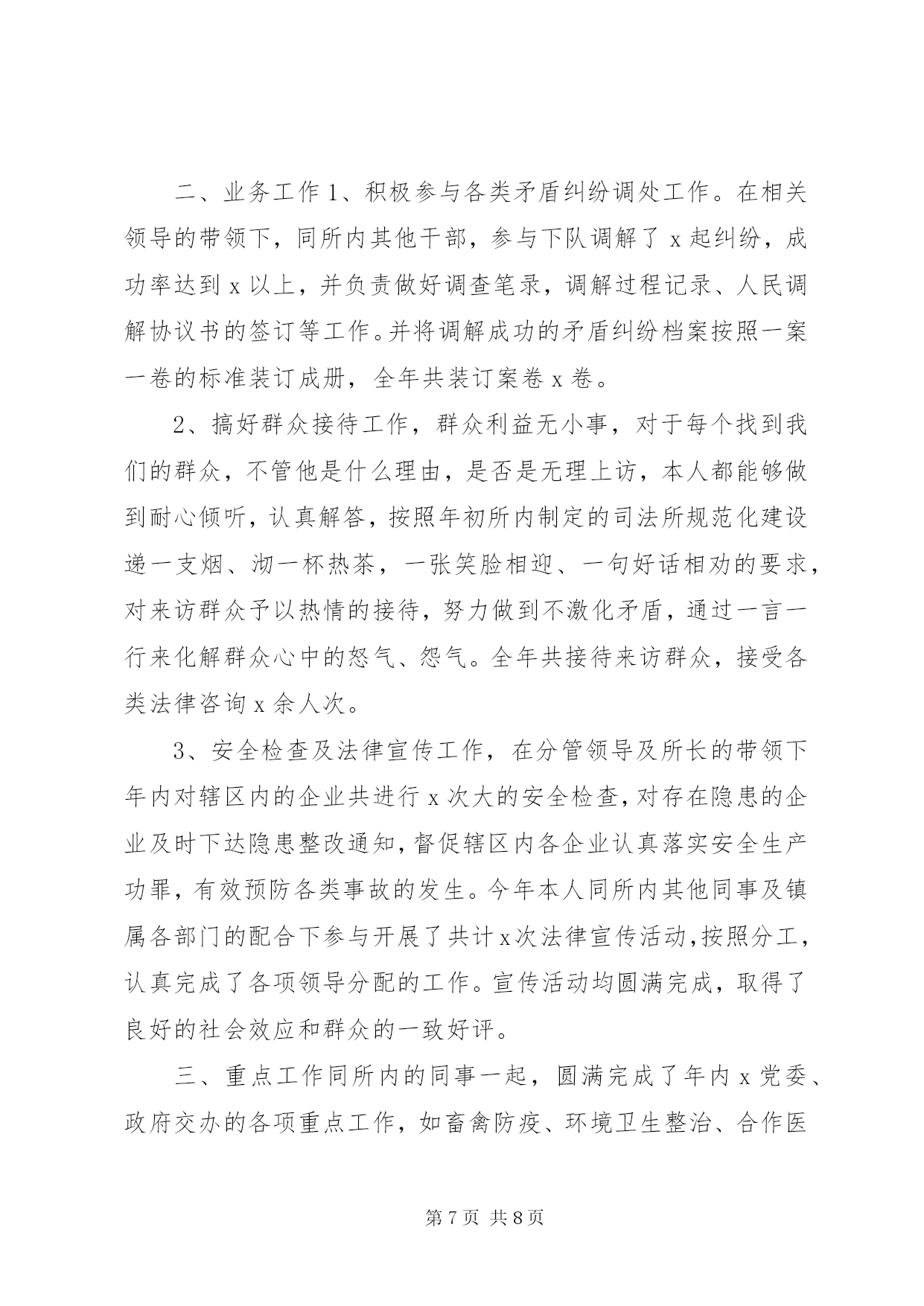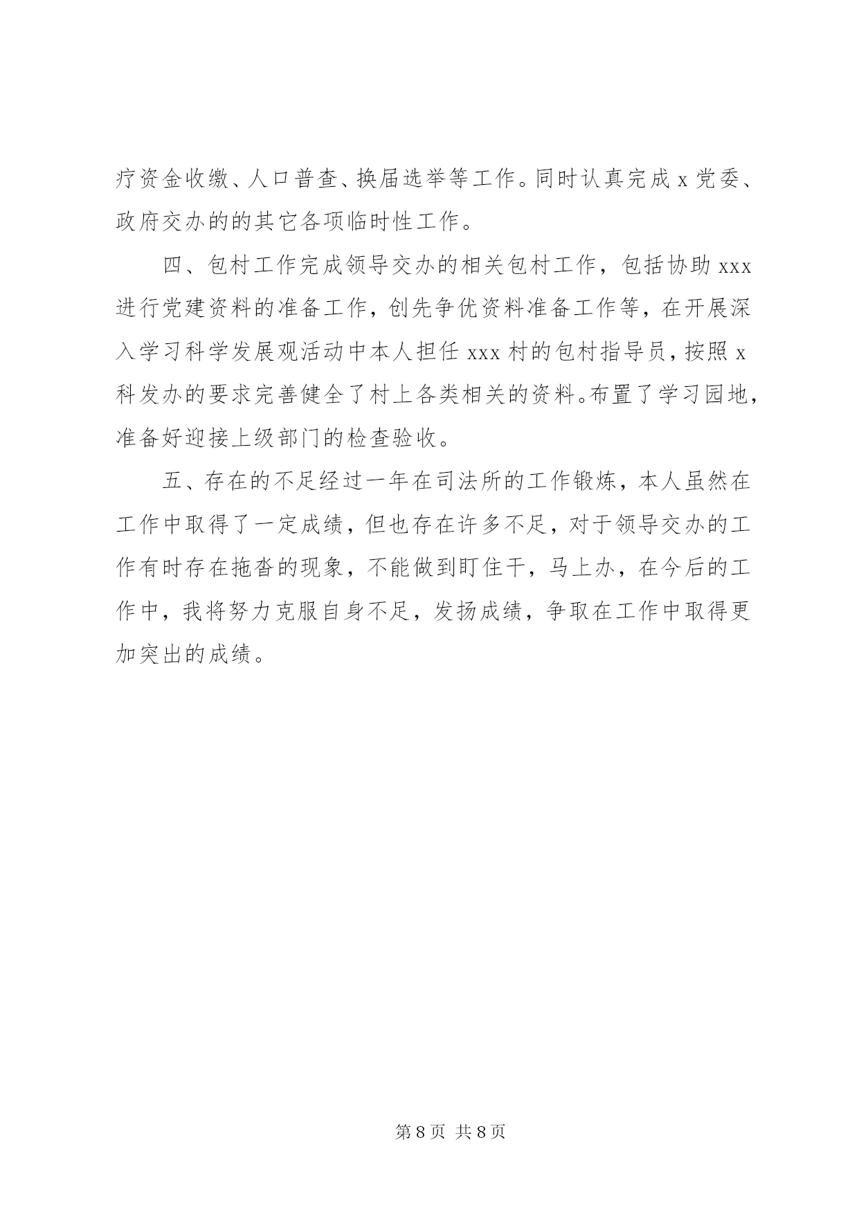 第PAGE\*Arabic\*MERGEFORMAT8页共NUMPAGES\*MERGEFORMAT8页司法所个人工作总结范文一。时光荏苒,岁月流逝,转眼间步入机关已整整三个月。三个月看似不长,但是确让我完成了许多个身份的转变,而就在这些不经意的身份转变中,我学会了适应、学会了投入、更学会了付出。这些转变让我更加珍惜这短暂而又悠长的上班生活。回顾上班以来的生活、工作、学习、业务等方面的开展情况,应该说:有得有失、喜忧参半。得。通过短短三个月的机关工作和生活,我得到了许多在书本、在校园里学不到的知识,让我将先前的理论和如今的实际结合的更加紧密。失。三个月里,也曾无数次牺牲自己的休息时间,加班加点的在忙工作,也曾在个人事务、家庭事务、和机关事务面前,毅然决然的选择了后者。喜。三个月,在各级领导的帮助和关心下,我对机关日常工作已经有所了解。在平时的业务方面、包村下乡方面有所建树。在村、镇以及县司法局部门有所印象。忧。由于时间短,自身素质不高等原因,导致自身的能力还不强,业务水平还不高。在工作中,时常会出现这样那样的小问题、小疏忽。2011年度的工作即将落下帷幕。2012年的工作也随之而来。为了总结经验,查找不足,更为了来年工作的更好开展,下面就上班以来的工作做以总结:基本情况9月20日进驻xx司法所上班,系xx司法所助理员。上班目前已整整100天。好的特点一、自觉稳定思想,积极适应环境初来乍到,面对陌生的工作伙伴、生疏的工作环境,以及住宿、办公条件反差大的现实问题,我没有打退堂鼓,自觉树立既来之、则安之的思想,在苗主任、费所长、张镇长以及小宇哥的帮助和引导下,我逐步适应了工作和生活环境。在此之余,我能利用机关干部会点名、下乡包村、完成任务等时机来熟悉机关人员,熟悉工作方法,熟悉有关规章,确保了自己在短时间内熟悉掌握了解了机关的工作规律,为日后的工作良好的开展奠定了基础。二、主动有所作为,积极开展工作熟悉情况之后,面临着工作的正常开展。在面对包村任务、业务工作、日常工作的多频率工作时,能够很好的规划,搞好工作统筹,确保了多项工作的顺利开展。包村之初,对村里情况一无所知。首先,能谦虚谨慎、虚心好学,遇到不懂不会的问题能够及时向师傅秦广面对面或者打电话请教。其次,从村干部开始建立良好的工作关系。从村干部到小组长、再到群众,逐步的认识人员,建立工作关系。最后,亲力亲为、主动作为,积极完成镇党委交与的任务。刚包寺底何村,为了工作不落在别人后面,我几乎每天下村一次,去跟文书熟悉村里情况。从人口、户口、产业、村情、民风等深入了解。镇政府安排的工作点面广、头绪多,我用笔记本做以记录,随身携带,逐一落实,确保工作万无一失。三个月,和师傅完成了寺底何村防讯工作、重建户审查、党支部换届选举、村委会换届选举、人大代表选举、村民小组长和村监督委员会选举、党报党刊征订、新合疗上缴、平安创建、扶贫路绿化。特别是新合疗的征收工作,面对13万的任务,能及时主动下到村里,给予督促,上门随访,确保了按时按点、保质保量的完成了任务。平安创建工作,经过平时的深入群众,年底县联合考核组在考核时,我村11户固定电话户对平安创建知识人人知晓。对创建平安陕西的目标户户满意。工作的成绩也受到了考核组的极大肯定。业务方面,能够摆正心态、从零学起。9月份,我们组织全镇人民调解员进行培训。自己在当好组织者的同时能兼顾好受训者,148法律服务所主任在授课时,能认真听讲、做好会议记录,同时能够学习老师在办案、调解、处理矛盾纠纷时的路子和方法,在工作中加以运用。曾多次跟随司法所长、综合治理办公室主任赴基层进行调解,张李村咸旬高速征地赔偿问题、范李村张志刚个人问题、南程村任启合父子土地纠纷问题的现场都有我们的身影。在社区矫正问题上,我们本着对劳教释放人员高度负责的态度,定期上门走访,掌握情况。今年,又接受2名释放人员进行矫正。范文二:一、加强学习,不断提高政治觉悟和业务水平。1、积极参加科学发展观学习实践活动,用科学发展的理念武装自己,指导个人的工作实践,敢于创新工作方法。2、为了加强司法所与社区工作人员、居民群众联系,提高工作效率,公开了小山司法所的电子信箱,主办了司法所建设、社区工作信息、普法宣传和法制教育、安置帮教社区矫正、人民调解、依法治街社区依法治理、法律咨询、司法所上站学习等十几个栏目。加强了对社区工作的指导,也给社区干部一个交流工作经验,展示个人才华的平台,最突出的作用在于方便了干部群众的法律咨询,规范了司法所服务行为。凡是境内干部居民向司法所咨询法律问题,小山司法所都会给一份较规范的法律咨询意见书。3、改进了司法所上站学习的形式。司法所上站的地点由办事处改为居委会,支持和主讲由司法所长改为社区工作人员,方式由开会授课式改为工作经验介绍、讨论的方式。司法所只