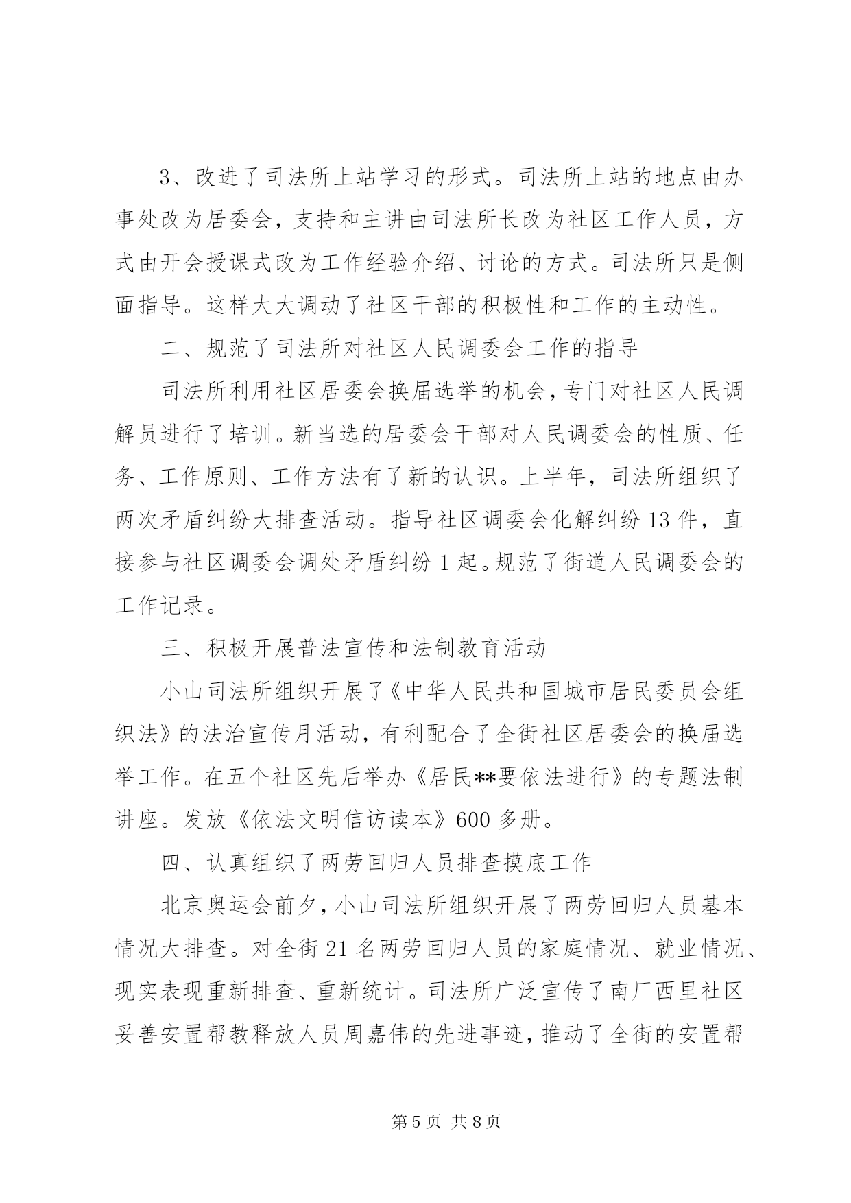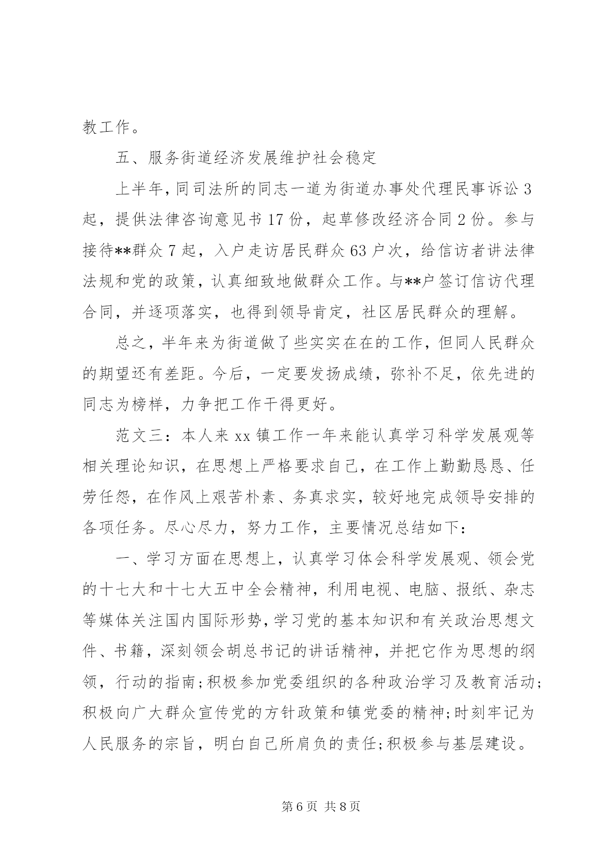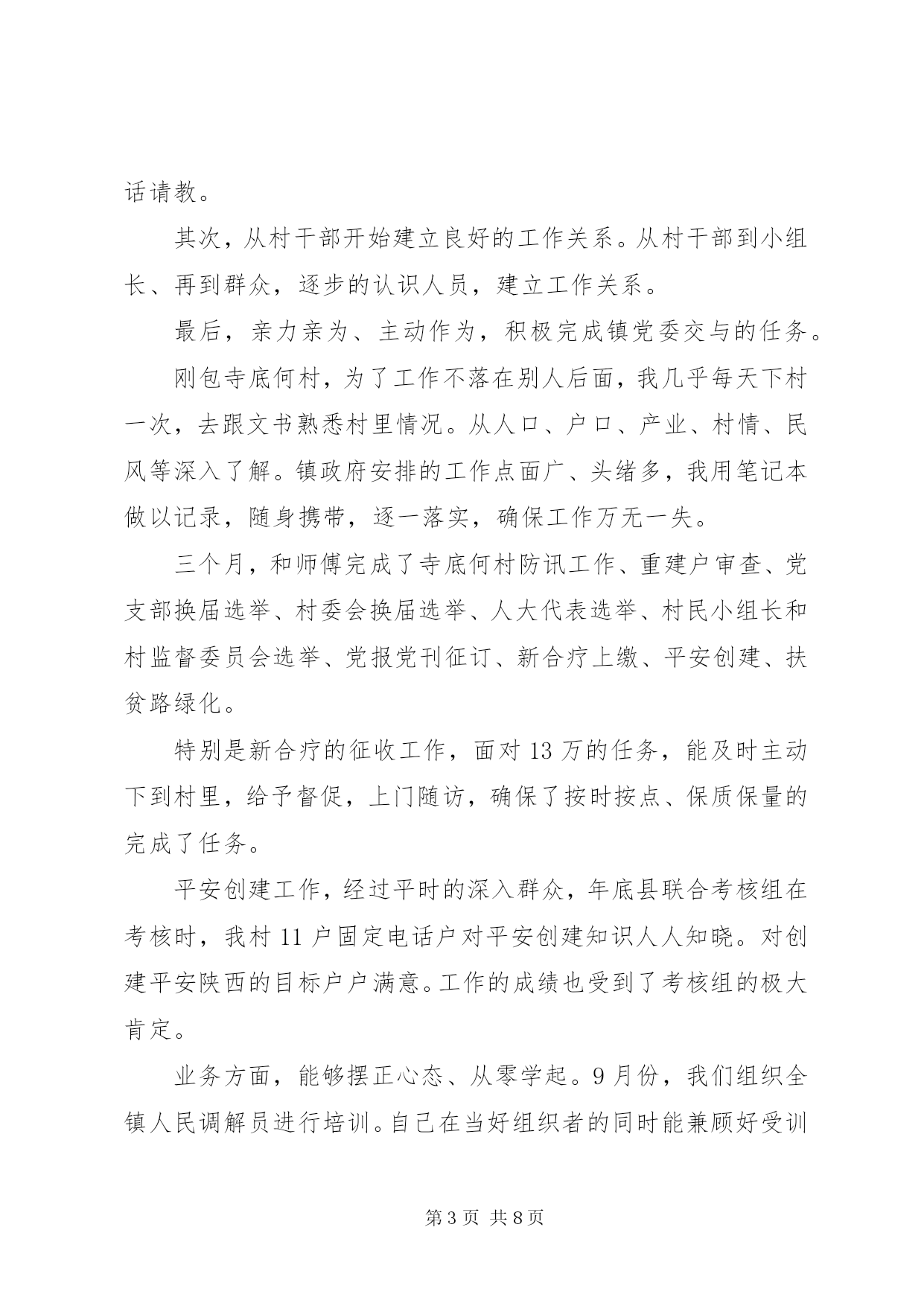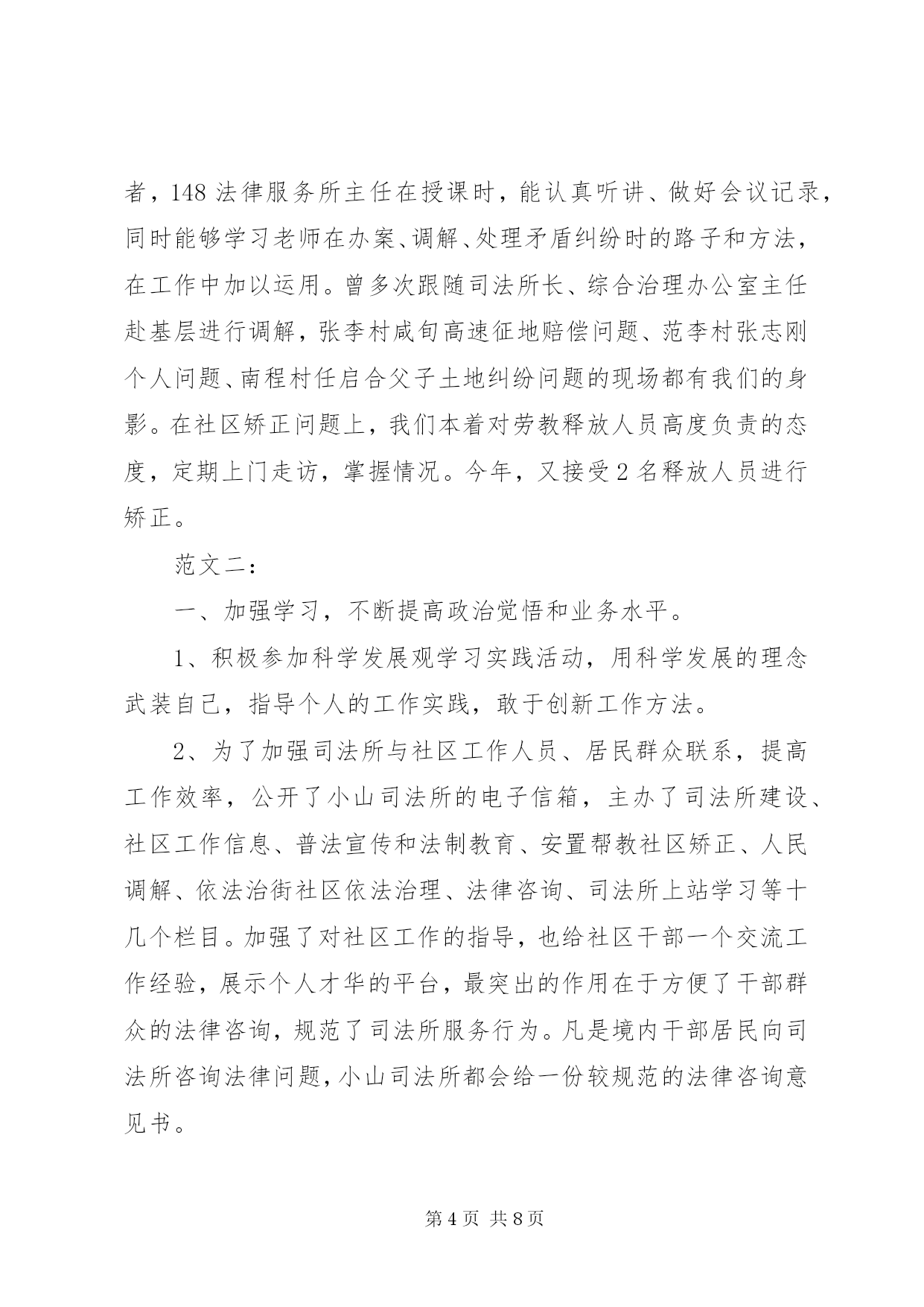 第PAGE\*Arabic\*MERGEFORMAT8页共NUMPAGES\*MERGEFORMAT8页司法所个人工作总结范文一。时光荏苒,岁月流逝,转眼间步入机关已整整三个月。三个月看似不长,但是确让我完成了许多个身份的转变,而就在这些不经意的身份转变中,我学会了适应、学会了投入、更学会了付出。这些转变让我更加珍惜这短暂而又悠长的上班生活。回顾上班以来的生活、工作、学习、业务等方面的开展情况,应该说:有得有失、喜忧参半。得。通过短短三个月的机关工作和生活,我得到了许多在书本、在校园里学不到的知识,让我将先前的理论和如今的实际结合的更加紧密。失。三个月里,也曾无数次牺牲自己的休息时间,加班加点的在忙工作,也曾在个人事务、家庭事务、和机关事务面前,毅然决然的选择了后者。喜。三个月,在各级领导的帮助和关心下,我对机关日常工作已经有所了解。在平时的业务方面、包村下乡方面有所建树。在村、镇以及县司法局部门有所印象。忧。由于时间短,自身素质不高等原因,导致自身的能力还不强,业务水平还不高。在工作中,时常会出现这样那样的小问题、小疏忽。2011年度的工作即将落下帷幕。2012年的工作也随之而来。为了总结经验,查找不足,更为了来年工作的更好开展,下面就上班以来的工作做以总结:基本情况9月20日进驻xx司法所上班,系xx司法所助理员。上班目前已整整100天。好的特点一、自觉稳定思想,积极适应环境初来乍到,面对陌生的工作伙伴、生疏的工作环境,以及住宿、办公条件反差大的现实问题,我没有打退堂鼓,自觉树立既来之、则安之的思想,在苗主任、费所长、张镇长以及小宇哥的帮助和引导下,我逐步适应了工作和生活环境。在此之余,我能利用机关干部会点名、下乡包村、完成任务等时机来熟悉机关人员,熟悉工作方法,熟悉有关规章,确保了自己在短时间内熟悉掌握了解了机关的工作规律,为日后的工作良好的开展奠定了基础。二、主动有所作为,积极开展工作熟悉情况之后,面临着工作的正常开展。在面对包村任务、业务工作、日常工作的多频率工作时,能够很好的规划,搞好工作统筹,确保了多项工作的顺利开展。包村之初,对村里情况一无所知。首先,能谦虚谨慎、虚心好学,遇到不懂不会的问题能够及时向师傅秦广面对面或者打电话请教。其次,从村干部开始建立良好的工作关系。从村干部到小组长、再到群众,逐步的认识人员,建立工作关系。最后,亲力亲为、主动作为,积极完成镇党委交与的任务。刚包寺底何村,为了工作不落在别人后面,我几乎每天下村一次,去跟文书熟悉村里情况。从人口、户口、产业、村情、民风等深入了解。镇政府安排的工作点面广、头绪多,我用笔记本做以记录,随身携带,逐一落实,确保工作万无一失。三个月,和师傅完成了寺底何村防讯工作、重建户审查、党支部换届选举、村委会换届选举、人大代表选举、村民小组长和村监督委员会选举、党报党刊征订、新合疗上缴、平安创建、扶贫路绿化。特别是新合疗的征收工作,面对13万的任务,能及时主动下到村里,给予督促,上门随访,确保了按时按点、保质保量的完成了任务。平安创建工作,经过平时的深入群众,年底县联合考核组在考核时,我村11户固定电话户对平安创建知识人人知晓。对创建平安陕西的目标户户满意。工作的成绩也受到了考核组的极大肯定。业务方面,能够摆正心态、从零学起。9月份,我们组织全镇人民调解员进行培训。自己在当好组织者的同时能兼顾好受训者,148法律服务所主任在授课时,能认真听讲、做好会议记录,同时能够学习老师在办案、调解、处理矛盾纠纷时的路子和方法,在工作中加以运用。曾多次跟随司法所长、综合治理办公室主任赴基层进行调解,张李村咸旬高速征地赔偿问题、范李村张志刚个人问题、南程村任启合父子土地纠纷问题的现场都有我们的身影。在社区矫正问题上,我们本着对劳教释放人员高度负责的态度,定期上门走访,掌握情况。今年,又接受2名释放人员进行矫正。范文二:一、加强学习,不断提高政治觉悟和业务水平。1、积极参加科学发展观学习实践活动,用科学发展的理念武装自己,指导个人的工作实践,敢于创新工作方法。2、为了加强司法所与社区工作人员、居民群众联系,提高工作效率,公开了小山司法所的电子信箱,主办了司法所建设、社区工作信息、普法宣传和法制教育、安置帮教社区矫正、人民调解、依法治街社区依法治理、法律咨询、司法所上站学习等十几个栏目。加强了对社区工作的指导,也给社区干部一个交流工作经验,展示个人才华的平台,最突出的作用在于方便了干部群众的法律咨询,规范了司法所服务行为。凡是境内干部居民向司法所咨询法律问题,小山司法所都会给一份较规范的法律咨询意见书。3、改进了司法所上站学习的形式。司法所上站的地点由办事处改为居委会,支持和主讲由司法所长改为社区工作人员,方式由开会授课式改为工作经验介绍、讨论的方式。司法所只