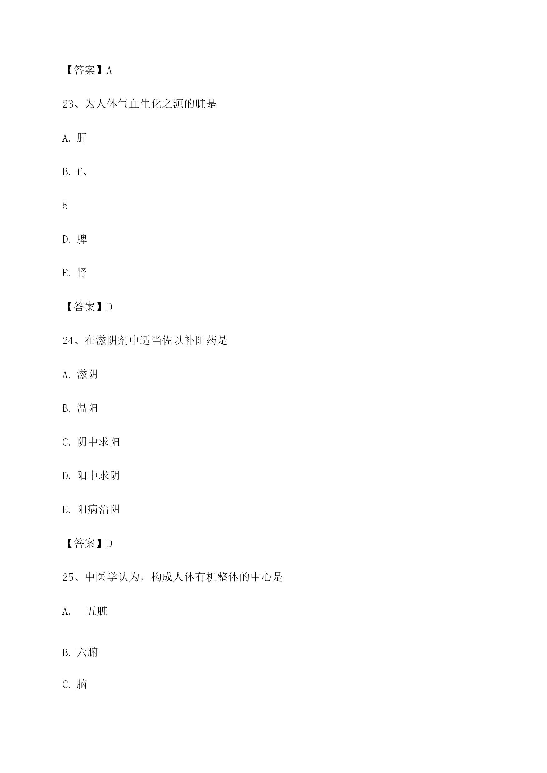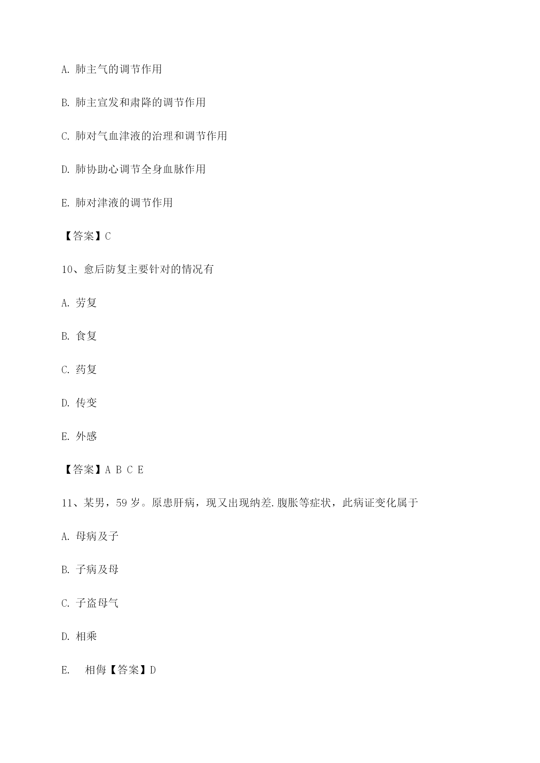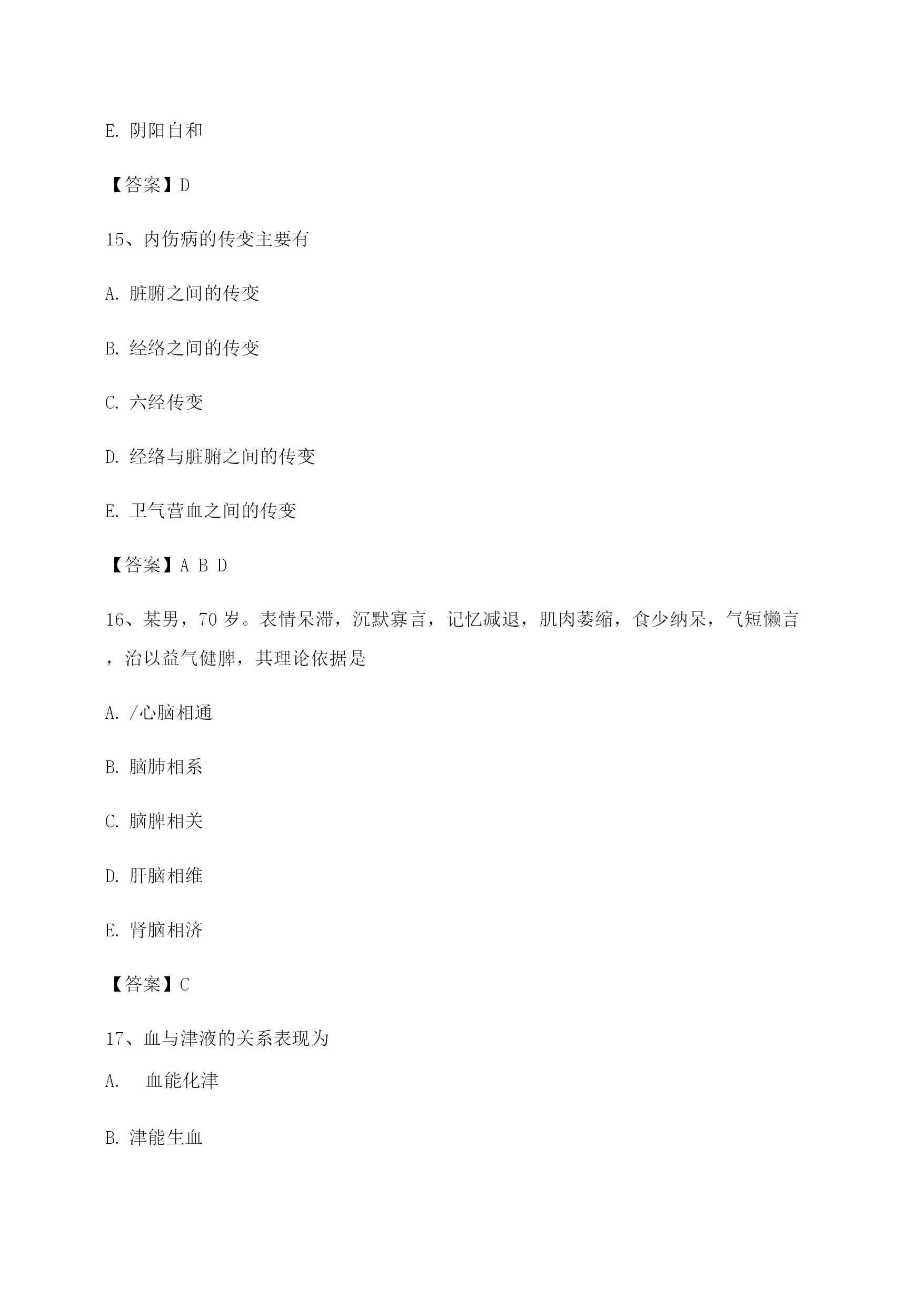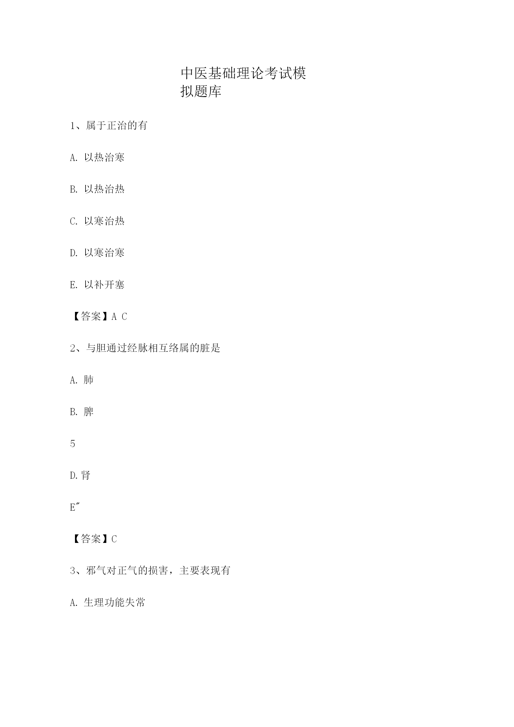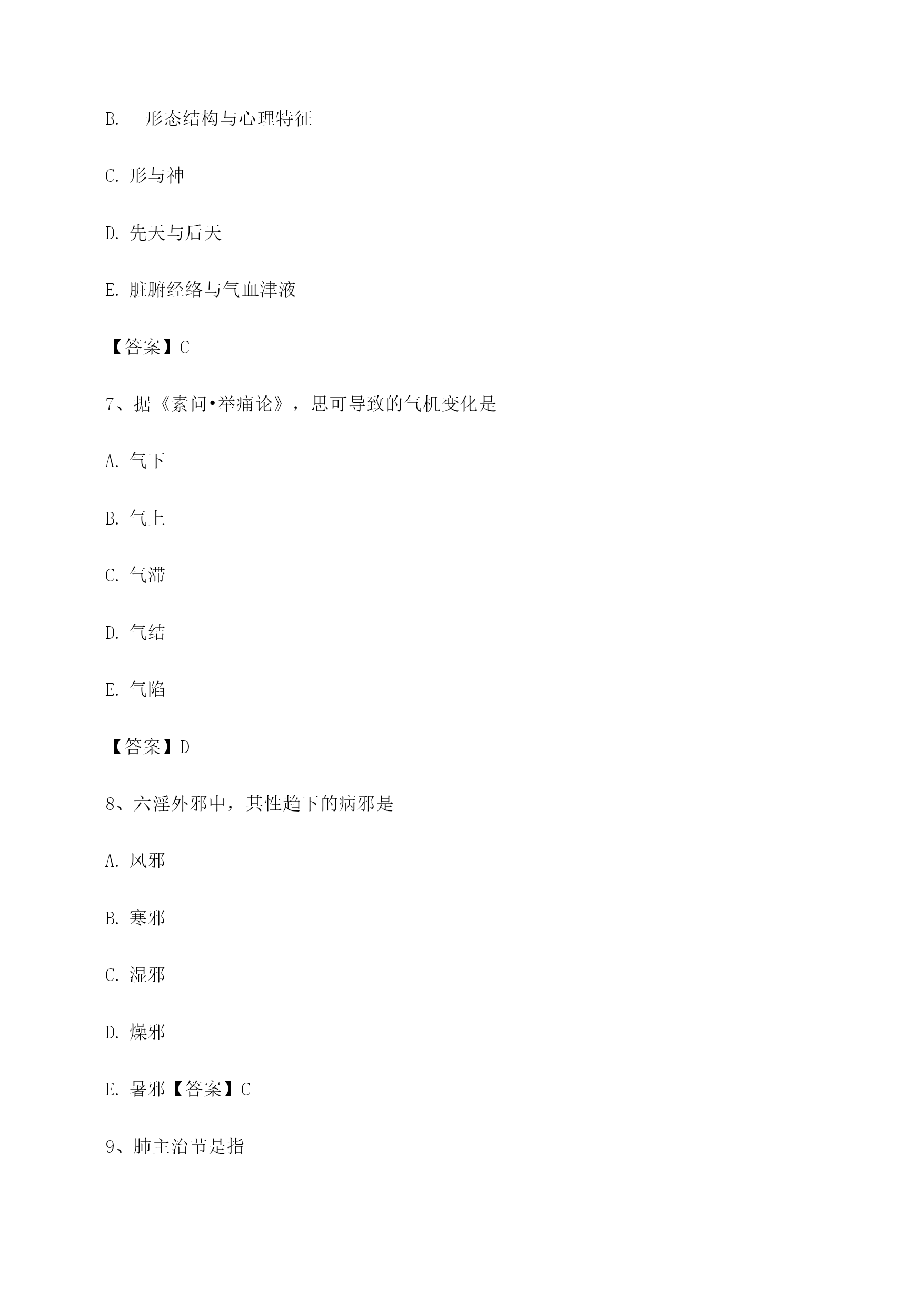中医基础理论考试模拟题库1、属于正治的有以热治寒以热治热以寒治热以寒治寒以补开塞【答案】AC2、与胆通过经脉相互络属的脏是肺脾5D.肾E"【答案】C3、邪气对正气的损害,主要表现有生理功能失常性格改变改变体质特征情志过激造成形质损伤【答案】ACE4、中医探求病因特有的方法是询问求因取象求因辨证求因辨病求因由果导因【答案】C5、阴偏胜概念和病机的表述包括病机特点为阴盛而阳未虚临床表现以实热证为主阴盛则热阴盛则阳病以寒.静.湿为其临床特点【答案】ADE6、体质概念所包含的基本内容是生理功能与心理特征形态结构与心理特征形与神先天与后天脏腑经络与气血津液【答案】C7、据《素问•举痛论》,思可导致的气机变化是气下气上气滞气结气陷【答案】D8、六淫外邪中,其性趋下的病邪是风邪寒邪湿邪燥邪暑邪【答案】C9、肺主治节是指肺主气的调节作用肺主宣发和肃降的调节作用肺对气血津液的治理和调节作用肺协助心调节全身血脉作用肺对津液的调节作用【答案】C10、愈后防复主要针对的情况有劳复食复药复传变外感【答案】ABCE11、某男,59岁。原患肝病,现又出现纳差.腹胀等症状,此病证变化属于母病及子子病及母子盗母气相乘相侮【答案】D12、“热者寒之”适用证候是虚热实热虚寒实寒格阴【答案】B13、疠气指六淫邪气异常气候情志变化气机失调乖戾之气【答案】E14、某女,38岁。持续高热,面红,咳喘,烦渴,脉数有力3天,突然出现面色苍白.四肢厥冷.精神萎靡.脉微欲绝等表现,此病证变化体现的是阴阳对立阴阳交感阴阳消长阴阳转化阴阳自和【答案】D15、内伤病的传变主要有脏腑之间的传变经络之间的传变六经传变经络与脏腑之间的传变卫气营血之间的传变【答案】ABD16、某男,70岁。表情呆滞,沉默寡言,记忆减退,肌肉萎缩,食少纳呆,气短懒言,治以益气健脾,其理论依据是/心脑相通脑肺相系脑脾相关肝脑相维肾脑相济【答案】C17、血与津液的关系表现为血能化津津能生血津能摄血津能行血津能载血【答案】AB18、气的运动称气化气机聚散升降转化【答案】B19、瘀血质者,辨体施药应忌用的是辛热温散阴柔滋补甘寒清润疏利气血固涩收敛【答案】E20、水火之宅是指TOC\o"1-5"\h\z脾胃肾5肺【答案】C21、某男,35岁。身体强壮,胖瘦适中,面色红润,性格开朗,精力充沛,睡眠良好,其体质类型是偏阳质偏阴质痰湿质平和质特禀质【答案】D22、中医学描述肺“虚如蜂巢”所体现的思维方式是形象思维意象思维应象思维抽象思维逻辑思维【答案】A23、为人体气血生化之源的脏是TOC\o"1-5"\h\z肝f、5脾肾【答案】D24、在滋阴剂中适当佐以补阳药是滋阴温阳阴中求阳阳中求阴阳病治阴【答案】D25、中医学认为,构成人体有机整体的中心是五脏六腑脑命门经络【答案】A26、某男,40岁。食少乏力3个月。由于过度劳累而致头晕乏力,纳呆食少.胸胁胀满.腹痛泄泻。中医病机是本旺乘土肝气犯胃脾虚肝乘胃弱肝乘肝火犯肺【答案】C27、某男,52岁。因交通事故大出血,呼吸微弱,汗出不止,神识朦胧,面色苍白,脉微欲绝,其病机是气血两虚气虚血瘀血不养神气随血脱血不载气【答案】D28、与冲脉相关的称谓有血海气海十二经脉之海阴脉之海五脏六腑之海【答案】ACE29、十二经脉中循行于腹部的经脉,自内向外的顺序是足少阴.足阳明.足太阴.足厥阴足少阴.足阳明.足厥阴.足太阴足太阴.足阳明.足少阴.足厥阴足阳明.足少阴.足太阴.足厥阴足阳明.足太阴.足厥阴.足少阴【答案】A30、某女,23岁。心烦,舌赤糜烂,尿少尿赤。中医病机是北大肠实热,腑气不通M经实火,移热小肠肾气虚弱,蒸化无权肝气郁滞,郁而化火脾失健运,腹胀腹泻【答案】B31、气的运动称气化气机聚散升降转化【答案】B32、属于外感病因的是六淫六气七情饮食劳逸【答案】A诸热瞀瘛,皆属于”33、《素问•至真要大论》:热火TOC\o"1-5"\h\z/心风暑【答案】B34、人的生命活动的基本形式,即是气化变化转化形化运化【答案】A35、脾与肾的关系包括先后天互资8.燥湿相济水液代谢上下相应精血互生【答案】AC36、疠气形成和疫病流行的原因有气候反常社会因素暴饮暴食环境污染预防隔离工作不好【答案
