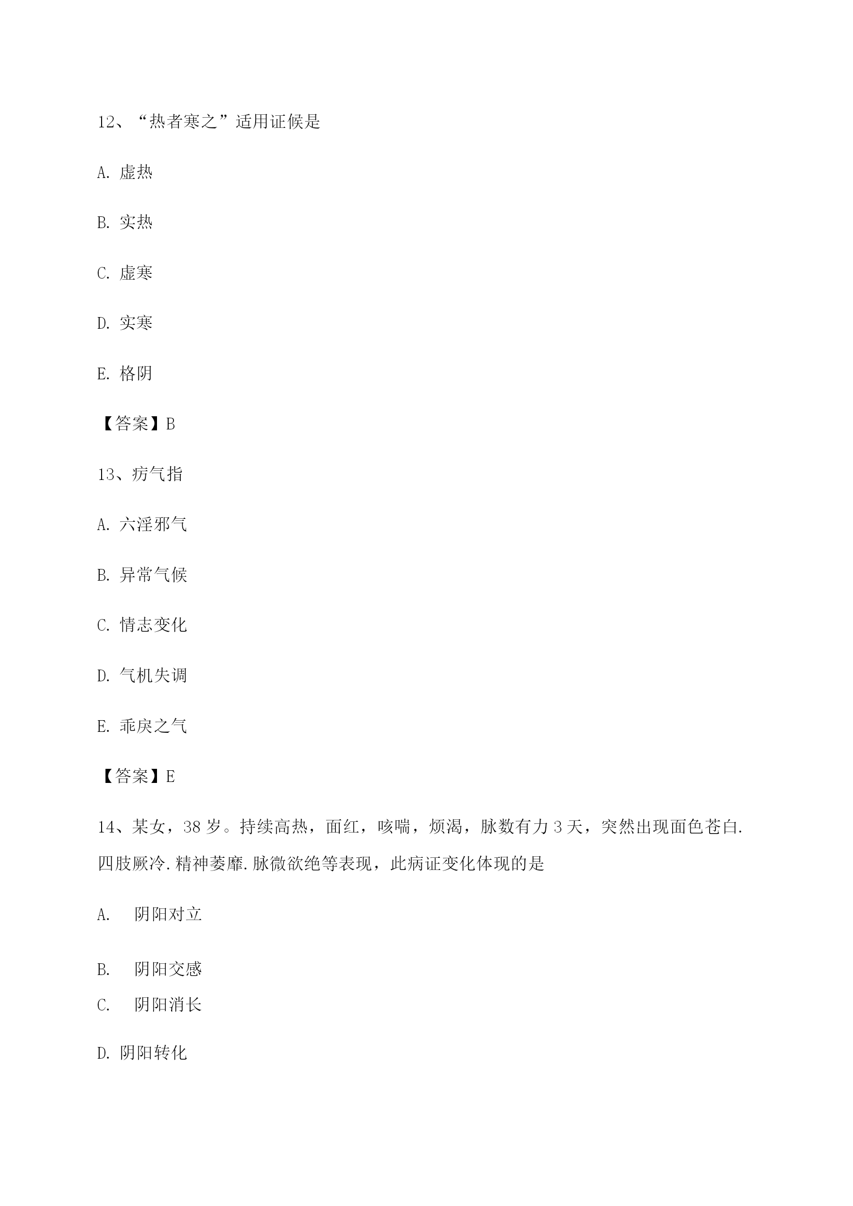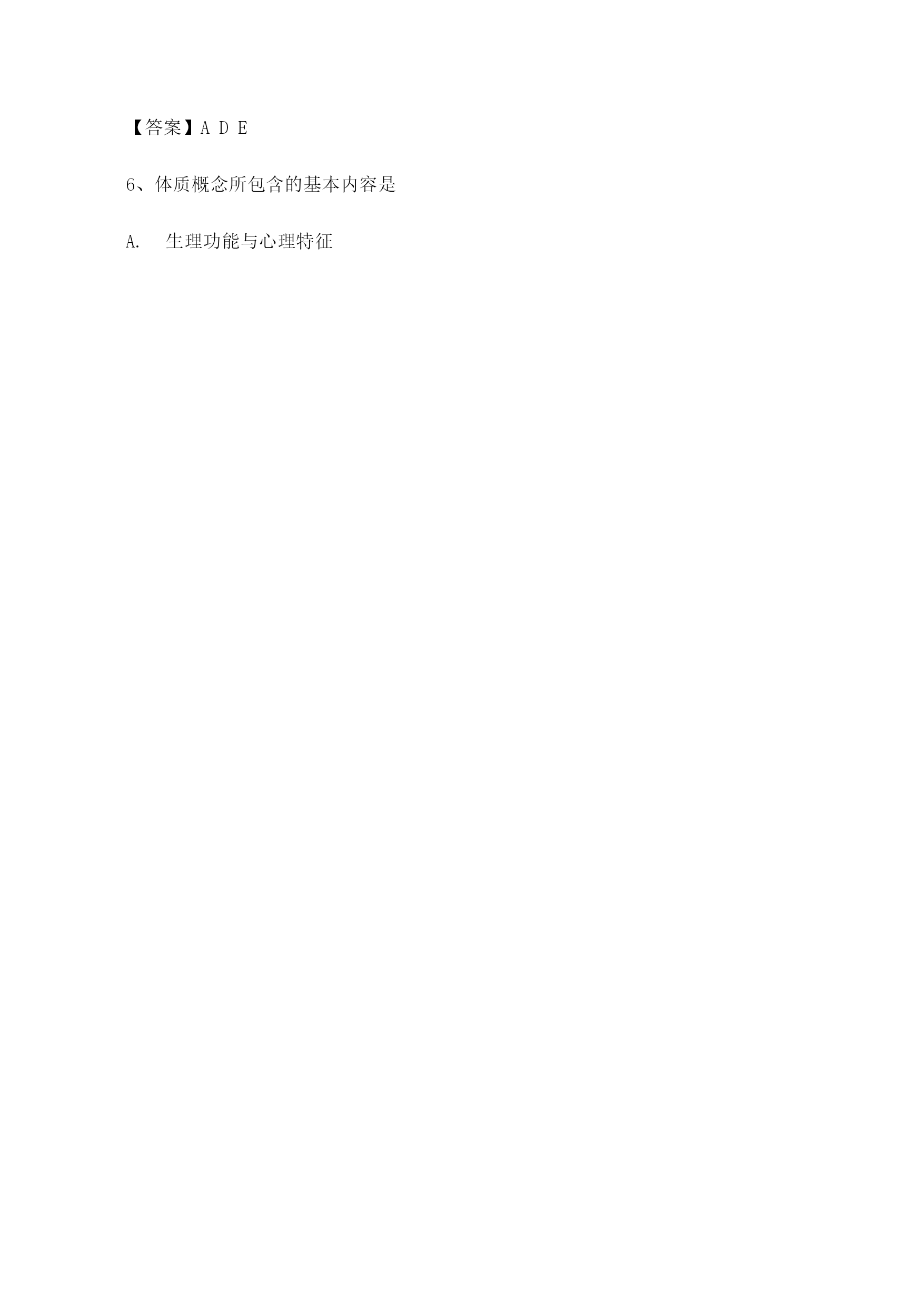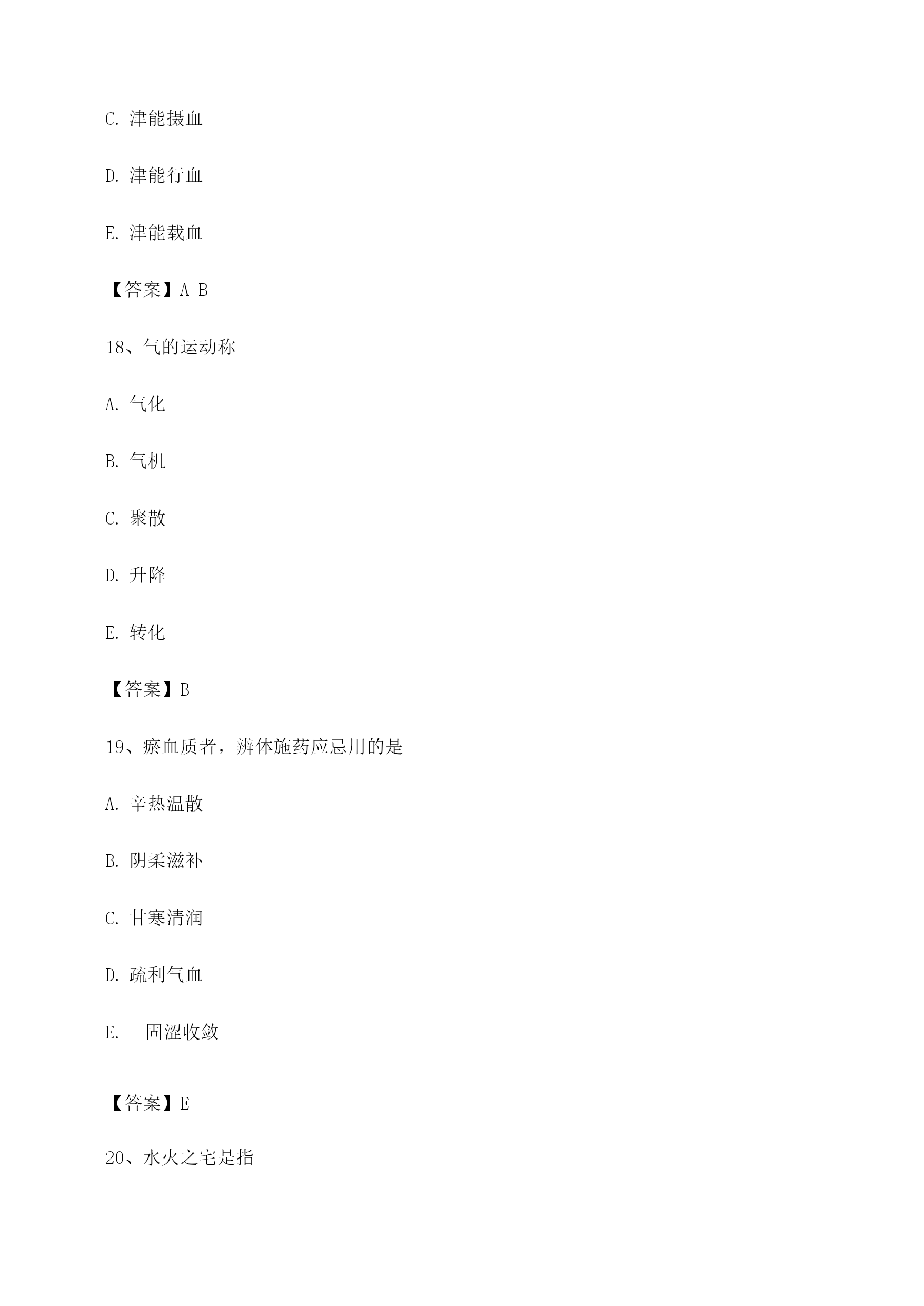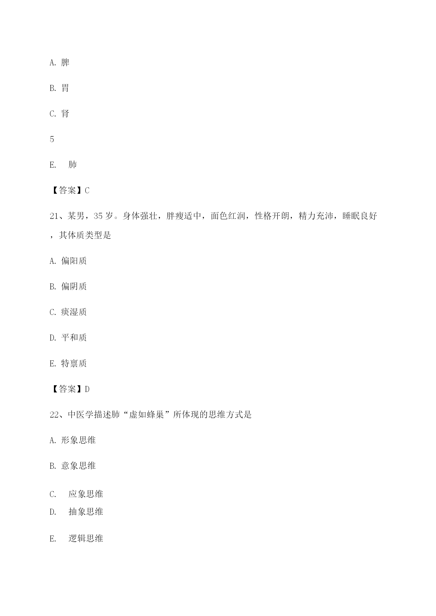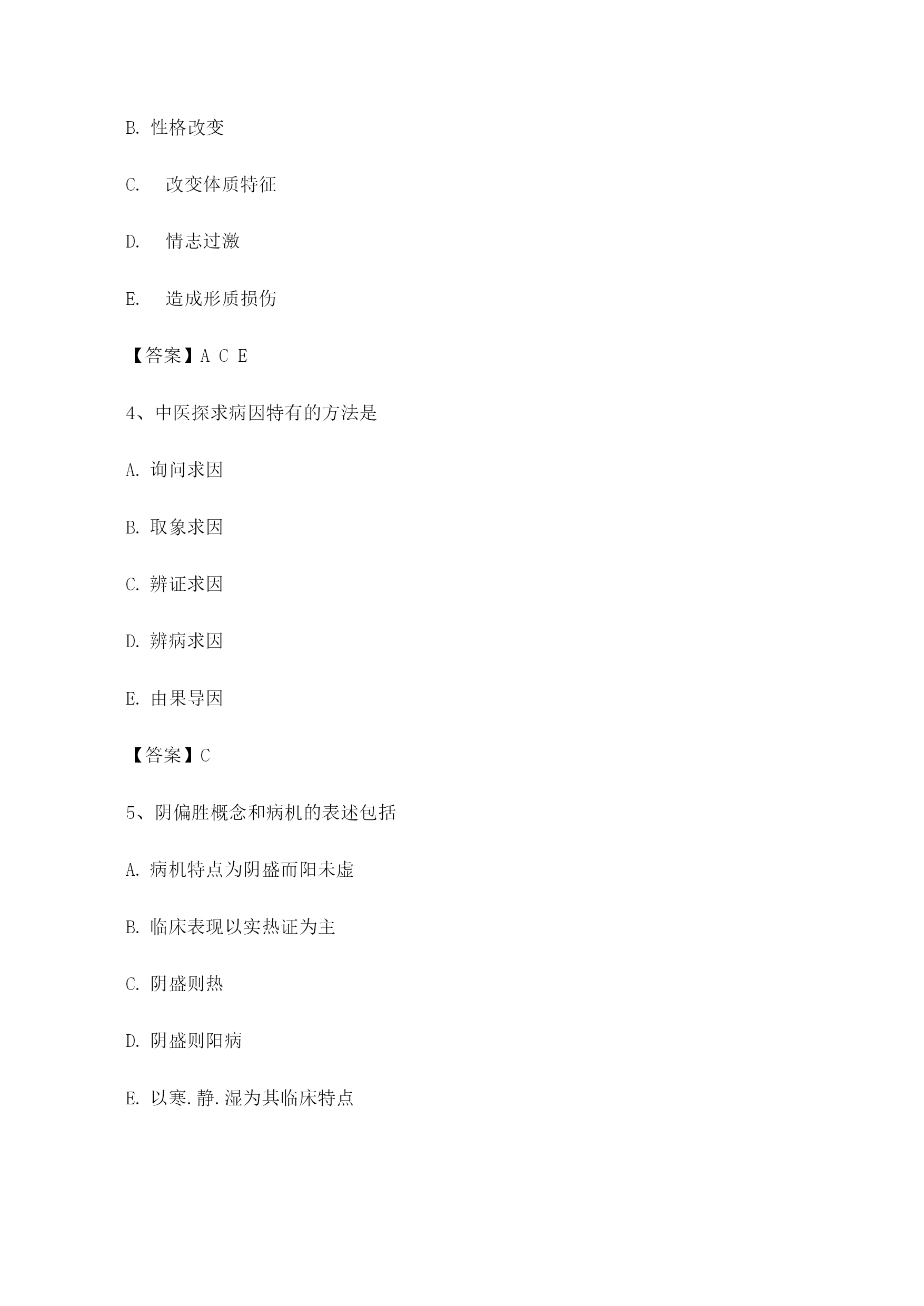 中医基础理论考试模拟题库1、属于正治的有以热治寒以热治热以寒治热以寒治寒以补开塞【答案】AC2、与胆通过经脉相互络属的脏是肺脾5D.肾E"【答案】C3、邪气对正气的损害,主要表现有生理功能失常性格改变改变体质特征情志过激造成形质损伤【答案】ACE4、中医探求病因特有的方法是询问求因取象求因辨证求因辨病求因由果导因【答案】C5、阴偏胜概念和病机的表述包括病机特点为阴盛而阳未虚临床表现以实热证为主阴盛则热阴盛则阳病以寒.静.湿为其临床特点【答案】ADE6、体质概念所包含的基本内容是生理功能与心理特征形态结构与心理特征形与神先天与后天脏腑经络与气血津液【答案】C7、据《素问•举痛论》,思可导致的气机变化是气下气上气滞气结气陷【答案】D8、六淫外邪中,其性趋下的病邪是风邪寒邪湿邪燥邪暑邪【答案】C9、肺主治节是指肺主气的调节作用肺主宣发和肃降的调节作用肺对气血津液的治理和调节作用肺协助心调节全身血脉作用肺对津液的调节作用【答案】C10、愈后防复主要针对的情况有劳复食复药复传变外感【答案】ABCE11、某男,59岁。原患肝病,现又出现纳差.腹胀等症状,此病证变化属于母病及子子病及母子盗母气相乘相侮【答案】D12、“热者寒之”适用证候是虚热实热虚寒实寒格阴【答案】B13、疠气指六淫邪气异常气候情志变化气机失调乖戾之气【答案】E14、某女,38岁。持续高热,面红,咳喘,烦渴,脉数有力3天,突然出现面色苍白.四肢厥冷.精神萎靡.脉微欲绝等表现,此病证变化体现的是阴阳对立阴阳交感阴阳消长阴阳转化阴阳自和【答案】D15、内伤病的传变主要有脏腑之间的传变经络之间的传变六经传变经络与脏腑之间的传变卫气营血之间的传变【答案】ABD16、某男,70岁。表情呆滞,沉默寡言,记忆减退,肌肉萎缩,食少纳呆,气短懒言,治以益气健脾,其理论依据是/心脑相通脑肺相系脑脾相关肝脑相维肾脑相济【答案】C17、血与津液的关系表现为血能化津津能生血津能摄血津能行血津能载血【答案】AB18、气的运动称气化气机聚散升降转化【答案】B19、瘀血质者,辨体施药应忌用的是辛热温散阴柔滋补甘寒清润疏利气血固涩收敛【答案】E20、水火之宅是指TOC\o"1-5"\h\z脾胃肾5肺【答案】C21、某男,35岁。身体强壮,胖瘦适中,面色红润,性格开朗,精力充沛,睡眠良好,其体质类型是偏阳质偏阴质痰湿质平和质特禀质【答案】D22、中医学描述肺“虚如蜂巢”所体现的思维方式是形象思维意象思维应象思维抽象思维逻辑思维【答案】A23、为人体气血生化之源的脏是TOC\o"1-5"\h\z肝f、5脾肾【答案】D24、在滋阴剂中适当佐以补阳药是滋阴温阳阴中求阳阳中求阴阳病治阴【答案】D25、中医学认为,构成人体有机整体的中心是五脏六腑脑命门经络【答案】A26、某男,40岁。食少乏力3个月。由于过度劳累而致头晕乏力,纳呆食少.胸胁胀满.腹痛泄泻。中医病机是本旺乘土肝气犯胃脾虚肝乘胃弱肝乘肝火犯肺【答案】C27、某男,52岁。因交通事故大出血,呼吸微弱,汗出不止,神识朦胧,面色苍白,脉微欲绝,其病机是气血两虚气虚血瘀血不养神气随血脱血不载气【答案】D28、与冲脉相关的称谓有血海气海十二经脉之海阴脉之海五脏六腑之海【答案】ACE29、十二经脉中循行于腹部的经脉,自内向外的顺序是足少阴.足阳明.足太阴.足厥阴足少阴.足阳明.足厥阴.足太阴足太阴.足阳明.足少阴.足厥阴足阳明.足少阴.足太阴.足厥阴足阳明.足太阴.足厥阴.足少阴【答案】A30、某女,23岁。心烦,舌赤糜烂,尿少尿赤。中医病机是北大肠实热,腑气不通M经实火,移热小肠肾气虚弱,蒸化无权肝气郁滞,郁而化火脾失健运,腹胀腹泻【答案】B31、气的运动称气化气机聚散升降转化【答案】B32、属于外感病因的是六淫六气七情饮食劳逸【答案】A诸热瞀瘛,皆属于”33、《素问•至真要大论》:热火TOC\o"1-5"\h\z/心风暑【答案】B34、人的生命活动的基本形式,即是气化变化转化形化运化【答案】A35、脾与肾的关系包括先后天互资8.燥湿相济水液代谢上下相应精血互生【答案】AC36、疠气形成和疫病流行的原因有气候反常社会因素暴饮暴食环境污染预防隔离工作不好【答案