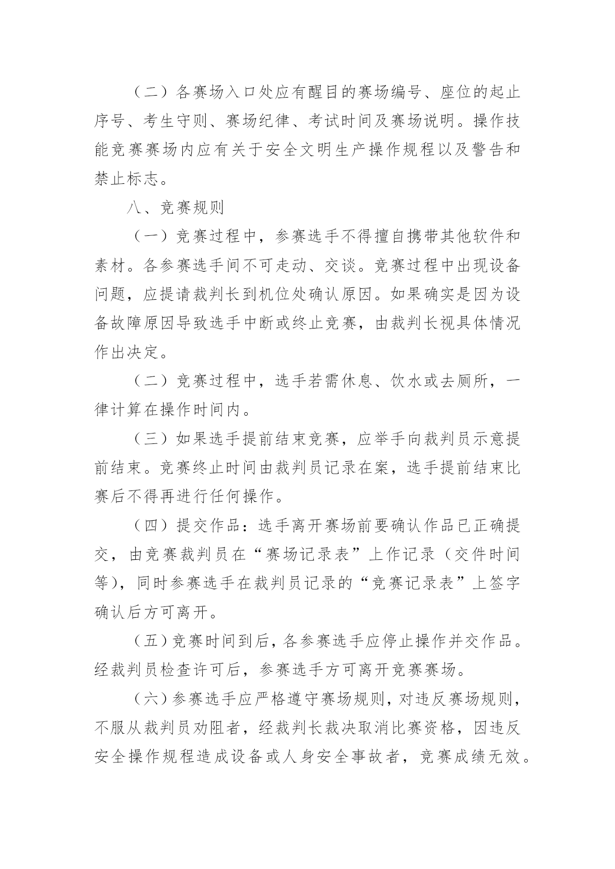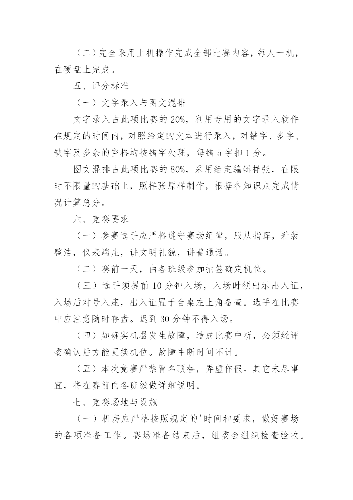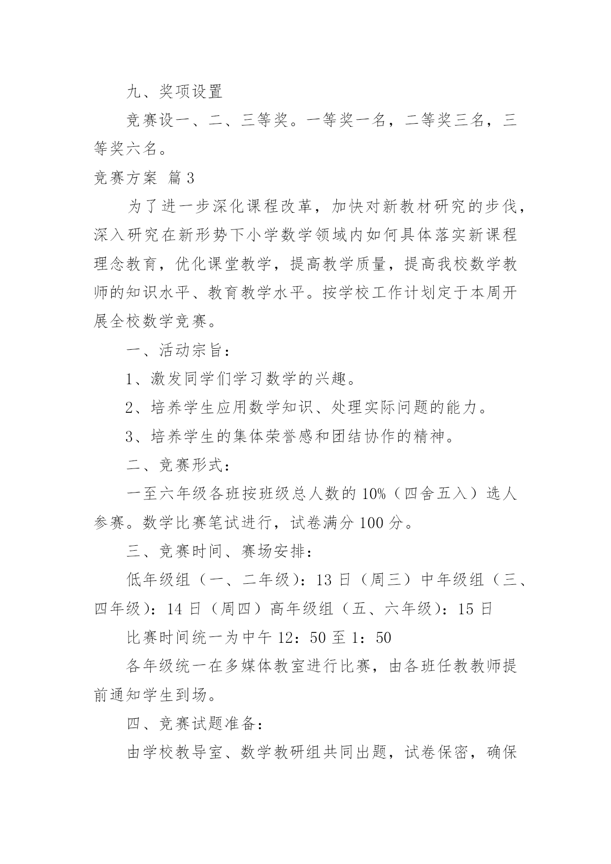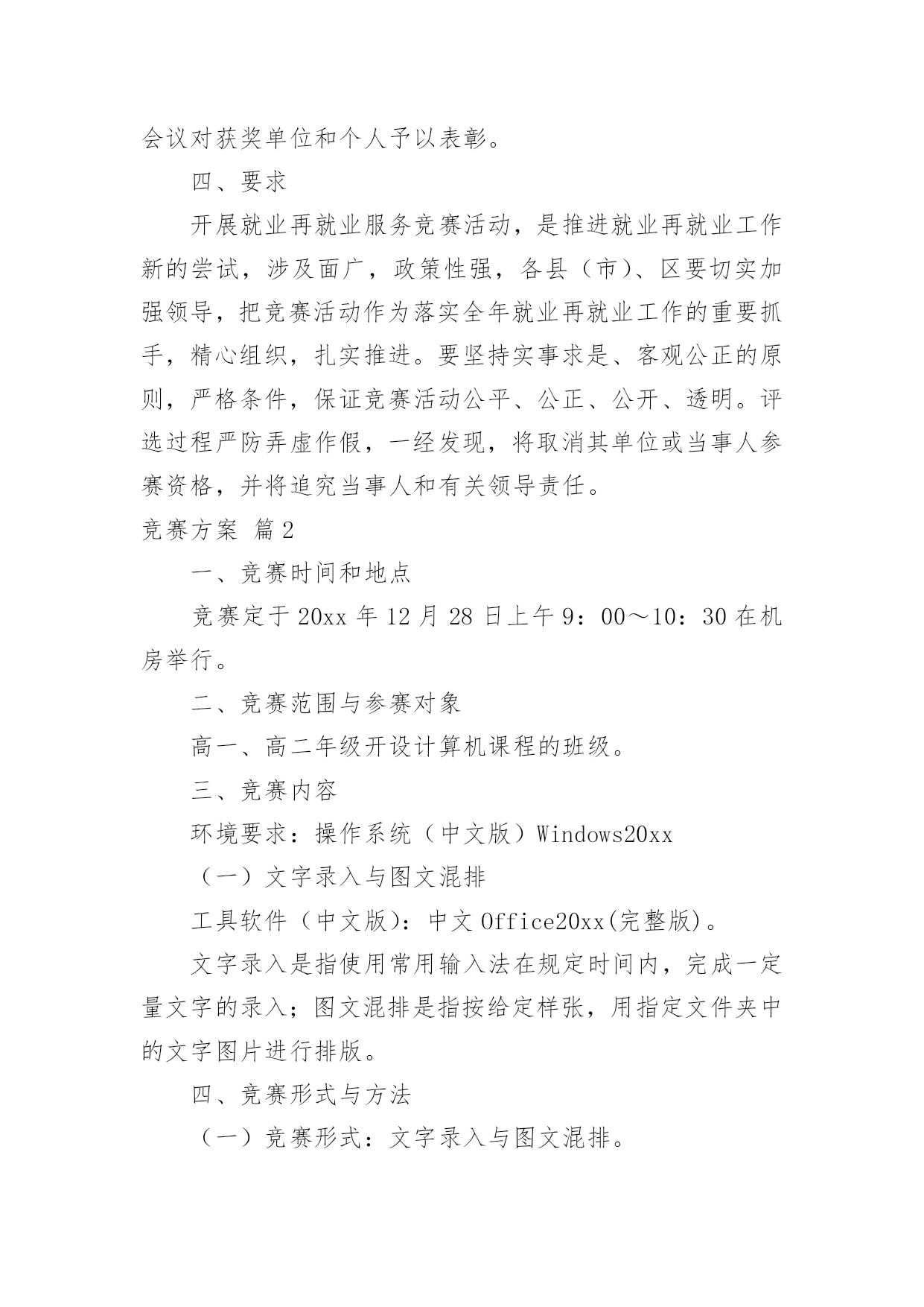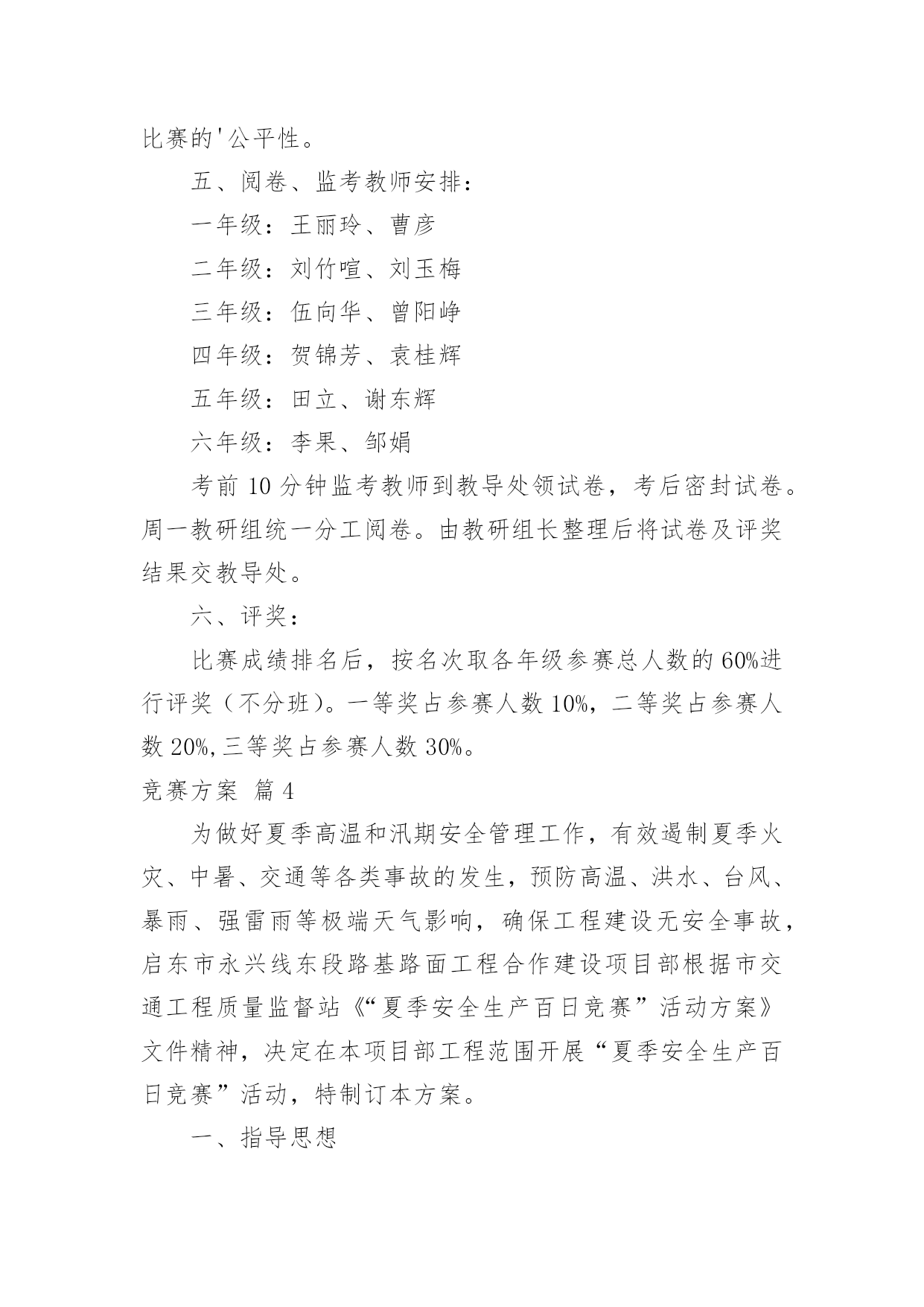 竞赛方案竞赛方案(经典)为了确保工作或事情有序地进行,时常需要预先制定方案,方案是有很强可操作性的书面计划。方案要怎么制定呢?下面是小编为大家整理的竞赛方案10篇,欢迎大家分享。竞赛方案篇1按照*市劳动和社会保障局《关于开展就业再就业服务竞赛活动的通知》(郑劳社就业〔xx〕8号)要求,特制定本工作方案。一、评选方法和步骤开展就业再就业服务竞赛,按照层层选拨的原则,最终评选出*市充分就业示范社区、*市就业服务示范单位、*市就业再就业帮扶状元、*市公共就业服务标兵。评选遵循下列程序和方法进行。1.11月26日—11月30日,各县(市)区讲评、总结本辖区活动开展情况,完成评选工作,并将竞赛活动总结和选拨出的优胜者的名单及主要事迹以书面形式及电子形式于12月5日前报市局劳动就业处。2.市局竞赛活动领导小组办公室于12月20日前组织检查考评组赴各县(市)区进行检查验收,并将结果在劳动保障网公示一周,xx年初择机公布。3.12月中、上旬,市政府组织对新增城镇12万人就业计划完成情况进行检查考核,届时,竞赛活动也被列入检查考核内容。二、评选标准与名额1.充分就业示范社区。按照*市劳动和社会保障局《关于开展就业再就业服务竞赛活动的通知》中相关规定进行评选。2.就业再就业帮扶状元。执行*市劳动和社会保障局《关于开展就业再就业帮扶状元评选活动的通知》,并按要求组织评选。3.就业服务示范单位。根据*市劳动和社会保障局《关于印发〈*市完善公共就业服务就业功能工作方案〉有关问题的通知》,要求达到部颁《功能手册》中对基本服务功能的描述。4.公共就业服务标兵。思想作风硬、服务意识强、业务技术精、工作成绩优、群众反映好。被推荐者在市局组织的检查验收中,业务知识面对面考核成绩优秀者方可被授予*市公共就业服务标兵称号。上述四项评选结果,每个县(市)、区按每项一个推荐到市局,市局经过检查考评、公示,最终确定10个*市充分就业(示范)社区,10名*市就业再就业帮扶状元,10个*市就业服务示范单位,10名*市公共就业服务标兵,并进行表彰。三、表彰奖励被表彰的`单位和个人,由市劳动保障局颁发荣誉证书,并分别给予一定金额的资金奖励,举行全市就业再就业工作会议对获奖单位和个人予以表彰。四、要求开展就业再就业服务竞赛活动,是推进就业再就业工作新的尝试,涉及面广,政策性强,各县(市)、区要切实加强领导,把竞赛活动作为落实全年就业再就业工作的重要抓手,精心组织,扎实推进。要坚持实事求是、客观公正的原则,严格条件,保证竞赛活动公平、公正、公开、透明。评选过程严防弄虚作假,一经发现,将取消其单位或当事人参赛资格,并将追究当事人和有关领导责任。竞赛方案篇2一、竞赛时间和地点竞赛定于20xx年12月28日上午9:00~10:30在机房举行。二、竞赛范围与参赛对象高一、高二年级开设计算机课程的班级。三、竞赛内容环境要求:操作系统(中文版)Windows20xx(一)文字录入与图文混排工具软件(中文版):中文Office20xx(完整版)。文字录入是指使用常用输入法在规定时间内,完成一定量文字的录入;图文混排是指按给定样张,用指定文件夹中的文字图片进行排版。四、竞赛形式与方法(一)竞赛形式:文字录入与图文混排。(二)完全采用上机操作完成全部比赛内容,每人一机,在硬盘上完成。五、评分标准(一)文字录入与图文混排文字录入占此项比赛的20%,利用专用的文字录入软件在规定的时间内,对照给定的文本进行录入,对错字、多字、缺字及多余的空格均按错字处理,每错5字扣1分。图文混排占此项比赛的80%,采用给定编辑样张,在限时不限量的基础上,照样张原样制作,根据各知识点完成情况计算总分。六、竞赛要求(一)参赛选手应严格遵守赛场纪律,服从指挥,着装整洁,仪表端庄,讲文明礼貌,讲普通话。(二)赛前一天,由各班级参加抽签确定机位。(三)选手须提前10分钟入场,入场时须出示出入证,入场后对号入座,出入证置于台桌左上角备查。选手在比赛中应注意随时存盘。迟到30分钟不得入场。(四)如确实机器发生故障,造成比赛中断,必须经评委确认后方能更换机位。故障中断时间不计。(五)本次竞赛严禁冒名顶替,弄虚作假。其它未尽事宜,将在赛前向各班级做详细说明。七、竞赛场地与设施(一)机房应严格按照规定的'时间和要求,做好赛场的各项准备工作。赛场准备结束后,组委会组织检查验收。(二)各赛场入口处应有醒目的赛场编号、座位的起止序号、考生守则、赛场纪律、考试时间及赛场说明。操作技能竞赛赛场内应有关于安全文明生产操作规程以及警告和禁止标志。八、竞赛规则(一)竞赛过程中,参赛选手不得擅自携带其他软件和素材。各参赛选手间不可走动、交谈。竞赛过程中出现设备问题,应提请裁判长到机位处确认原因。如果确实是因为设备故障原因导致选手中断或终止竞赛,由裁判长视具