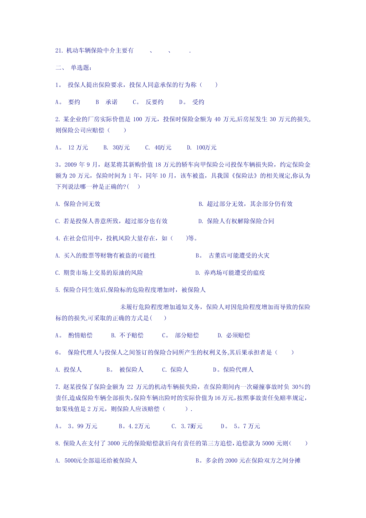 汽车保险理赔试题及答案汽车保险与理赔一.填空:1。、、是风险的三个要素,构成了风险存在于否的基本条件.2.一个国家的保费收入与GDP之比称为。3.是机动车保险合同的最基本特征,也是最本质的特征。4.机动车辆保险理赔的处理程序包括、、.5。也称,是指造成损失的最直接的原因或外在原因。6.是风险识别的基础,分析风险是风险识别的关键。7。中国保监会对保险组织形式的管理依据保险法执行,采用和是我国保险公司的组织形式.8.是保险人与投保人订立保险合同的正式凭证.9。交通事故物证主要分为、和.10。风险评估的主要测算指标有和。11。保险人依据法律规定或合同约定,不承担赔偿和给付责任的范围叫做。12。风险按照是否有获利机会分为和。13.保险人把其原保险业务转让给其它保险人的方式叫。14。经营机动车辆保险的保险人在费率厘定上主要考虑和的影响。15。在全车盗抢险中,全车损失在保险金额内计算赔偿并实行免赔率。16.在没有外界火源的情况下,由于本车电器、线路、燃油系统等车辆自身原因发生故障或所载货物的自身原因起火燃烧的汽车起火称之为。17。汽车贷款的期限(含展期)不得超过。18。风险管理的过程包括、、、等阶段。19.投保人对保险标的不具有的保险合同无效。20。两个或两个以上的保险人共同承保同一保险责任,同一保险利益,同一保险事故的保险称为。21.机动车辆保险中介主要有、、.二、单选题:1。投保人提出保险要求,投保人同意承保的行为称()A。要约B承诺C。反要约D。受约2.某企业的厂房实际价值是100万元,投保时保险金额为40万元,后房屋发生30万元的损失,则保险公司应赔偿()A。12万元B.30万元C.40万元D.100万元3。2009年9月,赵某将其新购价值18万元的轿车向甲保险公司投保车辆损失险,约定保险金额为20万元,保险时间为1年,同年10月,该车被盗,具我国《保险法》的相关规定,你认为下列说法哪一种是正确的?()A.保险合同无效B.超过部分无效,其余部分仍有效C.若是投保人善意所致,超过部分也有效D.保险人有权解除保险合同4.在社会信用中,投机风险大量存在,如()等。A.买入的股票等财物有被盗的可能性B。古董店可能遭受的火灾C.期货市场上交易的原油的风险D.养鸡场可能遭受的瘟疫5.保险合同生效后,保险标的危险程度增加时,被保险人未履行危险程度增加通知义务,保险人对因危险程度增加而导致的保险标的的损失,可采取的正确的方式是()A。酌情赔偿B.不予赔偿C。部分赔偿D.必须赔偿6。保险代理人与投保人之间签订的保险合同所产生的权利义务,其后果承担者是()A.投保人B。被保险人C.保险人D。保险代理人7.赵某投保了保险金额为22万元的机动车辆损失险,在保险期间内一次碰撞事故时负30%的责任,造成保险车辆全部损失,保险车辆出险时的实际价值为16万元,按照事故责任免赔率规定,如果残值是2万元,则保险人应该赔偿().A。3。99万元B。4.2万元C.3.78万元D。5。7万元8.保险人在支付了3000元的保险赔偿款后向有责任的第三方追偿,追偿款为5000元则()A.5000元全部退还给被保险人B。多余的2000元在保险双方之间分摊C。5000元全归保险人D。将2000元退还给被保险人9。保险人依据法律规定或合同约定,不承担赔偿和给付责任的范围叫做()A.保险责任B。保险范围C.责任免除D。保险约定10。在全车盗抢险中,全车损失,在保险金额内计算赔偿,并实行()免赔率。A.5%B.10%C。15%D.20%11。股市的波动属于()性质的风险。A.自然风险B.社会风险C。投机风险D。纯粹风险12.赵某投保了保险金额为18万元的机动车辆损失险,在保险期间内一次碰撞事故时负20%的责任,造成保险车辆全部损失,保险车辆出险时的实际价值为12万元,按照事故责任免赔率规定,如果残值是2万元,则保险人应该赔偿()。A。1.9万元B.2万元C.1.8万元D.1.6万元三.多选题:1.下列事件中,属于投机风险的有()A.金融投资B。疾病C。房地产开发投资D.股票买卖2。交强险合同争议解决方式有()A.合同当事人协商解决B.协商不成的,提交保单载明的仲裁机构仲裁C。协商不成的,由公安机关交通管理部门调解D。保单未载明仲裁机构或者发生争议后未达成仲裁协议的,可向人民法院起诉3.取得投保人资格必须具备的要件有().A。必须具有权利能力B.必须具有行为能力C。必须具有可保利益D。必须承担缴纳保险费得义务4。下列有关风