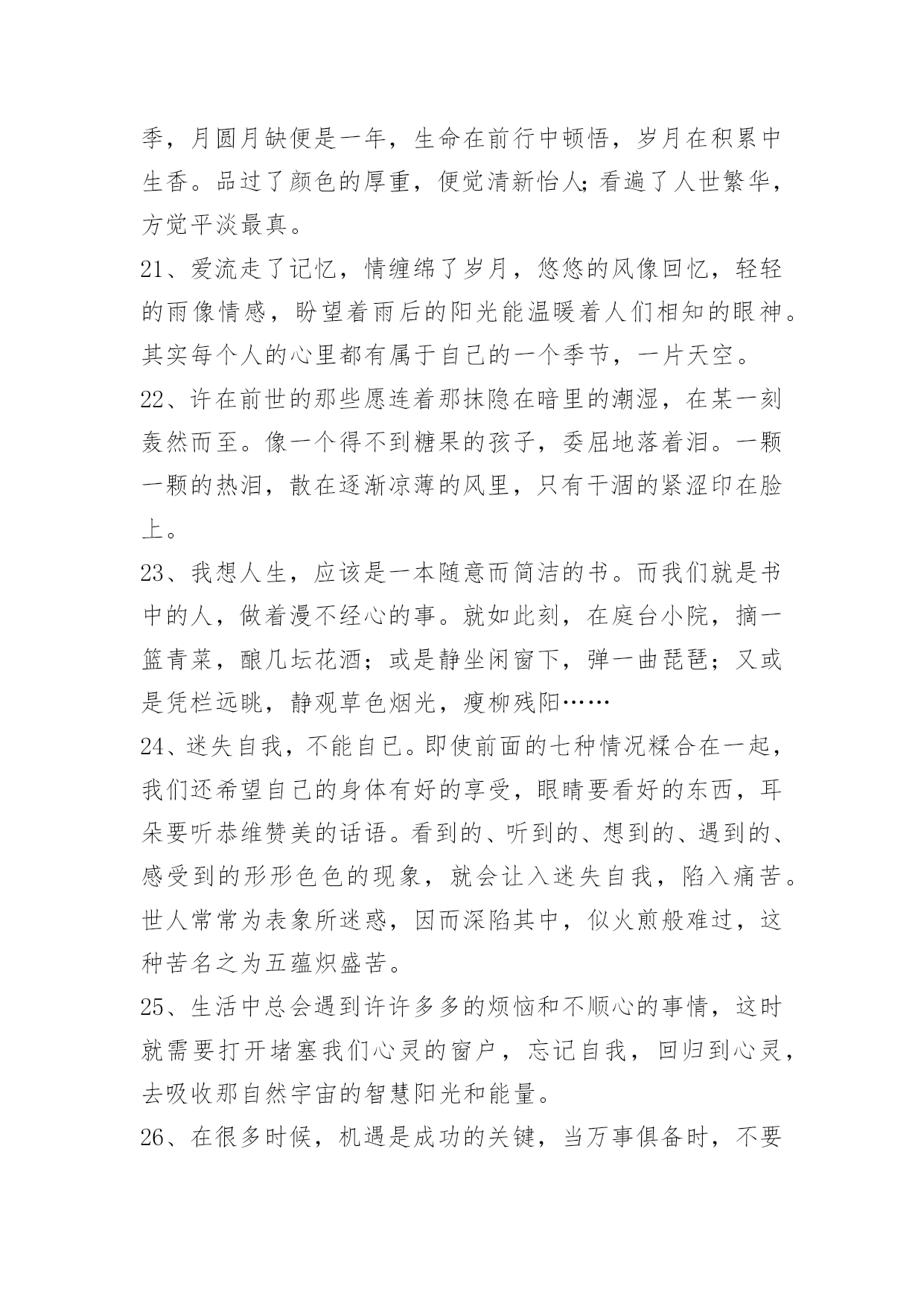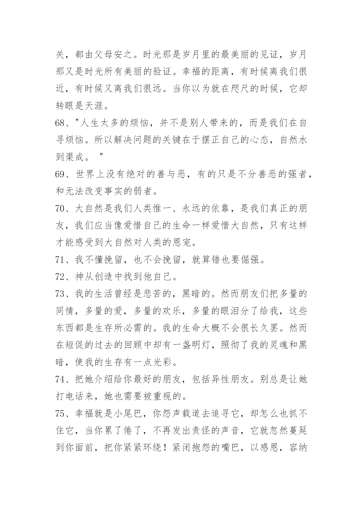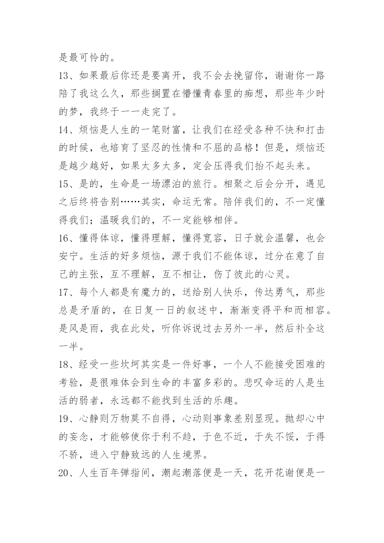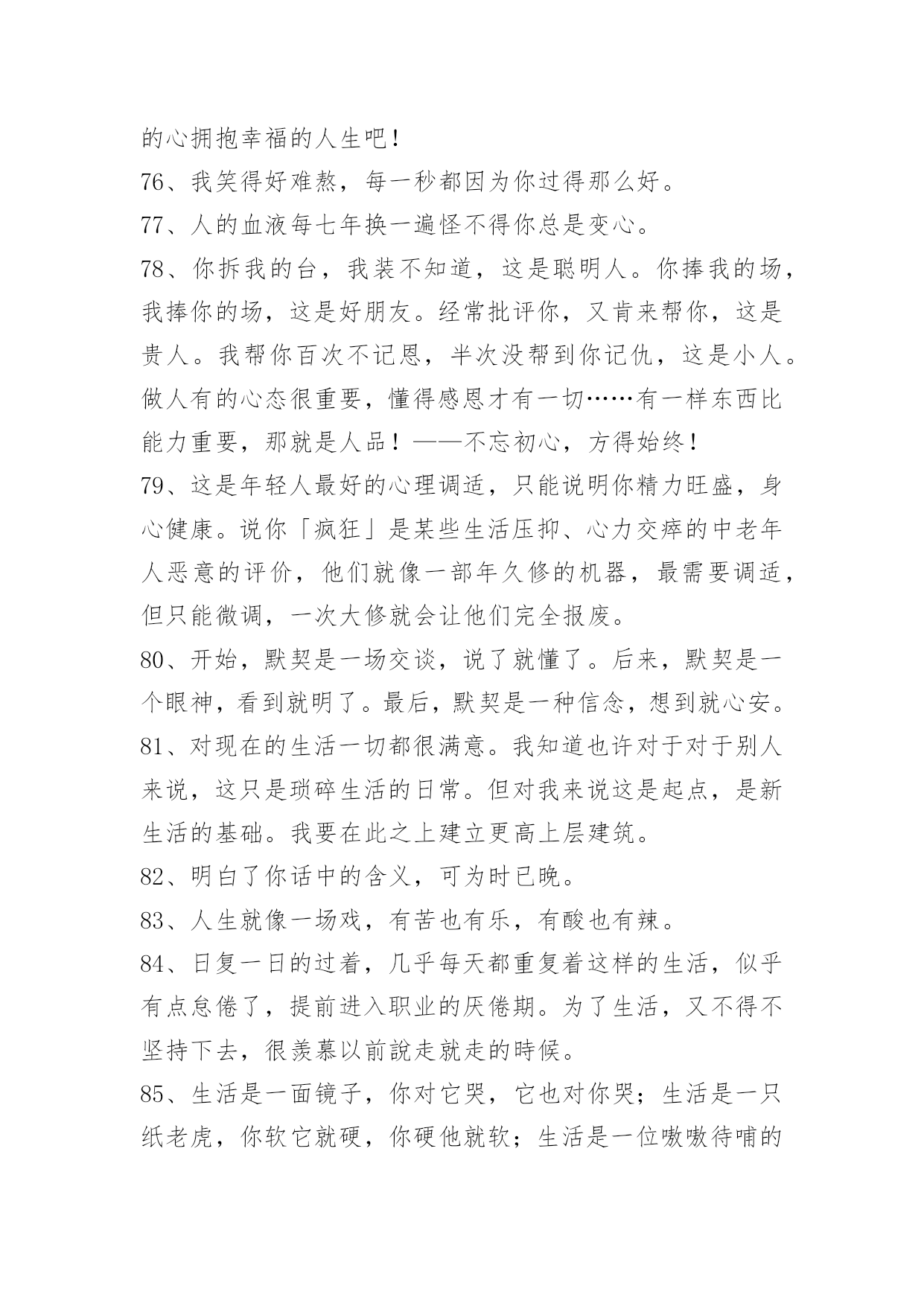 生活个性感言句子常用生活个性感言句子(精选150句)因此有"超世之才",但没有"坚韧不拔之志",是什么也做不成的。以下这篇文章是小编为各位读者整理的生活个性感言句子,一起来欣赏吧。1、不是因为在最好的时光遇见了你,而是有你在,我才有了最好的时光。2、什么时候,我们都不能丧失对生活的信心。3、什么是奋斗?奋斗就是每一天都很难,可一年比一年越来越容易。不奋斗就是每一天都很容易,可一年比一年却越来越难。所以说:怕吃苦的人吃苦一辈子,不怕吃苦的人吃苦一阵子。拼一个春夏秋冬,赢一个无悔人生!正像乔丹说的:可以接受失败的我,但决不能接受从来没有奋斗过的我。4、我相信没有哪一个男人想要灰色的人生,所有的男人都期望自己能有一个绚丽多彩的人生。所以为了使自己的人生绚丽多彩,男人到了二十几岁后,就必须要改掉自身的不良习惯。其实,凡事看开些,看远些,看淡些,不孤芳自赏,不固步自封,不顾影自怜,方能消除心中块垒,置身满天艳阳。5、衡量生活质量的两个标准,一个是和家人相处的时间,另一个是和自然相处的时间。6、跨过了那么多的艰难和不易,现在我只想要舒适的简单生活。快不快乐都是我,做自己。7、当别人忽略你时,不要伤心,每个人都有自己的生活,谁都不可能一直陪你。当你看到别人在笑时,不要以为世界上只有你一个人在伤心,其实别人只是比你会掩饰。当你很无助时,你可以哭,但哭过你必须要振作起来,即使输掉了一切,也不要输掉微笑。8、爱情是要在时间中漂洗的,要么沉淀成一张发黄的照片,要么就在我们朴实的生命中怒放。我们不是萍水相逢,幸福不是刹那间的感觉,它就融化在我们牵手的甜蜜中,融解于看似斑驳的生活里。9、还有一个方法就是把注意力带回到当下。因为如果你去观察你的思想时,你会发现你所想的东西,不是在过去就是在未来,很少是当下这一刻的关注。10、这个世界需要充满各种"不可能",因为这样,我们才有机会去找到里面的"可能"。别等不该等的人,别伤不该伤的心。有些人,注定是生命中的过客;有些事,常常让我们很无奈。与其伤心流泪,不如从容面对。孤独,不一定不快乐;得到,不一定能长久;失去,不一定不再拥有。11、放弃可以说是件痛苦的事,因为对生活寄予太多的渴望,对未来秉持长久的梦想,许多东西不能割舍。但是,生活有时是低谷,深渊,过多的负重,可能加速坠落,带来精神的不堪,学会放弃。并不是抛弃,只是暂时放下,让疲惫的身心稍许放松。就像大地的冬眠,等待春风拂暖,泥土翻新,可以重新披上绿的盛妆。12、当你知道迷惑时,并不可怜,当你不知道迷惑时,才是最可怜的。13、如果最后你还是要离开,我不会去挽留你,谢谢你一路陪了我这么久,那些搁置在懵懂青春里的痴想,那些年少时的梦,我终于一一走完了。14、烦恼是人生的一笔财富,让我们在经受各种不快和打击的时候,也培育了坚忍的性情和不屈的品格!但是,烦恼还是越少越好,如果太多太多,定会压得我们抬不起头来。15、是的,生命是一场漂泊的旅行。相聚之后会分开,遇见之后终将告别……其实,命运无常。陪伴我们的,不一定懂得我们;温暖我们的,不一定能够相伴。16、懂得体谅,懂得理解,懂得宽容,日子就会温馨,也会安宁。生活的好多烦恼,源于我们不能体谅,过分在意了自己的主张,互不理解,互不相让,伤了彼此的心灵。17、每个人都是有魔力的,送给别人快乐,传达勇气,那些总是矛盾的,在日复一日的叙述中,渐渐变得平和而相容。是风是雨,我在此处,听你诉说过去另外一半,然后补全这一半。18、经受一些坎坷其实是一件好事,一个人不能接受困难的考验,是很难体会到生命的丰富多彩的。悲叹命运的人是生活的弱者,永远都不能找到生活的乐趣。19、心静则万物莫不自得,心动则事象差别显现。抛却心中的妄念,才能够使你于利不趋,于色不近,于失不馁,于得不骄,进入宁静致远的人生境界。20、人生百年弹指间,潮起潮落便是一天,花开花谢便是一季,月圆月缺便是一年,生命在前行中顿悟,岁月在积累中生香。品过了颜色的厚重,便觉清新怡人;看遍了人世繁华,方觉平淡最真。21、爱流走了记忆,情缠绵了岁月,悠悠的风像回忆,轻轻的雨像情感,盼望着雨后的阳光能温暖着人们相知的眼神。其实每个人的心里都有属于自己的一个季节,一片天空。22、许在前世的那些愿连着那抹隐在暗里的潮湿,在某一刻轰然而至。像一个得不到糖果的孩子,委屈地落着泪。一颗一颗的热泪,散在逐渐凉薄的风里,只有干涸的紧涩印在脸上。23、我想人生,应该是一本随意而简洁的书。而我们就是书中的人,做着漫不经心的事。就如此刻,在庭台小院,摘一篮青菜,酿几坛花酒;或是静坐闲窗下,弹一曲琵琶;又或是凭栏远眺,静观草色烟光,瘦柳残阳……24、迷失自我,不能自已。即使前面的七种情况糅合在一起,我们还希望自己的身体有好的享受,眼睛要看好的东西,耳朵要听恭维赞美的话语。看到的、听到的、想到的、遇到的、