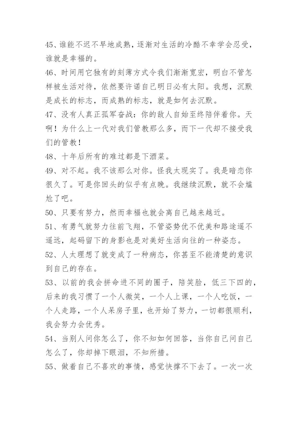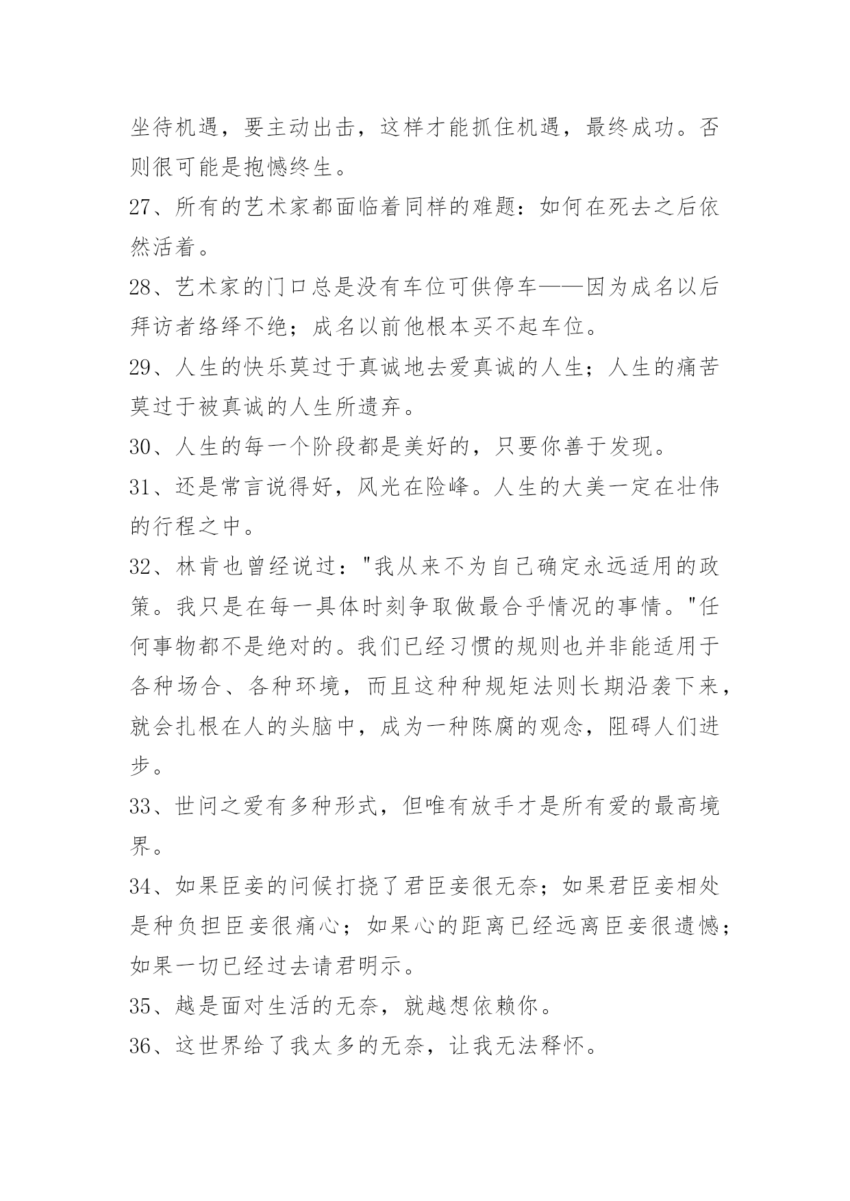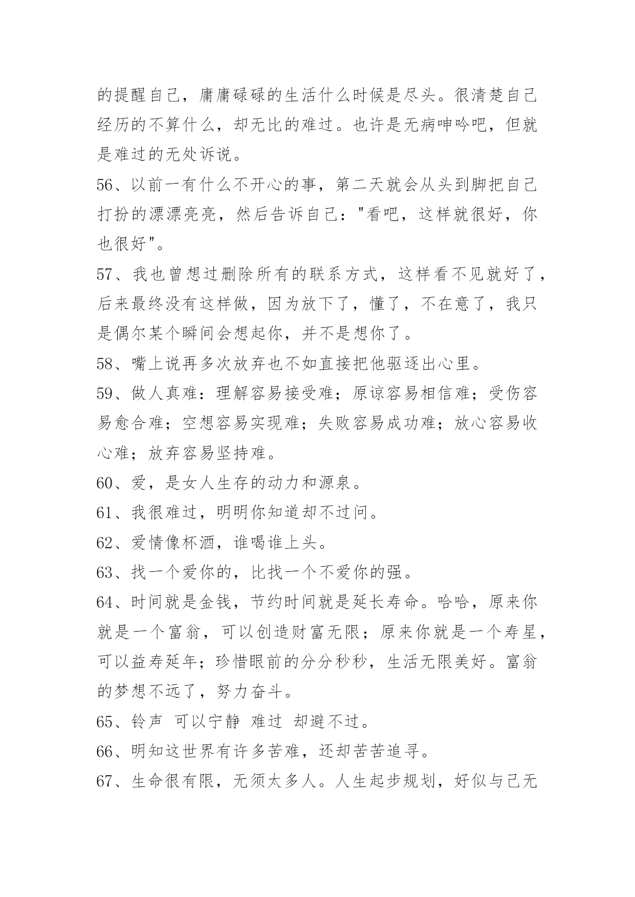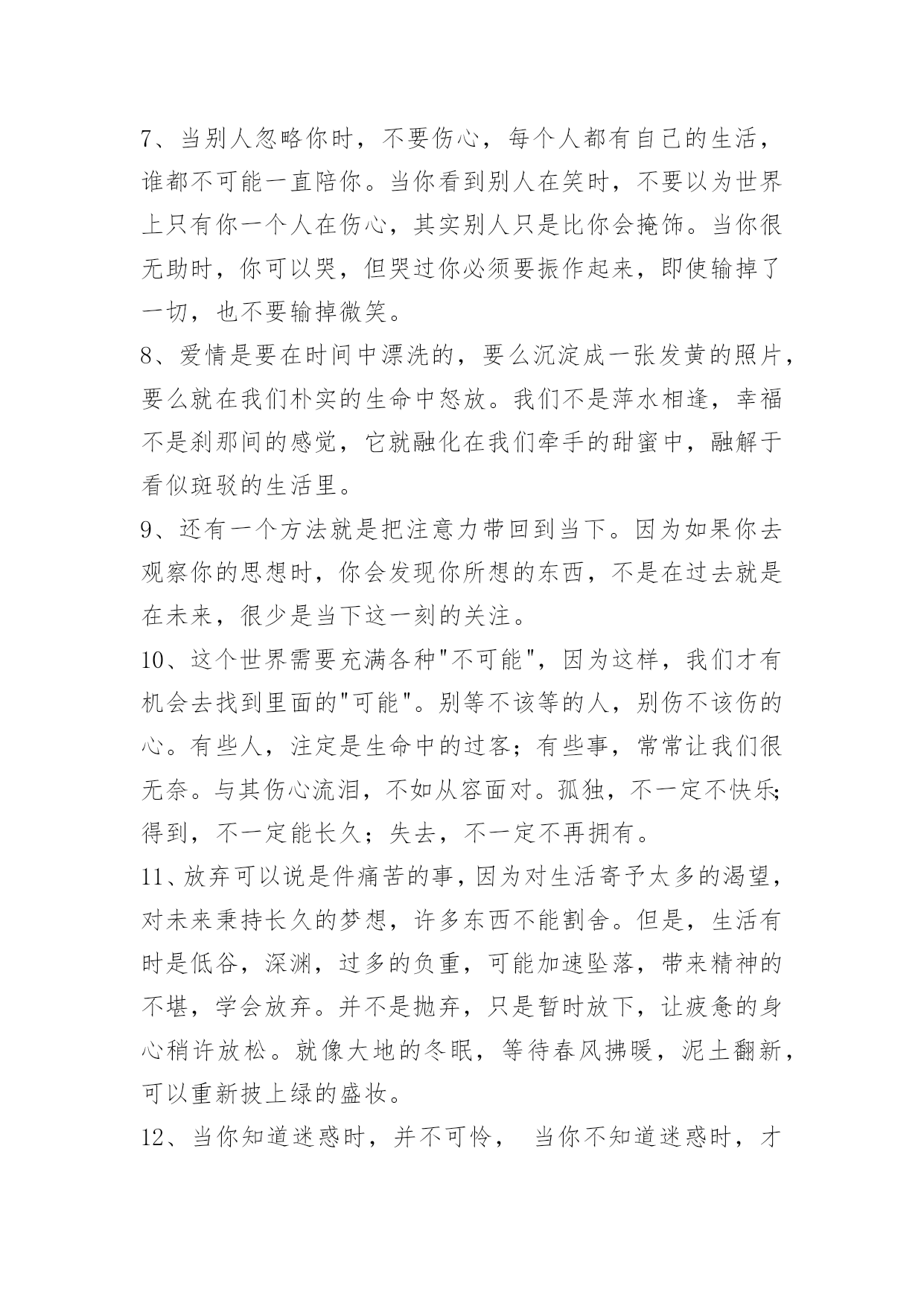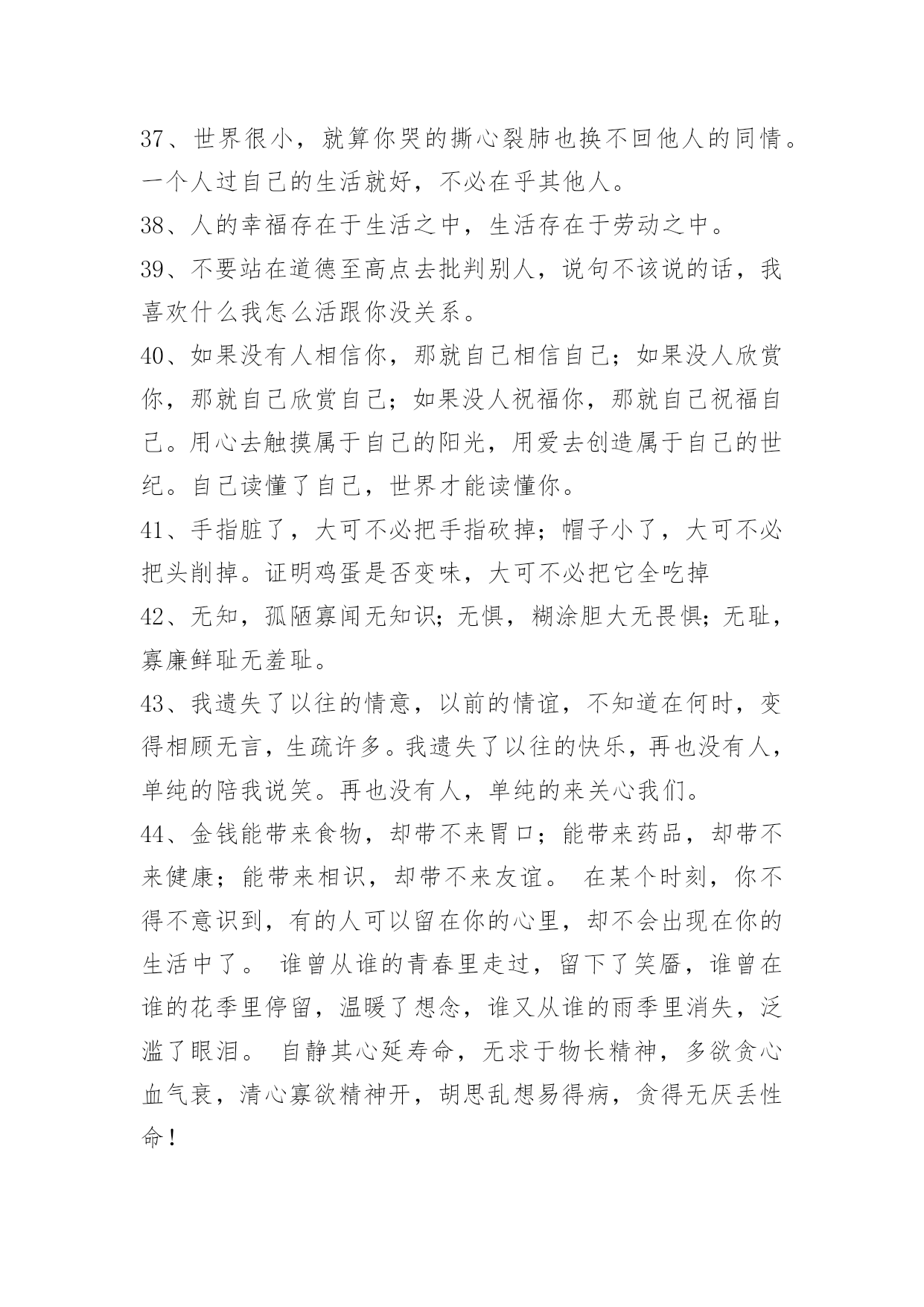 生活个性感言句子常用生活个性感言句子(精选150句)因此有"超世之才",但没有"坚韧不拔之志",是什么也做不成的。以下这篇文章是小编为各位读者整理的生活个性感言句子,一起来欣赏吧。1、不是因为在最好的时光遇见了你,而是有你在,我才有了最好的时光。2、什么时候,我们都不能丧失对生活的信心。3、什么是奋斗?奋斗就是每一天都很难,可一年比一年越来越容易。不奋斗就是每一天都很容易,可一年比一年却越来越难。所以说:怕吃苦的人吃苦一辈子,不怕吃苦的人吃苦一阵子。拼一个春夏秋冬,赢一个无悔人生!正像乔丹说的:可以接受失败的我,但决不能接受从来没有奋斗过的我。4、我相信没有哪一个男人想要灰色的人生,所有的男人都期望自己能有一个绚丽多彩的人生。所以为了使自己的人生绚丽多彩,男人到了二十几岁后,就必须要改掉自身的不良习惯。其实,凡事看开些,看远些,看淡些,不孤芳自赏,不固步自封,不顾影自怜,方能消除心中块垒,置身满天艳阳。5、衡量生活质量的两个标准,一个是和家人相处的时间,另一个是和自然相处的时间。6、跨过了那么多的艰难和不易,现在我只想要舒适的简单生活。快不快乐都是我,做自己。7、当别人忽略你时,不要伤心,每个人都有自己的生活,谁都不可能一直陪你。当你看到别人在笑时,不要以为世界上只有你一个人在伤心,其实别人只是比你会掩饰。当你很无助时,你可以哭,但哭过你必须要振作起来,即使输掉了一切,也不要输掉微笑。8、爱情是要在时间中漂洗的,要么沉淀成一张发黄的照片,要么就在我们朴实的生命中怒放。我们不是萍水相逢,幸福不是刹那间的感觉,它就融化在我们牵手的甜蜜中,融解于看似斑驳的生活里。9、还有一个方法就是把注意力带回到当下。因为如果你去观察你的思想时,你会发现你所想的东西,不是在过去就是在未来,很少是当下这一刻的关注。10、这个世界需要充满各种"不可能",因为这样,我们才有机会去找到里面的"可能"。别等不该等的人,别伤不该伤的心。有些人,注定是生命中的过客;有些事,常常让我们很无奈。与其伤心流泪,不如从容面对。孤独,不一定不快乐;得到,不一定能长久;失去,不一定不再拥有。11、放弃可以说是件痛苦的事,因为对生活寄予太多的渴望,对未来秉持长久的梦想,许多东西不能割舍。但是,生活有时是低谷,深渊,过多的负重,可能加速坠落,带来精神的不堪,学会放弃。并不是抛弃,只是暂时放下,让疲惫的身心稍许放松。就像大地的冬眠,等待春风拂暖,泥土翻新,可以重新披上绿的盛妆。12、当你知道迷惑时,并不可怜,当你不知道迷惑时,才是最可怜的。13、如果最后你还是要离开,我不会去挽留你,谢谢你一路陪了我这么久,那些搁置在懵懂青春里的痴想,那些年少时的梦,我终于一一走完了。14、烦恼是人生的一笔财富,让我们在经受各种不快和打击的时候,也培育了坚忍的性情和不屈的品格!但是,烦恼还是越少越好,如果太多太多,定会压得我们抬不起头来。15、是的,生命是一场漂泊的旅行。相聚之后会分开,遇见之后终将告别……其实,命运无常。陪伴我们的,不一定懂得我们;温暖我们的,不一定能够相伴。16、懂得体谅,懂得理解,懂得宽容,日子就会温馨,也会安宁。生活的好多烦恼,源于我们不能体谅,过分在意了自己的主张,互不理解,互不相让,伤了彼此的心灵。17、每个人都是有魔力的,送给别人快乐,传达勇气,那些总是矛盾的,在日复一日的叙述中,渐渐变得平和而相容。是风是雨,我在此处,听你诉说过去另外一半,然后补全这一半。18、经受一些坎坷其实是一件好事,一个人不能接受困难的考验,是很难体会到生命的丰富多彩的。悲叹命运的人是生活的弱者,永远都不能找到生活的乐趣。19、心静则万物莫不自得,心动则事象差别显现。抛却心中的妄念,才能够使你于利不趋,于色不近,于失不馁,于得不骄,进入宁静致远的人生境界。20、人生百年弹指间,潮起潮落便是一天,花开花谢便是一季,月圆月缺便是一年,生命在前行中顿悟,岁月在积累中生香。品过了颜色的厚重,便觉清新怡人;看遍了人世繁华,方觉平淡最真。21、爱流走了记忆,情缠绵了岁月,悠悠的风像回忆,轻轻的雨像情感,盼望着雨后的阳光能温暖着人们相知的眼神。其实每个人的心里都有属于自己的一个季节,一片天空。22、许在前世的那些愿连着那抹隐在暗里的潮湿,在某一刻轰然而至。像一个得不到糖果的孩子,委屈地落着泪。一颗一颗的热泪,散在逐渐凉薄的风里,只有干涸的紧涩印在脸上。23、我想人生,应该是一本随意而简洁的书。而我们就是书中的人,做着漫不经心的事。就如此刻,在庭台小院,摘一篮青菜,酿几坛花酒;或是静坐闲窗下,弹一曲琵琶;又或是凭栏远眺,静观草色烟光,瘦柳残阳……24、迷失自我,不能自已。即使前面的七种情况糅合在一起,我们还希望自己的身体有好的享受,眼睛要看好的东西,耳朵要听恭维赞美的话语。看到的、听到的、想到的、遇到的、