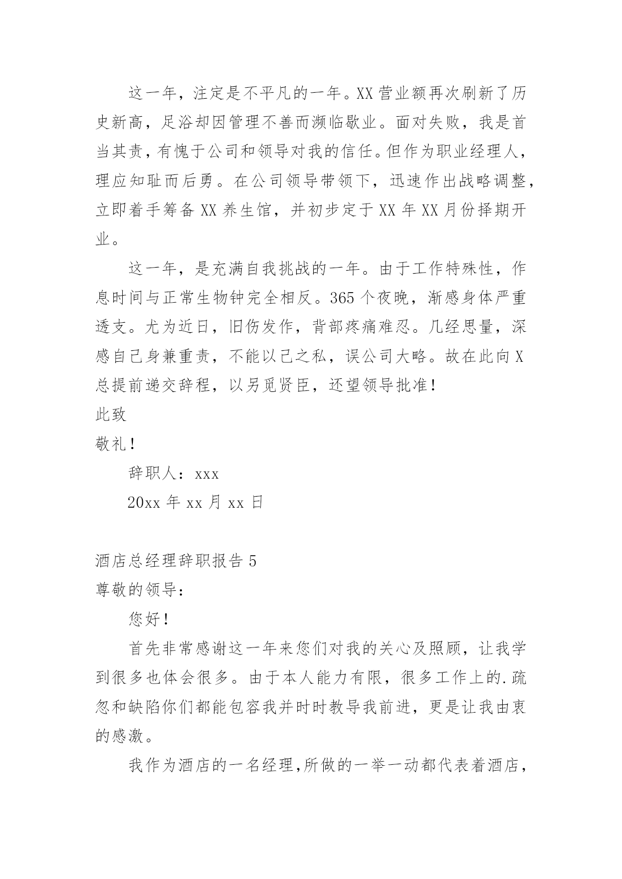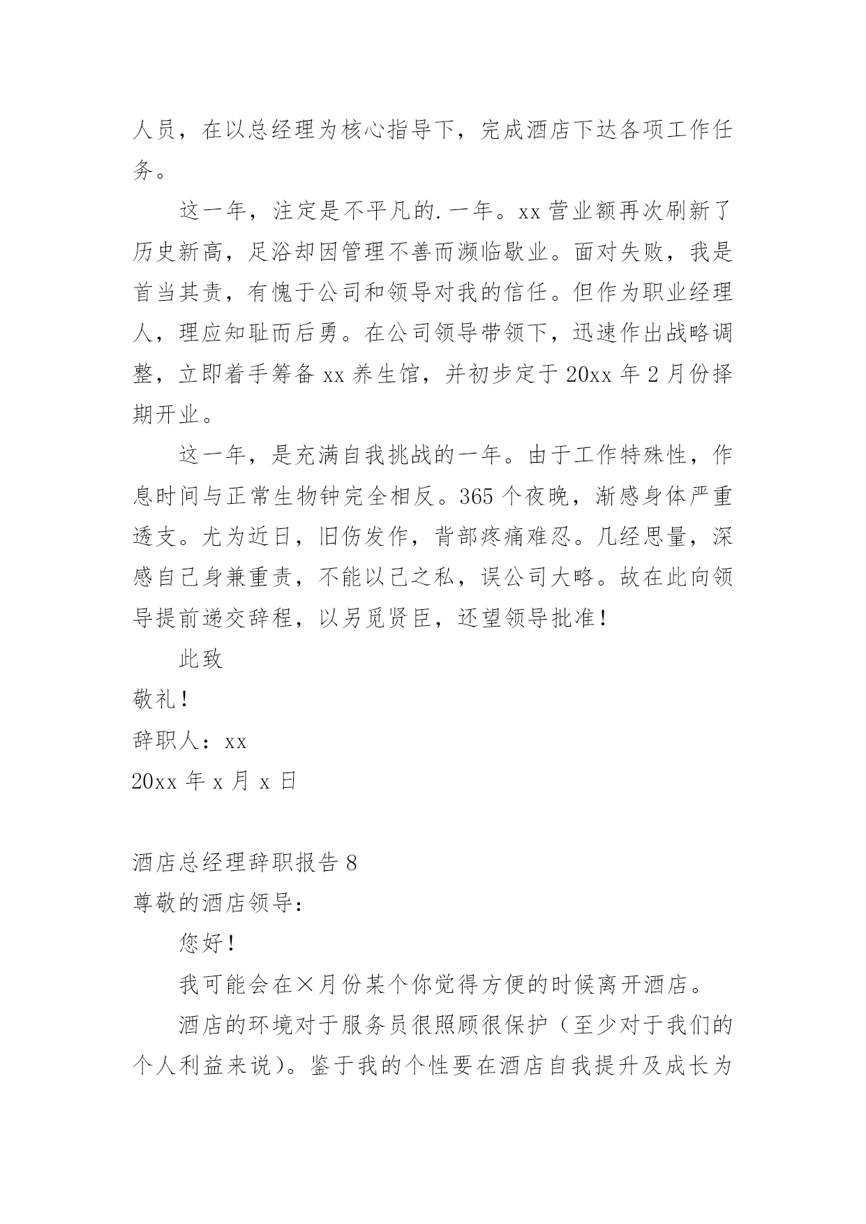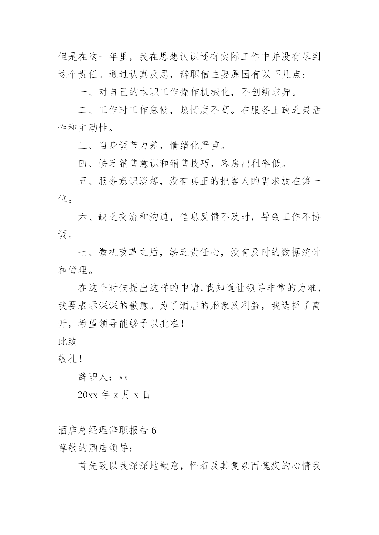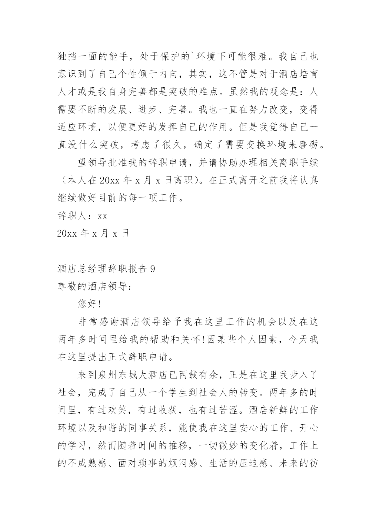 酒店总经理辞职报告随着个人的文明素养不断提升,需要使用报告的情况越来越多,报告具有语言陈述性的特点。在写之前,可以先参考范文,下面是小编为大家整理的酒店总经理辞职报告,希望能够帮助到大家。酒店总经理辞职报告1xx公司董事会:各位领导董事以及董事会主席,在公司的近2个月的.时间我经过了我自身的努力和奋斗,由于我自身的缺点和性格难以和车间的同事融合。因此我决定辞职。辞去公司总经理助理职务。在辞去职务前我将我在公司看到详细情况汇总如下。各位董事以上是我进2个月来看到和想到的问题。因为性格所使我不适合在现有形式下的公司工作。我也很难来改变公司所以我辞职。这将是我在公司的最后意见和今后接任者的工作建议,如有采纳非常高兴。此致敬礼!辞职人:xxx20xx年xx月xx日酒店总经理辞职报告2尊敬的王总:作为一名在酒店工作了七年多的员工,我对酒店有着一种格外亲切的感觉。每一个人在他年轻的时候,都有很多第一次,我当然也不例外。我的第一份工作是在酒店,我最青春的三年也是在酒店度过的。在这里,我学会了很多东西,能够跟同事们在一起工作,我觉得很开心,这里的每一位都是我的大哥大姐,我的叔叔阿姨,是他们教给了我在学校里面学不到的知识,如何为人、如何处事、如何工作……在酒店里,领导们也对我十分的关心,从刚进入酒店开始,我就感受到从上至下的温暖。因为我是酒店里年龄最小的,也从来没有在这么大的集体里生活过,自然而然的,心里面就会产生一种被呵护的感觉。这是一种以前在集体里未曾有过的感觉,很温馨,很自豪,而且它一直陪伴着我,直到我离开……但这种感觉不会随着我的离开而走远,我想我永远也不会忘记,毕竟我曾经生活在一个温暖而又温馨的集体里。王总,还记得第一次跟您近距离接触和认识是在x年的时候。那时的我们参加酒店自成立以来组建的第一届篮球队,您正好是队长。让我意想不到的是,平时看起来那么斯文而又带点书卷气息的您在球场上也是那么的生龙活虎,丝毫也不比年轻人逊色,虽然我们在第一次的组队中没有取得好的成绩,但我们坚持到底、团结奋斗的拼搏精神,同样赢得了观众与组委会的认同,最后摘取了精神文明风尚奖的称号。这是您带领我们取得的第一次成绩。随着时间的流逝,斗转星移,您多年积累的工作经验与个人才华也得到充分的施展。这时的您已成为我们酒店的总经理。您在上任之后,制定了一系列的政策与方针,重新定位了酒店的经营策略,不断地尝试新的机制与奖励、分配办法,力争让酒店的经济效益不断迈上新高,也让酒店员工的福利待遇如芝麻开花一般节节高樊。更让人钦佩的是,在今年的非典时期,同行中大多数都以停业减薪的方式来躲避这场灾难时,您却以审时度势的目光,作出在做好预防工作的同时继续经营的决定,酒店也因此没有为客源的减少而受到大的损失,职工的正常收入与福利也未受到任何的影响。可能这一切的一切在您眼里看来也许只是为员工办了一点实事而已,可在我们眼里,在我们心里都认为这才是一件大事,这才是为员工谋利益的举动,这才是一位被员工在心里面所认可的老总!而我,作为这个集体的一份子,更加感觉到您对员工的关心与培养。您肯定想到,酒店要想在竞争激烈的社会中立于不败之地,人才的培养与发展是不可忽视的环节之一;对于酒店里为数不多的年轻人来说,要想在酒店里得到长足的发展,就必须得到管理的岗位上去锻炼不可。恰恰是在酒店飞速发展的`时刻,您也有意识的让我走到了管理的岗上来,希望我从中能够学到一些管理的经验和处理各种关系的办法,为酒店的发展起到应有的作用。这是我人生中的又一个“第一”次,即第一次在工作中得到升职,对于一个初涉社会没多久的年轻人来说,它是一种激励,一种鞭策,一种锻炼,对我而言,这正是您对我工作的一种肯定,给我的一种鼓舞。在这里,我非常感谢您给我的这次机会,也想借此在这里向您说一声:“谢谢”!人往高处走,这句千古不变的名言似乎在什么时候都非常适用,但是对于我来说,讲这句话时,声音是哽咽的,因为我马上就要离开我工作了三年多的酒店,离开与我并肩工作了三年多时间的同事和关心我的领导们。当我做出这个决定的时候,心中的波澜久久不能平息。而在我把这个决定告诉您的时候,王总,您又是那样的通情达理,不仅语重心长地替我权衡利弊,分析情况,提醒我要做好家人的解释工作,而且又在办理手续方面给予我各种便利和一定的补偿,我真的不知该说什么才好。也许,千言万语也抵不过一句感谢,我想再对您说一声“谢谢您,王总”!万水千山多变换,人生犹如戏一场。人的一生可能都要扮演很多角色,也可能要走过很多的路才能到达一定高度,取得一些成就,得到众人的认可,成为主演。酒店总经理辞职报告3尊敬的酒店领导:首先致以我深深地歉意,怀着及其复杂而愧疚的心情我艰难写下这份辞职信,很遗憾自己在这个时候突然向酒店提出辞职,辞去酒店经理,不能再和酒店的.一起发展!其实我已经很幸福,很幸运能在酒