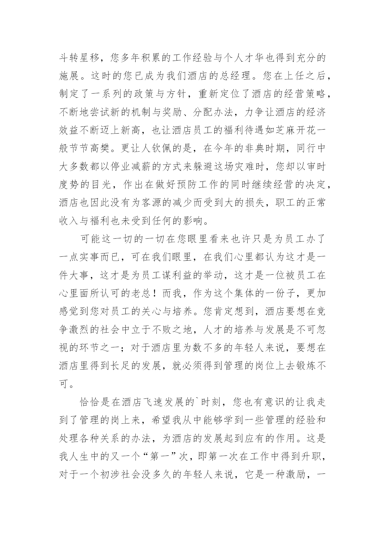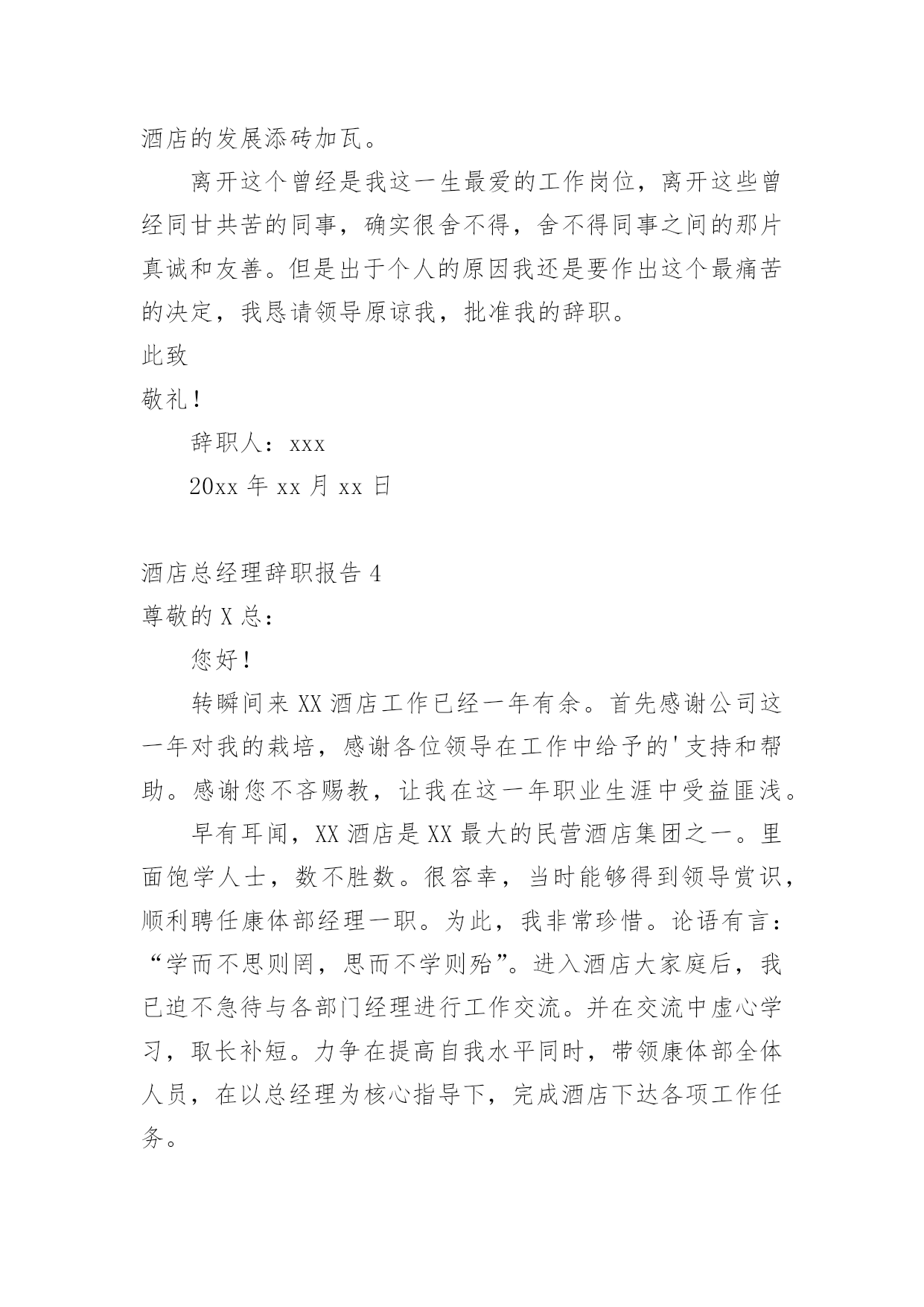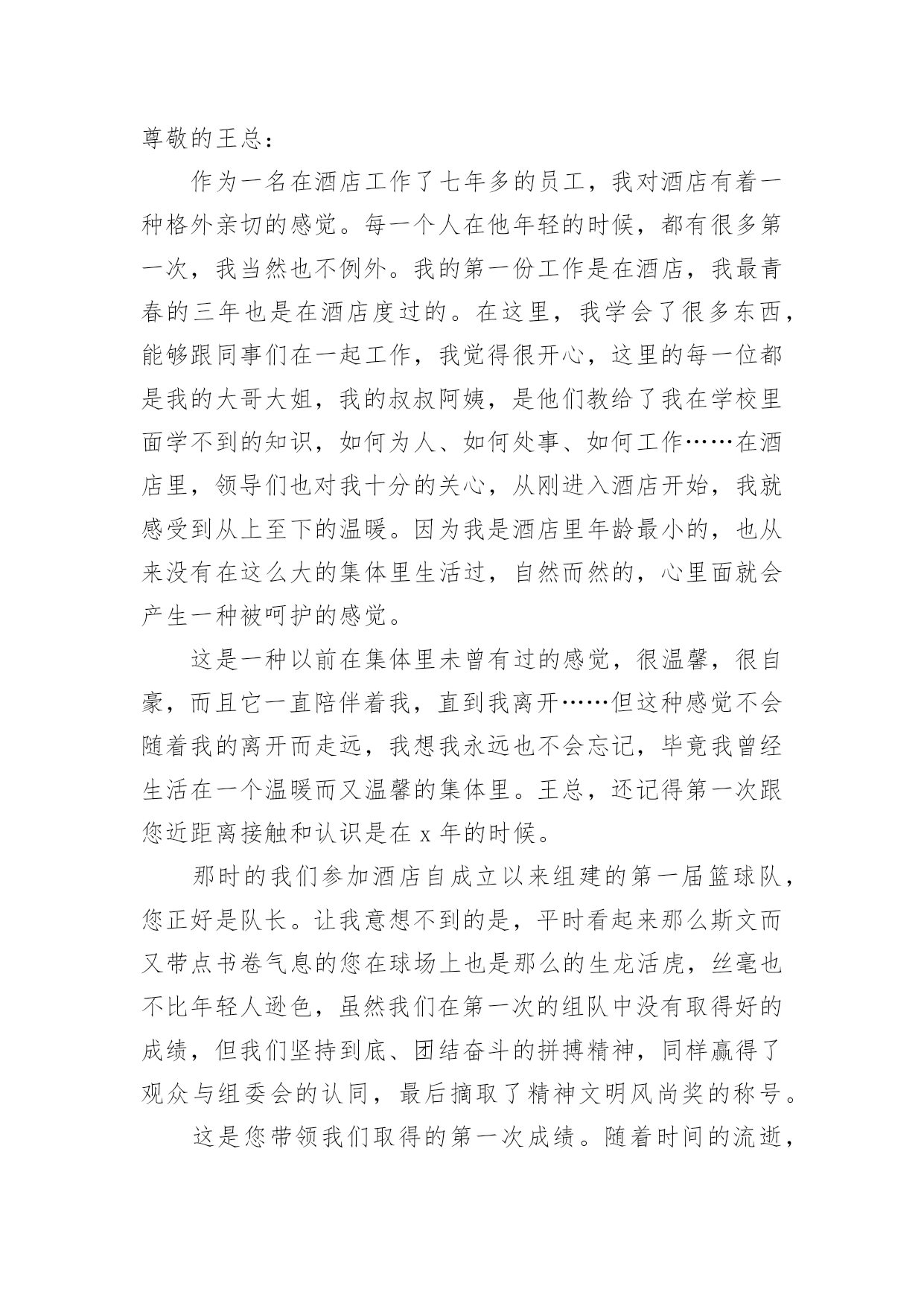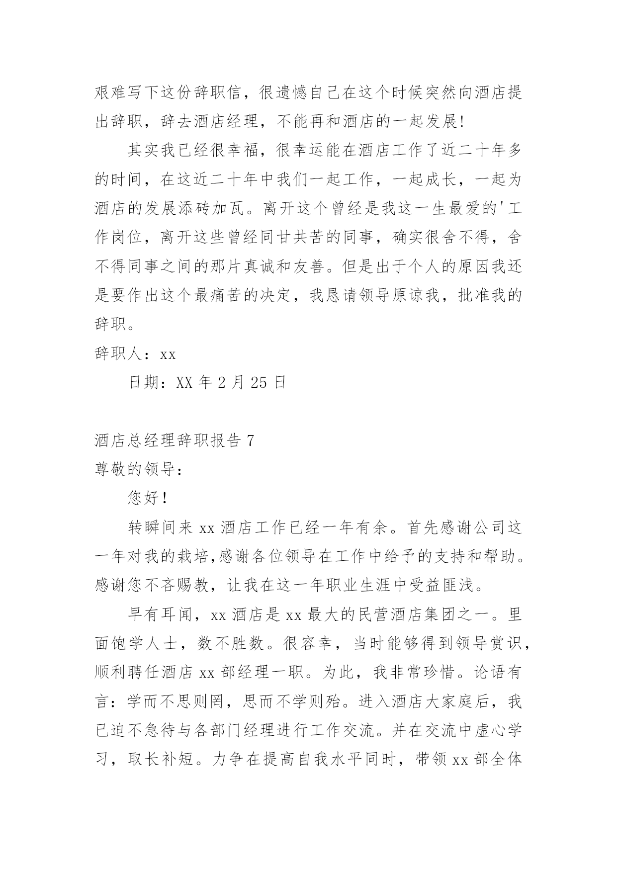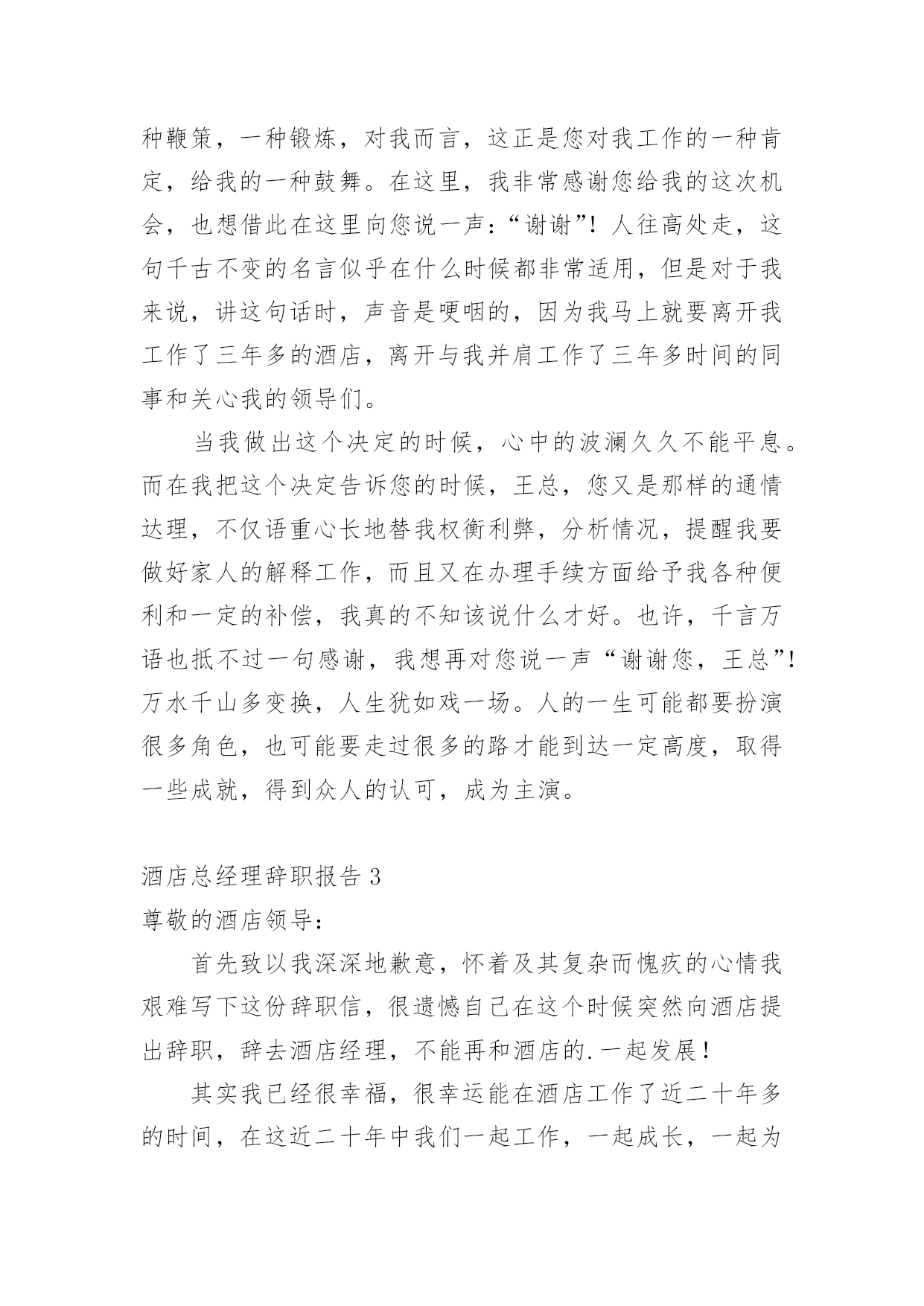 酒店总经理辞职报告随着个人的文明素养不断提升,需要使用报告的情况越来越多,报告具有语言陈述性的特点。在写之前,可以先参考范文,下面是小编为大家整理的酒店总经理辞职报告,希望能够帮助到大家。酒店总经理辞职报告1xx公司董事会:各位领导董事以及董事会主席,在公司的近2个月的.时间我经过了我自身的努力和奋斗,由于我自身的缺点和性格难以和车间的同事融合。因此我决定辞职。辞去公司总经理助理职务。在辞去职务前我将我在公司看到详细情况汇总如下。各位董事以上是我进2个月来看到和想到的问题。因为性格所使我不适合在现有形式下的公司工作。我也很难来改变公司所以我辞职。这将是我在公司的最后意见和今后接任者的工作建议,如有采纳非常高兴。此致敬礼!辞职人:xxx20xx年xx月xx日酒店总经理辞职报告2尊敬的王总:作为一名在酒店工作了七年多的员工,我对酒店有着一种格外亲切的感觉。每一个人在他年轻的时候,都有很多第一次,我当然也不例外。我的第一份工作是在酒店,我最青春的三年也是在酒店度过的。在这里,我学会了很多东西,能够跟同事们在一起工作,我觉得很开心,这里的每一位都是我的大哥大姐,我的叔叔阿姨,是他们教给了我在学校里面学不到的知识,如何为人、如何处事、如何工作……在酒店里,领导们也对我十分的关心,从刚进入酒店开始,我就感受到从上至下的温暖。因为我是酒店里年龄最小的,也从来没有在这么大的集体里生活过,自然而然的,心里面就会产生一种被呵护的感觉。这是一种以前在集体里未曾有过的感觉,很温馨,很自豪,而且它一直陪伴着我,直到我离开……但这种感觉不会随着我的离开而走远,我想我永远也不会忘记,毕竟我曾经生活在一个温暖而又温馨的集体里。王总,还记得第一次跟您近距离接触和认识是在x年的时候。那时的我们参加酒店自成立以来组建的第一届篮球队,您正好是队长。让我意想不到的是,平时看起来那么斯文而又带点书卷气息的您在球场上也是那么的生龙活虎,丝毫也不比年轻人逊色,虽然我们在第一次的组队中没有取得好的成绩,但我们坚持到底、团结奋斗的拼搏精神,同样赢得了观众与组委会的认同,最后摘取了精神文明风尚奖的称号。这是您带领我们取得的第一次成绩。随着时间的流逝,斗转星移,您多年积累的工作经验与个人才华也得到充分的施展。这时的您已成为我们酒店的总经理。您在上任之后,制定了一系列的政策与方针,重新定位了酒店的经营策略,不断地尝试新的机制与奖励、分配办法,力争让酒店的经济效益不断迈上新高,也让酒店员工的福利待遇如芝麻开花一般节节高樊。更让人钦佩的是,在今年的非典时期,同行中大多数都以停业减薪的方式来躲避这场灾难时,您却以审时度势的目光,作出在做好预防工作的同时继续经营的决定,酒店也因此没有为客源的减少而受到大的损失,职工的正常收入与福利也未受到任何的影响。可能这一切的一切在您眼里看来也许只是为员工办了一点实事而已,可在我们眼里,在我们心里都认为这才是一件大事,这才是为员工谋利益的举动,这才是一位被员工在心里面所认可的老总!而我,作为这个集体的一份子,更加感觉到您对员工的关心与培养。您肯定想到,酒店要想在竞争激烈的社会中立于不败之地,人才的培养与发展是不可忽视的环节之一;对于酒店里为数不多的年轻人来说,要想在酒店里得到长足的发展,就必须得到管理的岗位上去锻炼不可。恰恰是在酒店飞速发展的`时刻,您也有意识的让我走到了管理的岗上来,希望我从中能够学到一些管理的经验和处理各种关系的办法,为酒店的发展起到应有的作用。这是我人生中的又一个“第一”次,即第一次在工作中得到升职,对于一个初涉社会没多久的年轻人来说,它是一种激励,一种鞭策,一种锻炼,对我而言,这正是您对我工作的一种肯定,给我的一种鼓舞。在这里,我非常感谢您给我的这次机会,也想借此在这里向您说一声:“谢谢”!人往高处走,这句千古不变的名言似乎在什么时候都非常适用,但是对于我来说,讲这句话时,声音是哽咽的,因为我马上就要离开我工作了三年多的酒店,离开与我并肩工作了三年多时间的同事和关心我的领导们。当我做出这个决定的时候,心中的波澜久久不能平息。而在我把这个决定告诉您的时候,王总,您又是那样的通情达理,不仅语重心长地替我权衡利弊,分析情况,提醒我要做好家人的解释工作,而且又在办理手续方面给予我各种便利和一定的补偿,我真的不知该说什么才好。也许,千言万语也抵不过一句感谢,我想再对您说一声“谢谢您,王总”!万水千山多变换,人生犹如戏一场。人的一生可能都要扮演很多角色,也可能要走过很多的路才能到达一定高度,取得一些成就,得到众人的认可,成为主演。酒店总经理辞职报告3尊敬的酒店领导:首先致以我深深地歉意,怀着及其复杂而愧疚的心情我艰难写下这份辞职信,很遗憾自己在这个时候突然向酒店提出辞职,辞去酒店经理,不能再和酒店的.一起发展!其实我已经很幸福,很幸运能在酒