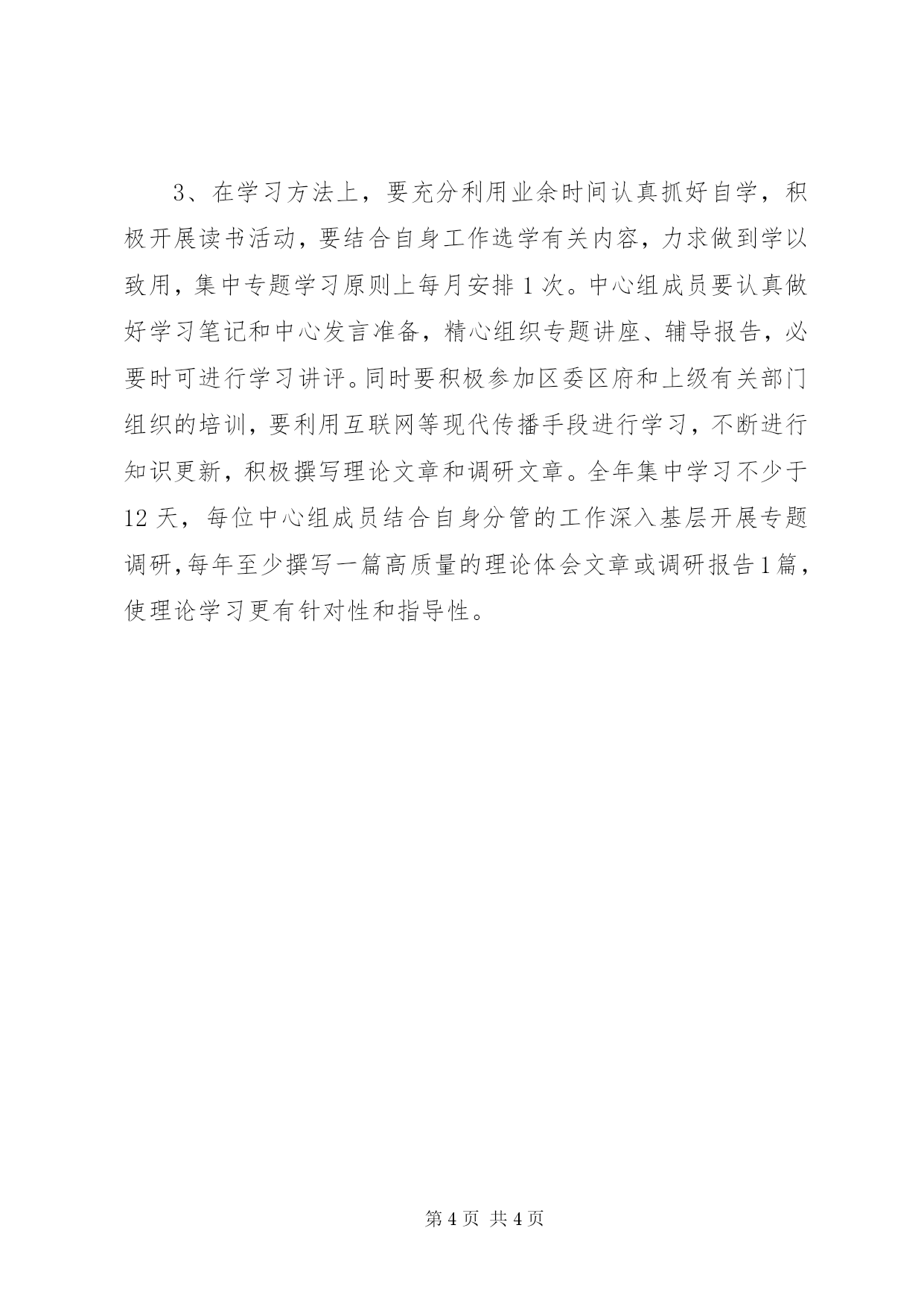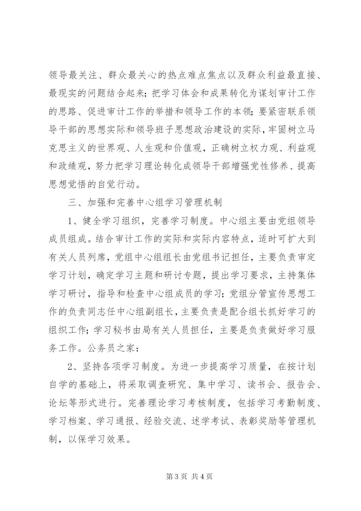 第PAGE\*Arabic\*MERGEFORMAT4页共NUMPAGES\*MERGEFORMAT4页审计局党组理论学习计划2010年是全面完成“十一五”计划的最后一年,也是全面贯彻区委“打造四大新平台,增创五大新优势”的关键之年。根据区委办《关于进一步加强和改进党委(党组)中心组学习的实施意见》,切实加强学习型组织和学习型领导班子建设,努力提高领导班子的思想政治水平,进一步促进审计科学发展,提高领导干部驾驭市场经济能力,更好地发挥审计“免疫系统”功能的作用,为我区经济建设稳步上升和构建宜居宜业作出贡献,特制定2010年局党组中心组理论学习计划。一、加强领导,提高认识党组中心组学习是领导班子和领导干部在职学习的重要组织形式,是加强领导班子思想政治建设的重要措施,是提高党执政能力、建设马克思主义学习型的重要途径。局领导班子要从全局的高度,认真贯彻落实区委提出“打造四大新平台,增创五大新优势”的要求,进一步统一思想、提高认识,切实发挥党组中心组“学理论、议大事、转观念、出思路、建班子、促发展”的作用,不断提高领导干部思想理论水平和工作能力,增强领导班子的凝聚力、向心力和战斗力。在真学、真懂、真信、真用上下功夫,努力成为勤奋学习、善于思考、与时俱进的模范,用理论来指导审计科学发展。二、学习主要内容与重点(一)把学习贯彻中国特色社会主义理论体系特别是科学发展观作为学习的重中之重。继续深入学习“三个代表”重要思想,牢固树立和落实科学发展观。在学习中,首先必须全面准确把握科学发展观的深刻内涵和基本要求,坚持以人为本、全面发展。必须坚持理论和实际相结合,因地制宜、因时制宜地把科学发展观的要求贯穿于审计工作的始终。主要集中学习和精心研读马列著作、毛泽东著作、邓小平著作、江泽民著作等,认真学习胡锦涛一系列重要论述。学习党的路线方针政策、中央重要文件与重要会议精神、《中国共产党党章》和廉政建设有关内容。并结合审计工作的实际,加强对党的历史、法律法规以及审计相关知识的学习研究,进一步拓展理论学习知识面,巩固理论文化功底。(二)把学习贯彻区委重要决策和重要工作部署作为学习研讨和专题调研的重点内容。要结合区委六届六次全会精神和《政府工作报告》的主要精神,尤其是对北仑的城市功能定位、总体规划、经济社会发展战略的学习研讨,特别是要结合北仑审计自身的特点开展理论调研,局领导班子要深入社会、深入一线、深入被审计单位搞好审计调研工作,撰写切实符合北仑审计规律和特点的理论调研文章。(三)要始终坚持理论联系实际的马克思主义学风,坚持学以致用,用以促学。要坚持学习理论与指导审计工作实践相结合、改造主观世界与客观世界相结合的原则,把学习理论同研究解决领导最关注、群众最关心的热点难点焦点以及群众利益最直接、最现实的问题结合起来;把学习体会和成果转化为谋划审计工作的思路、促进审计工作的举措和领导工作的本领;要紧密联系领导干部的思想实际和领导班子思想政治建设的实际,牢固树立马克思主义的世界观、人生观和价值观,正确树立权力观、利益观和政绩观,努力把学习理论转化成领导干部增强党性修养、提高思想觉悟的自觉行动。三、加强和完善中心组学习管理机制1、健全学习组织,完善学习制度。中心组主要由党组领导成员组成。结合审计工作的实际和实际内容特点,适时可扩大到有关人员列席,党组中心组组长由党组书记担任,主要负责审定学习计划,确定学习主题和研讨专题,提出学习要求,主持集体学习研讨,指导和检查中心组成员的学习;党组分管宣传思想工作的负责同志任中心组副组长,主要负责是配合组长抓好学习的组织工作;学习秘书由局有关人员担任,主要是负责做好学习服务工作。公务员之家:2、坚持各项学习制度。为进一步提高学习质量,在按计划自学的基础上,将采取调查研究、集中学习、读书会、报告会、论坛等形式进行。完善理论学习考核制度,包括学习考勤制度、学习档案、学习通报、经验交流、述学考试、表彰奖励等管理机制,以保学习效果。3、在学习方法上,要充分利用业余时间认真抓好自学,积极开展读书活动,要结合自身工作选学有关内容,力求做到学以致用,集中专题学习原则上每月安排1次。中心组成员要认真做好学习笔记和中心发言准备,精心组织专题讲座、辅导报告,必要时可进行学习讲评。同时要积极参加区委区府和上级有关部门组织的培训,要利用互联网等现代传播手段进行学习,不断进行知识更新,积极撰写理论文章和调研文章。全年集中学习不少于12天,每位中心组成员结合自身分管的工作深入基层开展专题调研,每年至少撰写一篇高质量的理论体会文章或调研报告1篇,使理论学习更有针对性和指导性。