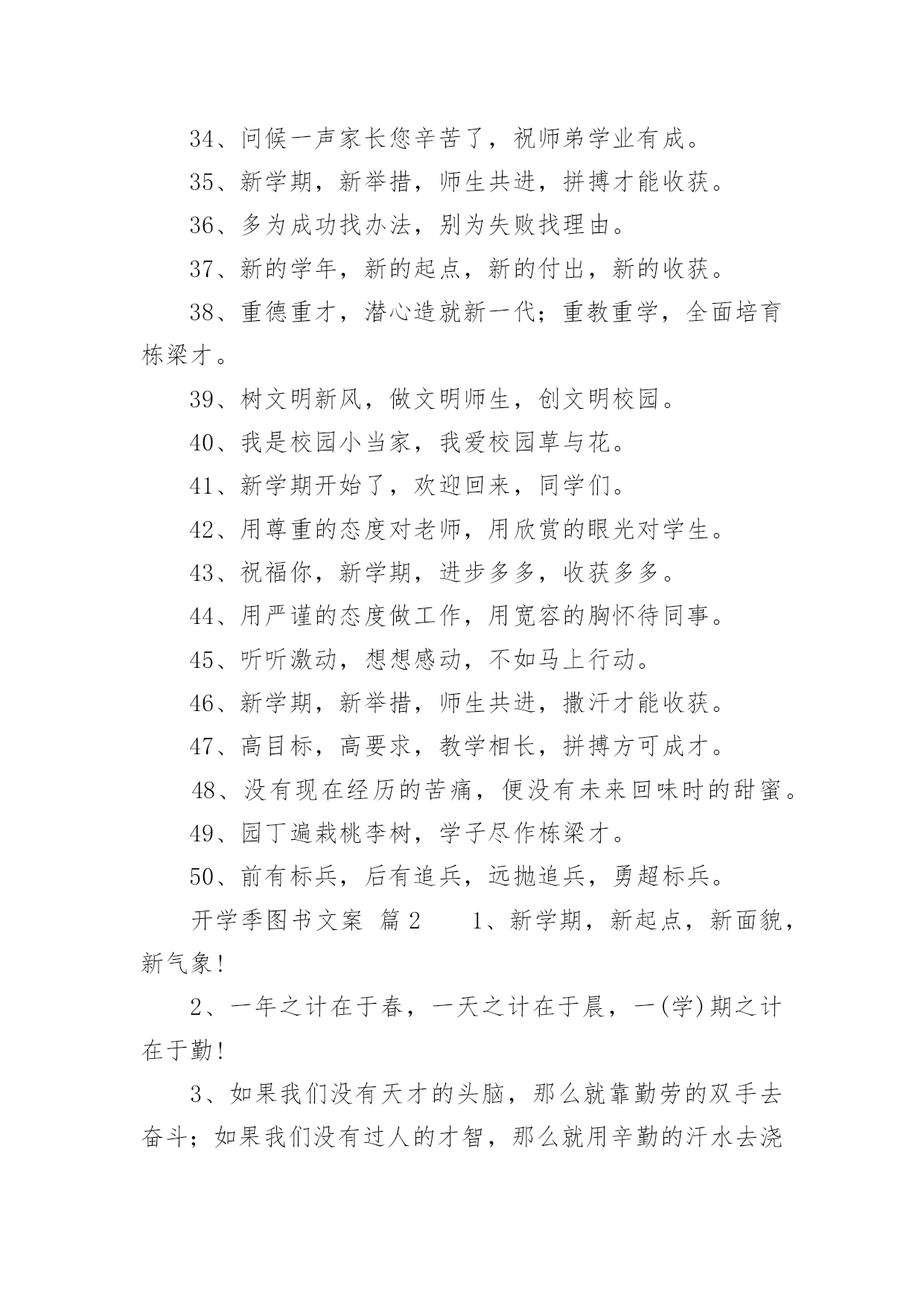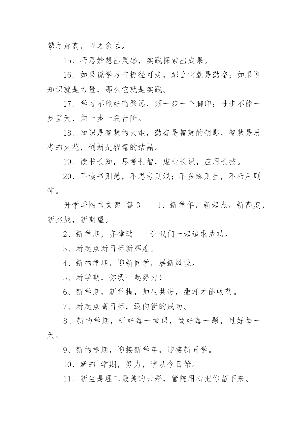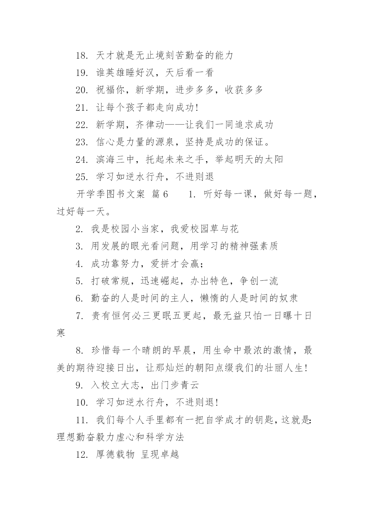 开学季图书文案开学季图书文案随着社交网络和信息技术的迅猛发展,大家都经常接触到文案吧,文案用于分享自己的生活状态。那些火遍朋友圈的文案都是什么样的呢?以下是小编整理的开学季图书文案,希望能够帮助到大家。开学季图书文案篇11、新学年新风貌,工作学习更高效。2、要想成绩好,动手又动脑,要想环境美,大家齐创造。3、与雄心壮志相伴而来的,应是老老实实循序渐进的学习方法。4、脚踏实地搞复习,胸有成竹迎挑战。5、新的学年,新的起点,新的复出,新的收获。6、找方法才能成功,找借口只有失败。7、让校园的每一处都说话。让每个孩子都走向成功。8、抓住机遇,珍惜时光,奋力拼搏,誓夺高分。9、对待学习要有严禁的态度,敢于面对,敢于接受,敢于拼搏才会成功。10、信心是力量的源泉,坚持是成功的保证。11、你想改变你的未来吗?那就努力改变你的现在。12、新学年,新起点,新高度,新挑战,新希望。13、诚信严谨继往开来,求实创新再创辉煌。14、世界上所有的成功,都起步于开始。15、尊重别人就是尊重自己,才能赢得别人的尊重。16、热烈欢迎老师们同学们返校工作学习。17、学会思考,善于创新,学会共处,善于协作。18、加强素质教育为科技兴国培养更多优秀人才。19、准备好自己,在需要的时候上升到豪迈的高度。20、全面贯彻教育方针,切实推进素质教育。21、宝剑锋从磨砺出,梅花香自苦寒来。22、老师如同父母亲,同学都有手足情。23、听好每一堂课,做好每一题,过好每一天。24、天道酬勤。准备好自己,在需要的时候上升到豪迈的高度。25、成功不在于分数的高低,而在于你有没有尽了最大的努力。26、明天的成功是今天迈出的每一步。27、学习的敌人是自己的满足,要使自己学一点东西,必须从不自满开始。28、让校园的.每一处都说话让每个孩子都走向成功。29、弱者失机遇,强者抓机遇,智者抢机遇。让我们赢在起跑线上。30、祝福你们:新学期,进步大,收获多。31、不做口头的巨人,要做行动的标兵。32、发扬奥林匹克精神,共建和谐美好校园。33、手牵手共建和谐青中,心连心同做文明师生。34、问候一声家长您辛苦了,祝师弟学业有成。35、新学期,新举措,师生共进,拼搏才能收获。36、多为成功找办法,别为失败找理由。37、新的学年,新的起点,新的付出,新的收获。38、重德重才,潜心造就新一代;重教重学,全面培育栋梁才。39、树文明新风,做文明师生,创文明校园。40、我是校园小当家,我爱校园草与花。41、新学期开始了,欢迎回来,同学们。42、用尊重的态度对老师,用欣赏的眼光对学生。43、祝福你,新学期,进步多多,收获多多。44、用严谨的态度做工作,用宽容的胸怀待同事。45、听听激动,想想感动,不如马上行动。46、新学期,新举措,师生共进,撒汗才能收获。47、高目标,高要求,教学相长,拼搏方可成才。48、没有现在经历的苦痛,便没有未来回味时的甜蜜。49、园丁遍栽桃李树,学子尽作栋梁才。50、前有标兵,后有追兵,远抛追兵,勇超标兵。开学季图书文案篇21、新学期,新起点,新面貌,新气象!2、一年之计在于春,一天之计在于晨,一(学)期之计在于勤!3、如果我们没有天才的头脑,那么就靠勤劳的双手去奋斗;如果我们没有过人的才智,那么就用辛勤的汗水去浇灌;如果没有快捷的步伐,那么就靠不停的脚步行进;如果没有良好的机遇就靠不断地探索去实现。4、知识改变命运,学习改写人生,教育改善人格,反思启迪智慧。5、勤奋是探求知识的`舟楫,思维是探索知识的方法,请教是学习知识的妙招,练习是巩固知识的途径。6、学好靠信心,求教靠虚心,探求靠专心,长进靠恒心。7、勤奋是开启知识大门的钥匙,思考是理解知识的利器,读书是掌握知识的捷径,练习是巩固知识的方法,讨论是理解知识的妙招,探求是创新知识的途径。8、求学无笨者,努力就成功;读书没捷径,尽力能高分。9、学习靠积累,记忆靠理解,经验靠反思,熟练靠练习。10、死记硬背得不到真知识,投机取巧学不到真本领;纸上谈兵学不到真本事,闭门造车结不出好硕果。11、写作要多读、多看;做题要多练、多思;巩固要多记、多用;运用要多想、多试。12、勤奋出聪明,博学出智慧,多练出技巧,巧思出硕果。13、学问靠点滴积累,聪明靠思考练就;博学靠学习成就,创造靠实践成功。14、知识如金矿,挖之愈深,得之愈多;知识如登山,攀之愈高,望之愈远。15、巧思妙想出灵感,实践探索出成果。16、如果说学习有捷径可走,那么它就是勤奋;如果说知识就是力量,那么它就是实践。17、学习不能好高骛远,须一步一个脚印;进步不能一步登天,须一步一级台阶。18、知识是智慧的火炬,勤奋是智慧的钥匙,智慧是思考的火花,创新是智慧的结晶。19、读书长知,思考长智,虚心长识,应用长技。20、不读书则愚,不思考则浅;不多练则生,不巧用则钝。开学季图书文案篇3