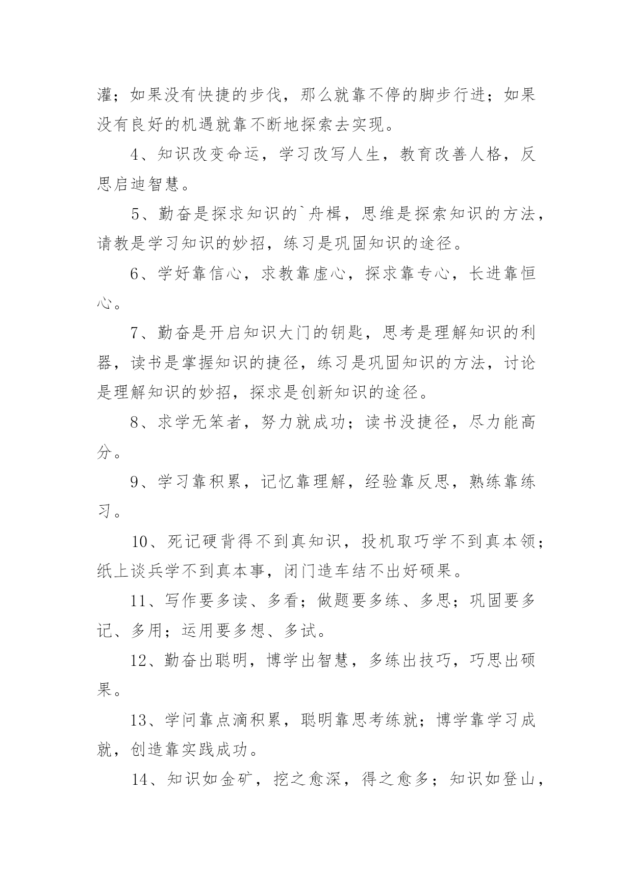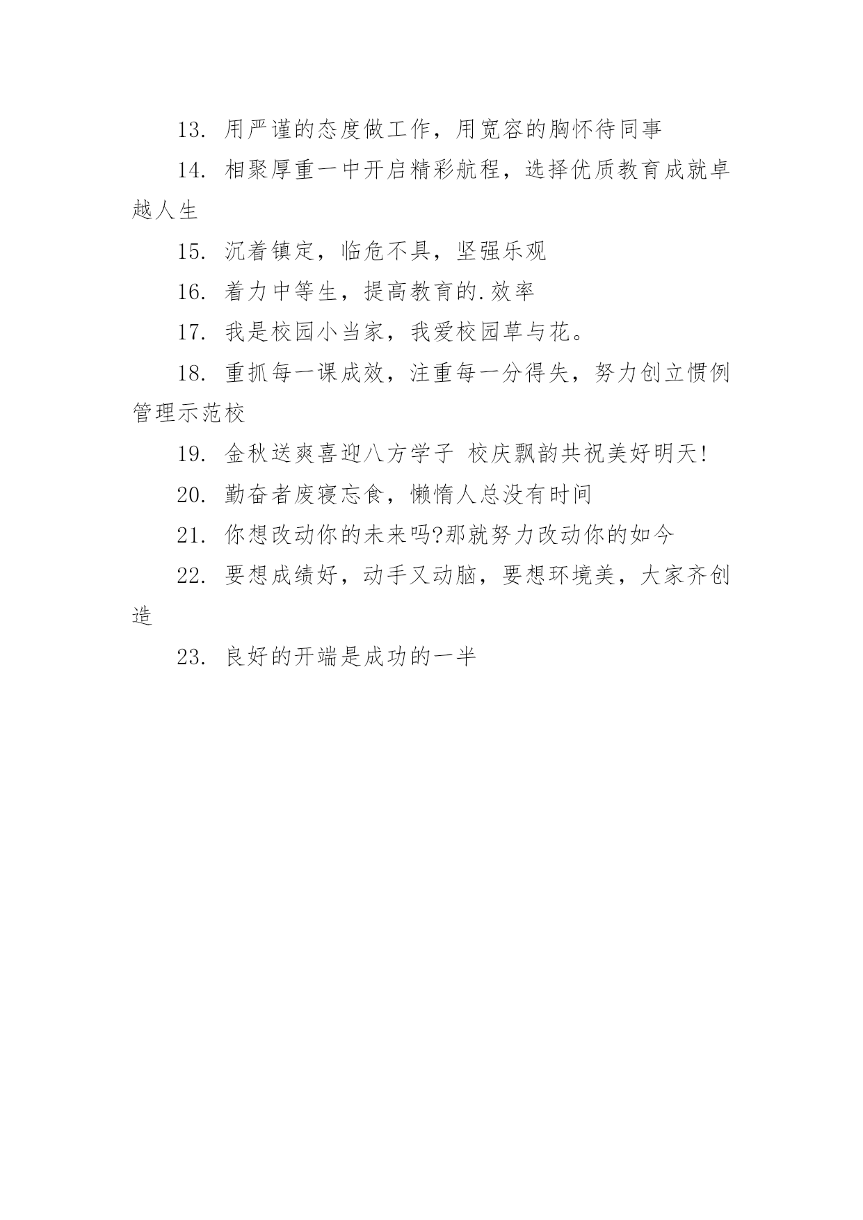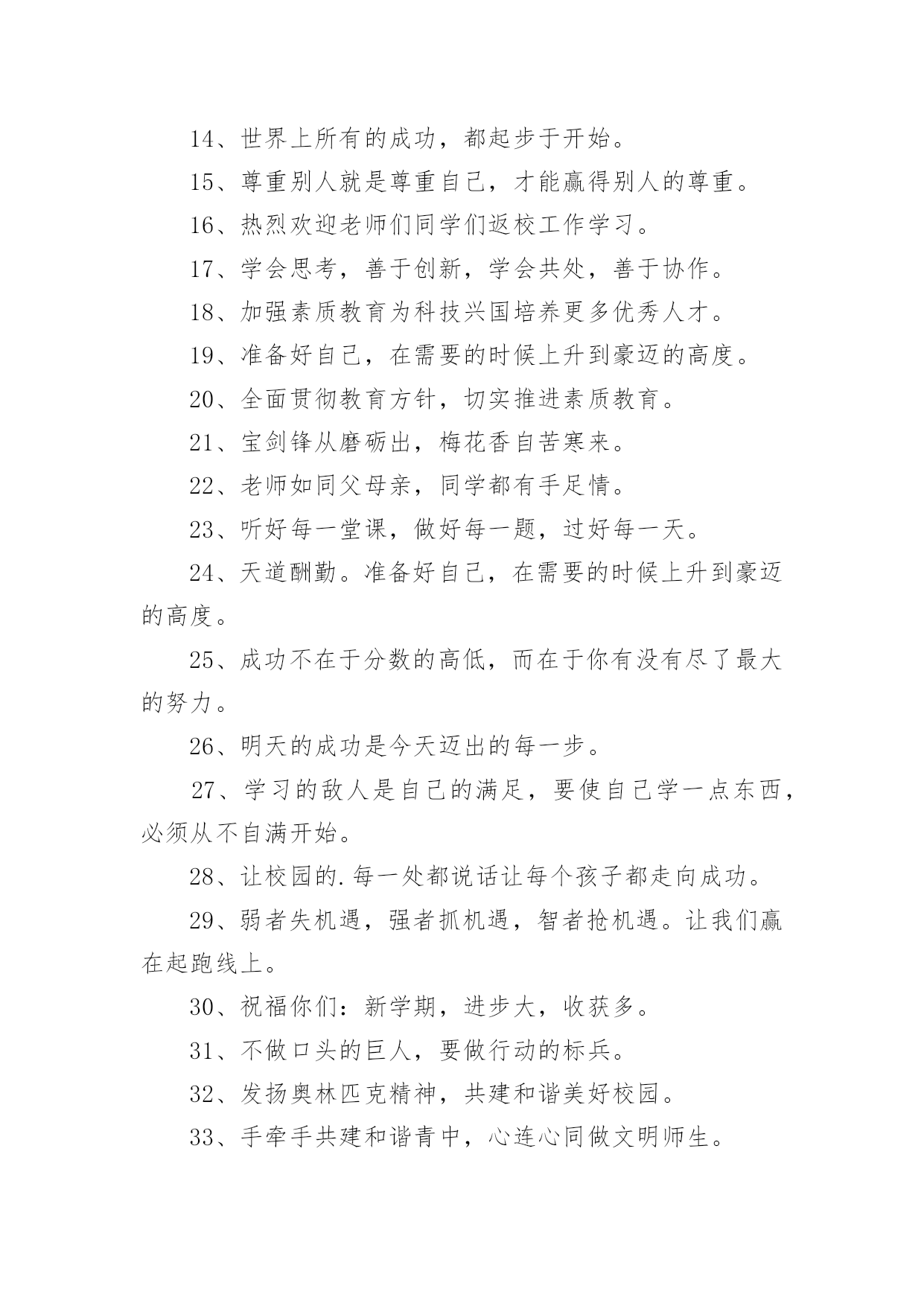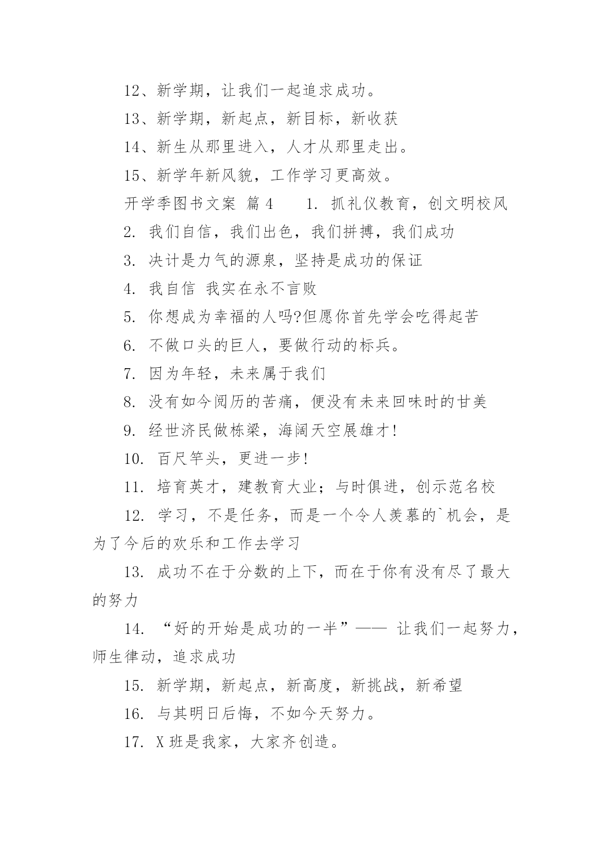 开学季图书文案开学季图书文案随着社交网络和信息技术的迅猛发展,大家都经常接触到文案吧,文案用于分享自己的生活状态。那些火遍朋友圈的文案都是什么样的呢?以下是小编整理的开学季图书文案,希望能够帮助到大家。开学季图书文案篇11、新学年新风貌,工作学习更高效。2、要想成绩好,动手又动脑,要想环境美,大家齐创造。3、与雄心壮志相伴而来的,应是老老实实循序渐进的学习方法。4、脚踏实地搞复习,胸有成竹迎挑战。5、新的学年,新的起点,新的复出,新的收获。6、找方法才能成功,找借口只有失败。7、让校园的每一处都说话。让每个孩子都走向成功。8、抓住机遇,珍惜时光,奋力拼搏,誓夺高分。9、对待学习要有严禁的态度,敢于面对,敢于接受,敢于拼搏才会成功。10、信心是力量的源泉,坚持是成功的保证。11、你想改变你的未来吗?那就努力改变你的现在。12、新学年,新起点,新高度,新挑战,新希望。13、诚信严谨继往开来,求实创新再创辉煌。14、世界上所有的成功,都起步于开始。15、尊重别人就是尊重自己,才能赢得别人的尊重。16、热烈欢迎老师们同学们返校工作学习。17、学会思考,善于创新,学会共处,善于协作。18、加强素质教育为科技兴国培养更多优秀人才。19、准备好自己,在需要的时候上升到豪迈的高度。20、全面贯彻教育方针,切实推进素质教育。21、宝剑锋从磨砺出,梅花香自苦寒来。22、老师如同父母亲,同学都有手足情。23、听好每一堂课,做好每一题,过好每一天。24、天道酬勤。准备好自己,在需要的时候上升到豪迈的高度。25、成功不在于分数的高低,而在于你有没有尽了最大的努力。26、明天的成功是今天迈出的每一步。27、学习的敌人是自己的满足,要使自己学一点东西,必须从不自满开始。28、让校园的.每一处都说话让每个孩子都走向成功。29、弱者失机遇,强者抓机遇,智者抢机遇。让我们赢在起跑线上。30、祝福你们:新学期,进步大,收获多。31、不做口头的巨人,要做行动的标兵。32、发扬奥林匹克精神,共建和谐美好校园。33、手牵手共建和谐青中,心连心同做文明师生。34、问候一声家长您辛苦了,祝师弟学业有成。35、新学期,新举措,师生共进,拼搏才能收获。36、多为成功找办法,别为失败找理由。37、新的学年,新的起点,新的付出,新的收获。38、重德重才,潜心造就新一代;重教重学,全面培育栋梁才。39、树文明新风,做文明师生,创文明校园。40、我是校园小当家,我爱校园草与花。41、新学期开始了,欢迎回来,同学们。42、用尊重的态度对老师,用欣赏的眼光对学生。43、祝福你,新学期,进步多多,收获多多。44、用严谨的态度做工作,用宽容的胸怀待同事。45、听听激动,想想感动,不如马上行动。46、新学期,新举措,师生共进,撒汗才能收获。47、高目标,高要求,教学相长,拼搏方可成才。48、没有现在经历的苦痛,便没有未来回味时的甜蜜。49、园丁遍栽桃李树,学子尽作栋梁才。50、前有标兵,后有追兵,远抛追兵,勇超标兵。开学季图书文案篇21、新学期,新起点,新面貌,新气象!2、一年之计在于春,一天之计在于晨,一(学)期之计在于勤!3、如果我们没有天才的头脑,那么就靠勤劳的双手去奋斗;如果我们没有过人的才智,那么就用辛勤的汗水去浇灌;如果没有快捷的步伐,那么就靠不停的脚步行进;如果没有良好的机遇就靠不断地探索去实现。4、知识改变命运,学习改写人生,教育改善人格,反思启迪智慧。5、勤奋是探求知识的`舟楫,思维是探索知识的方法,请教是学习知识的妙招,练习是巩固知识的途径。6、学好靠信心,求教靠虚心,探求靠专心,长进靠恒心。7、勤奋是开启知识大门的钥匙,思考是理解知识的利器,读书是掌握知识的捷径,练习是巩固知识的方法,讨论是理解知识的妙招,探求是创新知识的途径。8、求学无笨者,努力就成功;读书没捷径,尽力能高分。9、学习靠积累,记忆靠理解,经验靠反思,熟练靠练习。10、死记硬背得不到真知识,投机取巧学不到真本领;纸上谈兵学不到真本事,闭门造车结不出好硕果。11、写作要多读、多看;做题要多练、多思;巩固要多记、多用;运用要多想、多试。12、勤奋出聪明,博学出智慧,多练出技巧,巧思出硕果。13、学问靠点滴积累,聪明靠思考练就;博学靠学习成就,创造靠实践成功。14、知识如金矿,挖之愈深,得之愈多;知识如登山,攀之愈高,望之愈远。15、巧思妙想出灵感,实践探索出成果。16、如果说学习有捷径可走,那么它就是勤奋;如果说知识就是力量,那么它就是实践。17、学习不能好高骛远,须一步一个脚印;进步不能一步登天,须一步一级台阶。18、知识是智慧的火炬,勤奋是智慧的钥匙,智慧是思考的火花,创新是智慧的结晶。19、读书长知,思考长智,虚心长识,应用长技。20、不读书则愚,不思考则浅;不多练则生,不巧用则钝。开学季图书文案篇3