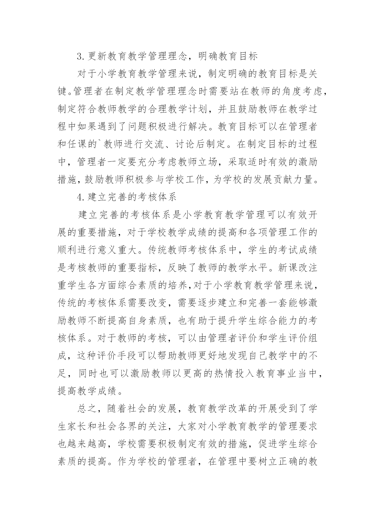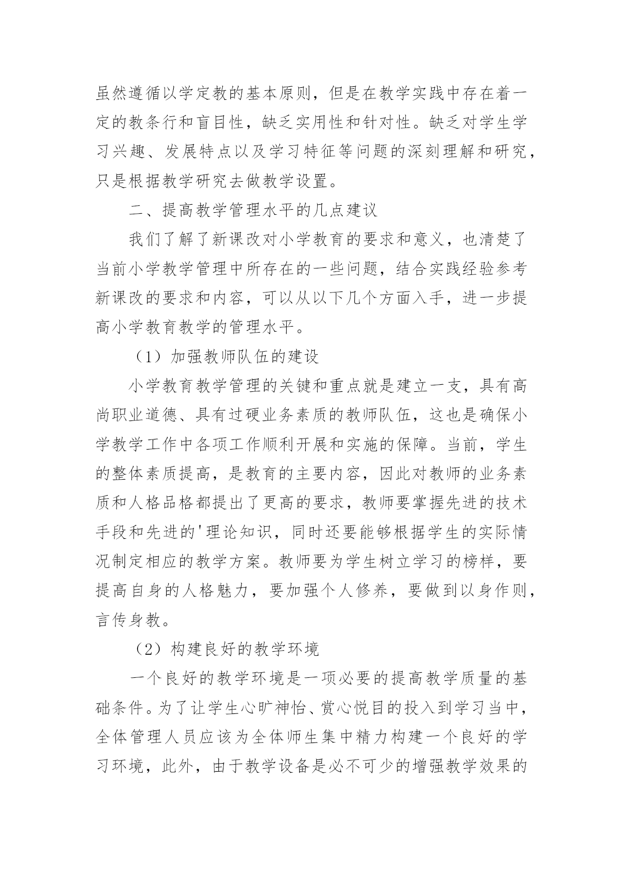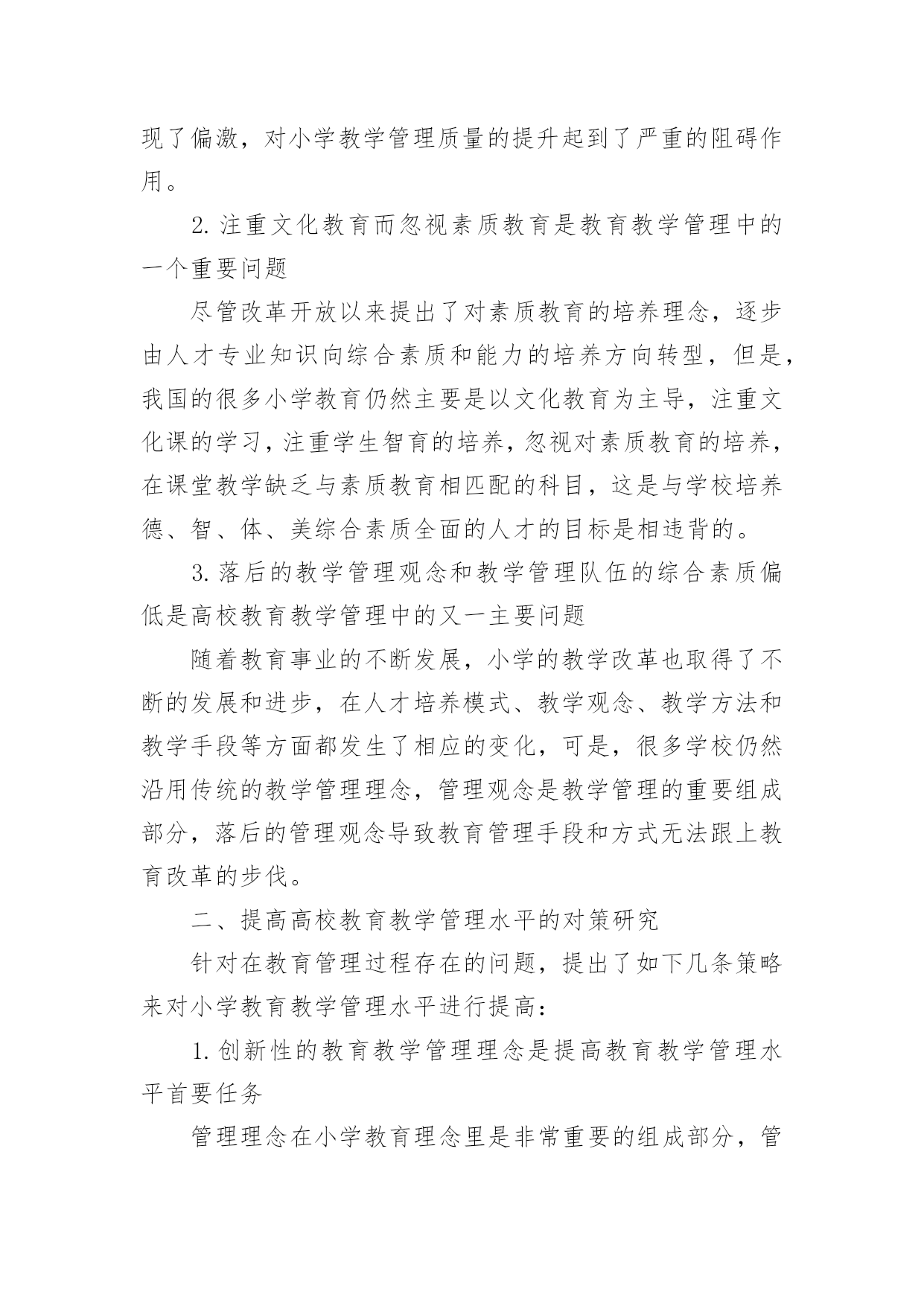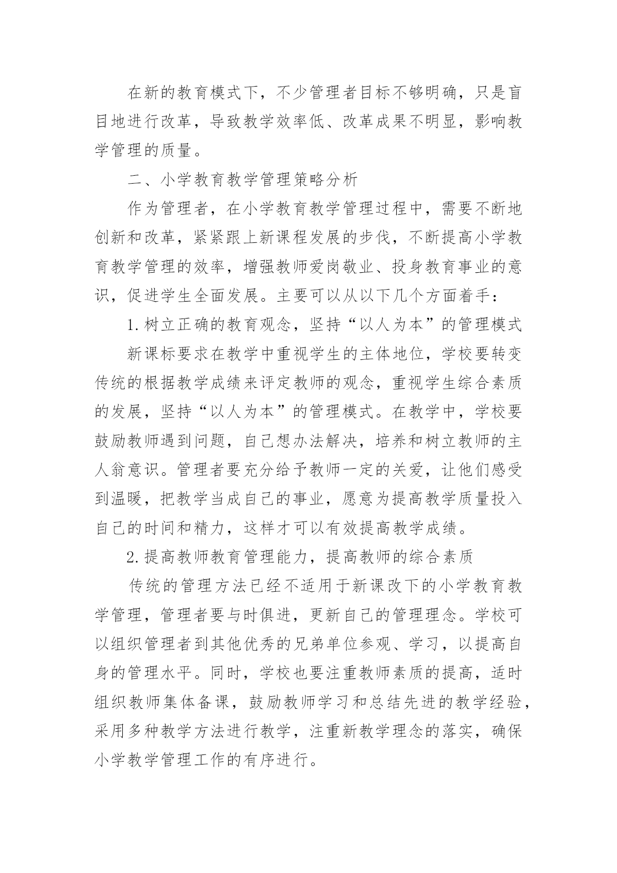 小学教育教学管理论文在学习和工作的日常里,大家都经常看到论文的身影吧,论文是对某些学术问题进行研究的手段。写论文的注意事项有许多,你确定会写吗?下面是小编为大家整理的小学教育教学管理论文,希望对大家有所帮助。小学教育教学管理论文1一、小学教育教学管理存在的问题研究在新课程改革的大背景下,小学的教育教育管理工作是一项长期而艰巨的任务,在教育改革的进程中,发现主要存在以下几方面的问题:1.教学资源的缺乏和教学管理制度的滞后是教育教学管理中的主要问题目前,大多数学校都是通过学习成绩来作为一个学生的衡量标准,充分暴露出应试教育的弊端,课程结构、课程内容及课程设置等方面都比较单一,不能体现学生的多样化发展,这就对教学资源提出了更高的要求,但是,在新课程改革形势背景下,很多学校普遍由于教育经费的投入不足而导致教育资源比较缺乏,此外,教育教学管理制度过于统一化和刚性化,将学生的创造力和想象力基本忽视,学生的学科成绩被作为高校的教学质量和教学管理水平的评定依据,而且教师评优、加薪和晋升都与学生成绩挂钩,教学评价太过形式化,造成教育教学管理质量的价值评定在某种程度上出现了偏激,对小学教学管理质量的提升起到了严重的阻碍作用。2.注重文化教育而忽视素质教育是教育教学管理中的一个重要问题尽管改革开放以来提出了对素质教育的培养理念,逐步由人才专业知识向综合素质和能力的培养方向转型,但是,我国的很多小学教育仍然主要是以文化教育为主导,注重文化课的学习,注重学生智育的培养,忽视对素质教育的培养,在课堂教学缺乏与素质教育相匹配的科目,这是与学校培养德、智、体、美综合素质全面的人才的目标是相违背的。3.落后的教学管理观念和教学管理队伍的综合素质偏低是高校教育教学管理中的又一主要问题随着教育事业的不断发展,小学的教学改革也取得了不断的发展和进步,在人才培养模式、教学观念、教学方法和教学手段等方面都发生了相应的变化,可是,很多学校仍然沿用传统的教学管理理念,管理观念是教学管理的重要组成部分,落后的管理观念导致教育管理手段和方式无法跟上教育改革的步伐。二、提高高校教育教学管理水平的对策研究针对在教育管理过程存在的问题,提出了如下几条策略来对小学教育教学管理水平进行提高:1.创新性的教育教学管理理念是提高教育教学管理水平首要任务管理理念在小学教育理念里是非常重要的组成部分,管理思想的创新是教育思想观念创新的开始,在一个科学的`、创新的管理理念的引导下,能够为学校的教育教学指明方向和道路,有利于教育教学的发展。学校的发展潜力在很大程度是由创新的教育管理机制来决定的,管理创新是建立在教育研究和办学实践有机结合的基础之上的,通过坚持创新的、可持续的教育教学管理理念能够提高教育教学管理水平,从而促进学校在市场经济体制下的竞争优势,对学校的可持续发展有非常大的作用。2.注重教师综合素质和管理人员职业素养的提升是提高教育教学管理水平重要内容教师是教学活动的主要执行者和引导者,学生创新能力的发展在很大程度上是受到教师的教育教学创造性的影响的,通过教师进修培训进行继续教育,使教师的综合素质得到提升。教师实施因材施教的创造性教育教学活动,对学生的主动性和创造性的培养和发挥起到非常重要的引导作用,能够调动学生学习的兴趣和积极性,有利于教育质量的提高;此外,管理人员是教育教学管理的主要负责人,应该引起学校的足够重视,努力提高管理人员的综合素质,进行一定的专业培训,组建一支具备科学现代、创新观念、知识丰富、能力突出的管理人员队伍,是教学管理工作能够高效进行的重要保障,这些对于小学教育教学管理水平的提高都是相当重要的。三、总结综上所述,对小学教育教学管理进行提高是当前教育改革潮流下的必然趋势,对于未来社会高素质综合人才的培养至关重要,有利于教育教学质量的大力提高,可以促进学校的可持续发展,促使中国特色社会主义教育事业的顺利发展。小学教育教学管理论文2一、当前小学教育教学管理的现状就目前的情况来看,小学的教学管理状况还是相对较为乐观的,在各级教育部门的大力配合,以及国家各级教育部门的指导下,新课改的内容和精神已经在各级小学初步得到了普及和推广。教学方法、教育理念、教师队伍的建设以及教学模式等等都得到了提升,学生的各方面能力和素质也都得到了提高,成绩是值得肯定的。不过,受到各种因素的影响,在小学的教育管理中还存在着以下几个主要问题:(1)与新课改的要求相比,教师队伍的建设还没有达到标准,还存在着一定的差距,还需要进一步提高小学教师的职业道德和业务素质。在学术、学生的热爱和敬业精神上还比较欠缺,业务素质需要进一步增强,需要加大力度提高教师的教学观念,另外还需要加强现代教育教学手段和方法。要想达到新课改的要求,以上这些都需要进一步改进和提高。(2)在小学的教育教学中,师生仍然受到传统影响教育观念的