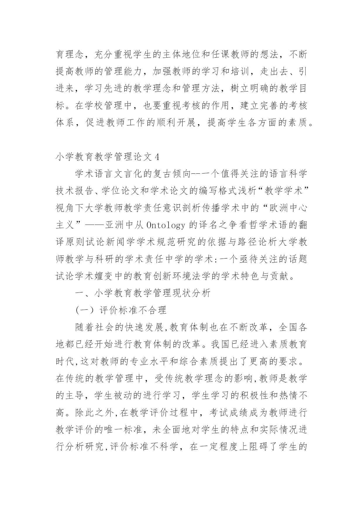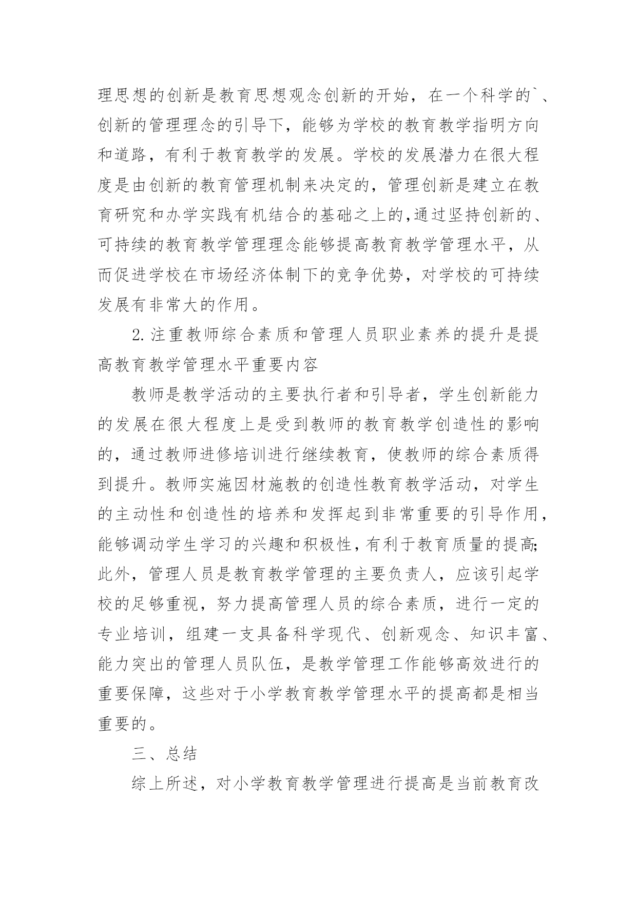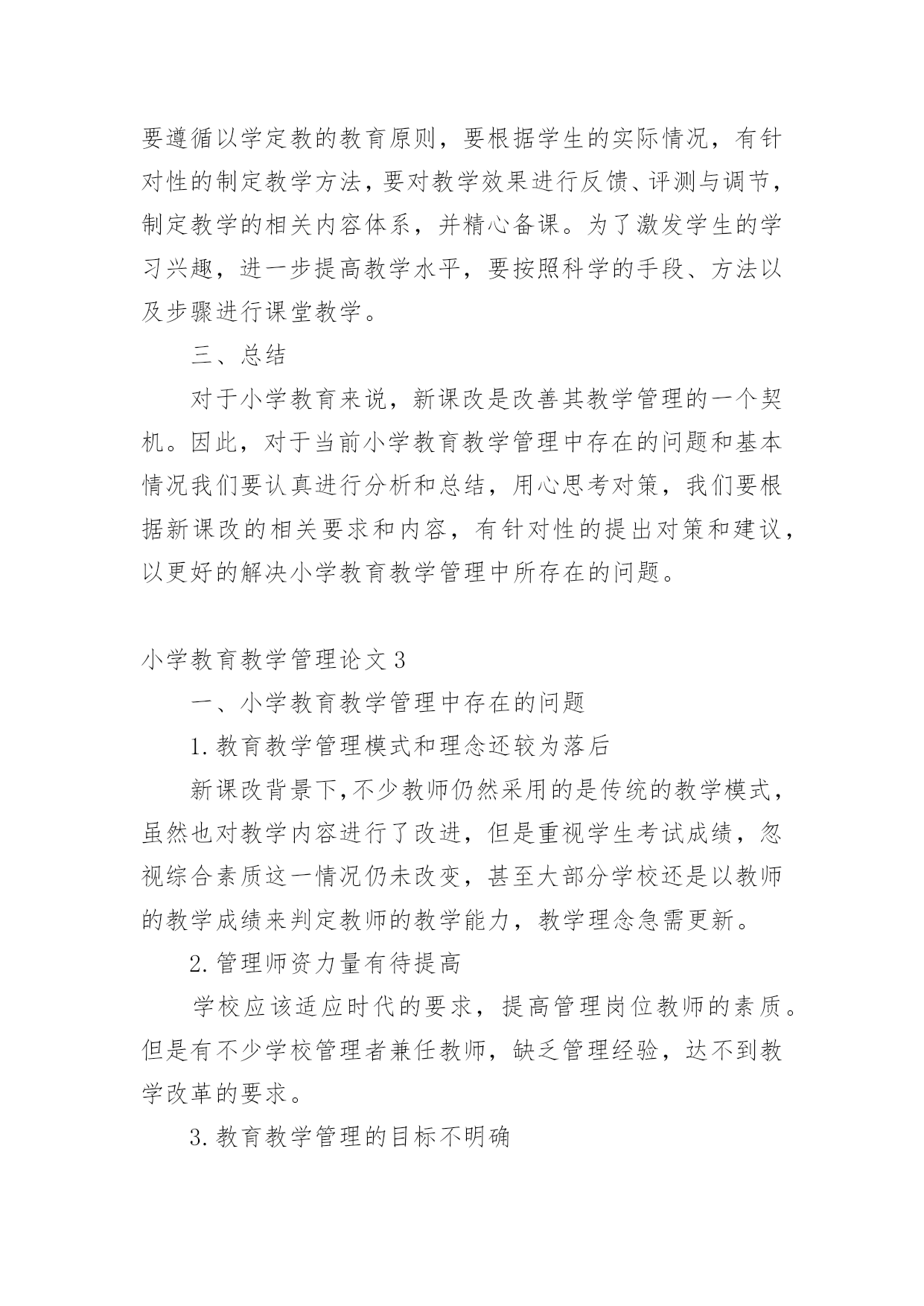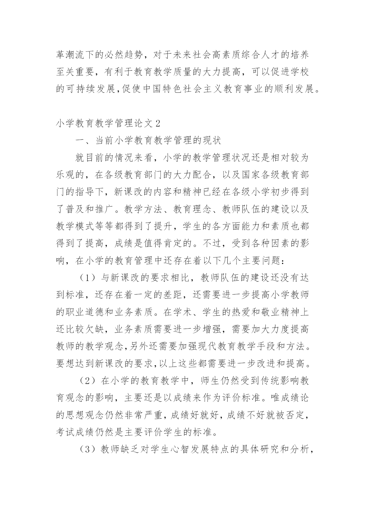 小学教育教学管理论文在学习和工作的日常里,大家都经常看到论文的身影吧,论文是对某些学术问题进行研究的手段。写论文的注意事项有许多,你确定会写吗?下面是小编为大家整理的小学教育教学管理论文,希望对大家有所帮助。小学教育教学管理论文1一、小学教育教学管理存在的问题研究在新课程改革的大背景下,小学的教育教育管理工作是一项长期而艰巨的任务,在教育改革的进程中,发现主要存在以下几方面的问题:1.教学资源的缺乏和教学管理制度的滞后是教育教学管理中的主要问题目前,大多数学校都是通过学习成绩来作为一个学生的衡量标准,充分暴露出应试教育的弊端,课程结构、课程内容及课程设置等方面都比较单一,不能体现学生的多样化发展,这就对教学资源提出了更高的要求,但是,在新课程改革形势背景下,很多学校普遍由于教育经费的投入不足而导致教育资源比较缺乏,此外,教育教学管理制度过于统一化和刚性化,将学生的创造力和想象力基本忽视,学生的学科成绩被作为高校的教学质量和教学管理水平的评定依据,而且教师评优、加薪和晋升都与学生成绩挂钩,教学评价太过形式化,造成教育教学管理质量的价值评定在某种程度上出现了偏激,对小学教学管理质量的提升起到了严重的阻碍作用。2.注重文化教育而忽视素质教育是教育教学管理中的一个重要问题尽管改革开放以来提出了对素质教育的培养理念,逐步由人才专业知识向综合素质和能力的培养方向转型,但是,我国的很多小学教育仍然主要是以文化教育为主导,注重文化课的学习,注重学生智育的培养,忽视对素质教育的培养,在课堂教学缺乏与素质教育相匹配的科目,这是与学校培养德、智、体、美综合素质全面的人才的目标是相违背的。3.落后的教学管理观念和教学管理队伍的综合素质偏低是高校教育教学管理中的又一主要问题随着教育事业的不断发展,小学的教学改革也取得了不断的发展和进步,在人才培养模式、教学观念、教学方法和教学手段等方面都发生了相应的变化,可是,很多学校仍然沿用传统的教学管理理念,管理观念是教学管理的重要组成部分,落后的管理观念导致教育管理手段和方式无法跟上教育改革的步伐。二、提高高校教育教学管理水平的对策研究针对在教育管理过程存在的问题,提出了如下几条策略来对小学教育教学管理水平进行提高:1.创新性的教育教学管理理念是提高教育教学管理水平首要任务管理理念在小学教育理念里是非常重要的组成部分,管理思想的创新是教育思想观念创新的开始,在一个科学的`、创新的管理理念的引导下,能够为学校的教育教学指明方向和道路,有利于教育教学的发展。学校的发展潜力在很大程度是由创新的教育管理机制来决定的,管理创新是建立在教育研究和办学实践有机结合的基础之上的,通过坚持创新的、可持续的教育教学管理理念能够提高教育教学管理水平,从而促进学校在市场经济体制下的竞争优势,对学校的可持续发展有非常大的作用。2.注重教师综合素质和管理人员职业素养的提升是提高教育教学管理水平重要内容教师是教学活动的主要执行者和引导者,学生创新能力的发展在很大程度上是受到教师的教育教学创造性的影响的,通过教师进修培训进行继续教育,使教师的综合素质得到提升。教师实施因材施教的创造性教育教学活动,对学生的主动性和创造性的培养和发挥起到非常重要的引导作用,能够调动学生学习的兴趣和积极性,有利于教育质量的提高;此外,管理人员是教育教学管理的主要负责人,应该引起学校的足够重视,努力提高管理人员的综合素质,进行一定的专业培训,组建一支具备科学现代、创新观念、知识丰富、能力突出的管理人员队伍,是教学管理工作能够高效进行的重要保障,这些对于小学教育教学管理水平的提高都是相当重要的。三、总结综上所述,对小学教育教学管理进行提高是当前教育改革潮流下的必然趋势,对于未来社会高素质综合人才的培养至关重要,有利于教育教学质量的大力提高,可以促进学校的可持续发展,促使中国特色社会主义教育事业的顺利发展。小学教育教学管理论文2一、当前小学教育教学管理的现状就目前的情况来看,小学的教学管理状况还是相对较为乐观的,在各级教育部门的大力配合,以及国家各级教育部门的指导下,新课改的内容和精神已经在各级小学初步得到了普及和推广。教学方法、教育理念、教师队伍的建设以及教学模式等等都得到了提升,学生的各方面能力和素质也都得到了提高,成绩是值得肯定的。不过,受到各种因素的影响,在小学的教育管理中还存在着以下几个主要问题:(1)与新课改的要求相比,教师队伍的建设还没有达到标准,还存在着一定的差距,还需要进一步提高小学教师的职业道德和业务素质。在学术、学生的热爱和敬业精神上还比较欠缺,业务素质需要进一步增强,需要加大力度提高教师的教学观念,另外还需要加强现代教育教学手段和方法。要想达到新课改的要求,以上这些都需要进一步改进和提高。(2)在小学的教育教学中,师生仍然受到传统影响教育观念的