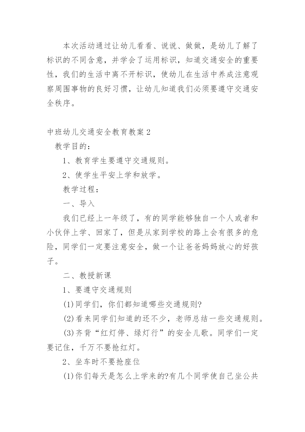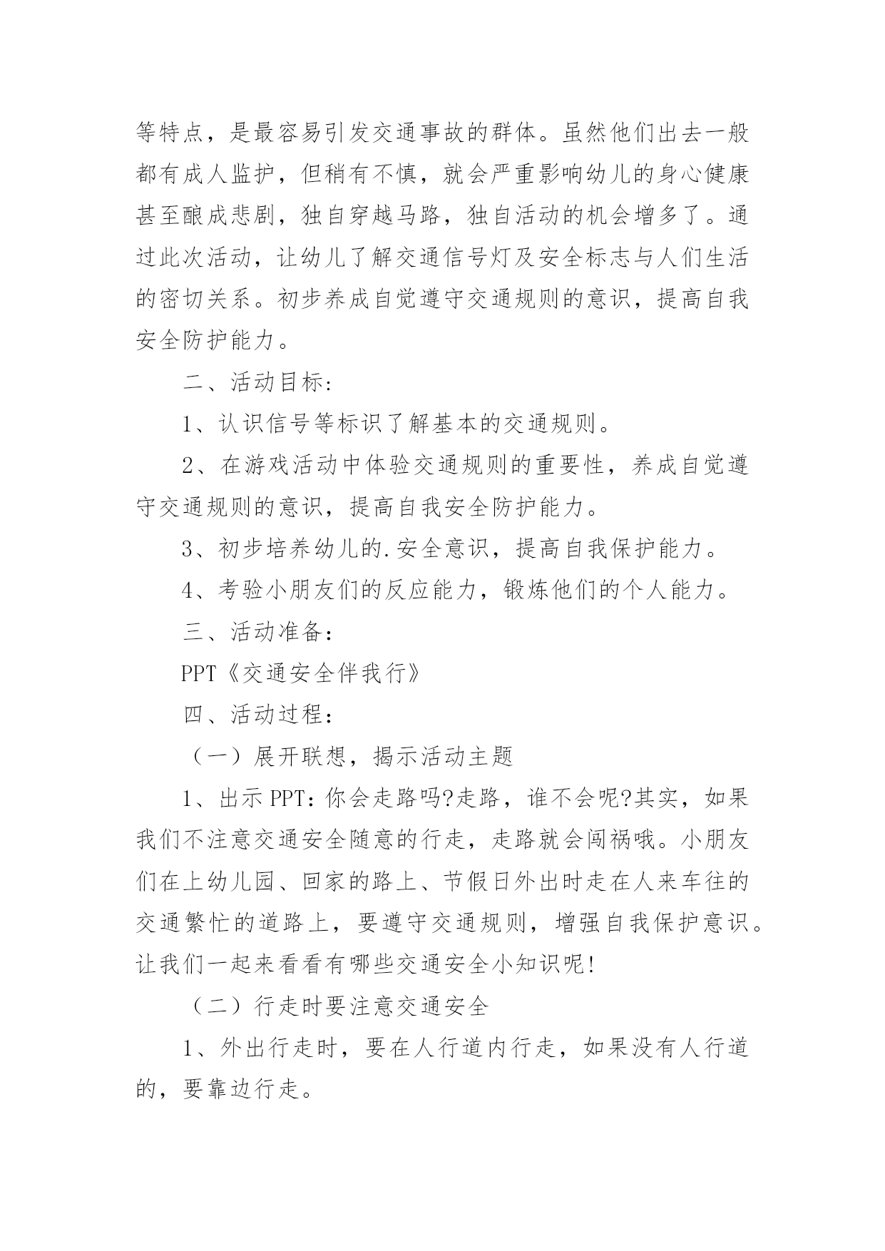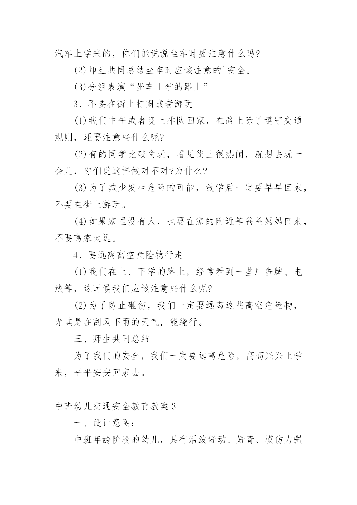 中班幼儿交通安全教育教案在教学工作者开展教学活动前,总不可避免地需要编写教案,通过教案准备可以更好地根据具体情况对教学进程做适当的必要的调整。那么大家知道正规的教案是怎么写的吗?以下是小编为大家整理的中班幼儿交通安全教育教案,仅供参考,欢迎大家阅读。中班幼儿交通安全教育教案1活动目标:1.认识常见的交通标识。2.能够区分不同类型的标识代表的意义。3.养成遵守规则的好习惯。4.探索、发现生活中的多样性及特征。5.教幼儿养成细心、认真的学习态度。活动准备:一些重要交通标识的卡片若干、白板一块、活动过程:一、游戏导入。师:今天,我们一起来玩个交通小游戏,想玩吗?选择自己喜欢的交通工具(出发喽!)(带领幼儿在教室内走一圈,然后回到自己的位置上。)提问:告诉老师,如果我们真的是走在马路上或者你们在马路上开车的话,能随便开,随便走吗?幼:不能,那样太危险了,会被车子撞了的。师:宝贝,你说的我赞同。二、认识标识1.出示图片(叮叮当当在放学的路上发现了一个奇怪的标志)小朋友们见过吗?如果见过,记得在哪里见过呢?2.小朋友们畅所欲言。3.老师这里有很多交通标识图片,你们都认识哪些?(教师出示交通标识图片,幼儿自由说)4.我们现在一个个来认识。(逐一认识并解释其作用)三、拼图游戏师:小朋友们真棒!今天认识了许多交通标识,现在请给我们的标识宝宝拼出一个完整的'身体吧。(小朋友们小组合作拼交通标识)小结:交通标识在我们的生活中很重要,我们一定要遵守交通规则,如果我们不遵守交通规则,就会发生危险的交通事故,导致自己和他人的受到伤害,小朋友们一定要养成遵守交通规则的好习惯。四、学唱儿歌五、总结、延伸师:今天,我们不仅认识了这么多交通标识,还知道了它们的作用,我们每个人都要遵守交通规则,文明出行。小朋友们假期里可以和爸爸妈妈一起外出找找还有哪些交通标识?活动反思本次活动通过让幼儿看看、说说、做做,是幼儿了解了标识的不同含意,并学会了运用标识,知道交通安全的重要性,我们的生活中离不开标识,使幼儿在生活中养成注意观察周围事物的良好习惯,让幼儿知道我们必须要遵守交通安全秩序。中班幼儿交通安全教育教案2教学目的:1、教育学生要遵守交通规则。2、使学生平安上学和放学。教学过程:一、导入我们已经上一年级了,有的同学能够独自一个人或者和小伙伴上学、回家了,但是从家到学校的路上会有很多的危险,同学们一定要注意安全,做一个让爸爸妈妈放心的好孩子。二、教授新课1、要遵守交通规则(1)同学们,你们都知道哪些交通规则?(2)看来同学们知道的还不少,老师总结一些交通规则。(3)齐背“红灯停、绿灯行”的安全儿歌。同学们一定要记住,千万不要抢红灯。2、坐车时不要抢座位(1)你们每天是怎么上学来的?有几个同学使自己坐公共汽车上学来的,你们能说说坐车时要注意什么吗?(2)师生共同总结坐车时应该注意的`安全。(3)分组表演“坐车上学的路上”3、不要在街上打闹或者游玩(1)我们中午或者晚上排队回家,在路上除了遵守交通规则,还要注意些什么呢?(2)有的同学比较贪玩,看见街上很热闹,就想去玩一会儿,你们说这样做对不对?为什么?(3)为了减少发生危险的可能,放学后一定要早早回家,不要在街上游玩。(4)如果家里没有人,也要在家的附近等爸爸妈妈回来,不要离家太远。4、要远离高空危险物行走(1)我们在上、下学的路上,经常看到一些广告牌、电线等,这时候我们应该注意些什么呢?(2)为了防止砸伤,我们一定要远离这些高空危险物,尤其是在刮风下雨的天气,能绕行。三、师生共同总结为了我们的安全,我们一定要远离危险,高高兴兴上学来,平平安安回家去。中班幼儿交通安全教育教案3一、设计意图:中班年龄阶段的幼儿,具有活泼好动、好奇、模仿力强等特点,是最容易引发交通事故的群体。虽然他们出去一般都有成人监护,但稍有不慎,就会严重影响幼儿的身心健康甚至酿成悲剧,独自穿越马路,独自活动的机会增多了。通过此次活动,让幼儿了解交通信号灯及安全标志与人们生活的密切关系。初步养成自觉遵守交通规则的意识,提高自我安全防护能力。二、活动目标:1、认识信号等标识了解基本的交通规则。2、在游戏活动中体验交通规则的重要性,养成自觉遵守交通规则的意识,提高自我安全防护能力。3、初步培养幼儿的.安全意识,提高自我保护能力。4、考验小朋友们的反应能力,锻炼他们的个人能力。三、活动准备:PPT《交通安全伴我行》四、活动过程:(一)展开联想,揭示活动主题1、出示PPT:你会走路吗?走路,谁不会呢?其实,如果我们不注意交通安全随意的行走,走路就会闯祸哦。小朋友们在上幼儿园、回家的路上、节假日外出时走在人来车往的交通繁忙的道路上,要遵守交通规则,增强自我保护意识。让我们一起来看看有哪些交通安全小知识呢!(二)行走时要注意交通安全1、外出行走时,要在人行道内行走