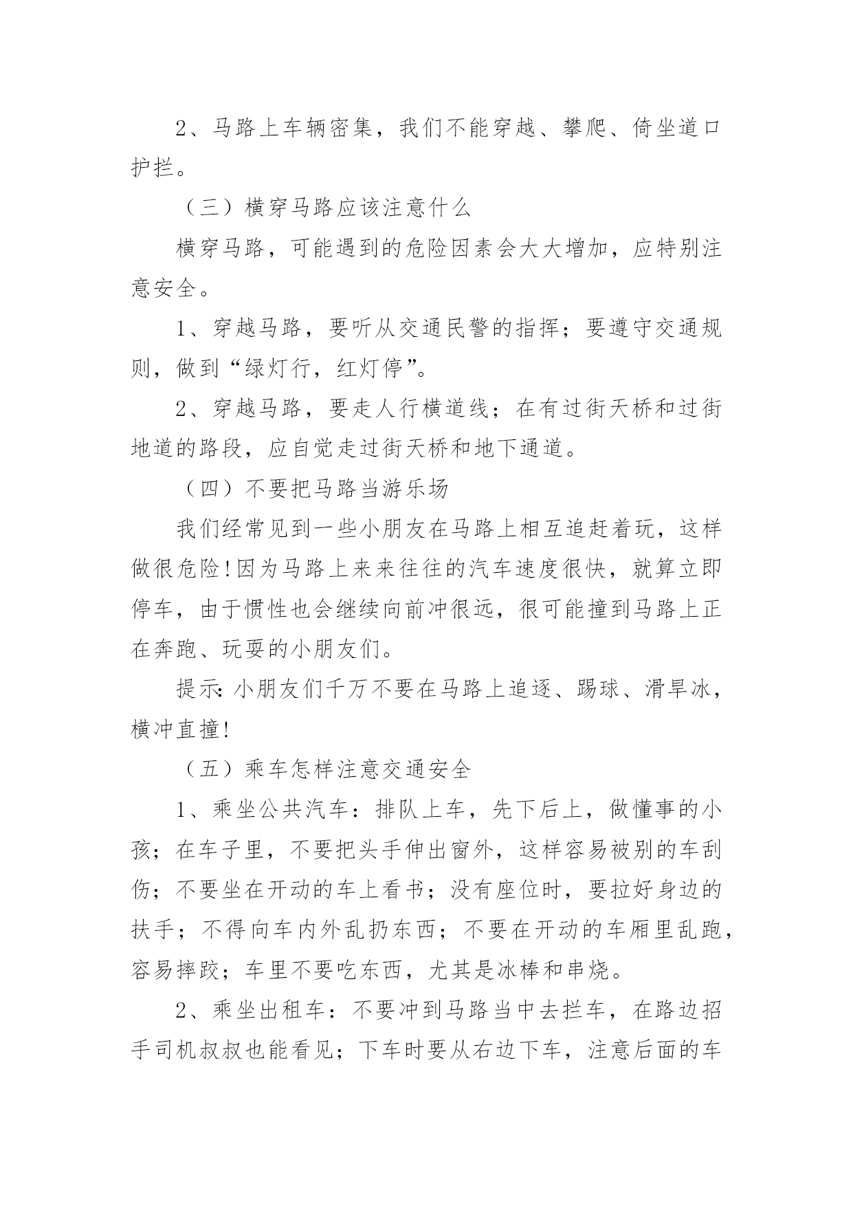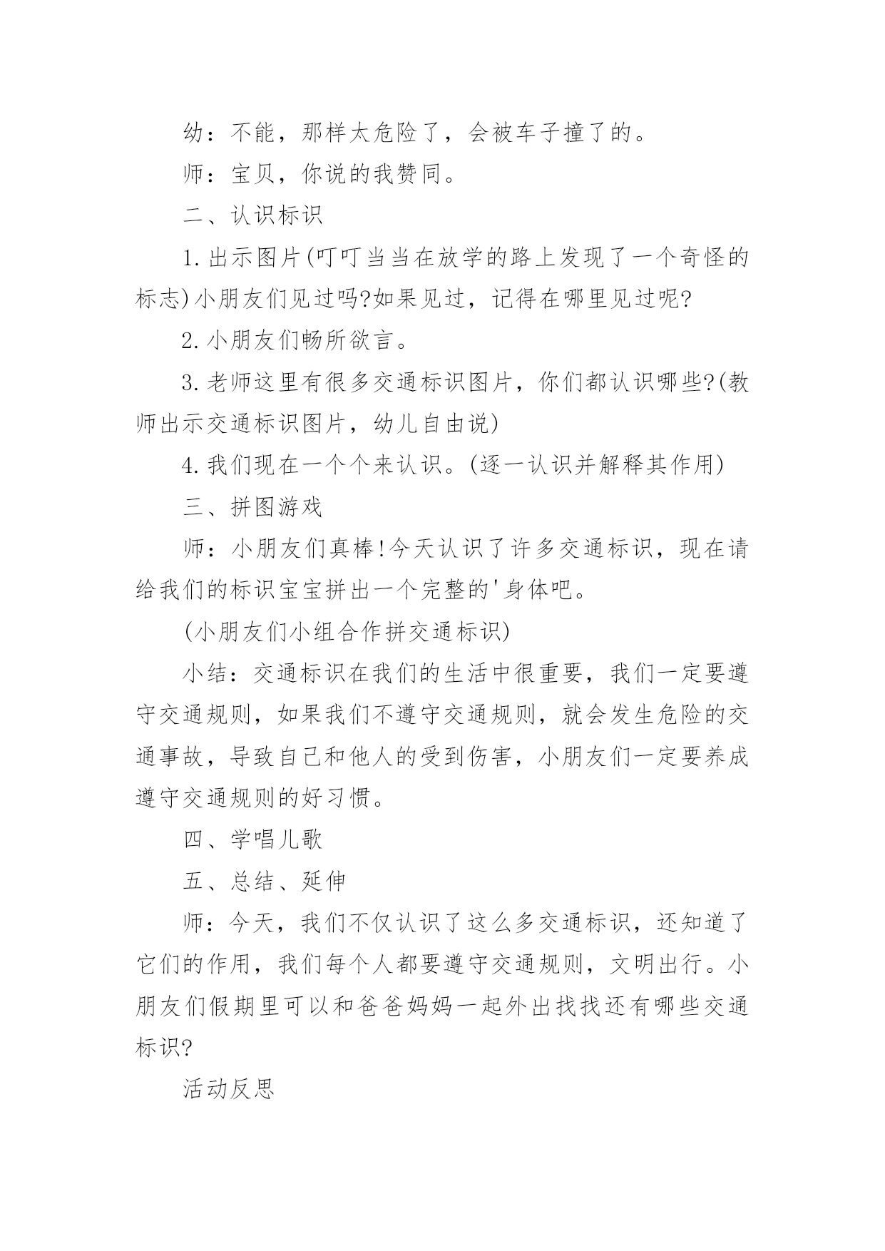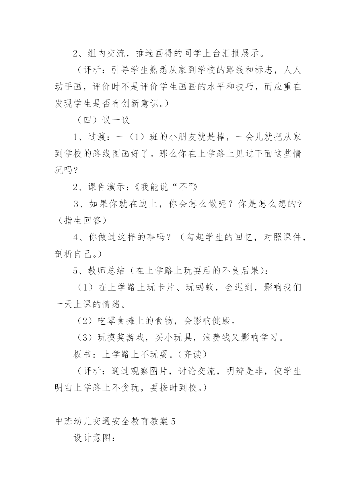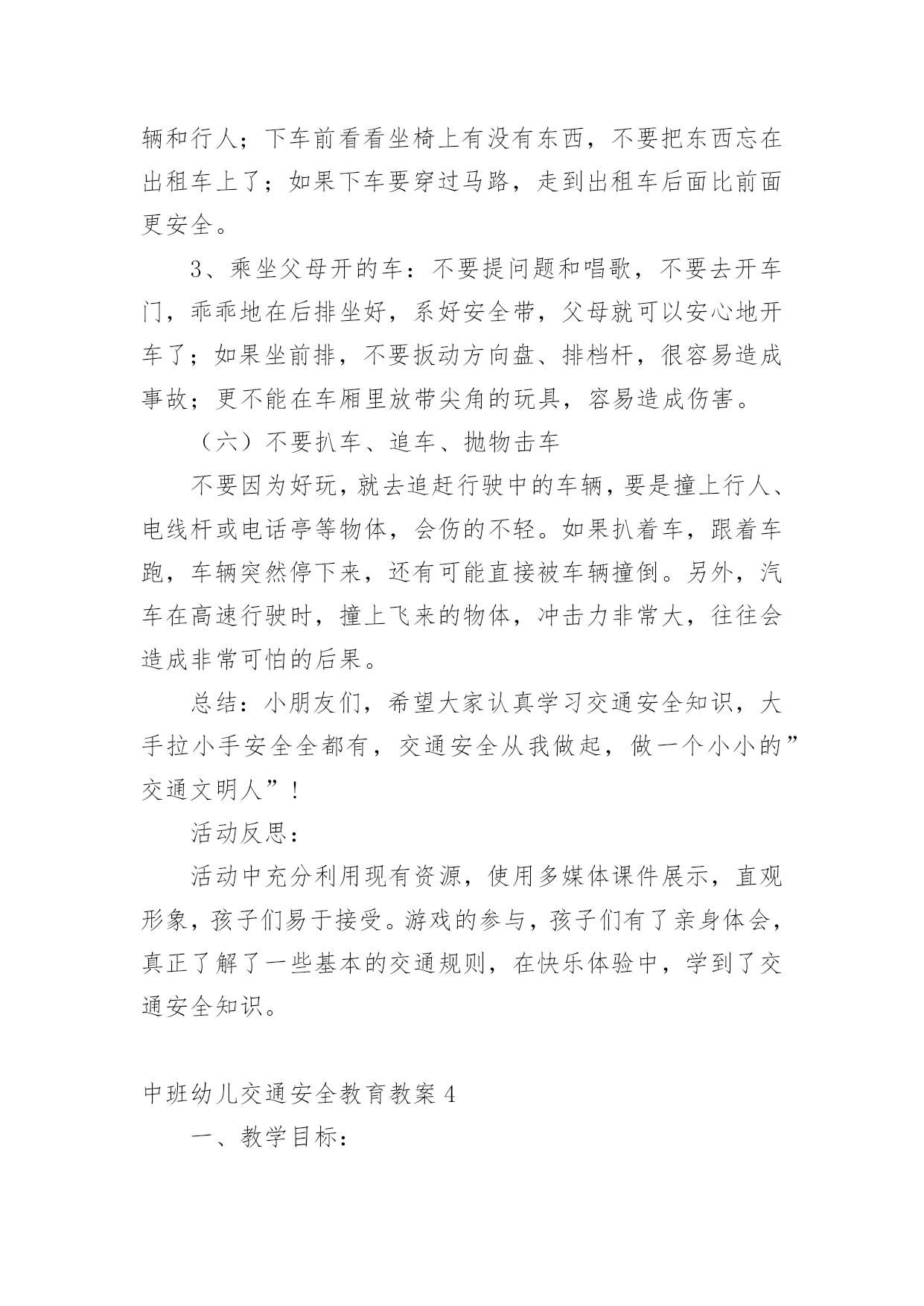 中班幼儿交通安全教育教案在教学工作者开展教学活动前,总不可避免地需要编写教案,通过教案准备可以更好地根据具体情况对教学进程做适当的必要的调整。那么大家知道正规的教案是怎么写的吗?以下是小编为大家整理的中班幼儿交通安全教育教案,仅供参考,欢迎大家阅读。中班幼儿交通安全教育教案1活动目标:1.认识常见的交通标识。2.能够区分不同类型的标识代表的意义。3.养成遵守规则的好习惯。4.探索、发现生活中的多样性及特征。5.教幼儿养成细心、认真的学习态度。活动准备:一些重要交通标识的卡片若干、白板一块、活动过程:一、游戏导入。师:今天,我们一起来玩个交通小游戏,想玩吗?选择自己喜欢的交通工具(出发喽!)(带领幼儿在教室内走一圈,然后回到自己的位置上。)提问:告诉老师,如果我们真的是走在马路上或者你们在马路上开车的话,能随便开,随便走吗?幼:不能,那样太危险了,会被车子撞了的。师:宝贝,你说的我赞同。二、认识标识1.出示图片(叮叮当当在放学的路上发现了一个奇怪的标志)小朋友们见过吗?如果见过,记得在哪里见过呢?2.小朋友们畅所欲言。3.老师这里有很多交通标识图片,你们都认识哪些?(教师出示交通标识图片,幼儿自由说)4.我们现在一个个来认识。(逐一认识并解释其作用)三、拼图游戏师:小朋友们真棒!今天认识了许多交通标识,现在请给我们的标识宝宝拼出一个完整的'身体吧。(小朋友们小组合作拼交通标识)小结:交通标识在我们的生活中很重要,我们一定要遵守交通规则,如果我们不遵守交通规则,就会发生危险的交通事故,导致自己和他人的受到伤害,小朋友们一定要养成遵守交通规则的好习惯。四、学唱儿歌五、总结、延伸师:今天,我们不仅认识了这么多交通标识,还知道了它们的作用,我们每个人都要遵守交通规则,文明出行。小朋友们假期里可以和爸爸妈妈一起外出找找还有哪些交通标识?活动反思本次活动通过让幼儿看看、说说、做做,是幼儿了解了标识的不同含意,并学会了运用标识,知道交通安全的重要性,我们的生活中离不开标识,使幼儿在生活中养成注意观察周围事物的良好习惯,让幼儿知道我们必须要遵守交通安全秩序。中班幼儿交通安全教育教案2教学目的:1、教育学生要遵守交通规则。2、使学生平安上学和放学。教学过程:一、导入我们已经上一年级了,有的同学能够独自一个人或者和小伙伴上学、回家了,但是从家到学校的路上会有很多的危险,同学们一定要注意安全,做一个让爸爸妈妈放心的好孩子。二、教授新课1、要遵守交通规则(1)同学们,你们都知道哪些交通规则?(2)看来同学们知道的还不少,老师总结一些交通规则。(3)齐背“红灯停、绿灯行”的安全儿歌。同学们一定要记住,千万不要抢红灯。2、坐车时不要抢座位(1)你们每天是怎么上学来的?有几个同学使自己坐公共汽车上学来的,你们能说说坐车时要注意什么吗?(2)师生共同总结坐车时应该注意的`安全。(3)分组表演“坐车上学的路上”3、不要在街上打闹或者游玩(1)我们中午或者晚上排队回家,在路上除了遵守交通规则,还要注意些什么呢?(2)有的同学比较贪玩,看见街上很热闹,就想去玩一会儿,你们说这样做对不对?为什么?(3)为了减少发生危险的可能,放学后一定要早早回家,不要在街上游玩。(4)如果家里没有人,也要在家的附近等爸爸妈妈回来,不要离家太远。4、要远离高空危险物行走(1)我们在上、下学的路上,经常看到一些广告牌、电线等,这时候我们应该注意些什么呢?(2)为了防止砸伤,我们一定要远离这些高空危险物,尤其是在刮风下雨的天气,能绕行。三、师生共同总结为了我们的安全,我们一定要远离危险,高高兴兴上学来,平平安安回家去。中班幼儿交通安全教育教案3一、设计意图:中班年龄阶段的幼儿,具有活泼好动、好奇、模仿力强等特点,是最容易引发交通事故的群体。虽然他们出去一般都有成人监护,但稍有不慎,就会严重影响幼儿的身心健康甚至酿成悲剧,独自穿越马路,独自活动的机会增多了。通过此次活动,让幼儿了解交通信号灯及安全标志与人们生活的密切关系。初步养成自觉遵守交通规则的意识,提高自我安全防护能力。二、活动目标:1、认识信号等标识了解基本的交通规则。2、在游戏活动中体验交通规则的重要性,养成自觉遵守交通规则的意识,提高自我安全防护能力。3、初步培养幼儿的.安全意识,提高自我保护能力。4、考验小朋友们的反应能力,锻炼他们的个人能力。三、活动准备:PPT《交通安全伴我行》四、活动过程:(一)展开联想,揭示活动主题1、出示PPT:你会走路吗?走路,谁不会呢?其实,如果我们不注意交通安全随意的行走,走路就会闯祸哦。小朋友们在上幼儿园、回家的路上、节假日外出时走在人来车往的交通繁忙的道路上,要遵守交通规则,增强自我保护意识。让我们一起来看看有哪些交通安全小知识呢!(二)行走时要注意交通安全1、外出行走时,要在人行道内行走