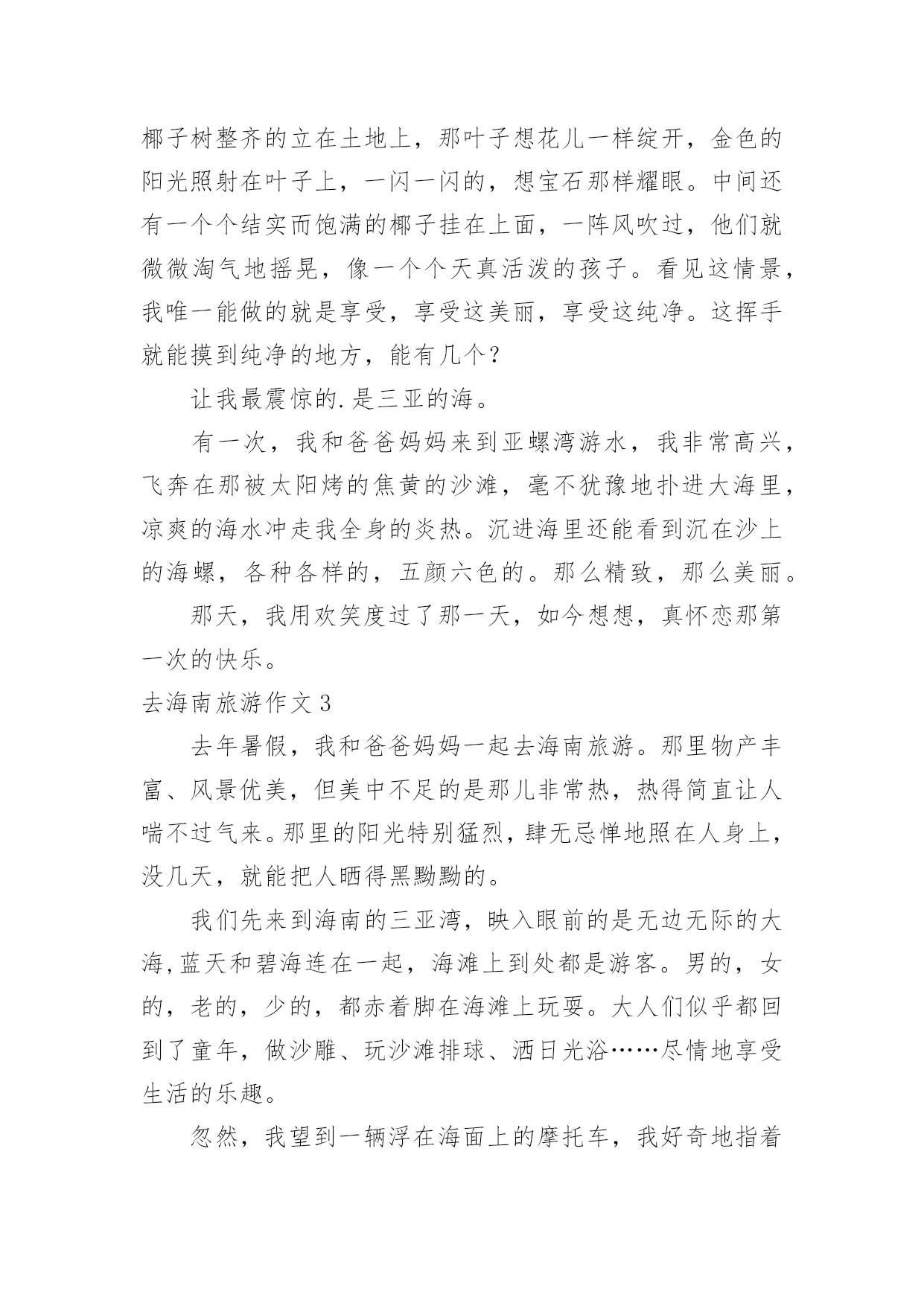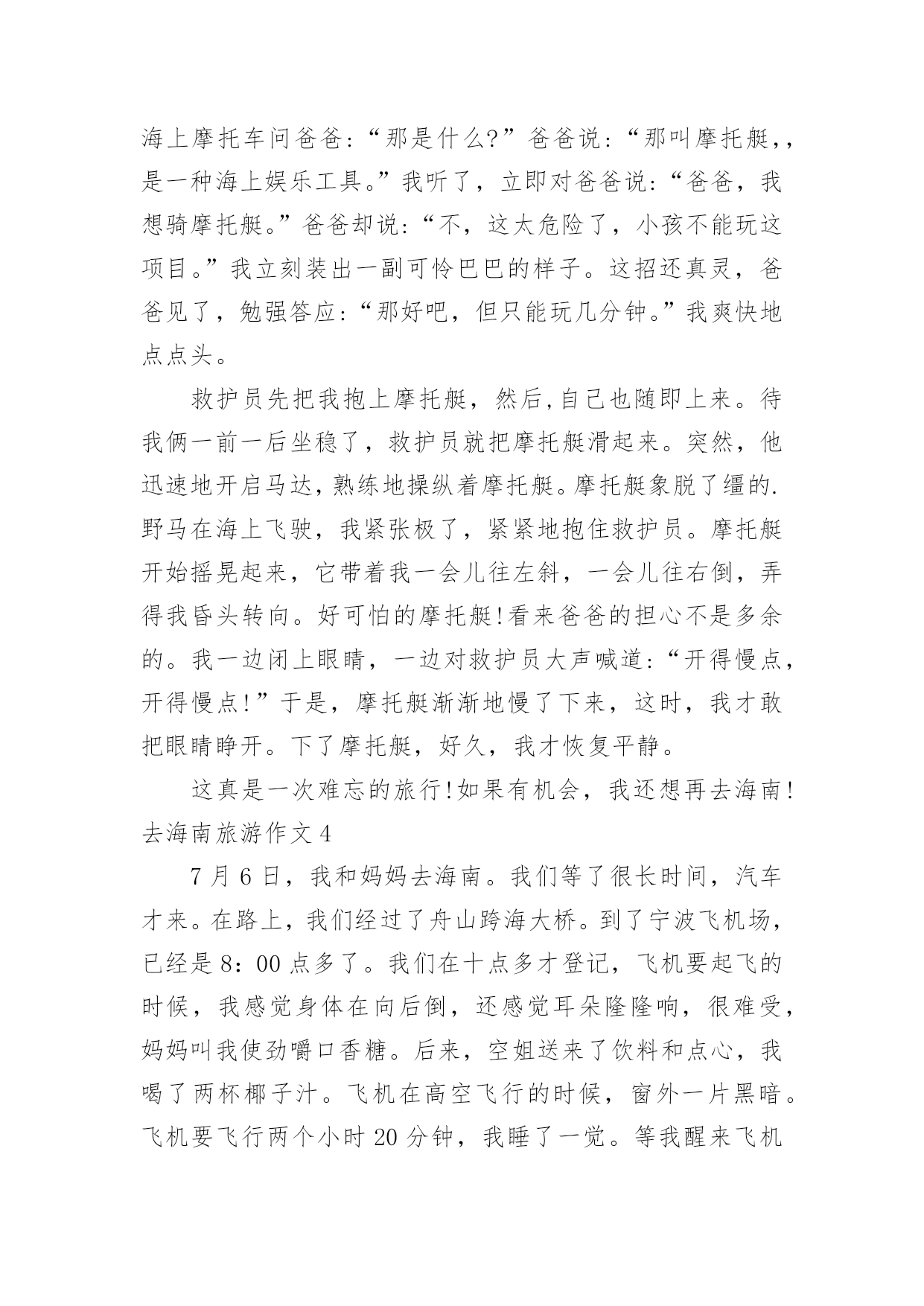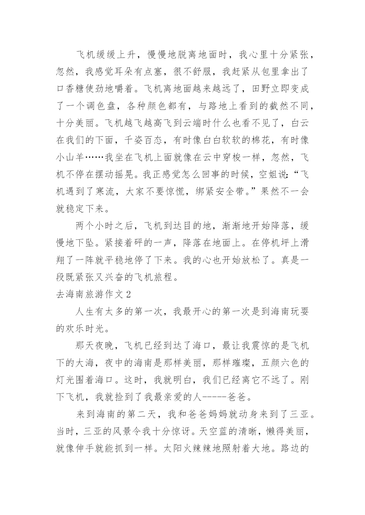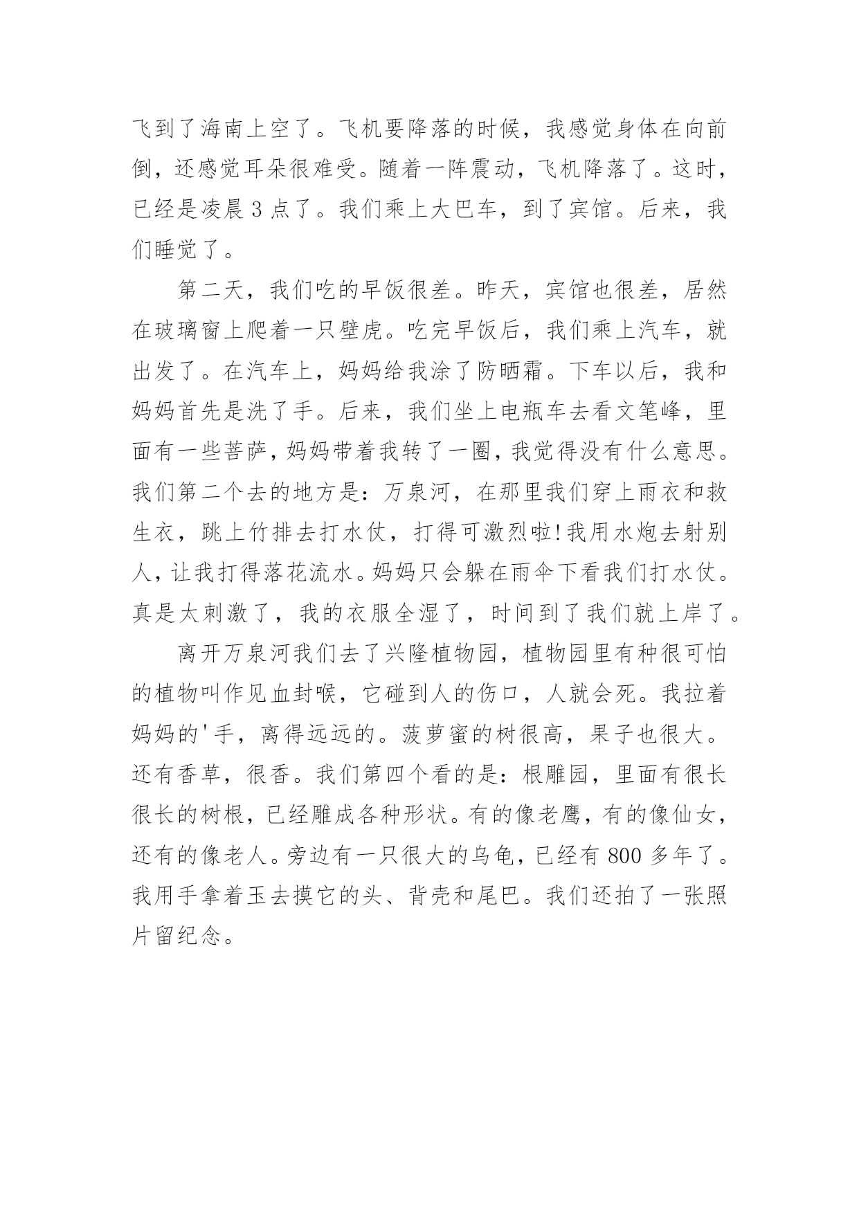 去海南旅游作文去海南旅游作文在日常学习、工作和生活中,大家都经常看到作文的身影吧,作文根据写作时限的不同可以分为限时作文和非限时作文。你知道作文怎样才能写的好吗?下面是小编为大家整理的去海南旅游作文,供大家参考借鉴,希望可以帮助到有需要的朋友。去海南旅游作文1这个暑假,妈妈带我去海南旅游,我终于可以坐飞机了。我对坐飞机十分向往,因为我想在蓝天白云中与小鸟一起飞翔。想看看美丽的天空。我们来到了飞机场,那里人山人海。很多人都在这里飞往全国各地,我们通过安检,排着长龙似的队伍来到了候机室。走过一条长长的过道,透过过道的玻璃窗,我看到了飞机就在我眼前,它是那么的.庞然大物,长长的机身,一对整齐的机翼。两边的螺旋桨不停地转着。我迫不及待地上了飞机,美丽的空姐在迎接我们的到来,飞机里面有些狭窄,没有想像中的那么宽大。我东瞧瞧,西看看,对里面的一切设备都很新奇。很兴奋在过道上和小朋友走来走去。过了一会儿,飞机上响起了广播:“飞机即将起飞,请大家坐好座位。系好安全带……”我赶紧坐好,系好安全带,心里十分缴动。飞机缓缓上升,慢慢地脱离地面时,我心里十分紧张,忽然,我感觉耳朵有点塞,很不舒服,我赶紧从包里拿出了口香糖使劲地嚼着。飞机离地面越来越远了,田野立即变成了一个调色盘,各种颜色都有,与路地上看到的截然不同,十分美丽。飞机越飞越高飞到云端时什么也看不见了,白云在我们的下面,千姿百态,有时像白白软软的棉花,有时像小山羊……我坐在飞机上面就像在云中穿梭一样,忽然,飞机不停在摆动摇晃。我正感觉怎么回事的时候,空姐说:“飞机遇到了寒流,大家不要惊慌,绑紧安全带。”果然不一会就稳定下来。两个小时之后,飞机到达目的地,渐渐地开始降落,缓慢地下坠。紧接着砰的一声,降落在地面上。在停机坪上滑翔了一阵就平稳地停了下来。我的心也开始放松了。真是一段既紧张又兴奋的飞机旅程。去海南旅游作文2人生有太多的第一次,我最开心的第一次是到海南玩耍的欢乐时光。那天夜晚,飞机已经到达了海口,最让我震惊的是飞机下的大海,夜中的海南是那样美丽,那样璀璨,五颜六色的灯光围着海口。这时,我就明白,我们已经离它不远了。刚下飞机,我就捡到了我最亲爱的人-----爸爸。来到海南的第二天,我和爸爸妈妈就动身来到了三亚。当时,三亚的风景令我十分惊讶。天空蓝的清晰,懒得美丽,就像伸手就能抓到一样。太阳火辣辣地照射着大地。路边的椰子树整齐的立在土地上,那叶子想花儿一样绽开,金色的阳光照射在叶子上,一闪一闪的,想宝石那样耀眼。中间还有一个个结实而饱满的椰子挂在上面,一阵风吹过,他们就微微淘气地摇晃,像一个个天真活泼的孩子。看见这情景,我唯一能做的就是享受,享受这美丽,享受这纯净。这挥手就能摸到纯净的地方,能有几个?让我最震惊的.是三亚的海。有一次,我和爸爸妈妈来到亚螺湾游水,我非常高兴,飞奔在那被太阳烤的焦黄的沙滩,毫不犹豫地扑进大海里,凉爽的海水冲走我全身的炎热。沉进海里还能看到沉在沙上的海螺,各种各样的,五颜六色的。那么精致,那么美丽。那天,我用欢笑度过了那一天,如今想想,真怀恋那第一次的快乐。去海南旅游作文3去年暑假,我和爸爸妈妈一起去海南旅游。那里物产丰富、风景优美,但美中不足的是那儿非常热,热得简直让人喘不过气来。那里的阳光特别猛烈,肆无忌惮地照在人身上,没几天,就能把人晒得黑黝黝的。我们先来到海南的三亚湾,映入眼前的是无边无际的大海,蓝天和碧海连在一起,海滩上到处都是游客。男的,女的,老的,少的,都赤着脚在海滩上玩耍。大人们似乎都回到了童年,做沙雕、玩沙滩排球、洒日光浴……尽情地享受生活的乐趣。忽然,我望到一辆浮在海面上的摩托车,我好奇地指着海上摩托车问爸爸:“那是什么?”爸爸说:“那叫摩托艇,,是一种海上娱乐工具。”我听了,立即对爸爸说:“爸爸,我想骑摩托艇。”爸爸却说:“不,这太危险了,小孩不能玩这项目。”我立刻装出一副可怜巴巴的样子。这招还真灵,爸爸见了,勉强答应:“那好吧,但只能玩几分钟。”我爽快地点点头。救护员先把我抱上摩托艇,然后,自己也随即上来。待我俩一前一后坐稳了,救护员就把摩托艇滑起来。突然,他迅速地开启马达,熟练地操纵着摩托艇。摩托艇象脱了缰的.野马在海上飞驶,我紧张极了,紧紧地抱住救护员。摩托艇开始摇晃起来,它带着我一会儿往左斜,一会儿往右倒,弄得我昏头转向。好可怕的摩托艇!看来爸爸的担心不是多余的。我一边闭上眼睛,一边对救护员大声喊道:“开得慢点,开得慢点!”于是,摩托艇渐渐地慢了下来,这时,我才敢把眼睛睁开。下了摩托艇,好久,我才恢复平静。这真是一次难忘的旅行!如果有机会,我还想再去海南!去海南旅游作文47月6日,我和妈妈去海南。我们等了很长时间,汽车才来。在路上,我们经过了舟山跨海大桥。到了宁波飞机场,已经是8:00点多了。我们在十点多才登记,飞机要起飞的时