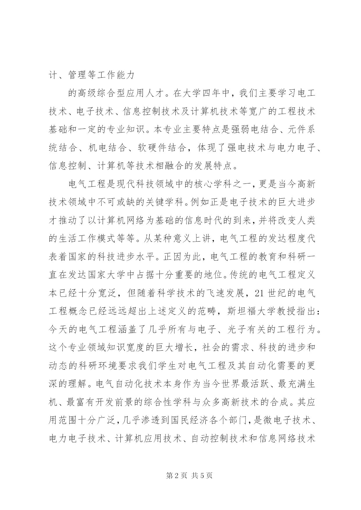 第PAGE\*Arabic\*MERGEFORMAT5页共NUMPAGES\*MERGEFORMAT5页机械专业导论心得通过对专业导论的学习,对于专业概论这门课程我有了一些的了解.电气工程及其自动化专业是电气信息领域的一门新兴学科,但由于和人们的日常生活以及工业生产密切相关,发展非常迅速,现在也相对比较成熟。已经成为高新技术产业的重要组成部分,广泛应用于工业、农业、国防等领域,在国民经济中发挥着越来越重要的作用。控制理论和电力网理论是电气工程及自动化专业的基础,电力电子技术、计算机技术则为其主要技术手段,同时也包含了系统分析、系统设计、系统开发以及系统管理与决策等研究领域。电气工程及其自动化专业属于电气工程学科。本专业主要特点是强弱电结合、机电结合、软件与硬件相结合,具有交叉学科的性质,电力、电子、控制、计算机多学科综合,使我们具有较强的适应能力,是用途比较广泛的专业。这个专业培养具有工程技术基础知识和相应的电气工程专业知识,受过电工电子,系统控制及计算机技术方面的基本训练,具有解决电气工程技术分析与控制问题能力的高级工程技术人才。这个专业的学生主要学习电工技术、电子技术、自动控制理论、信息处理、计算机技术与应用等较宽广领域的工程技术基础和一定的专业知识。具有工业过程控制与分析,解决强弱电并举的宽口径专业的技术问题的能力。这专业旨在培养适应社会主义市场经济和电气工程领域的需要、具有从事电气工程领域规划、研究、开发、设计、管理等工作能力的高级综合型应用人才。在大学四年中,我们主要学习电工技术、电子技术、信息控制技术及计算机技术等宽广的工程技术基础和一定的专业知识。本专业主要特点是强弱电结合、元件系统结合、机电结合、软硬件结合,体现了强电技术与电力电子、信息控制、计算机等技术相融合的发展特点。电气工程是现代科技领域中的核心学科之一,更是当今高新技术领域中不可或缺的关键学科。例如正是电子技术的巨大进步才推动了以计算机网络为基础的信息时代的到来,并将改变人类的生活工作模式等等。从某种意义上讲,电气工程的发达程度代表着国家的科技进步水平。正因为此,电气工程的教育和科研一直在发达国家大学中占据十分重要的地位。传统的电气工程定义本已经十分宽泛,但随着科学技术的飞速发展,21世纪的电气工程概念已经远远超出上述定义的范畴,斯坦福大学教授指出:今天的电气工程涵盖了几乎所有与电子、光子有关的工程行为。这个专业领域知识宽度的巨大增长,社会的需求、科技的进步和动态的科研环境要求我们学生对电气工程及其自动化需要的更深的理解。电气自动化技术本身作为当今世界最活跃、最充满生机、最富有开发前景的综合性学科与众多高新技术的合成。其应用范围十分广泛,几乎渗透到国民经济各个部门,是微电子技术、电力电子技术、计算机应用技术、自动控制技术和信息网络技术等各高新设计集成。同时电气工程对于我国经济的发展也有着至关重要的作用,随着时代的进步,世界开始进入新技术革命时代。在利用信息的过程中,首先要解决的就是要获取准确可靠的信息,现代工业生产过程中,要用各种自动化设备来监视和控制整个生产过程,使各个设备能够在工作过程中呈现出最佳状态,生产出最好的产品。因此,没有电气自动化的发展,现代化生产也就失去了根基。伴随着我国工业化的到来,信息化时代已经先一步到达,如果我们没有实现工业化,那信息化就更不可能完成,因为信息和工业化有着密不可分的关系。当然,也又不可能先把工业化发展的很好再去发展信息化,这样做只会使我们的发展速度变的更慢。所以,工业自动化就是将信息化和工业化一起发展。大力发展工业电气自动化技术,既可以对传统产业其当帮助,又可以加快信息化的发展,以实现我国电气的全面工业化。因此,电气工业自动化作为我国实现工业化和信息化的大政方针,必须成为我国行业的重中之重。目前,我国已经基本实现了工业的机械化,工业的电气化应该着重实现的是自动化,我国的传统产业应当靠工业自动化技术武装,能够利用工艺流程自动化手段控制设备,从而使我国的工业化自动化建设得以实现。当然,因为信息化和管理自动化的基础都是计算机、软件、网络和信息技术,所以他们的核心技术是相同的,所以发展工业自动化技术可以促进电气工业化的实现,也可以带动信息化的发展。在通常情况下,工业自动化涉及到的高技术主要是计算机、软件以及信息技术。随着互联网技术和信息技术的飞速发展,这一项新的高科技技术必将进一步促进企业管理的改革,更加促进我国电气自动化的发展。在我国,如何将工业电气自动化发展的更好是今后要做的首要问题。一个成功的自动化系统离不开通用的网络结构对于。任何企业的网络结构对于设备控制、监督系统、企业管理系统之间的数据通讯畅通无阻必须予以保证。数据添加和整理工作结束后,要对中心管理机和其他通讯管理机进行网络通讯配置,以