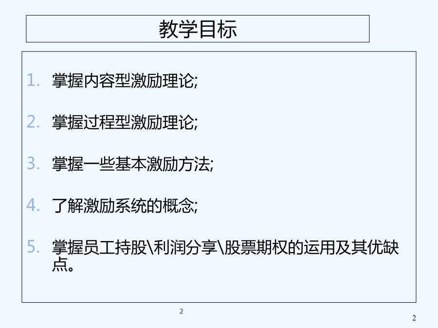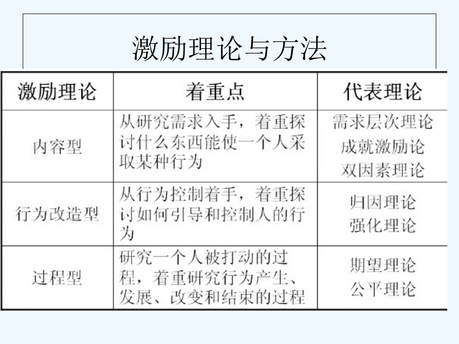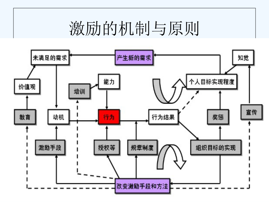 第五章激励理论教学目标[案例]激励的概念激励的意义激励的机制与原则大家应该也有点累了,稍作休息激励的基本原则激励理论与方法案例:使用抽彩法降低缺勤率问题马蝇效应骨干员工为什么要走?第一节内容型激励理论16马斯洛五种基本需要表5-2对美国工人优先需要变化的估计“骨干员工为什么要走”之分析提示请同学们回答下列问题22赫茨伯格的双因素论二、赫茨伯格的双因素论案例分析双因素理论提倡工作扩大化和丰富化案例分析三、阿尔德佛的ERG理论ERG理论的满足—前进和受挫—倒退分析四、麦克利兰的需要理论1.权力需要2.归属需要3.成就需要新校长说:老师们的辛勤劳动和创造不能成为过眼烟云,教师的劳动不可能像工人那样量化记酬、也不能像农民那样个体承包,要克服干好干坏都一样的弊端,就必须把教师的功绩记录在案,业务档案具有权威性,可以为今后教师晋升、提工资、奖励提供详实客观的依据,也是学校的财富。业务档案只记功不记过。建立业务档案后,出现了教师自发向上,大家比贡献的局面,老教师焕发了青春;想改行的年轻教师当年就发表多篇论文。试用“内容型激励理论”分析、论述以上管理方法之所以产生这样效果的原因。分析第二节过程型激励理论案例:其实你不懂我的心问题期望理论一、期望理论(ExpectancyTheory)一、期望理论(ExpectancyTheory)对应的三种关系管理者相应的手段:组织对应的措施心理契约案例分析:固定工资与佣金制固定工资与佣金制二、公平理论投入与报酬的比较比较的对象比较的结果自己P结果O投入I应对不公平的行为案例分析分享(二)程序公平(三)互动公平案例分析三、目标设置理论四、波特和劳勒的激励过程模型五、强化理论员工强化激励方法及其效果分析第三节激励理论的应用中国企业的“”与激励体制一、激励的多样化(二)激励方法的多样化美国同仁公司的“”美国IBM公司的“”二、年薪制三、员工持股计划员工持股计划的具体作用讨论四、股票期权制(二)国有企业经营管理者股票期权制我国股票期权激励的两种形式股票期权制改革障碍股票期权制:例1
