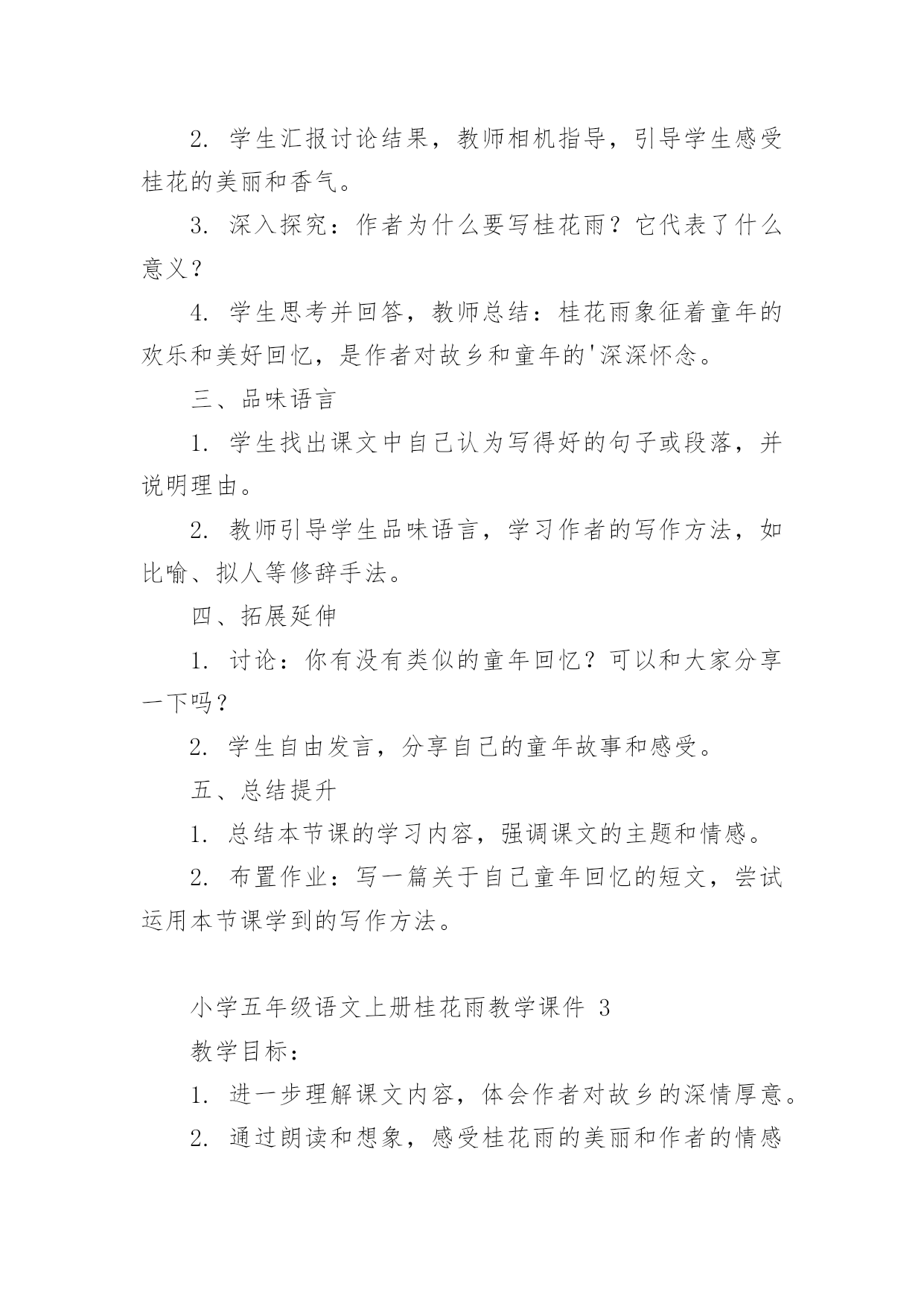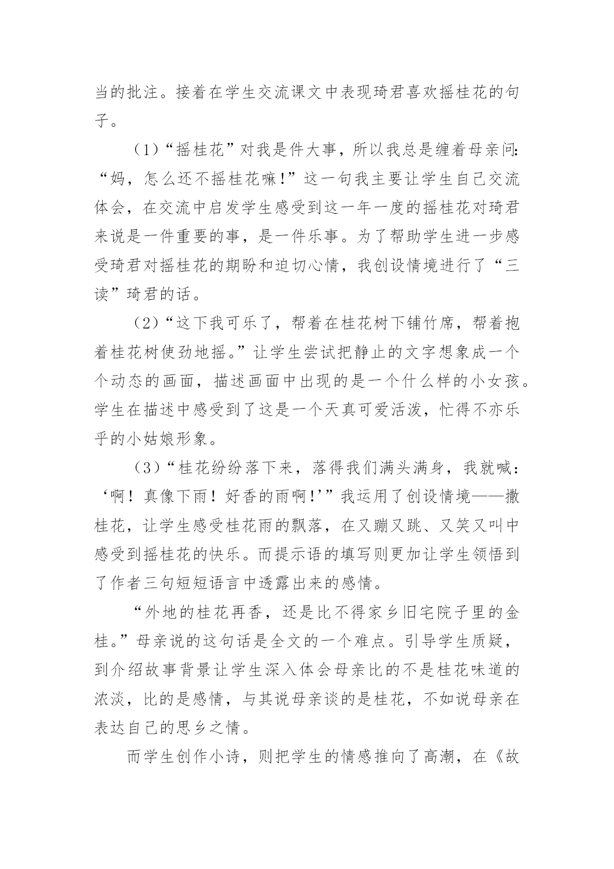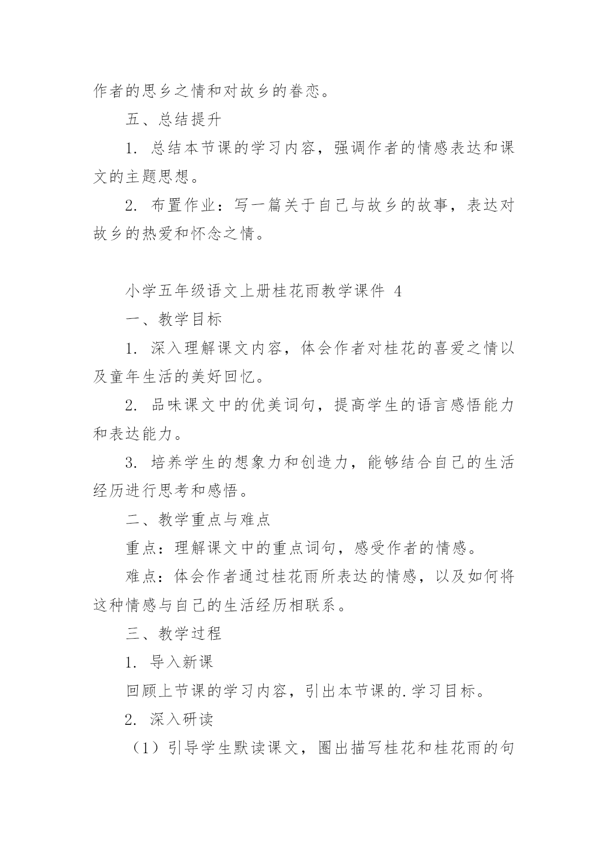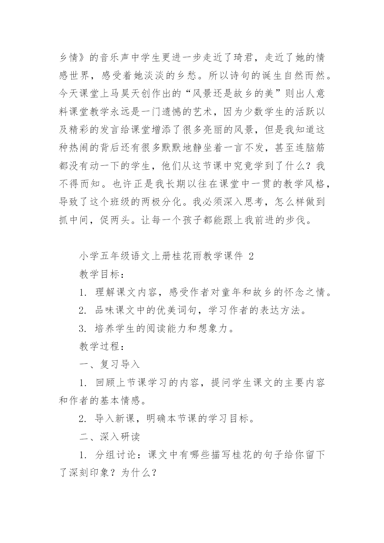 小学五年级语文上册桂花雨教学课件《桂花雨》课文记叙了作者童年时候与母亲一起摇桂花的事情,抒发了作者怀念故乡,怀念故乡的桂花树的事情。下面是小编帮大家整理的小学五年级语文上册桂花雨教学课件,希望大家喜欢。小学五年级语文上册桂花雨教学课件1教学目标:1.读,发挥想象力,描述文中的情景。2.理解“这里的桂花再香,也比不上家乡院子里的桂花。”一句话的意思。3.体会作者表达的浓浓思乡之情。教学过程:一、激趣导入1.导语:童年是美好的,那一幕幕童年往事会给人以永久的回忆。这节课,我们就来学习一篇回忆童年生活的。(板书课题)2.齐读课题。3.教师:读了课题,你有问题要问吗?(学生自由提出疑问)二、初读课文,感知内容1.学生选择自己喜欢的方式读课文,想怎么读就怎么读,把课文读正确、读通顺。2.读书交流。(l)请学生选读感兴趣的段落。(2)说说课文主要写了一件什么事?(3)提出自己不懂的问题,在小组内与同学交流、讨论。三、细读课文,探究解疑引导学生重点探究以下问题。1.“我”为什么喜欢桂花?①从文中找出“我”喜欢桂花的句子读一读,说说“我”为什么喜欢桂花。②有感情地朗读这些句子,在读中理解,读中感悟。2.重点理解摇花时的乐趣。(l)为什么说摇花对“我”来说是件大事?(理解“总是”)(2)画出“我”摇桂花的句子。①理解“这下,我可乐了,帮大人抱着桂花树,使劲地摇”。②想象“桂花纷纷落下来,我们满头满身都是桂花。”的情景。③为什么说桂花纷纷落下来的情景“真像下雨”,而且是“好香的雨”?④点击,电视屏幕上出现“我”帮母亲摇桂花时的情景,使学生也感受其中的乐趣。(3)指导感情朗读。3.理解“于是,我也想起了在故乡童年时代的‘摇花乐’,还有那摇落的阵阵桂花雨”。这句表达了作者怎样的思想感情。四、课堂总结1.课文通过回忆小时候摇桂花时的有趣情景,表达了作者对童年往事的无比怀念以及对家乡的热爱之情。2.指名有感情地朗读全文。五、拓展延伸回忆一下自己的童年生活,有没有不能忘怀的人和事?如果有,说给大家听听。《桂花雨》教学反思《桂花雨》我国著名女作家琦君写的,语言文字尤其的美。初捧这篇文章,我只是被优美的语言文字所打动,如同沐浴在一场香香的桂花雨中。当我再深入地去读,去了解琦君时,我却在那迷人的.香气中,感受到了琦君那如桂花雨般的思乡之情。但是这种乡情难忘、童年难忘的情怀,却不是简简单单、大大略略地就可以感受到的,需要仔细地从字里行间细品方见。那么在我的课堂中,我如何让学生也能有这样的体会呢?反复参考了很多名师的教学设计,结合着本班学生实际,我对教材进行了一些处理。“摇桂花”这一段是教学的重点。这部分教学我注意了读中感悟,引导学生深入地体会了“摇桂花”时的快乐心情。我给了充足的时间让学生进行自主学习:圈画出你认为琦君喜欢摇桂花的句子,并在给你感受最深的词语旁边做一些适当的批注。接着在学生交流课文中表现琦君喜欢摇桂花的句子。(1)“摇桂花”对我是件大事,所以我总是缠着母亲问:“妈,怎么还不摇桂花嘛!”这一句我主要让学生自己交流体会,在交流中启发学生感受到这一年一度的摇桂花对琦君来说是一件重要的事,是一件乐事。为了帮助学生进一步感受琦君对摇桂花的期盼和迫切心情,我创设情境进行了“三读”琦君的话。(2)“这下我可乐了,帮着在桂花树下铺竹席,帮着抱着桂花树使劲地摇。”让学生尝试把静止的文字想象成一个个动态的画面,描述画面中出现的是一个什么样的小女孩。学生在描述中感受到了这是一个天真可爱活泼,忙得不亦乐乎的小姑娘形象。(3)“桂花纷纷落下来,落得我们满头满身,我就喊:‘啊!真像下雨!好香的雨啊!’”我运用了创设情境——撒桂花,让学生感受桂花雨的飘落,在又蹦又跳、又笑又叫中感受到摇桂花的快乐。而提示语的填写则更加让学生领悟到了作者三句短短语言中透露出来的感情。“外地的桂花再香,还是比不得家乡旧宅院子里的金桂。”母亲说的这句话是全文的一个难点。引导学生质疑,到介绍故事背景让学生深入体会母亲比的不是桂花味道的浓淡,比的是感情,与其说母亲谈的是桂花,不如说母亲在表达自己的思乡之情。而学生创作小诗,则把学生的情感推向了高潮,在《故乡情》的音乐声中学生更进一步走近了琦君,走近了她的情感世界,感受着她淡淡的乡愁。所以诗句的诞生自然而然。今天课堂上马昊天创作出的“风景还是故乡的美”则出人意料课堂教学永远是一门遗憾的艺术,因为少数学生的活跃以及精彩的发言给课堂增添了很多亮丽的风景,但是我知道这种热闹的背后还有很多默默地静坐着一言不发,甚至连脑筋都没有动一下的学生,他们从这节课中究竟学到了什么?我不得而知。也许正是我长期以往在课堂中一贯的教学风格,导致了这个班级的两极分化。我必须深入思考,怎么样做到抓中间,促两头。让每一个孩子都能跟上我前进的步伐。小学五年级语文上册桂花雨教学课件2教学目