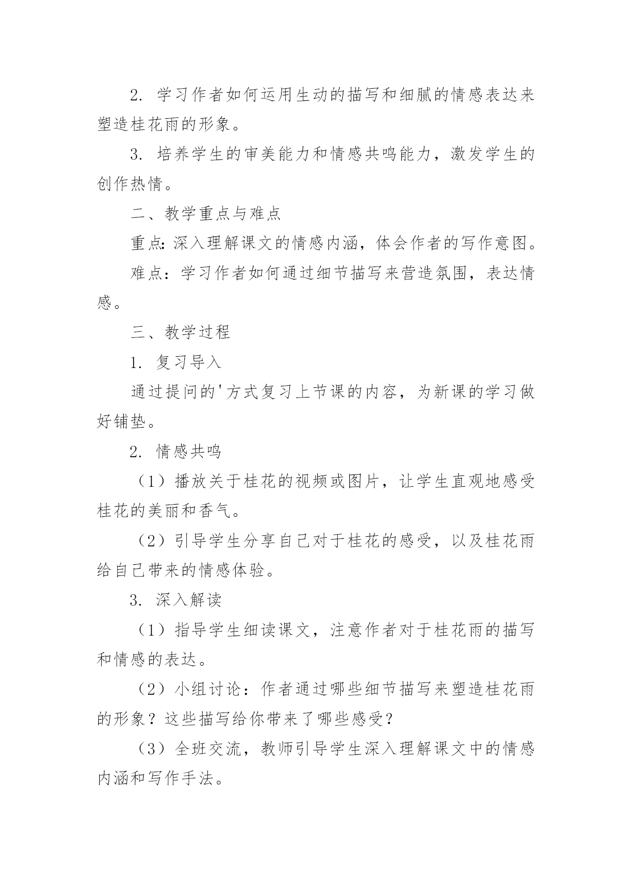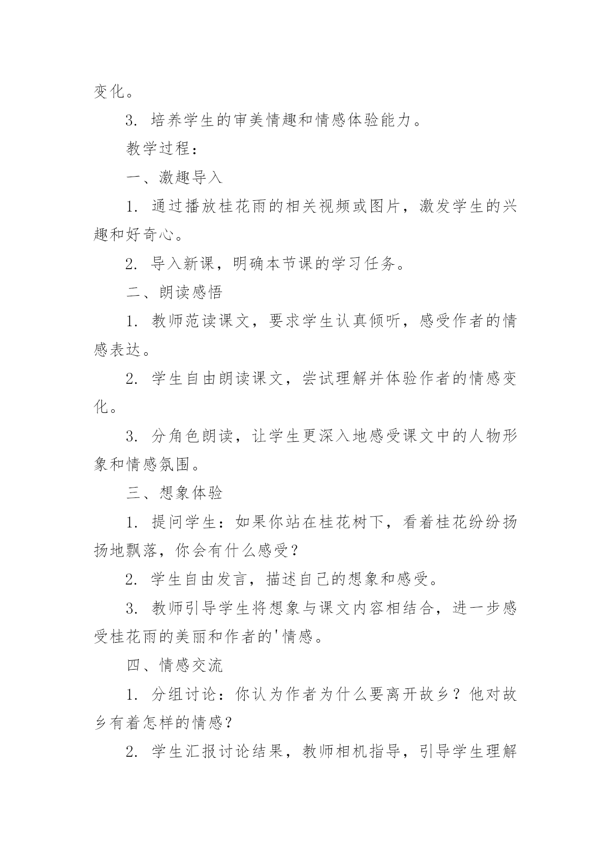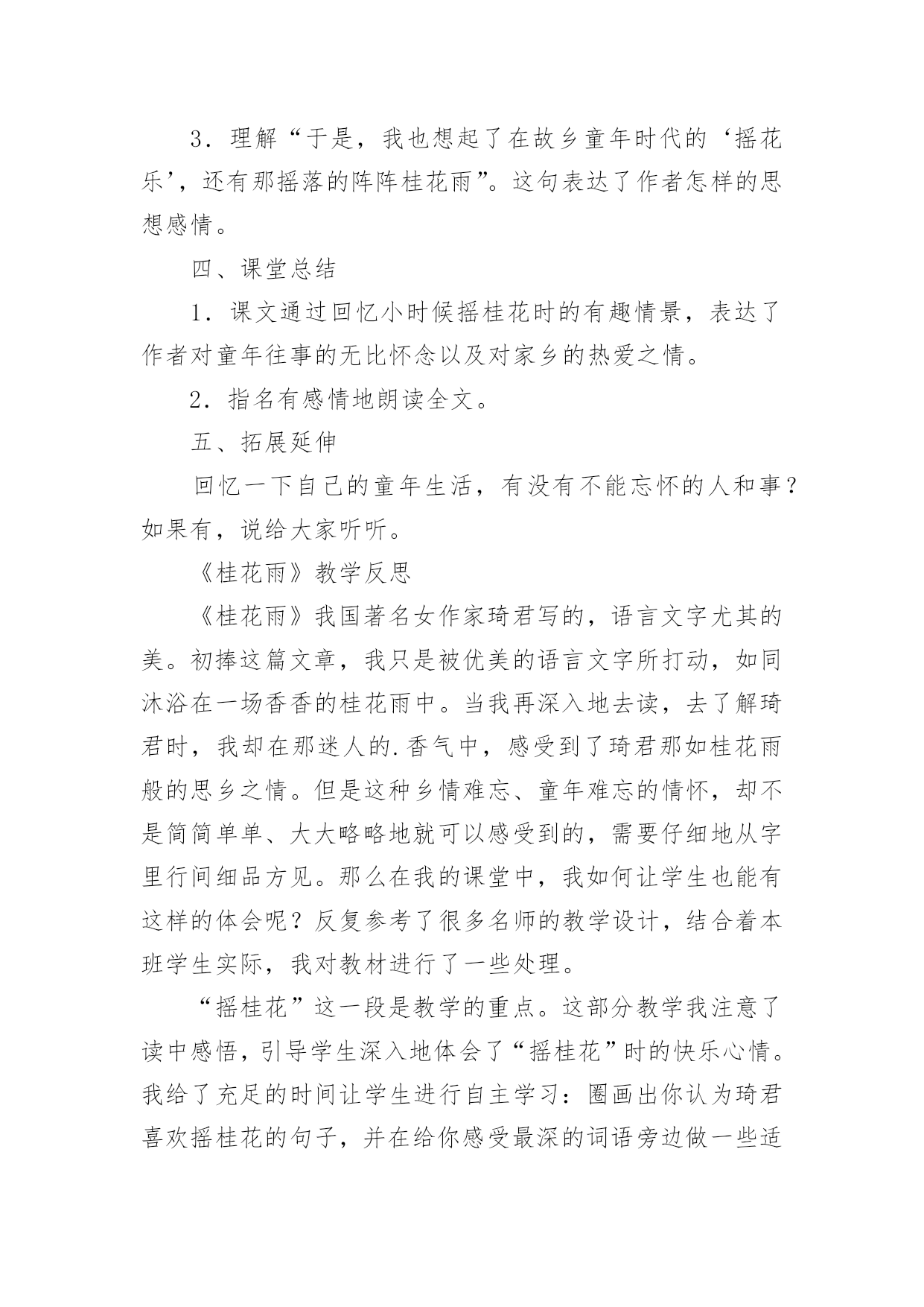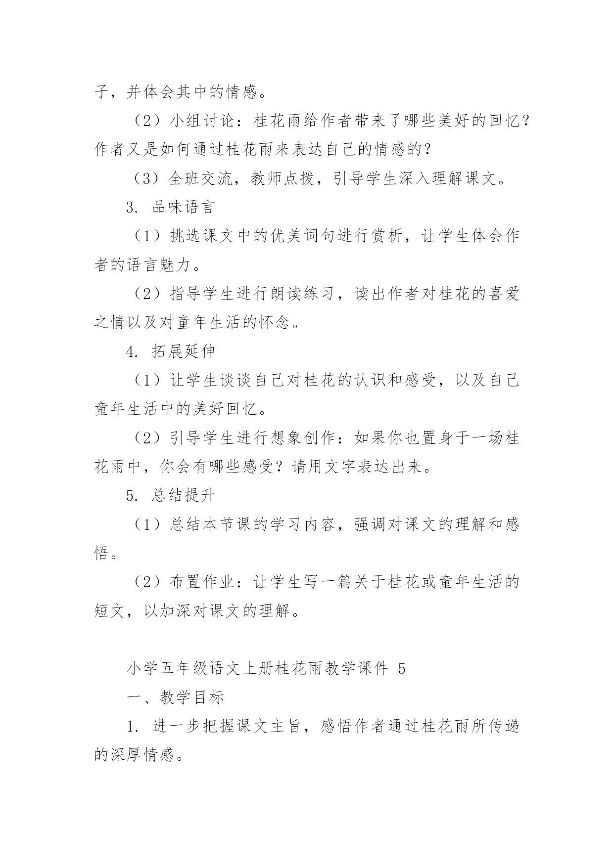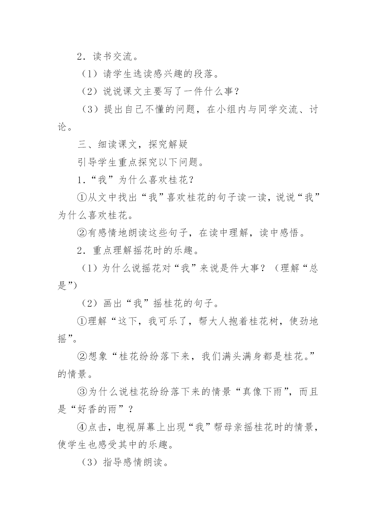 小学五年级语文上册桂花雨教学课件《桂花雨》课文记叙了作者童年时候与母亲一起摇桂花的事情,抒发了作者怀念故乡,怀念故乡的桂花树的事情。下面是小编帮大家整理的小学五年级语文上册桂花雨教学课件,希望大家喜欢。小学五年级语文上册桂花雨教学课件1教学目标:1.读,发挥想象力,描述文中的情景。2.理解“这里的桂花再香,也比不上家乡院子里的桂花。”一句话的意思。3.体会作者表达的浓浓思乡之情。教学过程:一、激趣导入1.导语:童年是美好的,那一幕幕童年往事会给人以永久的回忆。这节课,我们就来学习一篇回忆童年生活的。(板书课题)2.齐读课题。3.教师:读了课题,你有问题要问吗?(学生自由提出疑问)二、初读课文,感知内容1.学生选择自己喜欢的方式读课文,想怎么读就怎么读,把课文读正确、读通顺。2.读书交流。(l)请学生选读感兴趣的段落。(2)说说课文主要写了一件什么事?(3)提出自己不懂的问题,在小组内与同学交流、讨论。三、细读课文,探究解疑引导学生重点探究以下问题。1.“我”为什么喜欢桂花?①从文中找出“我”喜欢桂花的句子读一读,说说“我”为什么喜欢桂花。②有感情地朗读这些句子,在读中理解,读中感悟。2.重点理解摇花时的乐趣。(l)为什么说摇花对“我”来说是件大事?(理解“总是”)(2)画出“我”摇桂花的句子。①理解“这下,我可乐了,帮大人抱着桂花树,使劲地摇”。②想象“桂花纷纷落下来,我们满头满身都是桂花。”的情景。③为什么说桂花纷纷落下来的情景“真像下雨”,而且是“好香的雨”?④点击,电视屏幕上出现“我”帮母亲摇桂花时的情景,使学生也感受其中的乐趣。(3)指导感情朗读。3.理解“于是,我也想起了在故乡童年时代的‘摇花乐’,还有那摇落的阵阵桂花雨”。这句表达了作者怎样的思想感情。四、课堂总结1.课文通过回忆小时候摇桂花时的有趣情景,表达了作者对童年往事的无比怀念以及对家乡的热爱之情。2.指名有感情地朗读全文。五、拓展延伸回忆一下自己的童年生活,有没有不能忘怀的人和事?如果有,说给大家听听。《桂花雨》教学反思《桂花雨》我国著名女作家琦君写的,语言文字尤其的美。初捧这篇文章,我只是被优美的语言文字所打动,如同沐浴在一场香香的桂花雨中。当我再深入地去读,去了解琦君时,我却在那迷人的.香气中,感受到了琦君那如桂花雨般的思乡之情。但是这种乡情难忘、童年难忘的情怀,却不是简简单单、大大略略地就可以感受到的,需要仔细地从字里行间细品方见。那么在我的课堂中,我如何让学生也能有这样的体会呢?反复参考了很多名师的教学设计,结合着本班学生实际,我对教材进行了一些处理。“摇桂花”这一段是教学的重点。这部分教学我注意了读中感悟,引导学生深入地体会了“摇桂花”时的快乐心情。我给了充足的时间让学生进行自主学习:圈画出你认为琦君喜欢摇桂花的句子,并在给你感受最深的词语旁边做一些适当的批注。接着在学生交流课文中表现琦君喜欢摇桂花的句子。(1)“摇桂花”对我是件大事,所以我总是缠着母亲问:“妈,怎么还不摇桂花嘛!”这一句我主要让学生自己交流体会,在交流中启发学生感受到这一年一度的摇桂花对琦君来说是一件重要的事,是一件乐事。为了帮助学生进一步感受琦君对摇桂花的期盼和迫切心情,我创设情境进行了“三读”琦君的话。(2)“这下我可乐了,帮着在桂花树下铺竹席,帮着抱着桂花树使劲地摇。”让学生尝试把静止的文字想象成一个个动态的画面,描述画面中出现的是一个什么样的小女孩。学生在描述中感受到了这是一个天真可爱活泼,忙得不亦乐乎的小姑娘形象。(3)“桂花纷纷落下来,落得我们满头满身,我就喊:‘啊!真像下雨!好香的雨啊!’”我运用了创设情境——撒桂花,让学生感受桂花雨的飘落,在又蹦又跳、又笑又叫中感受到摇桂花的快乐。而提示语的填写则更加让学生领悟到了作者三句短短语言中透露出来的感情。“外地的桂花再香,还是比不得家乡旧宅院子里的金桂。”母亲说的这句话是全文的一个难点。引导学生质疑,到介绍故事背景让学生深入体会母亲比的不是桂花味道的浓淡,比的是感情,与其说母亲谈的是桂花,不如说母亲在表达自己的思乡之情。而学生创作小诗,则把学生的情感推向了高潮,在《故乡情》的音乐声中学生更进一步走近了琦君,走近了她的情感世界,感受着她淡淡的乡愁。所以诗句的诞生自然而然。今天课堂上马昊天创作出的“风景还是故乡的美”则出人意料课堂教学永远是一门遗憾的艺术,因为少数学生的活跃以及精彩的发言给课堂增添了很多亮丽的风景,但是我知道这种热闹的背后还有很多默默地静坐着一言不发,甚至连脑筋都没有动一下的学生,他们从这节课中究竟学到了什么?我不得而知。也许正是我长期以往在课堂中一贯的教学风格,导致了这个班级的两极分化。我必须深入思考,怎么样做到抓中间,促两头。让每一个孩子都能跟上我前进的步伐。小学五年级语文上册桂花雨教学课件2教学目
