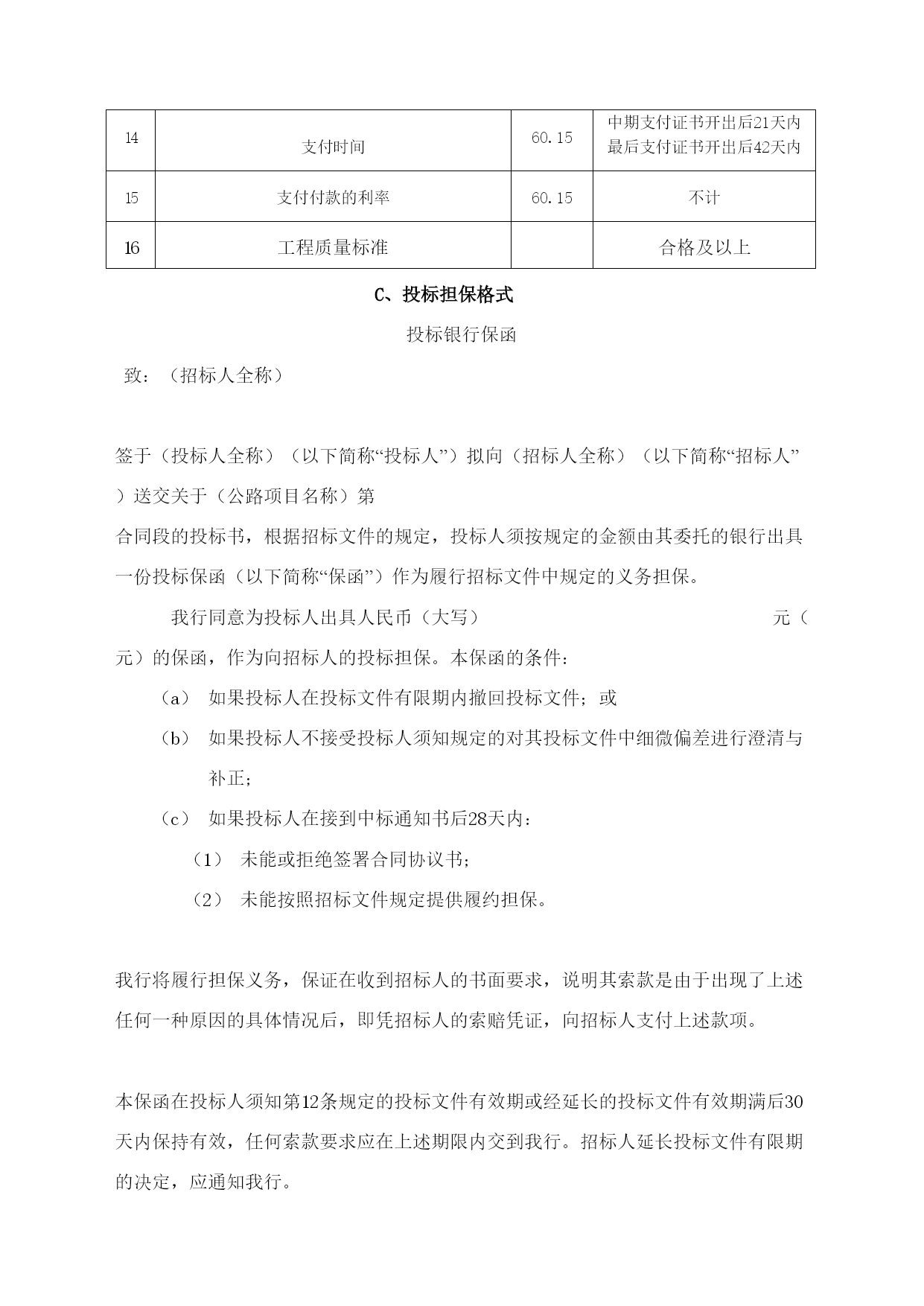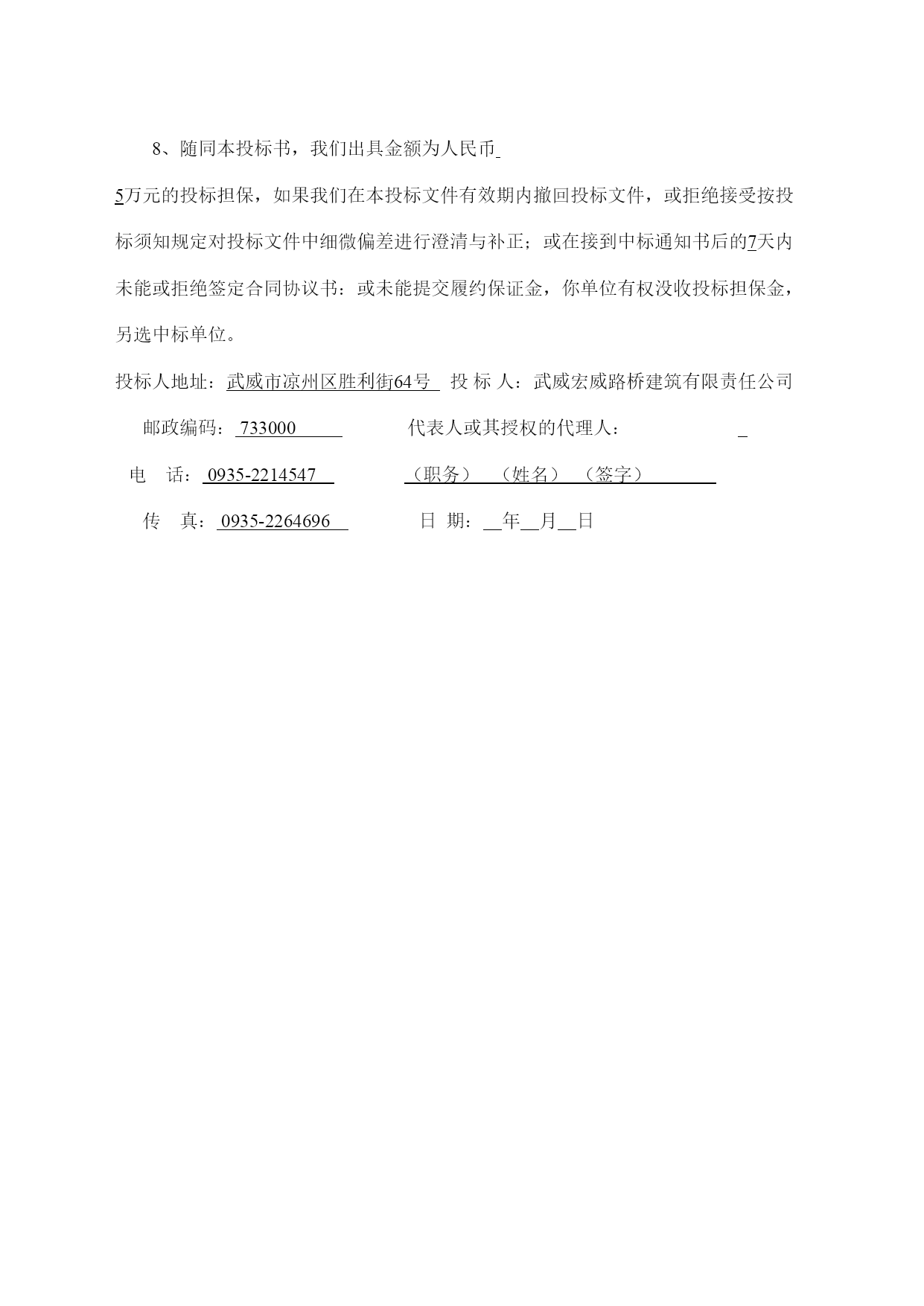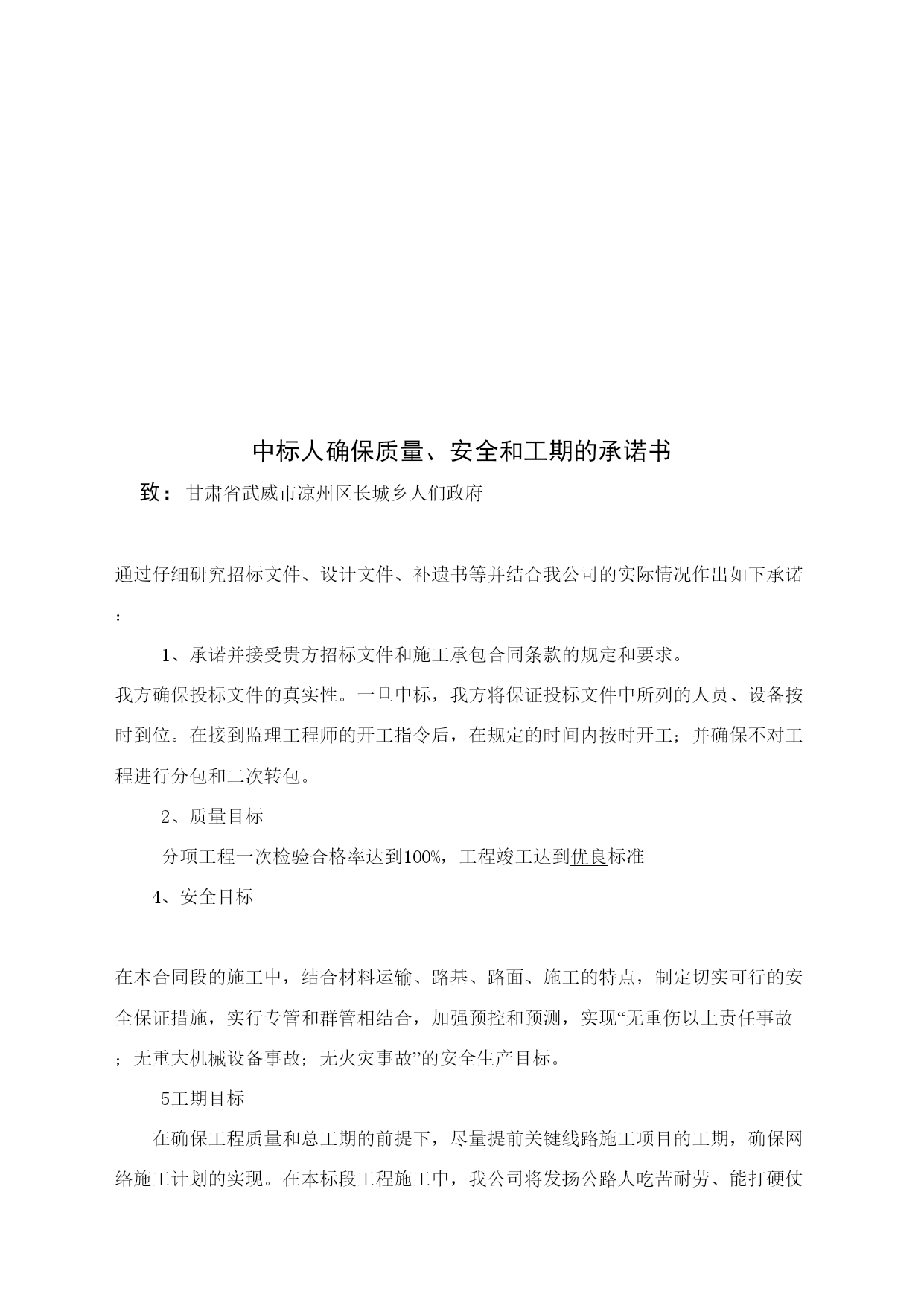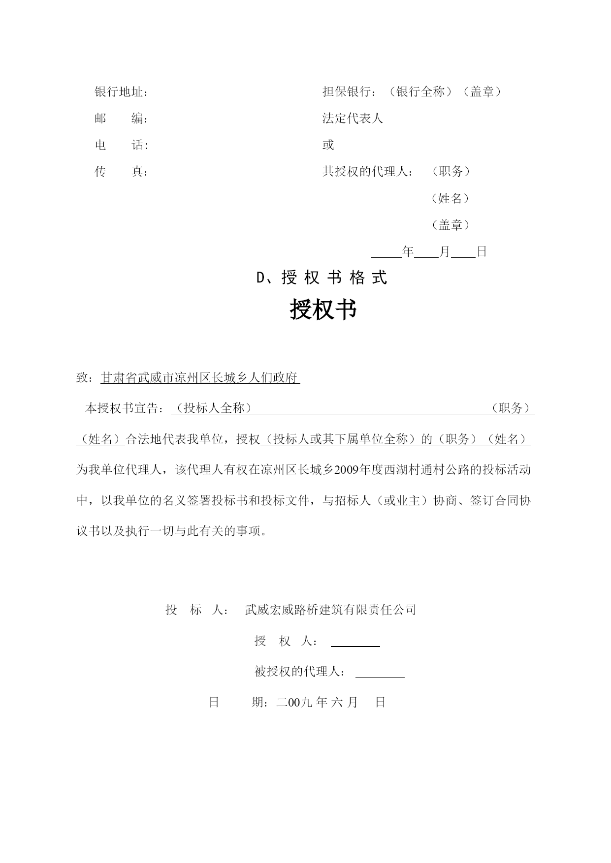 A.投标书格式武威市凉州区长城乡2009度西湖村通村公路建设工程项目投标书致:甘肃省武威市凉州区长城乡人们政府1.在研究上述项目的招标文件(含补遗书)和考察了工程现场后,我们愿意按人民币(大写)元(¥元)的投标总价,遵照招标文件的要求承担本合同工程的实施、完成及其缺陷修复工作。2.本合同段全长5.3公里。3.如果你单位接受我们的投标,我们将保证在接到监理工程师的开工通知书后,在本投标书附录内写明的开工期内开工,并在四个月的工期内完成本合同工程,达到合同规定的要求,该工期从本投标书附录内写明的开工期的最后一天算起。4.如果你单位接受我们的投标,我们将保证按照你单位认可的条件,以本投标书内写明的时间和金额提交履约担保。5.我们同意在从规定的开标之日起60天的投标文件有效期内严格遵守本投标书的各项承诺。在此期限届满之前,本投标书始终将对我方具有约束力,并随时接受中标。6.在合同协议书正式签署之前,本投标书连同你单位的中标通知书将构成我们双方之间共同遵守的文件,对双方具有约束力。7.我们理解,你单位不一定接受最低标价的投标或你单位接到的其他任何投标。同时也理解,你单位不负担我们任何投标费用。8、随同本投标书,我们出具金额为人民币5万元的投标担保,如果我们在本投标文件有效期内撤回投标文件,或拒绝接受按投标须知规定对投标文件中细微偏差进行澄清与补正;或在接到中标通知书后的7天内未能或拒绝签定合同协议书:或未能提交履约保证金,你单位有权没收投标担保金,另选中标单位。投标人地址:武威市凉州区胜利街64号投标人:武威宏威路桥建筑有限责任公司邮政编码:733000代表人或其授权的代理人:电话:0935-2214547(职务)(姓名)(签字)传真:0935-2264696日期:年月日B、投标书附录序号事项合同条款数据1投标担保金额――5万元2履约担保金额10.1合同价的10%(含暂定金额3发开工令期限(监理工程师接到开工报告之日算起)41.13天之内4开工期(接到监理工程师的开工令之日算起)41.1接到监理工程师的开工令之日起5工期43.1120天6托期损失偿金47.15000元/天7托期损失赔偿金限额47.1合同价格的10%8缺陷责任期49.124个月9中期(月进度)支付证书最低限额60.210保留金的百分比60.3月支付额的10%11保留金限额60.3最终合同价格的5%12开工预付款60.50%13材料预付款60.70%14支付时间60.15中期支付证书开出后21天内最后支付证书开出后42天内15支付付款的利率60.15不计16工程质量标准合格及以上C、投标担保格式投标银行保函致:(招标人全称)签于(投标人全称)(以下简称“投标人”)拟向(招标人全称)(以下简称“招标人”)送交关于(公路项目名称)第合同段的投标书,根据招标文件的规定,投标人须按规定的金额由其委托的银行出具一份投标保函(以下简称“保函”)作为履行招标文件中规定的义务担保。我行同意为投标人出具人民币(大写)元(元)的保函,作为向招标人的投标担保。本保函的条件:如果投标人在投标文件有限期内撤回投标文件;或如果投标人不接受投标人须知规定的对其投标文件中细微偏差进行澄清与补正;如果投标人在接到中标通知书后28天内:未能或拒绝签署合同协议书;未能按照招标文件规定提供履约担保。我行将履行担保义务,保证在收到招标人的书面要求,说明其索款是由于出现了上述任何一种原因的具体情况后,即凭招标人的索赔凭证,向招标人支付上述款项。本保函在投标人须知第12条规定的投标文件有效期或经延长的投标文件有效期满后30天内保持有效,任何索款要求应在上述期限内交到我行。招标人延长投标文件有限期的决定,应通知我行。银行地址:担保银行:(银行全称)(盖章)邮编:法定代表人电话:或传真:其授权的代理人:(职务)(姓名)(盖章)年月日D、授权书格式授权书致:甘肃省武威市凉州区长城乡人们政府本授权书宣告:(投标人全称)(职务)(姓名)合法地代表我单位,授权(投标人或其下属单位全称)的(职务)(姓名)为我单位代理人,该代理人有权在凉州区长城乡2009年度西湖村通村公路的投标活动中,以我单位的名义签署投标书和投标文件,与招标人(或业主)协商、签订合同协议书以及执行一切与此有关的事项。投标人:武威宏威路桥建筑有限责任公司授权人:被授权的代理人:日期:二00九年六月日中标人确保质量、安全和工期的承诺书致:甘肃省武威市凉州区长城乡人们政府通过仔细研究招标文件、设计文件、补遗书等并结合我公司的实际情况作出如下承诺:承诺并接受贵方招标文件和施工承包合同条款的规定和要求。我
