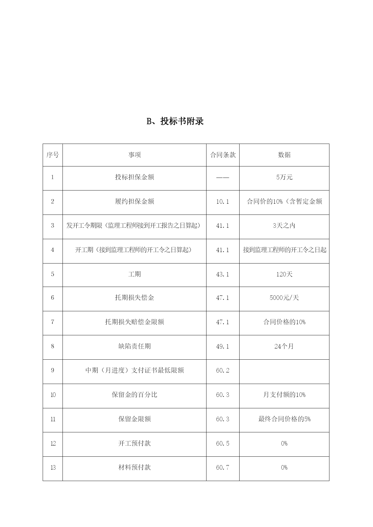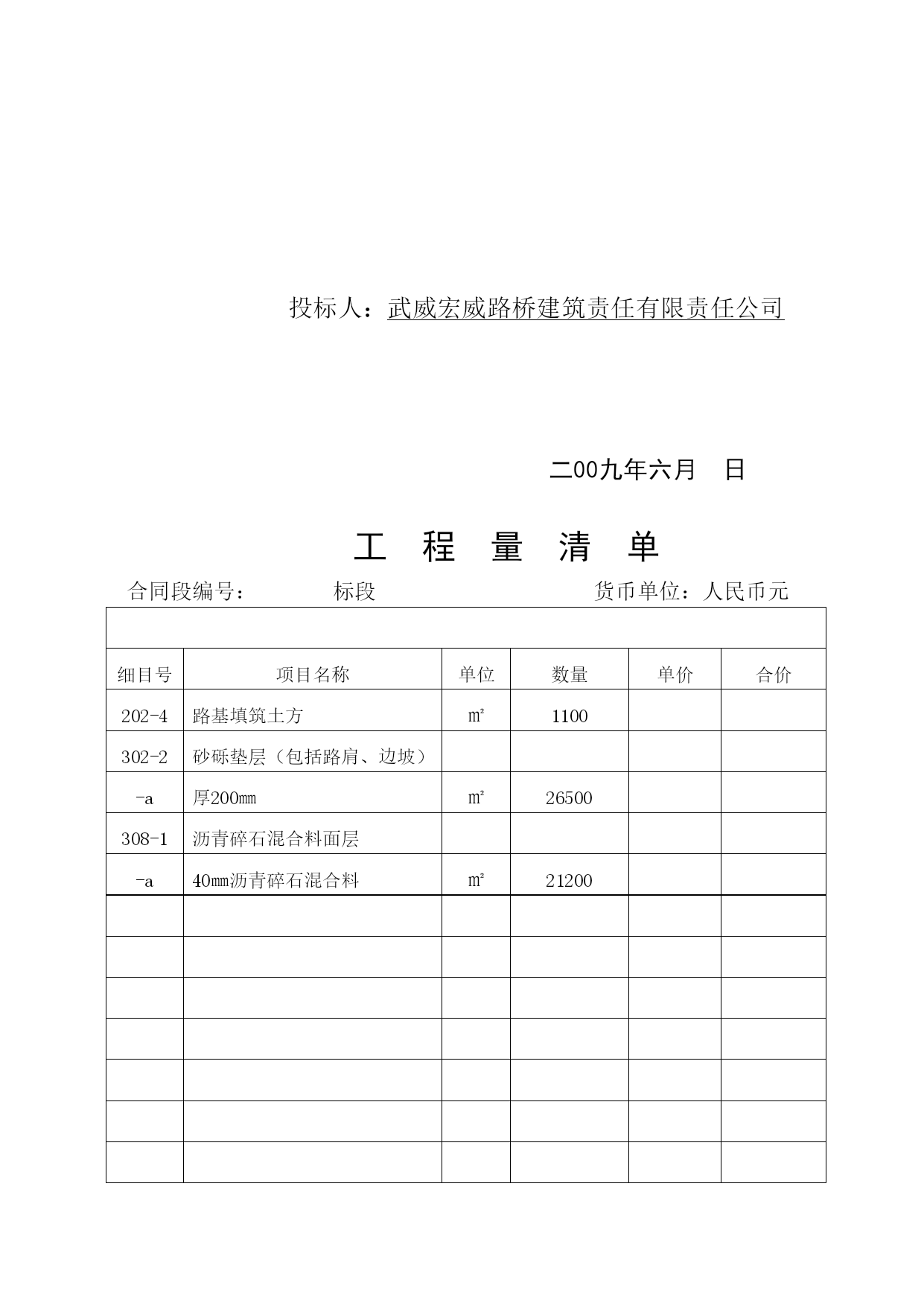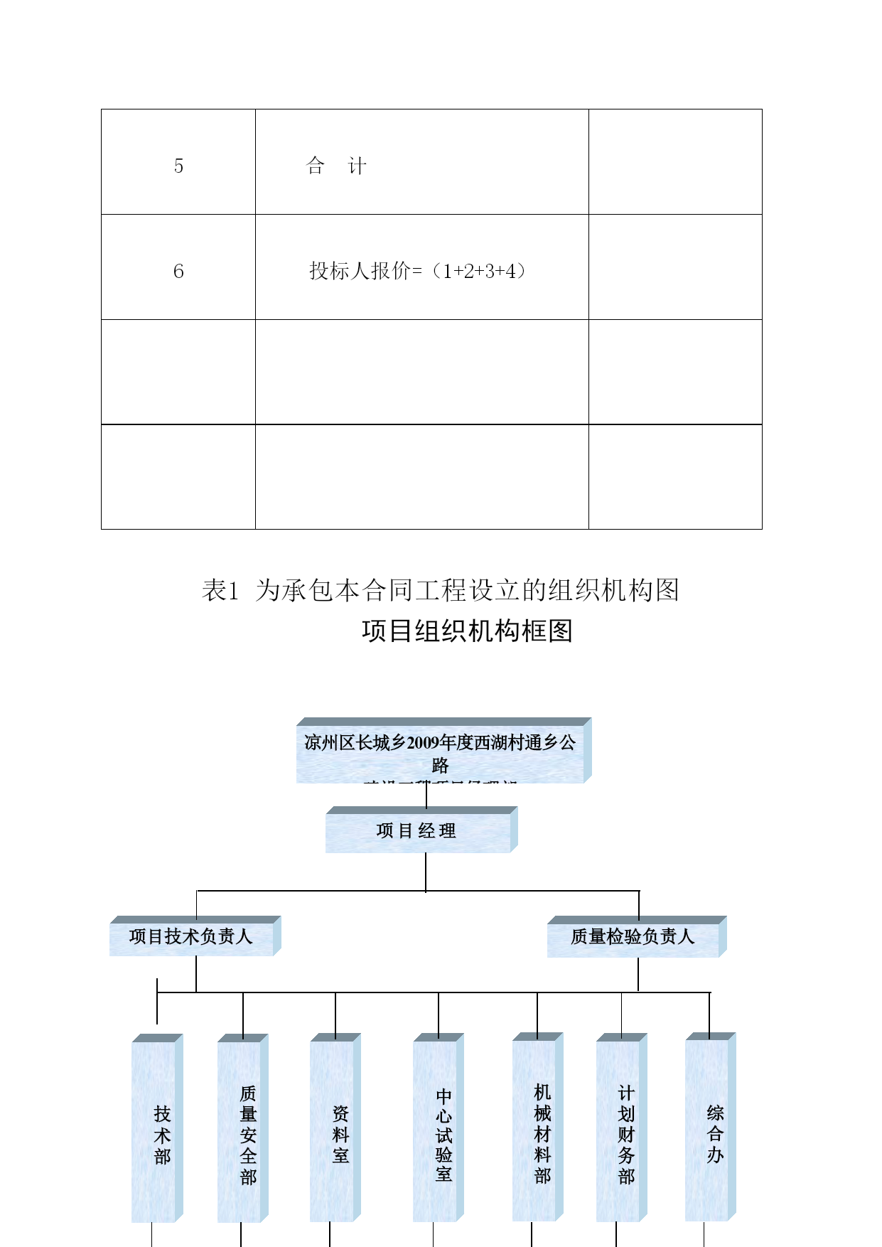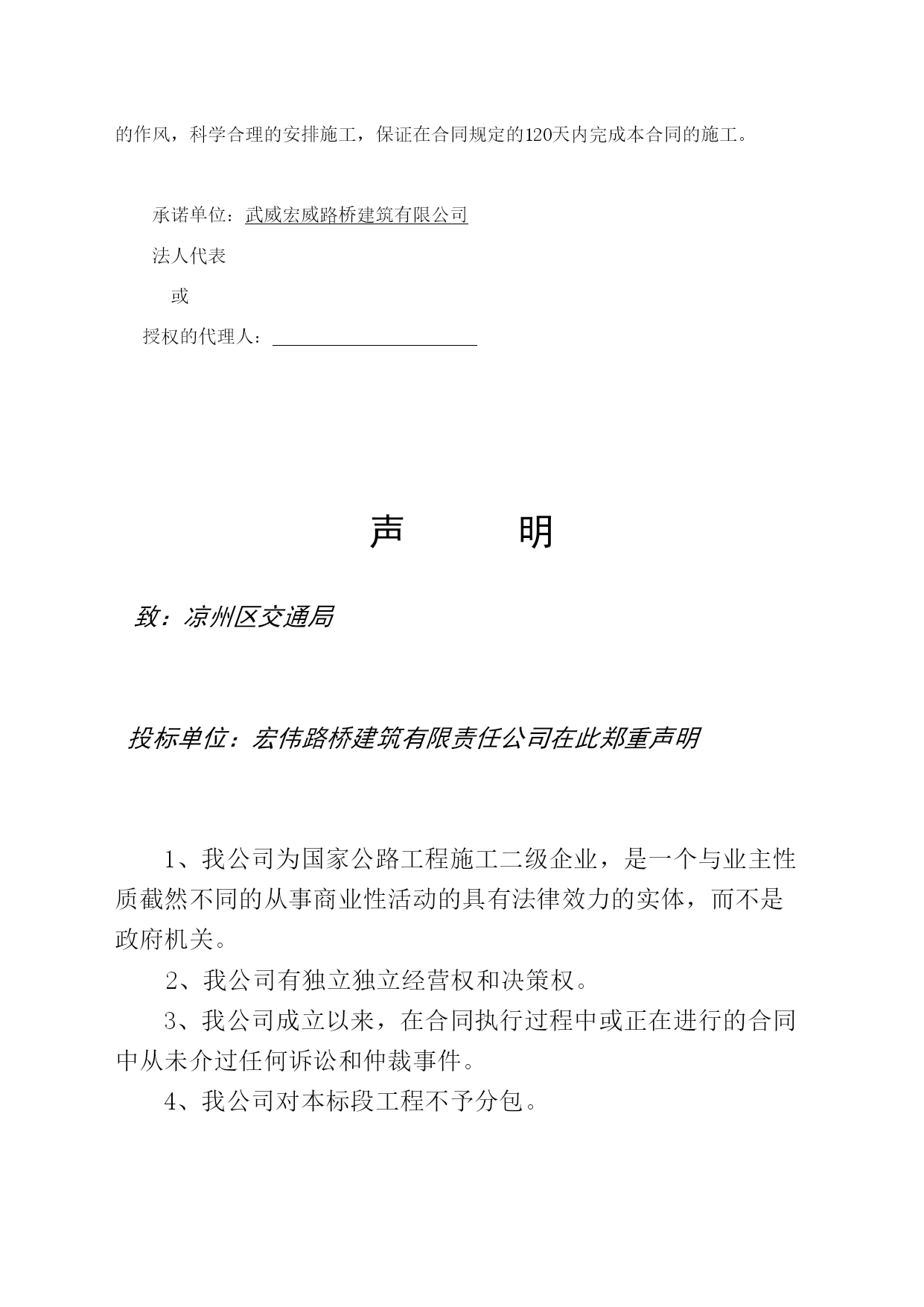 A.投标书格式武威市凉州区长城乡2009度西湖村通村公路建设工程项目投标书致:甘肃省武威市凉州区长城乡人们政府1.在研究上述项目的招标文件(含补遗书)和考察了工程现场后,我们愿意按人民币(大写)元(¥元)的投标总价,遵照招标文件的要求承担本合同工程的实施、完成及其缺陷修复工作。2.本合同段全长5.3公里。3.如果你单位接受我们的投标,我们将保证在接到监理工程师的开工通知书后,在本投标书附录内写明的开工期内开工,并在四个月的工期内完成本合同工程,达到合同规定的要求,该工期从本投标书附录内写明的开工期的最后一天算起。4.如果你单位接受我们的投标,我们将保证按照你单位认可的条件,以本投标书内写明的时间和金额提交履约担保。5.我们同意在从规定的开标之日起60天的投标文件有效期内严格遵守本投标书的各项承诺。在此期限届满之前,本投标书始终将对我方具有约束力,并随时接受中标。6.在合同协议书正式签署之前,本投标书连同你单位的中标通知书将构成我们双方之间共同遵守的文件,对双方具有约束力。7.我们理解,你单位不一定接受最低标价的投标或你单位接到的其他任何投标。同时也理解,你单位不负担我们任何投标费用。8、随同本投标书,我们出具金额为人民币5万元的投标担保,如果我们在本投标文件有效期内撤回投标文件,或拒绝接受按投标须知规定对投标文件中细微偏差进行澄清与补正;或在接到中标通知书后的7天内未能或拒绝签定合同协议书:或未能提交履约保证金,你单位有权没收投标担保金,另选中标单位。投标人地址:武威市凉州区胜利街64号投标人:武威宏威路桥建筑有限责任公司邮政编码:733000代表人或其授权的代理人:电话:0935-2214547(职务)(姓名)(签字)传真:0935-2264696日期:年月日B、投标书附录序号事项合同条款数据1投标担保金额――5万元2履约担保金额10.1合同价的10%(含暂定金额3发开工令期限(监理工程师接到开工报告之日算起)41.13天之内4开工期(接到监理工程师的开工令之日算起)41.1接到监理工程师的开工令之日起5工期43.1120天6托期损失偿金47.15000元/天7托期损失赔偿金限额47.1合同价格的10%8缺陷责任期49.124个月9中期(月进度)支付证书最低限额60.210保留金的百分比60.3月支付额的10%11保留金限额60.3最终合同价格的5%12开工预付款60.50%13材料预付款60.70%14支付时间60.15中期支付证书开出后21天内最后支付证书开出后42天内15支付付款的利率60.15不计16工程质量标准合格及以上C、投标担保格式投标银行保函致:(招标人全称)签于(投标人全称)(以下简称“投标人”)拟向(招标人全称)(以下简称“招标人”)送交关于(公路项目名称)第合同段的投标书,根据招标文件的规定,投标人须按规定的金额由其委托的银行出具一份投标保函(以下简称“保函”)作为履行招标文件中规定的义务担保。我行同意为投标人出具人民币(大写)元(元)的保函,作为向招标人的投标担保。本保函的条件:如果投标人在投标文件有限期内撤回投标文件;或如果投标人不接受投标人须知规定的对其投标文件中细微偏差进行澄清与补正;如果投标人在接到中标通知书后28天内:未能或拒绝签署合同协议书;未能按照招标文件规定提供履约担保。我行将履行担保义务,保证在收到招标人的书面要求,说明其索款是由于出现了上述任何一种原因的具体情况后,即凭招标人的索赔凭证,向招标人支付上述款项。本保函在投标人须知第12条规定的投标文件有效期或经延长的投标文件有效期满后30天内保持有效,任何索款要求应在上述期限内交到我行。招标人延长投标文件有限期的决定,应通知我行。银行地址:担保银行:(银行全称)(盖章)邮编:法定代表人电话:或传真:其授权的代理人:(职务)(姓名)(盖章)年月日D、授权书格式授权书致:甘肃省武威市凉州区长城乡人们政府本授权书宣告:(投标人全称)(职务)(姓名)合法地代表我单位,授权(投标人或其下属单位全称)的(职务)(姓名)为我单位代理人,该代理人有权在凉州区长城乡2009年度西湖村通村公路的投标活动中,以我单位的名义签署投标书和投标文件,与招标人(或业主)协商、签订合同协议书以及执行一切与此有关的事项。投标人:武威宏威路桥建筑有限责任公司授权人:被授权的代理人:日期:二00九年六月日中标人确保质量、安全和工期的承诺书致:甘肃省武威市凉州区长城乡人们政府通过仔细研究招标文件、设计文件、补遗书等并结合我公司的实际情况作出如下承诺:承诺并接受贵方招标文件和施工承包合同条款的规定和要求。我