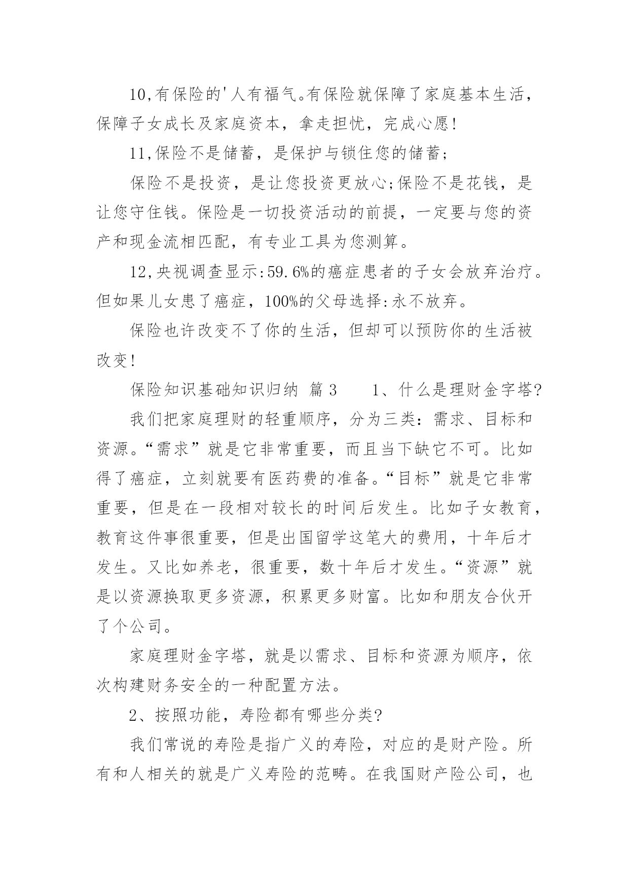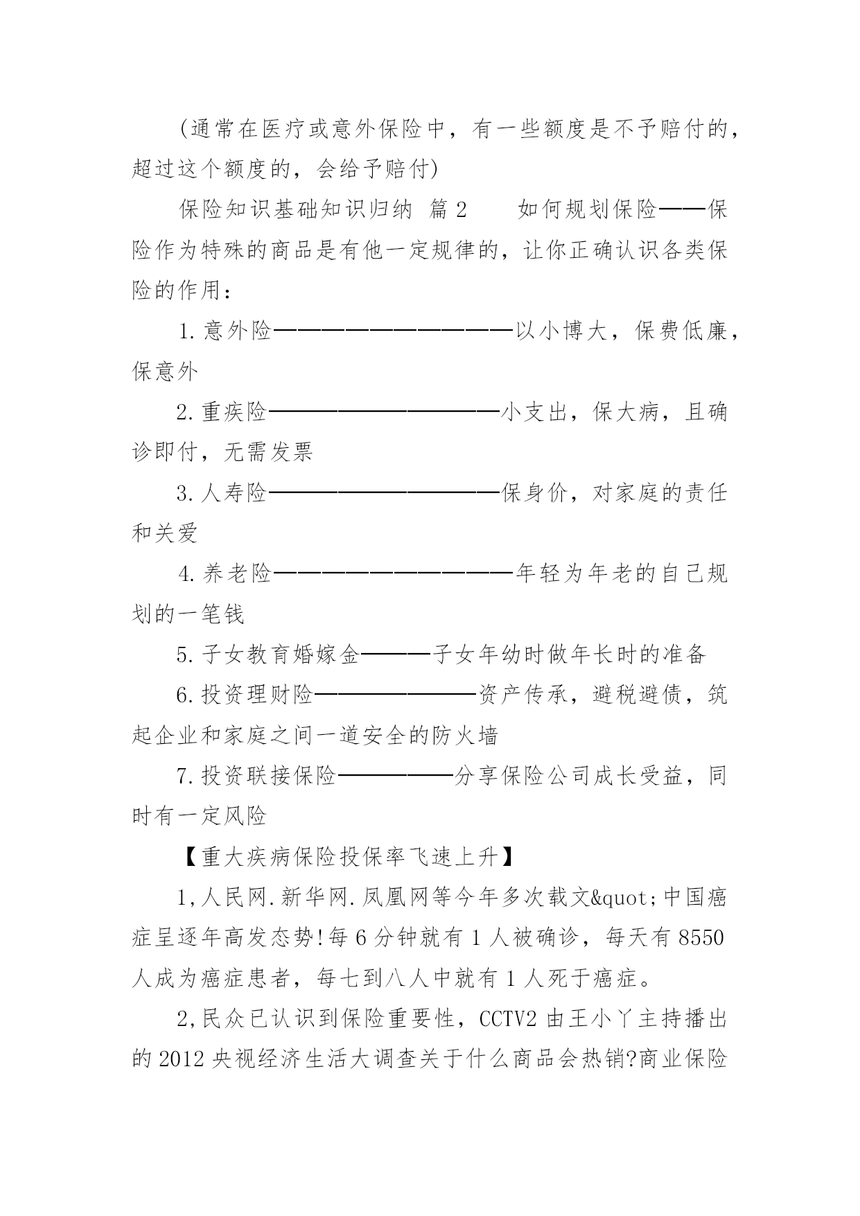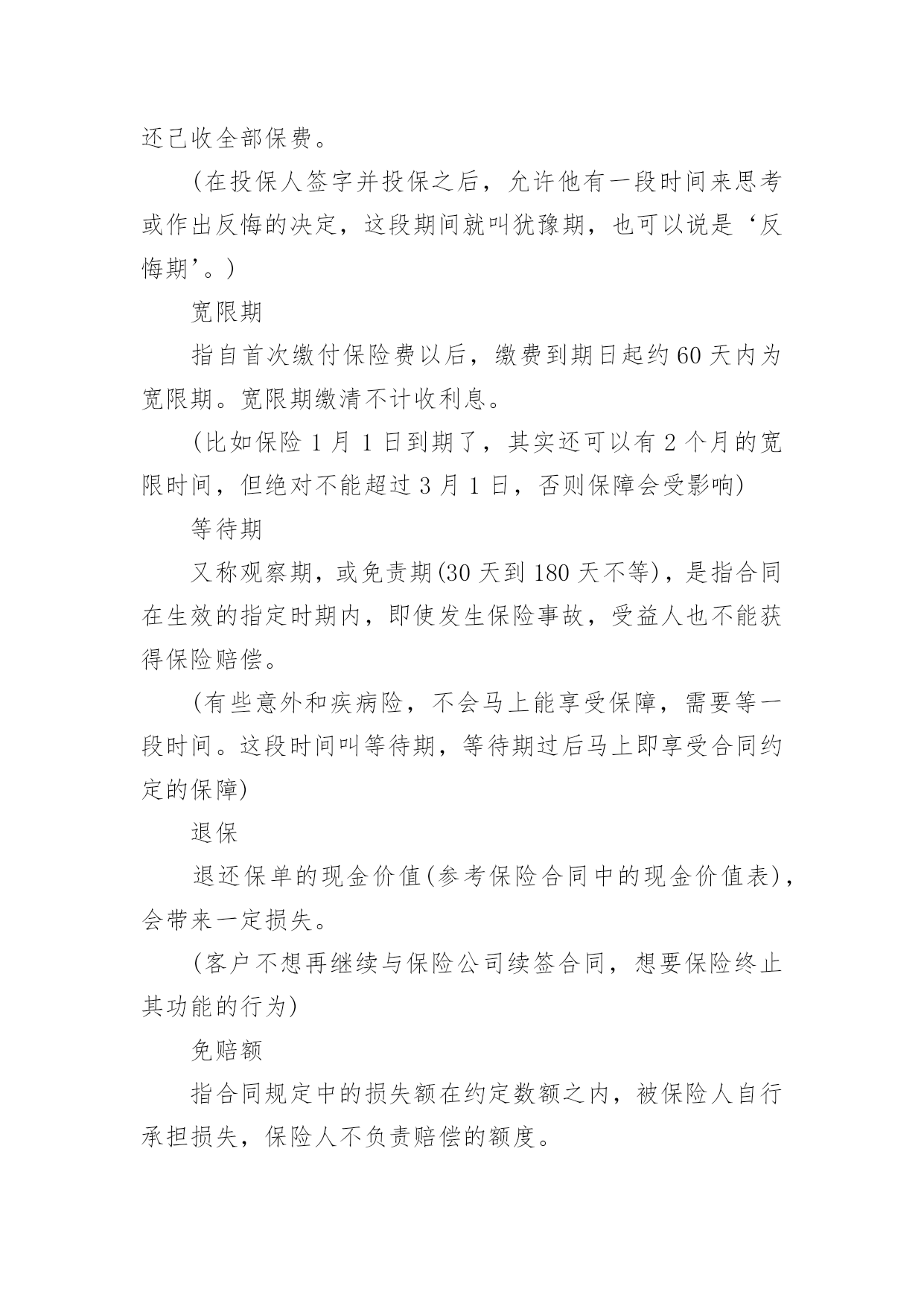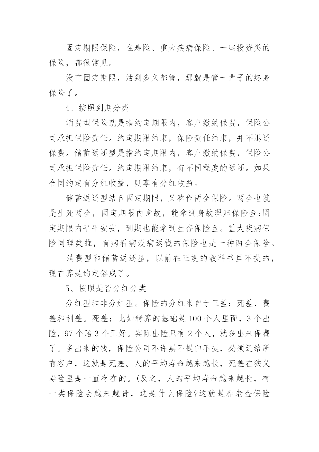 保险知识基础知识归纳保险知识基础知识归纳想必大家都对保险知识有过或多或少的了解,下面小编为大家整理了相关保险知识基础知识,希望大家喜欢。保险知识基础知识归纳篇1保险人根据中国《保险法》规定,保险人又称“承保人”,是指与投保人订立保险合同,并承担赔偿或者给付保险金责任的保险公司。保险人是法人,公民个人不能作为保险人。例:泰康人寿保险股份有限公司。(其实这个并不是真正的‘人’,保险人指的是保险公司)保险代理人保险代理人是指根据保险人的委托,在保险人授权的范围内代为办理保险业务,并依法向保险人收取代理手续费的单位或者个人。(保险代理人就是指保险公司的业务员/推销员/卖保险的)投保人投保人是指跟保险公司签定保险合同,有保单处置权,并缴纳保费的单位或个人。(投保人就是交钱买保险的人)被保险人被保险人是指根据保险合同,其财产利益或人身受保险合同保障,在保险事故发生后,享有保险金请求权的人。(被保险人就是享受保险保障的人)受益人又称为“保险金领取人”,是指由被保险人或者投保人指定,在保险事故发生或者约定的保险期限届满时,依照保险合同享有保险金请求权的人。(受益人就是出险后,能拿赔付金的那个人)保险期间保险期限也称“保险期间”,指保险合同的有效期限,即保险合同双方当事履行权利和义务的起讫时间。(也就是说这份保险能保你到什么时候、你的`保障能享受多长时间)保险责任指保险公司承担赔偿或者给付保险金责任的项目。(就是说保险公司具体给你什么样的保障,保的是哪些方面)责任免除责任免除是对保险人承担责任的限制,即指保险人不负责赔偿或给付责任的范围。(责任免除就是保险公司不进行赔付的范围,哪些行为是不予理赔的)犹豫期投投保人在犹豫期内(以前是10天到15天,保监会近期文件规定要求犹豫期变为20天),可以申请撤消全同并退还己收全部保费。(在投保人签字并投保之后,允许他有一段时间来思考或作出反悔的决定,这段期间就叫犹豫期,也可以说是‘反悔期’。)宽限期指自首次缴付保险费以后,缴费到期日起约60天内为宽限期。宽限期缴清不计收利息。(比如保险1月1日到期了,其实还可以有2个月的宽限时间,但绝对不能超过3月1日,否则保障会受影响)等待期又称观察期,或免责期(30天到180天不等),是指合同在生效的指定时期内,即使发生保险事故,受益人也不能获得保险赔偿。(有些意外和疾病险,不会马上能享受保障,需要等一段时间。这段时间叫等待期,等待期过后马上即享受合同约定的保障)退保退还保单的现金价值(参考保险合同中的现金价值表),会带来一定损失。(客户不想再继续与保险公司续签合同,想要保险终止其功能的行为)免赔额指合同规定中的损失额在约定数额之内,被保险人自行承担损失,保险人不负责赔偿的额度。(通常在医疗或意外保险中,有一些额度是不予赔付的,超过这个额度的,会给予赔付)保险知识基础知识归纳篇2如何规划保险──保险作为特殊的商品是有他一定规律的,让你正确认识各类保险的作用:1.意外险──────────以小博大,保费低廉,保意外2.重疾险──────────小支出,保大病,且确诊即付,无需发票3.人寿险──────────保身价,对家庭的责任和关爱4.养老险──────────年轻为年老的自己规划的一笔钱5.子女教育婚嫁金───子女年幼时做年长时的准备6.投资理财险───────资产传承,避税避债,筑起企业和家庭之间一道安全的防火墙7.投资联接保险─────分享保险公司成长受益,同时有一定风险【重大疾病保险投保率飞速上升】1,人民网.新华网.凤凰网等今年多次载文"中国癌症呈逐年高发态势!每6分钟就有1人被确诊,每天有8550人成为癌症患者,每七到八人中就有1人死于癌症。2,民众已认识到保险重要性,CCTV2由王小丫主持播出的2012央视经济生活大调查关于什么商品会热销?商业保险排第3位。2010年商业保险排名第九,2011年第七,老百姓越来越关注通过商业保险让生活有保障。3,医疗费用是生命过程中不得不计算的成本,每个人都在办保险,只不过是向自己买?是向社保局买?还是向保险公司买。每个人都应拥有社保,但不能局限于社保,因为社保是最低的保障,商业保险相当于木门外多加了防盗门。4,无人因买了保险而倾家荡产,但的确有很多家庭因为未买足够保险而倾家荡产……5.重疾险创始人南非医生马利尤斯·巴纳德博士曾说:“医生只能解决一个人的生理疾病,但不能解决疾病背后的家庭经济生命。"6,生前对家庭同样关爱,人走了,留给家人几千万保险金。傅彪走了,留给家人上百万债务!!保险宁可千日不用,不可一日不备。7,择偶时应看的标准:一个人买了保险,至少说明:责任感;经济能力;身体健康,否则保险公司不会为他承保。8,一般有四种人不买保险:自认为无钱的人;责任心及爱心不足的人;已出问题保险公司拒保的
