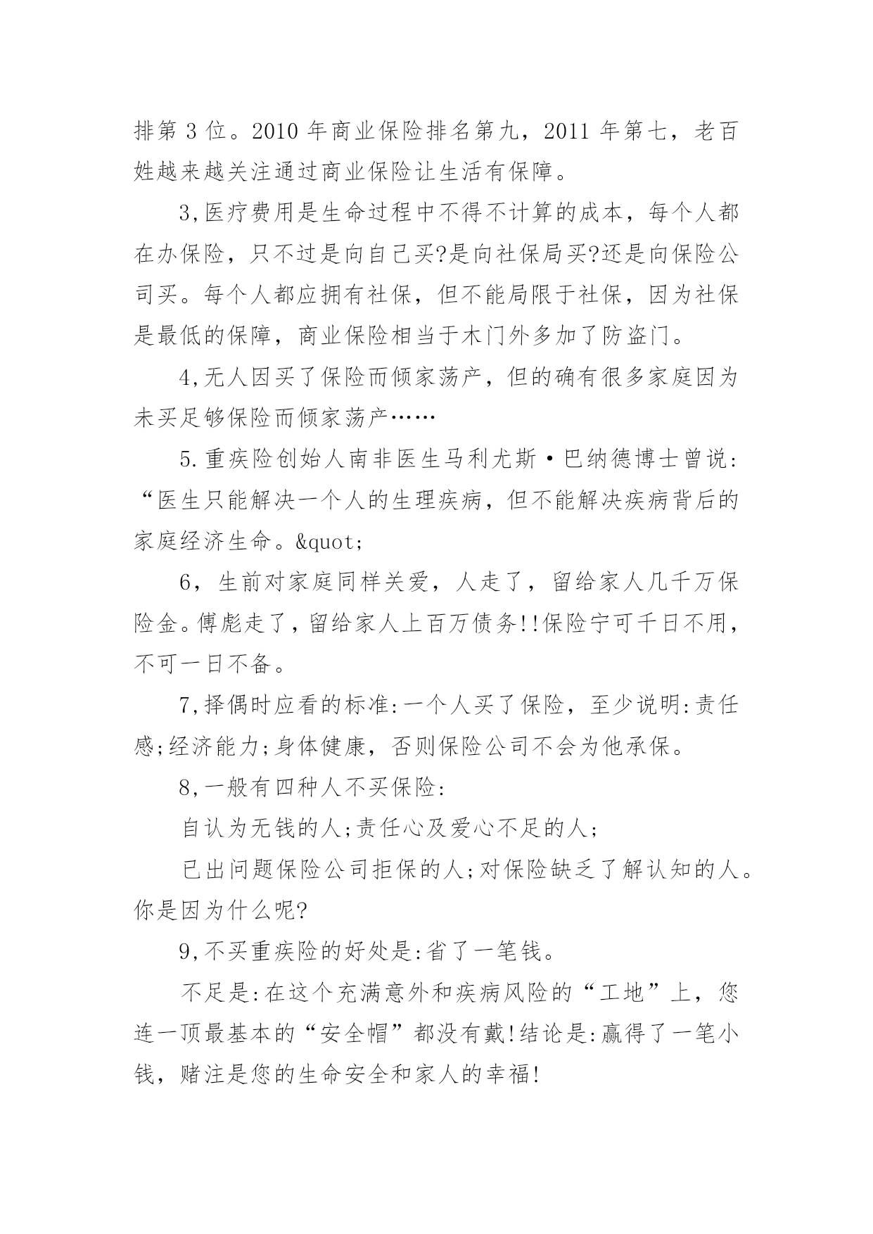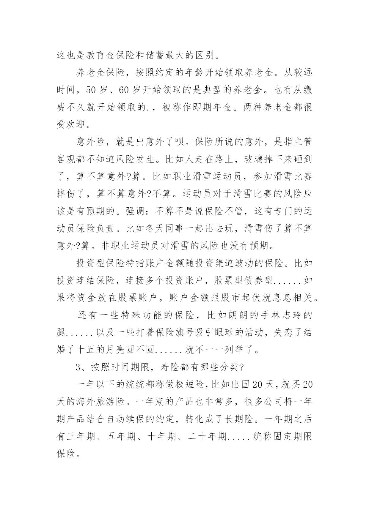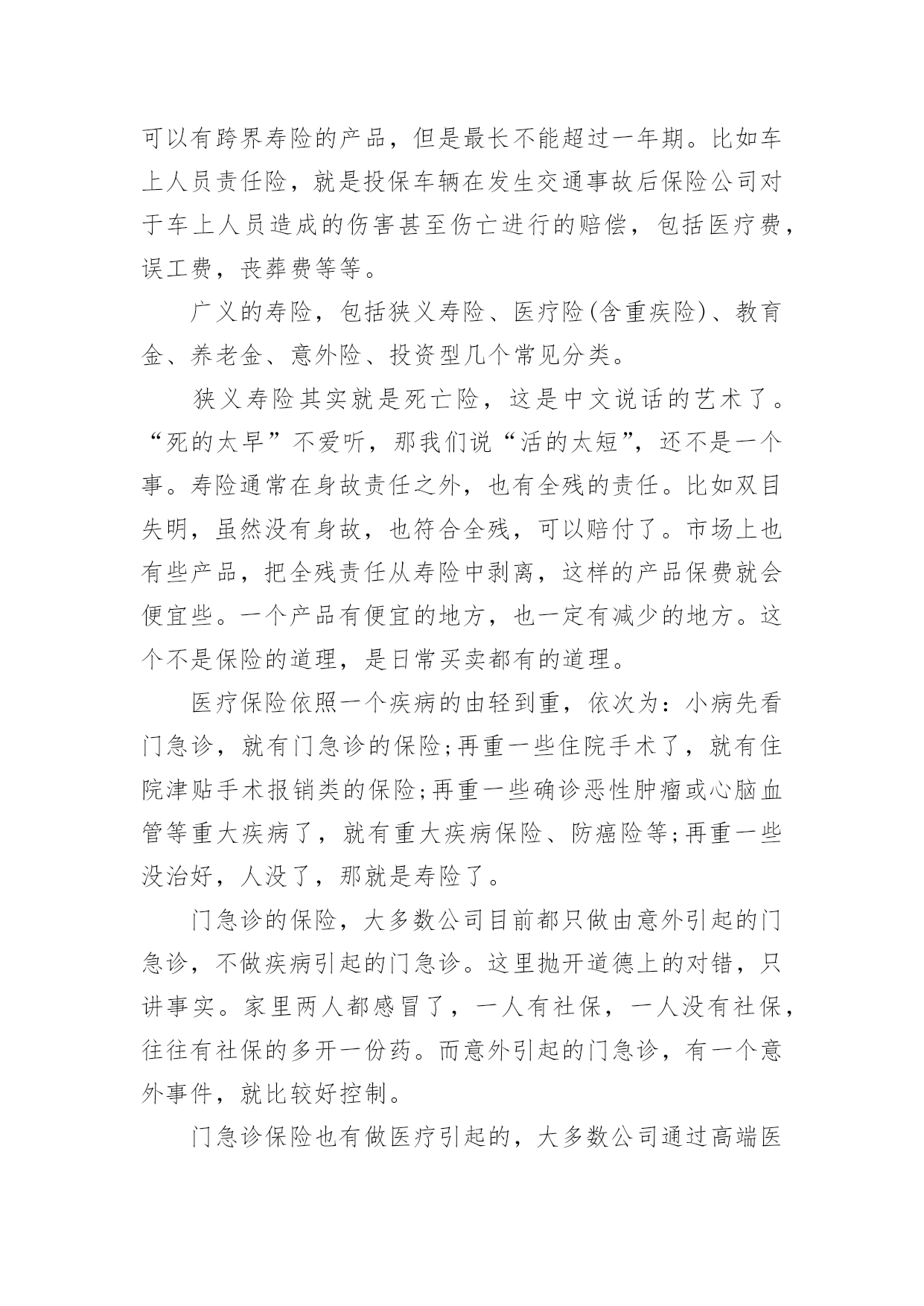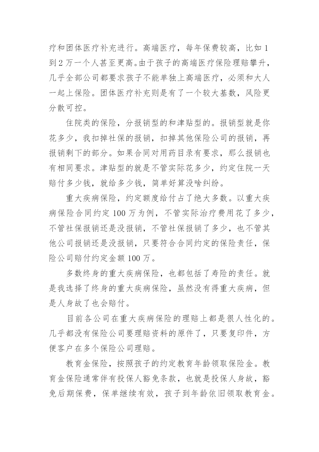 保险知识基础知识归纳保险知识基础知识归纳想必大家都对保险知识有过或多或少的了解,下面小编为大家整理了相关保险知识基础知识,希望大家喜欢。保险知识基础知识归纳篇1保险人根据中国《保险法》规定,保险人又称“承保人”,是指与投保人订立保险合同,并承担赔偿或者给付保险金责任的保险公司。保险人是法人,公民个人不能作为保险人。例:泰康人寿保险股份有限公司。(其实这个并不是真正的‘人’,保险人指的是保险公司)保险代理人保险代理人是指根据保险人的委托,在保险人授权的范围内代为办理保险业务,并依法向保险人收取代理手续费的单位或者个人。(保险代理人就是指保险公司的业务员/推销员/卖保险的)投保人投保人是指跟保险公司签定保险合同,有保单处置权,并缴纳保费的单位或个人。(投保人就是交钱买保险的人)被保险人被保险人是指根据保险合同,其财产利益或人身受保险合同保障,在保险事故发生后,享有保险金请求权的人。(被保险人就是享受保险保障的人)受益人又称为“保险金领取人”,是指由被保险人或者投保人指定,在保险事故发生或者约定的保险期限届满时,依照保险合同享有保险金请求权的人。(受益人就是出险后,能拿赔付金的那个人)保险期间保险期限也称“保险期间”,指保险合同的有效期限,即保险合同双方当事履行权利和义务的起讫时间。(也就是说这份保险能保你到什么时候、你的`保障能享受多长时间)保险责任指保险公司承担赔偿或者给付保险金责任的项目。(就是说保险公司具体给你什么样的保障,保的是哪些方面)责任免除责任免除是对保险人承担责任的限制,即指保险人不负责赔偿或给付责任的范围。(责任免除就是保险公司不进行赔付的范围,哪些行为是不予理赔的)犹豫期投投保人在犹豫期内(以前是10天到15天,保监会近期文件规定要求犹豫期变为20天),可以申请撤消全同并退还己收全部保费。(在投保人签字并投保之后,允许他有一段时间来思考或作出反悔的决定,这段期间就叫犹豫期,也可以说是‘反悔期’。)宽限期指自首次缴付保险费以后,缴费到期日起约60天内为宽限期。宽限期缴清不计收利息。(比如保险1月1日到期了,其实还可以有2个月的宽限时间,但绝对不能超过3月1日,否则保障会受影响)等待期又称观察期,或免责期(30天到180天不等),是指合同在生效的指定时期内,即使发生保险事故,受益人也不能获得保险赔偿。(有些意外和疾病险,不会马上能享受保障,需要等一段时间。这段时间叫等待期,等待期过后马上即享受合同约定的保障)退保退还保单的现金价值(参考保险合同中的现金价值表),会带来一定损失。(客户不想再继续与保险公司续签合同,想要保险终止其功能的行为)免赔额指合同规定中的损失额在约定数额之内,被保险人自行承担损失,保险人不负责赔偿的额度。(通常在医疗或意外保险中,有一些额度是不予赔付的,超过这个额度的,会给予赔付)保险知识基础知识归纳篇2如何规划保险──保险作为特殊的商品是有他一定规律的,让你正确认识各类保险的作用:1.意外险──────────以小博大,保费低廉,保意外2.重疾险──────────小支出,保大病,且确诊即付,无需发票3.人寿险──────────保身价,对家庭的责任和关爱4.养老险──────────年轻为年老的自己规划的一笔钱5.子女教育婚嫁金───子女年幼时做年长时的准备6.投资理财险───────资产传承,避税避债,筑起企业和家庭之间一道安全的防火墙7.投资联接保险─────分享保险公司成长受益,同时有一定风险【重大疾病保险投保率飞速上升】1,人民网.新华网.凤凰网等今年多次载文"中国癌症呈逐年高发态势!每6分钟就有1人被确诊,每天有8550人成为癌症患者,每七到八人中就有1人死于癌症。2,民众已认识到保险重要性,CCTV2由王小丫主持播出的2012央视经济生活大调查关于什么商品会热销?商业保险排第3位。2010年商业保险排名第九,2011年第七,老百姓越来越关注通过商业保险让生活有保障。3,医疗费用是生命过程中不得不计算的成本,每个人都在办保险,只不过是向自己买?是向社保局买?还是向保险公司买。每个人都应拥有社保,但不能局限于社保,因为社保是最低的保障,商业保险相当于木门外多加了防盗门。4,无人因买了保险而倾家荡产,但的确有很多家庭因为未买足够保险而倾家荡产……5.重疾险创始人南非医生马利尤斯·巴纳德博士曾说:“医生只能解决一个人的生理疾病,但不能解决疾病背后的家庭经济生命。"6,生前对家庭同样关爱,人走了,留给家人几千万保险金。傅彪走了,留给家人上百万债务!!保险宁可千日不用,不可一日不备。7,择偶时应看的标准:一个人买了保险,至少说明:责任感;经济能力;身体健康,否则保险公司不会为他承保。8,一般有四种人不买保险:自认为无钱的人;责任心及爱心不足的人;已出问题保险公司拒保的