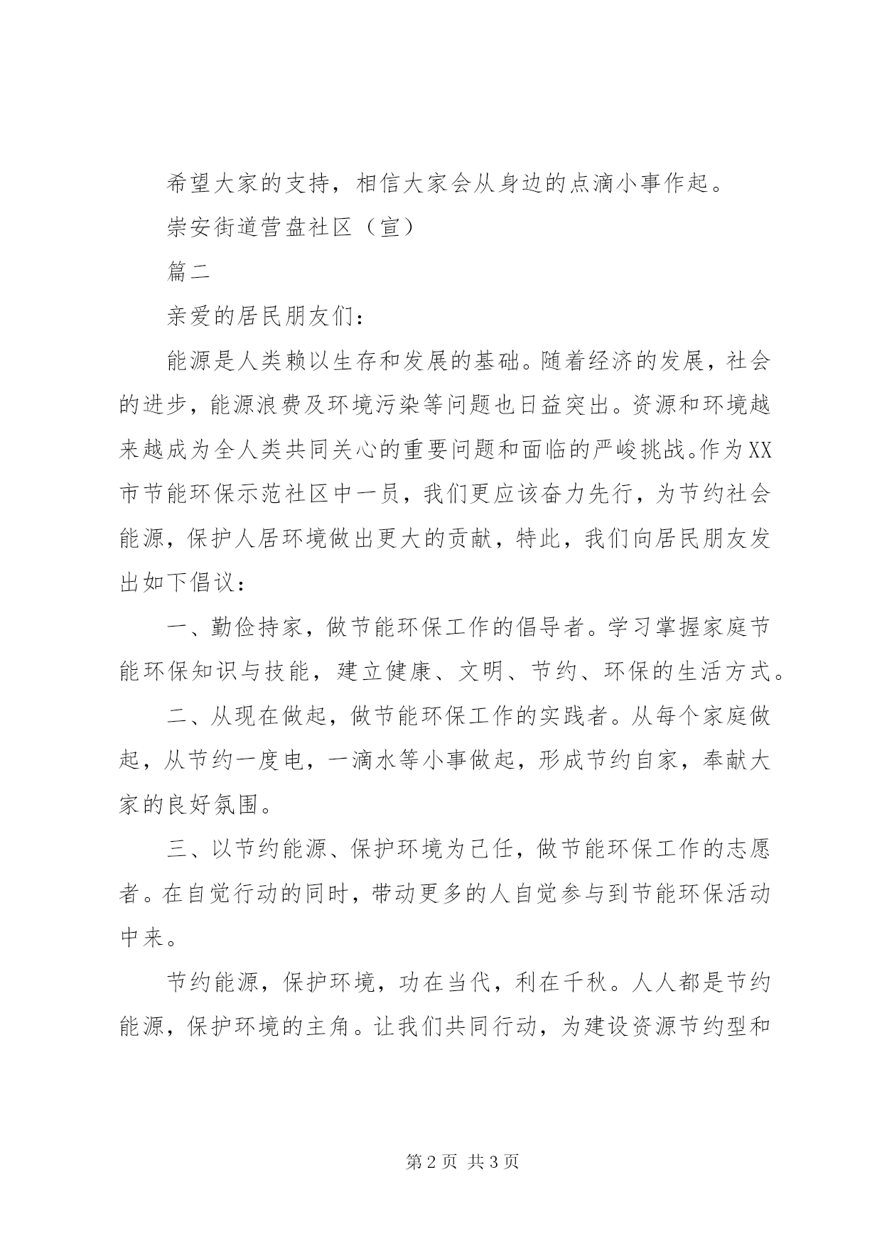 第PAGE\*Arabic\*MERGEFORMAT3页共NUMPAGES\*MERGEFORMAT3页社区环保的倡议书篇一尊敬的居民朋友们:一个绿色的地球是我们人类生存的先决条件。两千年的人类文明进程没有牺牲地球的绿色,但是两百年的现代文明却使我们绿色的地球日渐披黄蒙黑。人类在毁灭地球绿色的同时,也就是在逐步毁灭人类自己。看看我们周围干涸的河流,污染的空气,漫天飞舞的白色垃圾和满地的瓜果碎屑.为此我们倡议:倡导从我做起、从身边的小事做起,保护好赖以生存的环境。倡导节约每一滴水,使用无磷洗涤用品,少用一次性餐具和塑料袋,不烧散煤,生活垃圾分类放置,绝食用野生动物。提倡穿着采用棉、麻、毛、丝绸等天然植物制作的quot;生态时装quot;,食用无污染、无公害且安全、优质、营养的quot;绿色食品quot;,使用无污染、低耗能、低噪音符合环保要求的家用电器,盛装物品使用quot;绿色包装quot;,禁止quot;白色污染quot;,搞好居室卫生,注重室内和庭院的绿化。积极参与爱鸟护鸟和保护野生动物活动,增强quot;人类只有一个地球quot;的忧患意识,坚决制止破坏生态和污染环境的一切违法行为。努力建设生态城市,绿化和美化我们和顺的家园,使我们生存的环境更加美好,舒适。希望大家的支持,相信大家会从身边的点滴小事作起。崇安街道营盘社区(宣)篇二亲爱的居民朋友们:能源是人类赖以生存和发展的基础。随着经济的发展,社会的进步,能源浪费及环境污染等问题也日益突出。资源和环境越来越成为全人类共同关心的重要问题和面临的严峻挑战。作为XX市节能环保示范社区中一员,我们更应该奋力先行,为节约社会能源,保护人居环境做出更大的贡献,特此,我们向居民朋友发出如下倡议:一、勤俭持家,做节能环保工作的倡导者。学习掌握家庭节能环保知识与技能,建立健康、文明、节约、环保的生活方式。二、从现在做起,做节能环保工作的实践者。从每个家庭做起,从节约一度电,一滴水等小事做起,形成节约自家,奉献大家的良好氛围。三、以节约能源、保护环境为己任,做节能环保工作的志愿者。在自觉行动的同时,带动更多的人自觉参与到节能环保活动中来。节约能源,保护环境,功在当代,利在千秋。人人都是节约能源,保护环境的主角。让我们共同行动,为建设资源节约型和环境友好型社会而作出自己应有的贡献。