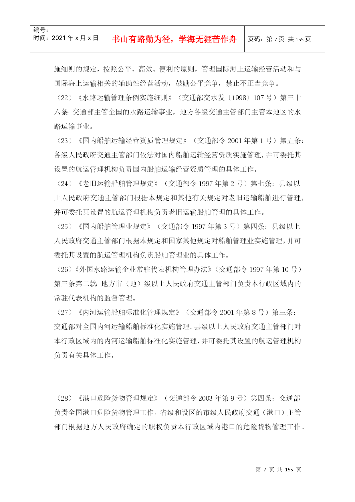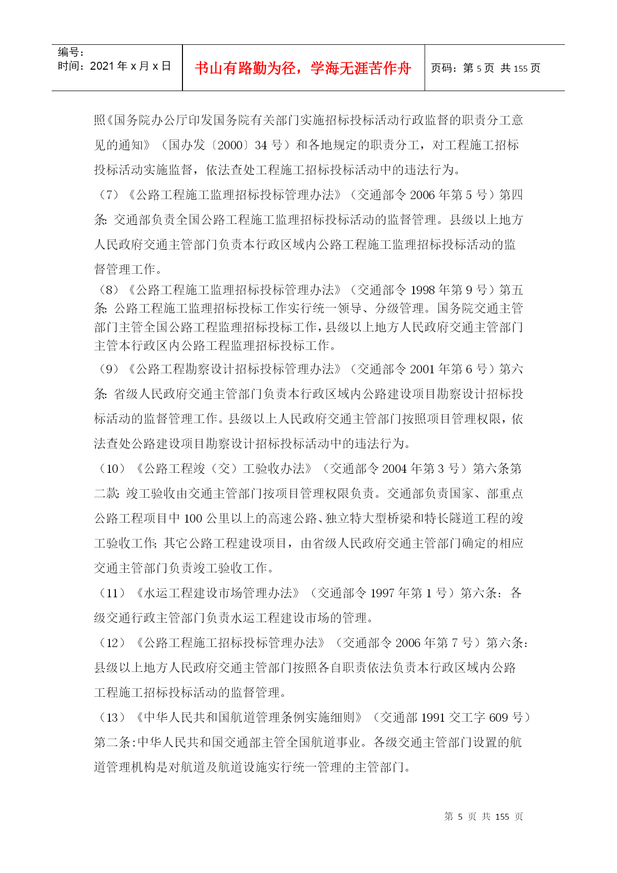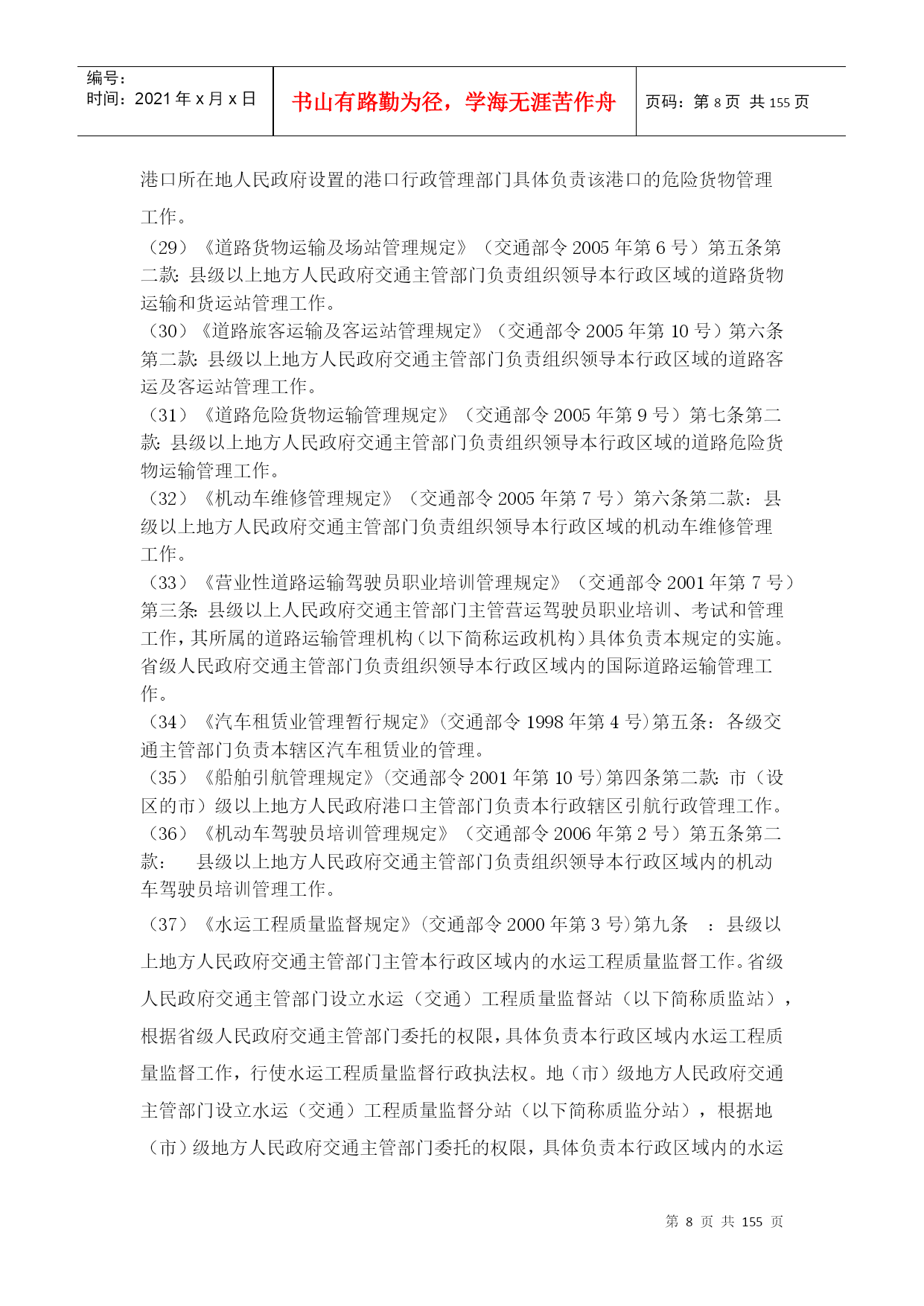 编号:时间:2021年x月x日书山有路勤为径,学海无涯苦作舟页码:第PAGE155页共NUMPAGES155页第PAGE\*MERGEFORMAT155页共NUMPAGES\*MERGEFORMAT155页宁德市交通行政执法主体的执法依据一、法定行政执法部门名称:宁德市交通局执法依据:共62件(一)法律5件(1)《中华人民共和国公路法》第八条:国务院交通主管部门主管全国公路工作。县级以上地方人民政府交通主管部门主管本行政区域内的公路工作。(2)《中华人民共和国安全生产法》第九条第二款:国务院有关部门依照本法和其他有关法律、行政法规的规定,在各自的职责范围内对有关的安全生产工作实施监督管理;县级以上地方各级人民政府有关部门依照本法和其他有关法律、法规的规定,在各自的职责范围内对有关的安全生产工作实施监督管理。(3)《中华人民共和国大气污染防治法》第四条第二款:各级公安、交通、铁道、渔业管理部门根据各自的职责,对机动车船污染大气实施监督管理。(4)《中华人民共和国道路交通安全法》第二十条:机动车的驾驶培训实行社会化,由交通主管部门对驾驶培训学校、驾驶培训班实行资格管理,其中专门的拖拉机驾驶培训学校、驾驶培训班由农业(农业机械)主管部门实行资格管理。(5)《中华人民共和国环境噪声污染防治法》第六条第三款:各级公安、交通、铁路、民航等主管部门和港务监督机构,根据各自的职责,对交通运输和社会生活噪声污染防治实施监督管理。(二)行政法规12件(1)《建设工程勘察设计管理条例》(国务院令第293号)第五条:县级以上人民政府建设行政主管部门和交通、水利等有关部门应当依照本条例的规定,加强对建设工程勘察、设计活动的监督管理。(2)《建设工程质量管理条例》(国务院第279号令)第四十三条第三款:县级以上地方人民政府建设行政主管部门对本行政区域内的建设工程质量实施监督管理。县级以上地方人民政府交通、水利等有关部门在各自的职责范围内,负责对本行政区域内的专业建设工程质量的监督管理。(3)《中华人民共和国航标条例》(国务院令第187号)第三条:国务院交通行政主管部门负责管理和保护除军用航标和渔业航标以外的航标。国务院交通行政主管部门设立的流域航道管理机构、海区港务监督机构和县级以上地方人民政府交通行政主管部门,负责管理和保护本辖区内军用航标和渔业航标以外的航标。(4)《中华人民共和国公路管理条例》(国务院国发[1987]92号)第四条:公路管理工作实行统一领导、分级管理原则。国道、省道由省、自治区、直辖市公路主管部门负责修建、养护和管理。国道中跨省、自治区、直辖市的高速公路,由交通部批准的专门机构负责修建、养护和管理。县道由县(市)公路主管部门负责修建、养护和管理。乡道由乡(镇)人民政府负责修建、养护和管理。专用公路由专用单位负责修建、养护和管理。(5)《中华人民共和国道路运输条例》(国务院令第406号)第七条:地方人民政府交通主管部门负责组织领导本行政区域的道路运输管理工作(6)《危险化学品安全管理条例》(国务院令第344号)第五条第五款:交通部门负责危险化学品公路、水路运输单位及其运输工具的安全管理,对危险化学品水路运输安全实施监督,负责危险化学品公路、水路运输单位、驾驶人员、船员、装卸人员和押运人员的资质认定,并负责前述事项的监督检查。(7)《中华人民共和国航道管理条例》(国务院国发〔1987〕78号)第六条:国家航道及其航道设施按海区和内河水系,由交通部或者交通部授权的省、自治区、直辖市交通主管部门管理。地方航道及其航道设施由省、自治区、直辖市交通主管部门管理。(8)《中华人民共和国内河交通安全管理条例》(国务院令第355号)第五条:县级以上地方各级人民政府应当加强奔行政区域内的内河交通安全管理工作,建立、健全内河交通安全管理责任制。(9)《中华人民共和国船舶和海上设施检验条例》(国务院令第109号)第三条:中华人民共和国船舶检验局是依照本条例规定实施各项检验工作的主管机构。经国务院交通主管部门批准,船检局可以在主要港口和工业区设置船舶检验机构。经国务院交通主管部门和省、自治区、直辖市人民政府批准,省、自治区、直辖市人民政府交通主管部门可以在所辖港口设置地方船舶检验机构。(10)《中华人民共和国水路运输管理条例》(国务院令第237号)第四条:交通部主管全国水路运输事业,各地交通主管部门主管本地区的水路运输事业。各地交通主管部门可以根据水路运输管理业的实际情况,设置航运管理机构。(11)《中华人民共和国国际海运条例》(国务院令第335号)第四条:国务院交通主管部门和有关的地方人民政府交通主管部门依照本条例规定,对国际海上运输经营活动实施监督管理。《