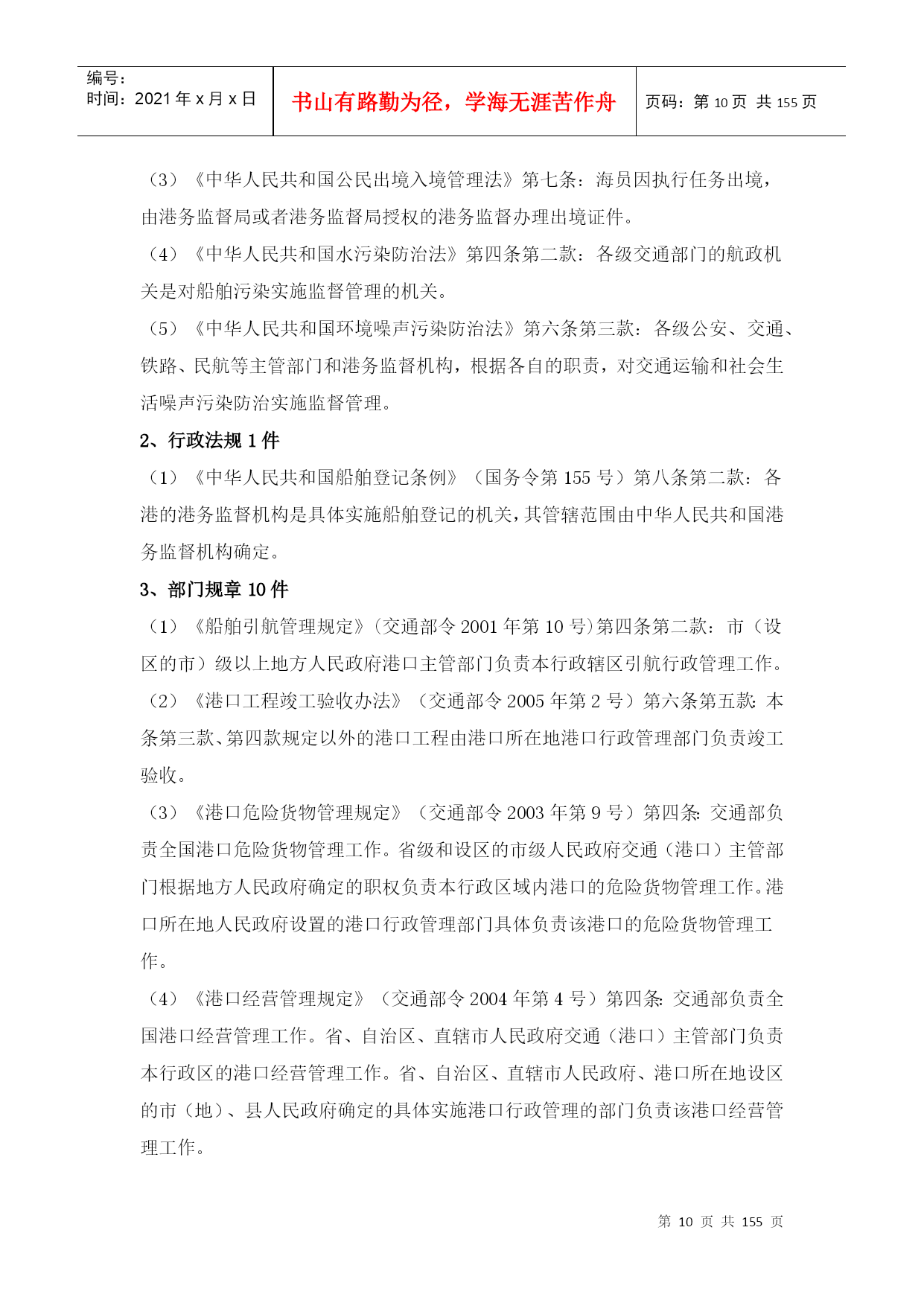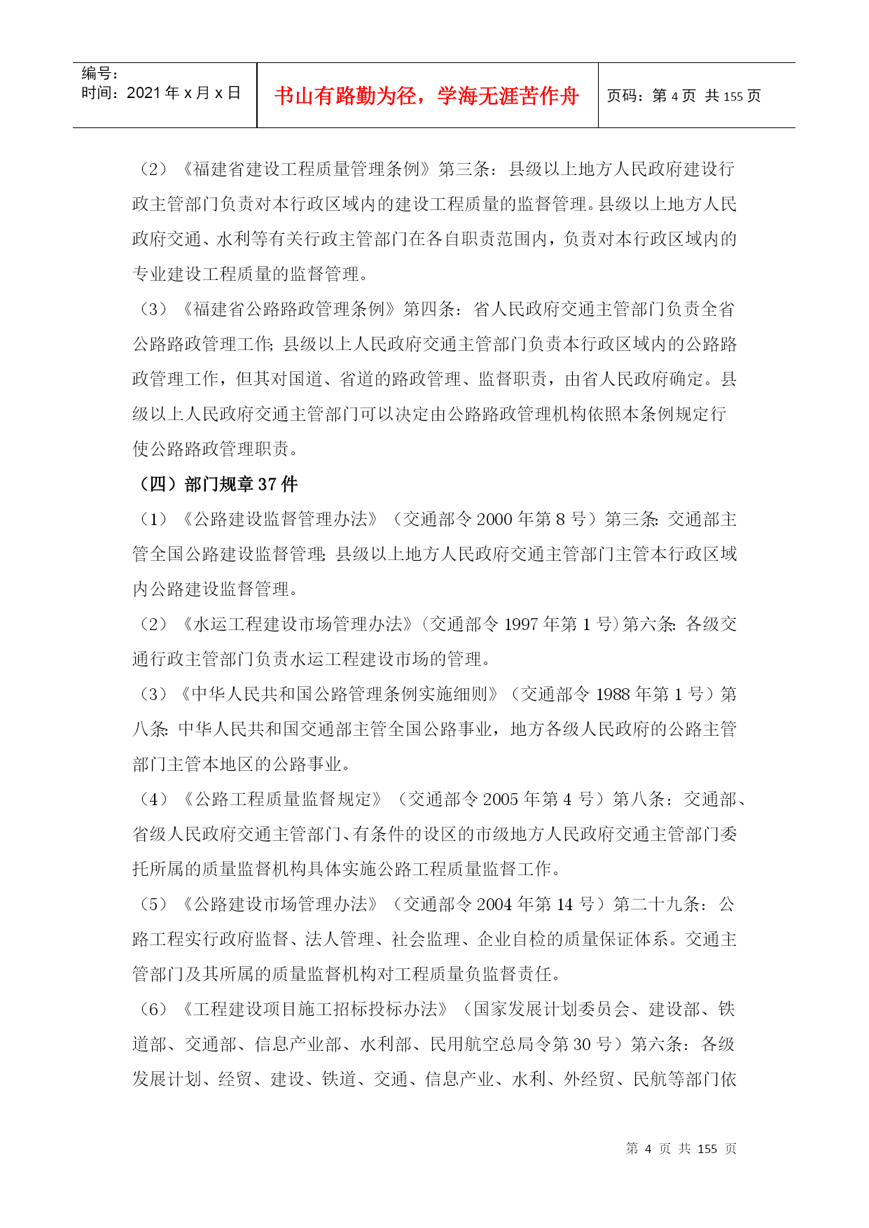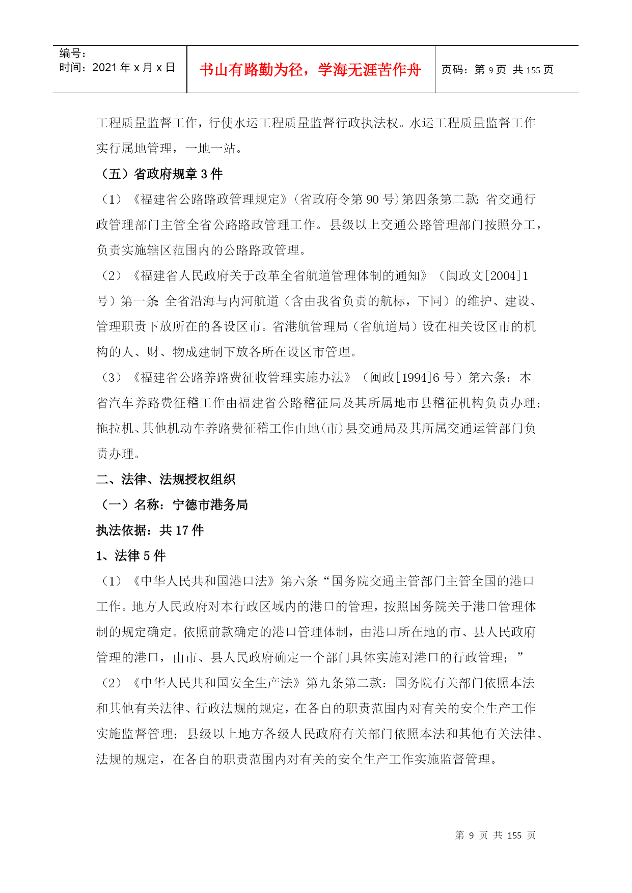 编号:时间:2021年x月x日书山有路勤为径,学海无涯苦作舟页码:第PAGE155页共NUMPAGES155页第PAGE\*MERGEFORMAT155页共NUMPAGES\*MERGEFORMAT155页宁德市交通行政执法主体的执法依据一、法定行政执法部门名称:宁德市交通局执法依据:共62件(一)法律5件(1)《中华人民共和国公路法》第八条:国务院交通主管部门主管全国公路工作。县级以上地方人民政府交通主管部门主管本行政区域内的公路工作。(2)《中华人民共和国安全生产法》第九条第二款:国务院有关部门依照本法和其他有关法律、行政法规的规定,在各自的职责范围内对有关的安全生产工作实施监督管理;县级以上地方各级人民政府有关部门依照本法和其他有关法律、法规的规定,在各自的职责范围内对有关的安全生产工作实施监督管理。(3)《中华人民共和国大气污染防治法》第四条第二款:各级公安、交通、铁道、渔业管理部门根据各自的职责,对机动车船污染大气实施监督管理。(4)《中华人民共和国道路交通安全法》第二十条:机动车的驾驶培训实行社会化,由交通主管部门对驾驶培训学校、驾驶培训班实行资格管理,其中专门的拖拉机驾驶培训学校、驾驶培训班由农业(农业机械)主管部门实行资格管理。(5)《中华人民共和国环境噪声污染防治法》第六条第三款:各级公安、交通、铁路、民航等主管部门和港务监督机构,根据各自的职责,对交通运输和社会生活噪声污染防治实施监督管理。(二)行政法规12件(1)《建设工程勘察设计管理条例》(国务院令第293号)第五条:县级以上人民政府建设行政主管部门和交通、水利等有关部门应当依照本条例的规定,加强对建设工程勘察、设计活动的监督管理。(2)《建设工程质量管理条例》(国务院第279号令)第四十三条第三款:县级以上地方人民政府建设行政主管部门对本行政区域内的建设工程质量实施监督管理。县级以上地方人民政府交通、水利等有关部门在各自的职责范围内,负责对本行政区域内的专业建设工程质量的监督管理。(3)《中华人民共和国航标条例》(国务院令第187号)第三条:国务院交通行政主管部门负责管理和保护除军用航标和渔业航标以外的航标。国务院交通行政主管部门设立的流域航道管理机构、海区港务监督机构和县级以上地方人民政府交通行政主管部门,负责管理和保护本辖区内军用航标和渔业航标以外的航标。(4)《中华人民共和国公路管理条例》(国务院国发[1987]92号)第四条:公路管理工作实行统一领导、分级管理原则。国道、省道由省、自治区、直辖市公路主管部门负责修建、养护和管理。国道中跨省、自治区、直辖市的高速公路,由交通部批准的专门机构负责修建、养护和管理。县道由县(市)公路主管部门负责修建、养护和管理。乡道由乡(镇)人民政府负责修建、养护和管理。专用公路由专用单位负责修建、养护和管理。(5)《中华人民共和国道路运输条例》(国务院令第406号)第七条:地方人民政府交通主管部门负责组织领导本行政区域的道路运输管理工作(6)《危险化学品安全管理条例》(国务院令第344号)第五条第五款:交通部门负责危险化学品公路、水路运输单位及其运输工具的安全管理,对危险化学品水路运输安全实施监督,负责危险化学品公路、水路运输单位、驾驶人员、船员、装卸人员和押运人员的资质认定,并负责前述事项的监督检查。(7)《中华人民共和国航道管理条例》(国务院国发〔1987〕78号)第六条:国家航道及其航道设施按海区和内河水系,由交通部或者交通部授权的省、自治区、直辖市交通主管部门管理。地方航道及其航道设施由省、自治区、直辖市交通主管部门管理。(8)《中华人民共和国内河交通安全管理条例》(国务院令第355号)第五条:县级以上地方各级人民政府应当加强奔行政区域内的内河交通安全管理工作,建立、健全内河交通安全管理责任制。(9)《中华人民共和国船舶和海上设施检验条例》(国务院令第109号)第三条:中华人民共和国船舶检验局是依照本条例规定实施各项检验工作的主管机构。经国务院交通主管部门批准,船检局可以在主要港口和工业区设置船舶检验机构。经国务院交通主管部门和省、自治区、直辖市人民政府批准,省、自治区、直辖市人民政府交通主管部门可以在所辖港口设置地方船舶检验机构。(10)《中华人民共和国水路运输管理条例》(国务院令第237号)第四条:交通部主管全国水路运输事业,各地交通主管部门主管本地区的水路运输事业。各地交通主管部门可以根据水路运输管理业的实际情况,设置航运管理机构。(11)《中华人民共和国国际海运条例》(国务院令第335号)第四条:国务院交通主管部门和有关的地方人民政府交通主管部门依照本条例规定,对国际海上运输经营活动实施监督管理。《