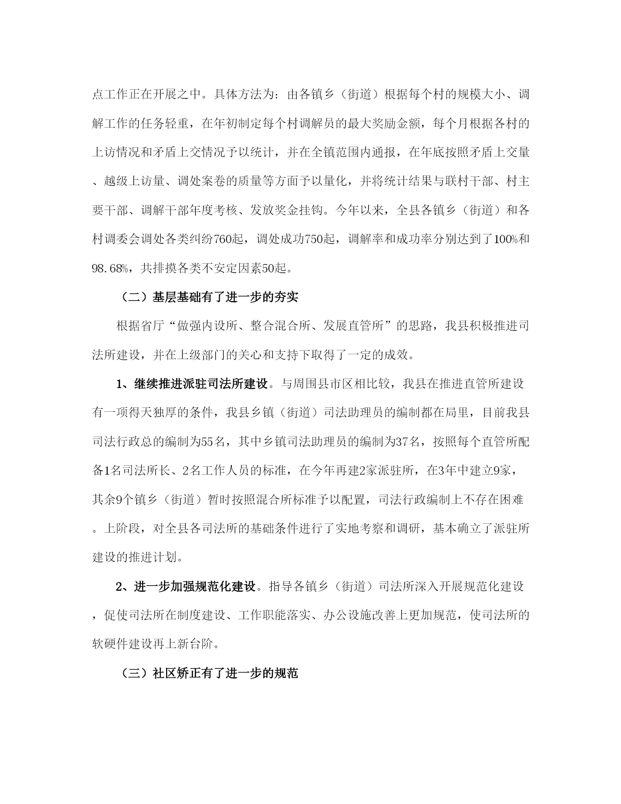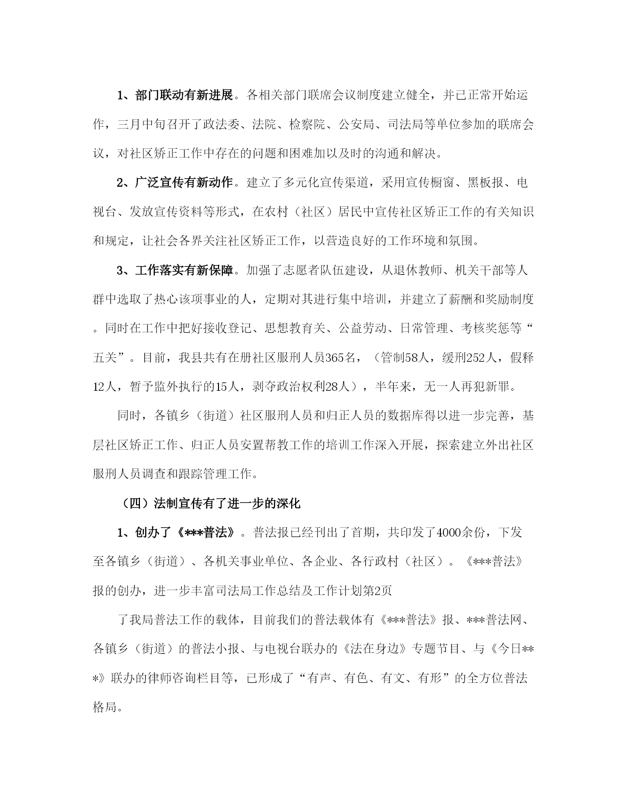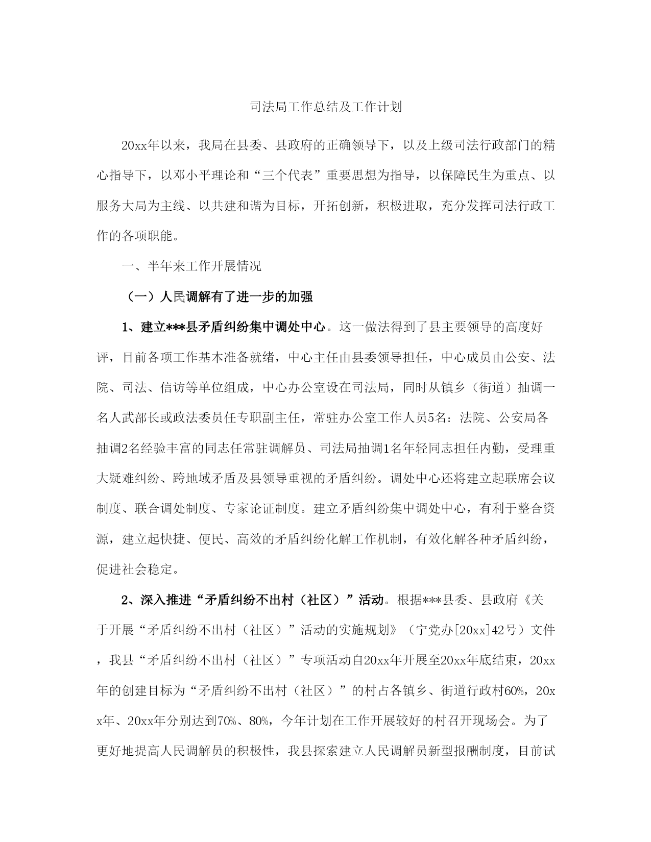 司法局工作总结及工作计划(完整版)文档资料可直接使用,可编辑,欢迎下载司法局工作总结及工作计划20xx年以来,我局在县委、县政府的正确领导下,以及上级司法行政部门的精心指导下,以邓小平理论和“三个代表”重要思想为指导,以保障民生为重点、以服务大局为主线、以共建和谐为目标,开拓创新,积极进取,充分发挥司法行政工作的各项职能。一、半年来工作开展情况(一)人民调解有了进一步的加强1、建立***县矛盾纠纷集中调处中心。这一做法得到了县主要领导的高度好评,目前各项工作基本准备就绪,中心主任由县委领导担任,中心成员由公安、法院、司法、信访等单位组成,中心办公室设在司法局,同时从镇乡(街道)抽调一名人武部长或政法委员任专职副主任,常驻办公室工作人员5名:法院、公安局各抽调2名经验丰富的同志任常驻调解员、司法局抽调1名年轻同志担任内勤,受理重大疑难纠纷、跨地域矛盾及县领导重视的矛盾纠纷。调处中心还将建立起联席会议制度、联合调处制度、专家论证制度。建立矛盾纠纷集中调处中心,有利于整合资源,建立起快捷、便民、高效的矛盾纠纷化解工作机制,有效化解各种矛盾纠纷,促进社会稳定。2、深入推进“矛盾纠纷不出村(社区)”活动。根据***县委、县政府《关于开展“矛盾纠纷不出村(社区)”活动的实施规划》(宁党办[20xx]42号)文件,我县“矛盾纠纷不出村(社区)”专项活动自20xx年开展至20xx年底结束,20xx年的创建目标为“矛盾纠纷不出村(社区)”的村占各镇乡、街道行政村60%,20xx年、20xx年分别达到70%、80%,今年计划在工作开展较好的村召开现场会。为了更好地提高人民调解员的积极性,我县探索建立人民调解员新型报酬制度,目前试点工作正在开展之中。具体方法为:由各镇乡(街道)根据每个村的规模大小、调解工作的任务轻重,在年初制定每个村调解员的最大奖励金额,每个月根据各村的上访情况和矛盾上交情况予以统计,并在全镇范围内通报,在年底按照矛盾上交量、越级上访量、调处案卷的质量等方面予以量化,并将统计结果与联村干部、村主要干部、调解干部年度考核、发放奖金挂钩。今年以来,全县各镇乡(街道)和各村调委会调处各类纠纷760起,调处成功750起,调解率和成功率分别达到了100%和98.68%,共排摸各类不安定因素50起。(二)基层基础有了进一步的夯实根据省厅“做强内设所、整合混合所、发展直管所”的思路,我县积极推进司法所建设,并在上级部门的关心和支持下取得了一定的成效。1、继续推进派驻司法所建设。与周围县市区相比较,我县在推进直管所建设有一项得天独厚的条件,我县乡镇(街道)司法助理员的编制都在局里,目前我县司法行政总的编制为55名,其中乡镇司法助理员的编制为37名,按照每个直管所配备1名司法所长、2名工作人员的标准,在今年再建2家派驻所,在3年中建立9家,其余9个镇乡(街道)暂时按照混合所标准予以配置,司法行政编制上不存在困难。上阶段,对全县各司法所的基础条件进行了实地考察和调研,基本确立了派驻所建设的推进计划。2、进一步加强规范化建设。指导各镇乡(街道)司法所深入开展规范化建设,促使司法所在制度建设、工作职能落实、办公设施改善上更加规范,使司法所的软硬件建设再上新台阶。(三)社区矫正有了进一步的规范1、部门联动有新进展。各相关部门联席会议制度建立健全,并已正常开始运作,三月中旬召开了政法委、法院、检察院、公安局、司法局等单位参加的联席会议,对社区矫正工作中存在的问题和困难加以及时的沟通和解决。2、广泛宣传有新动作。建立了多元化宣传渠道,采用宣传橱窗、黑板报、电视台、发放宣传资料等形式,在农村(社区)居民中宣传社区矫正工作的有关知识和规定,让社会各界关注社区矫正工作,以营造良好的工作环境和氛围。3、工作落实有新保障。加强了志愿者队伍建设,从退休教师、机关干部等人群中选取了热心该项事业的人,定期对其进行集中培训,并建立了薪酬和奖励制度。同时在工作中把好接收登记、思想教育关、公益劳动、日常管理、考核奖惩等“五关”。目前,我县共有在册社区服刑人员365名,(管制58人,缓刑252人,假释12人,暂予监外执行的15人,剥夺政治权利28人),半年来,无一人再犯新罪。同时,各镇乡(街道)社区服刑人员和归正人员的数据库得以进一步完善,基层社区矫正工作、归正人员安置帮教工作的培训工作深入开展,探索建立外出社区服刑人员调查和跟踪管理工作。(四)法制宣传有了进一步的深化1、创办了《***普法》。普法报已经刊出了首期,共印发了4000余份,下发至各镇乡(街道)、各机关事业单位、各企业、各行政村(社区)。《***普法》报的创办,进一步丰富司法局工作总结及工作计划了我局普法工作的载体,目前我们的普法载体有《***普法》报、***普法网、各镇乡(街道)的
