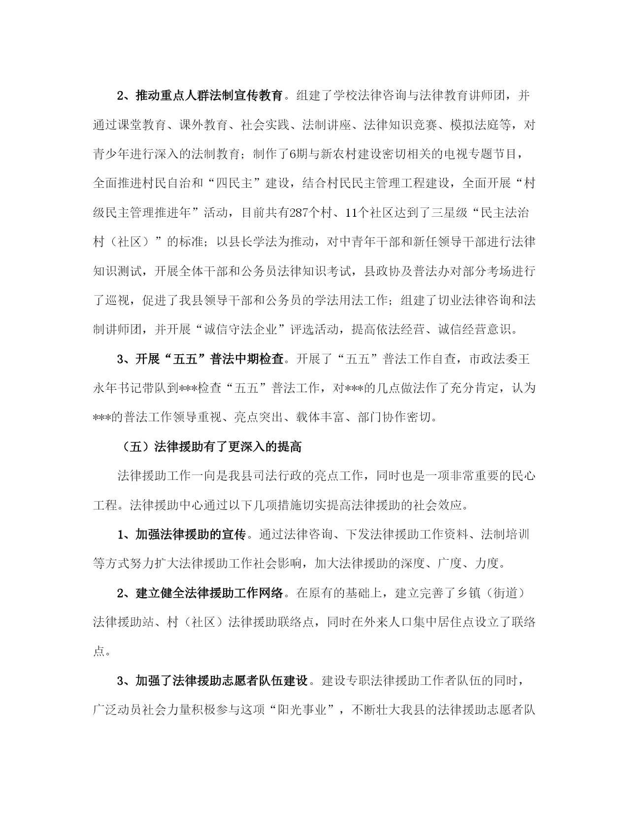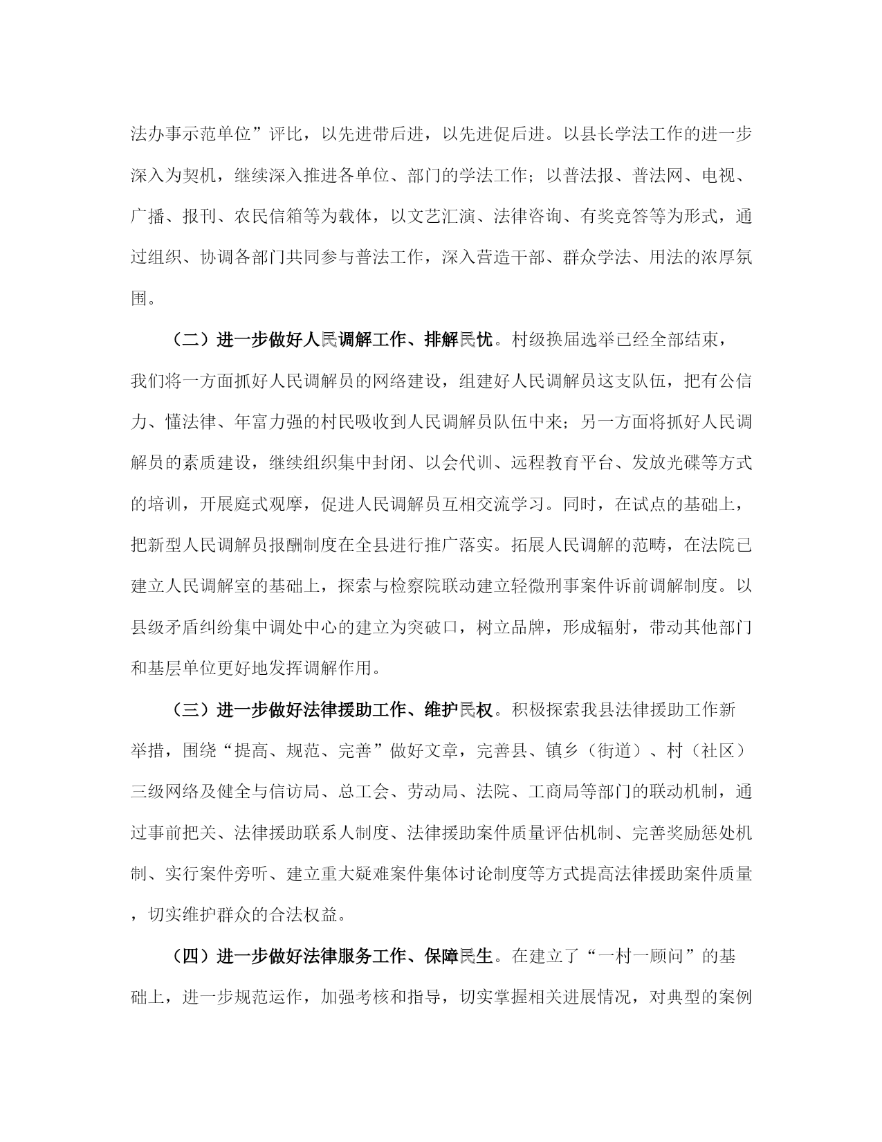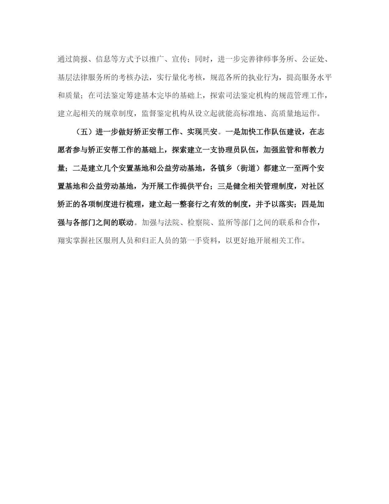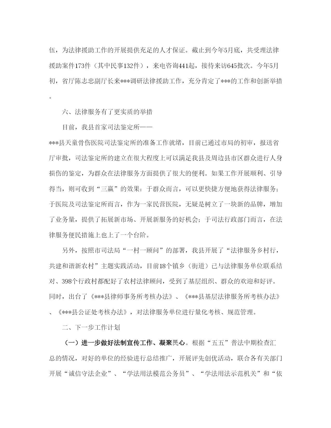 司法局工作总结及工作计划(完整版)文档资料可直接使用,可编辑,欢迎下载司法局工作总结及工作计划20xx年以来,我局在县委、县政府的正确领导下,以及上级司法行政部门的精心指导下,以邓小平理论和“三个代表”重要思想为指导,以保障民生为重点、以服务大局为主线、以共建和谐为目标,开拓创新,积极进取,充分发挥司法行政工作的各项职能。一、半年来工作开展情况(一)人民调解有了进一步的加强1、建立***县矛盾纠纷集中调处中心。这一做法得到了县主要领导的高度好评,目前各项工作基本准备就绪,中心主任由县委领导担任,中心成员由公安、法院、司法、信访等单位组成,中心办公室设在司法局,同时从镇乡(街道)抽调一名人武部长或政法委员任专职副主任,常驻办公室工作人员5名:法院、公安局各抽调2名经验丰富的同志任常驻调解员、司法局抽调1名年轻同志担任内勤,受理重大疑难纠纷、跨地域矛盾及县领导重视的矛盾纠纷。调处中心还将建立起联席会议制度、联合调处制度、专家论证制度。建立矛盾纠纷集中调处中心,有利于整合资源,建立起快捷、便民、高效的矛盾纠纷化解工作机制,有效化解各种矛盾纠纷,促进社会稳定。2、深入推进“矛盾纠纷不出村(社区)”活动。根据***县委、县政府《关于开展“矛盾纠纷不出村(社区)”活动的实施规划》(宁党办[20xx]42号)文件,我县“矛盾纠纷不出村(社区)”专项活动自20xx年开展至20xx年底结束,20xx年的创建目标为“矛盾纠纷不出村(社区)”的村占各镇乡、街道行政村60%,20xx年、20xx年分别达到70%、80%,今年计划在工作开展较好的村召开现场会。为了更好地提高人民调解员的积极性,我县探索建立人民调解员新型报酬制度,目前试点工作正在开展之中。具体方法为:由各镇乡(街道)根据每个村的规模大小、调解工作的任务轻重,在年初制定每个村调解员的最大奖励金额,每个月根据各村的上访情况和矛盾上交情况予以统计,并在全镇范围内通报,在年底按照矛盾上交量、越级上访量、调处案卷的质量等方面予以量化,并将统计结果与联村干部、村主要干部、调解干部年度考核、发放奖金挂钩。今年以来,全县各镇乡(街道)和各村调委会调处各类纠纷760起,调处成功750起,调解率和成功率分别达到了100%和98.68%,共排摸各类不安定因素50起。(二)基层基础有了进一步的夯实根据省厅“做强内设所、整合混合所、发展直管所”的思路,我县积极推进司法所建设,并在上级部门的关心和支持下取得了一定的成效。1、继续推进派驻司法所建设。与周围县市区相比较,我县在推进直管所建设有一项得天独厚的条件,我县乡镇(街道)司法助理员的编制都在局里,目前我县司法行政总的编制为55名,其中乡镇司法助理员的编制为37名,按照每个直管所配备1名司法所长、2名工作人员的标准,在今年再建2家派驻所,在3年中建立9家,其余9个镇乡(街道)暂时按照混合所标准予以配置,司法行政编制上不存在困难。上阶段,对全县各司法所的基础条件进行了实地考察和调研,基本确立了派驻所建设的推进计划。2、进一步加强规范化建设。指导各镇乡(街道)司法所深入开展规范化建设,促使司法所在制度建设、工作职能落实、办公设施改善上更加规范,使司法所的软硬件建设再上新台阶。(三)社区矫正有了进一步的规范1、部门联动有新进展。各相关部门联席会议制度建立健全,并已正常开始运作,三月中旬召开了政法委、法院、检察院、公安局、司法局等单位参加的联席会议,对社区矫正工作中存在的问题和困难加以及时的沟通和解决。2、广泛宣传有新动作。建立了多元化宣传渠道,采用宣传橱窗、黑板报、电视台、发放宣传资料等形式,在农村(社区)居民中宣传社区矫正工作的有关知识和规定,让社会各界关注社区矫正工作,以营造良好的工作环境和氛围。3、工作落实有新保障。加强了志愿者队伍建设,从退休教师、机关干部等人群中选取了热心该项事业的人,定期对其进行集中培训,并建立了薪酬和奖励制度。同时在工作中把好接收登记、思想教育关、公益劳动、日常管理、考核奖惩等“五关”。目前,我县共有在册社区服刑人员365名,(管制58人,缓刑252人,假释12人,暂予监外执行的15人,剥夺政治权利28人),半年来,无一人再犯新罪。同时,各镇乡(街道)社区服刑人员和归正人员的数据库得以进一步完善,基层社区矫正工作、归正人员安置帮教工作的培训工作深入开展,探索建立外出社区服刑人员调查和跟踪管理工作。(四)法制宣传有了进一步的深化1、创办了《***普法》。普法报已经刊出了首期,共印发了4000余份,下发至各镇乡(街道)、各机关事业单位、各企业、各行政村(社区)。《***普法》报的创办,进一步丰富司法局工作总结及工作计划了我局普法工作的载体,目前我们的普法载体有《***普法》报、***普法网、各镇乡(街道)的