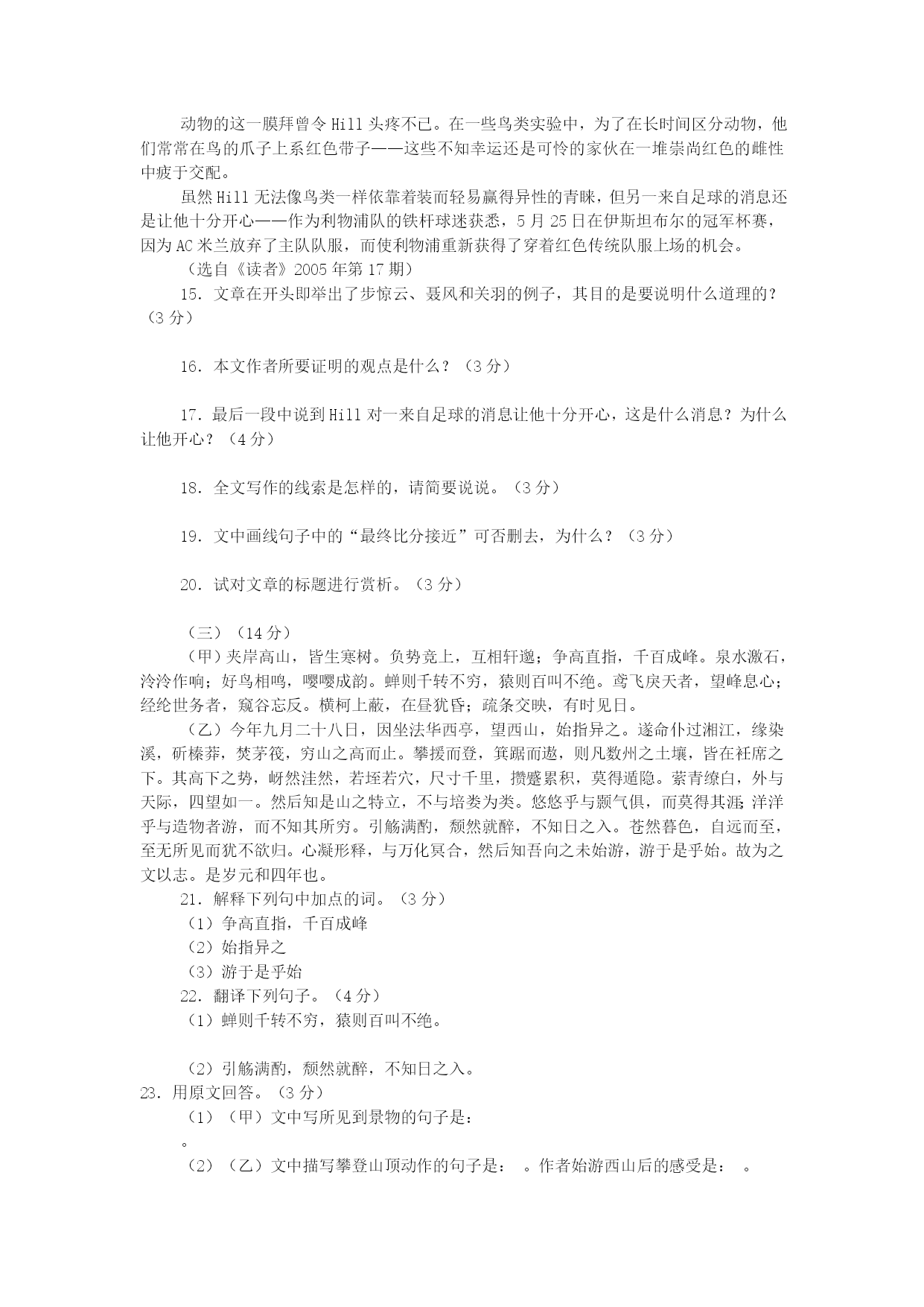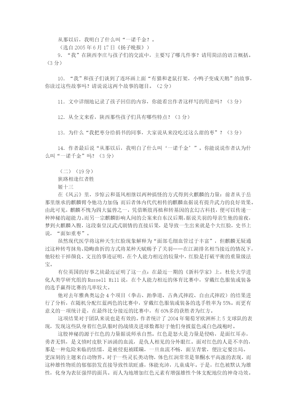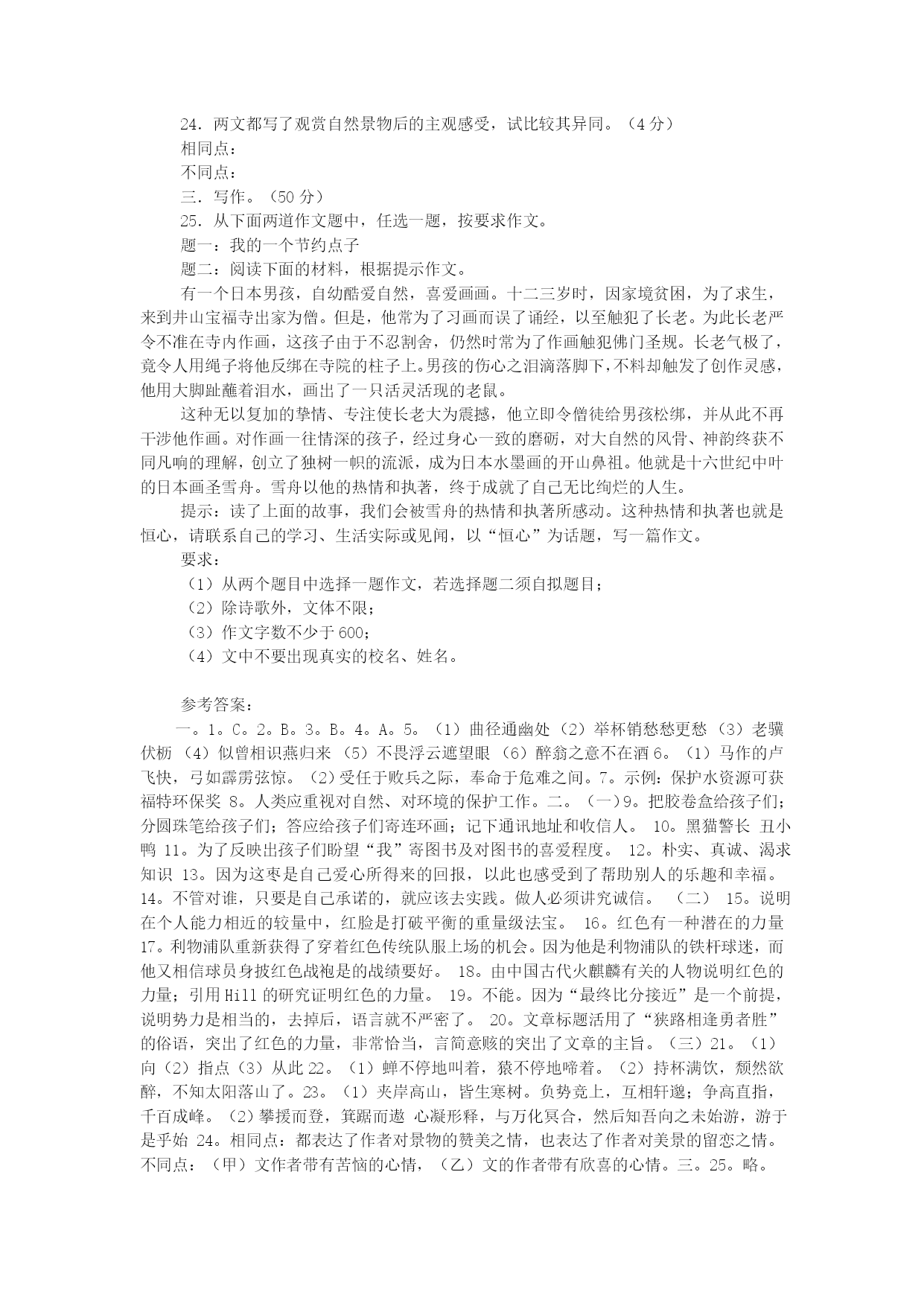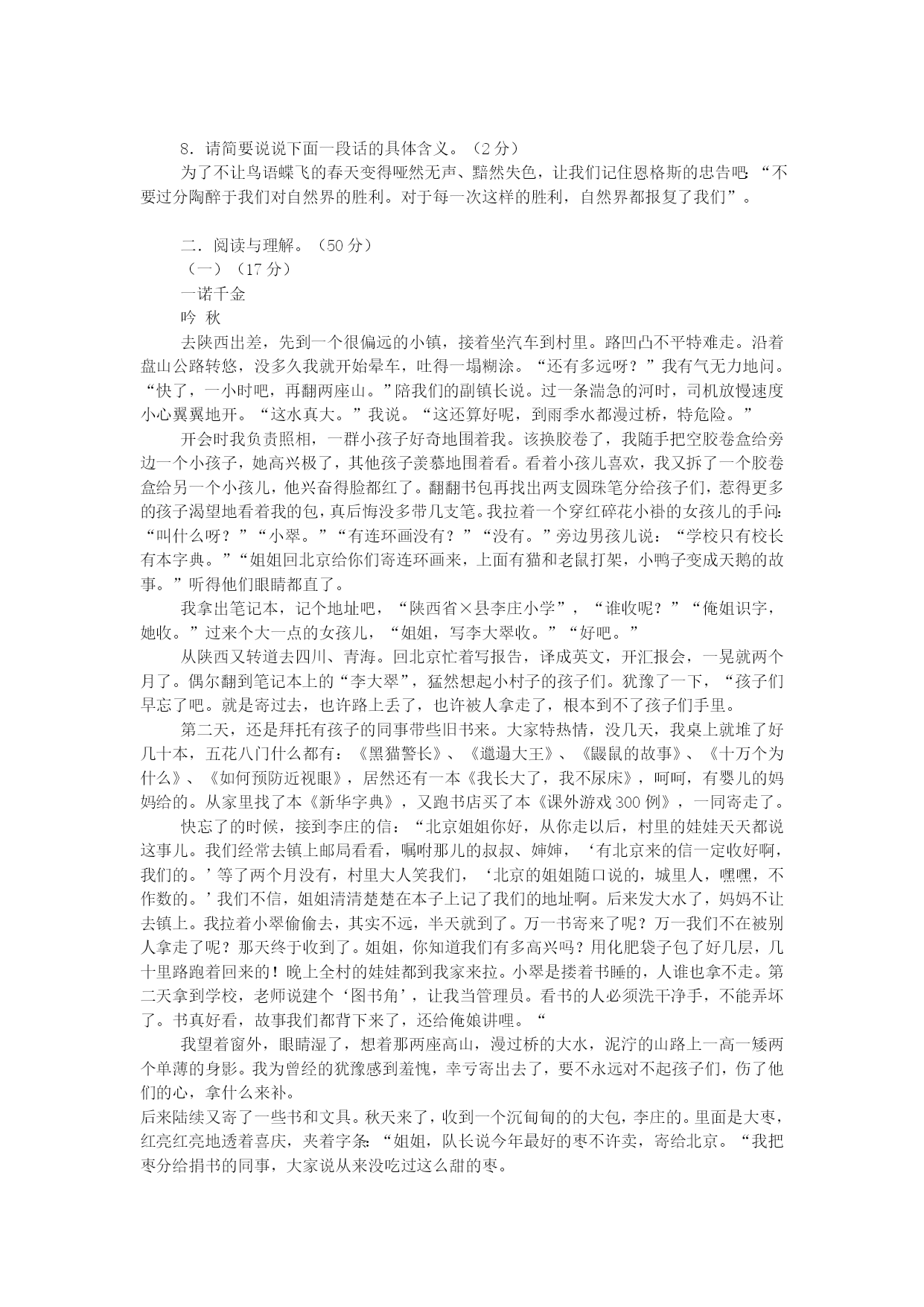 中考冲刺语文模拟试题7满分:120分时间:120分钟一.积累与运用。(20分)1.下列加点字注音完全正确的一项是()。(2分)A.附和(hè)离间(jiàn)称职(chènɡ)相形见绌(chū)B.嗜好(shì)辍学(chuò)畸形(qí)安然无恙(yànɡ)C.惬意(qiè)挑衅(xìn)腼腆(tiǎn)姹紫嫣红(chà)D.弓弦(xián)玷污(zhān)恐吓(xià)嗟来之食(jiē)2.下列词语书写完全正确的一项是()。(2分)A.热忱陶汰不计其数B.恻隐祈祷可歌可泣C.徜徉狼籍销声匿迹D.枢纽狭隘一愁莫展3.下列一段话中横线处应填入的词语最恰当的一项是()。(2分)俗话说,滴水穿石,绳锯木断。,金石为开。恒者无敌,只要有了这种矢志不渝、百折不回、的精神,世界上就没有做不成的事情,这也是伟人和、成功与失败的分水岭。A.恒心所至艰苦奋斗庸才B。精诚所至一往无前庸才C.精诚所至艰苦奋斗小人D。恒心所至一往无前小人4.下列名句、出处、作者、朝代对应不相符的一项是()。(2分)A.“长风破浪会有时,直挂云帆济沧海。”——《宣州谢眺楼饯别校书叔云》——李白——唐朝B.“王侯将相宁有种乎?”——《陈涉世家》——司马迁——汉朝C.“绿树村边合,青山郭外斜。”——《过故人庄》——孟浩然——唐朝D.“采菊东篱下,悠然见南山。”——《饮酒》——陶渊明——东晋5.补出下列名句的上句或下句(任意选做4题)。(4分)(1),禅房花木深。(2)抽刀断水水更流,。(3),志在千里。(4)无可奈何花落去,。(5),只缘身在最高层。(6),在乎山水之间也。6.根据提示默写诗文句子。(4分)(1)辛弃疾《破阵子·为陈同甫赋壮词以寄之》中描写战斗场面激烈,表现义军所向披靡的句子是:,。(2)《出师表》中诸葛亮在自叙本志和追述先帝知遇之恩时写下的临危受命的千古名句是:,。7.给下面的一则新闻拟一个恰当的标题。(15字以内)。(2分)本报讯福特汽车中国有限公司董事长兼首席执行官程美玮日前宣布,在水资源的保护和合理利用方面做出杰出贡献的组织和人士,将有机会分享今年福特汽车环保奖准备的100万元大奖。今年该环保奖的主题是:“保护水资源,共创和谐社会”。报名时间从5月18日开始至8月31日结束,详情请访问福特汽车环保奖的中文网(www.ford.com/cegc)。8.请简要说说下面一段话的具体含义。(2分)为了不让鸟语蝶飞的春天变得哑然无声、黯然失色,让我们记住恩格斯的忠告吧:“不要过分陶醉于我们对自然界的胜利。对于每一次这样的胜利,自然界都报复了我们”。二.阅读与理解。(50分)(一)(17分)一诺千金吟秋去陕西出差,先到一个很偏远的小镇,接着坐汽车到村里。路凹凸不平特难走。沿着盘山公路转悠,没多久我就开始晕车,吐得一塌糊涂。“还有多远呀?”我有气无力地问。“快了,一小时吧,再翻两座山。”陪我们的副镇长说。过一条湍急的河时,司机放慢速度小心翼翼地开。“这水真大。”我说。“这还算好呢,到雨季水都漫过桥,特危险。”开会时我负责照相,一群小孩子好奇地围着我。该换胶卷了,我随手把空胶卷盒给旁边一个小孩子,她高兴极了,其他孩子羡慕地围着看。看着小孩儿喜欢,我又拆了一个胶卷盒给另一个小孩儿,他兴奋得脸都红了。翻翻书包再找出两支圆珠笔分给孩子们,惹得更多的孩子渴望地看着我的包,真后悔没多带几支笔。我拉着一个穿红碎花小褂的女孩儿的手问:“叫什么呀?”“小翠。”“有连环画没有?”“没有。”旁边男孩儿说:“学校只有校长有本字典。”“姐姐回北京给你们寄连环画来,上面有猫和老鼠打架,小鸭子变成天鹅的故事。”听得他们眼睛都直了。我拿出笔记本,记个地址吧,“陕西省×县李庄小学”,“谁收呢?”“俺姐识字,她收。”过来个大一点的女孩儿,“姐姐,写李大翠收。”“好吧。”从陕西又转道去四川、青海。回北京忙着写报告,译成英文,开汇报会,一晃就两个月了。偶尔翻到笔记本上的“李大翠”,猛然想起小村子的孩子们。犹豫了一下,“孩子们早忘了吧。就是寄过去,也许路上丢了,也许被人拿走了,根本到不了孩子们手里。第二天,还是拜托有孩子的同事带些旧书来。大家特热情,没几天,我桌上就堆了好几十本,五花八门什么都有:《黑猫警长》、《邋遢大王》、《鼹鼠的故事》、《十万个为什么》、《如何预防近视眼》,居然还有一本《我长大了,我不尿床》,呵呵,有婴儿的妈妈给的。从家里找了本《新华字典》,又跑书店买了本《课外游戏300例》,一同寄走了。快忘了的时候,接到李庄的信:“北京姐姐你好,从你走以后,村里的娃娃天天都说这事儿。我们经常去镇上邮局看看,嘱咐那儿的叔叔、婶婶,‘有北京来的信一定收好啊,我们的。’等了两个月没有,村里大人笑我们,‘北京的姐姐随口说的,城里人,嘿嘿,不作数的。’我们不信,姐姐清清楚楚在本子上记了我们的地址啊。后来