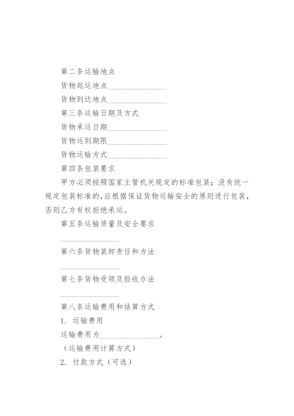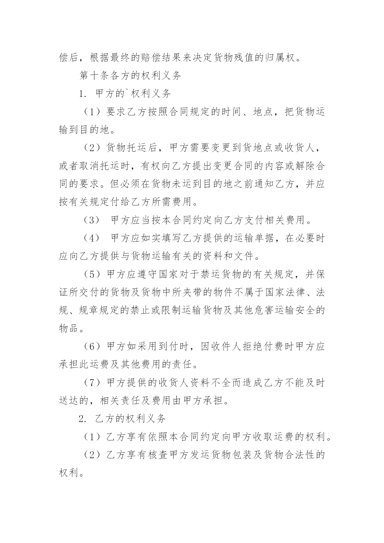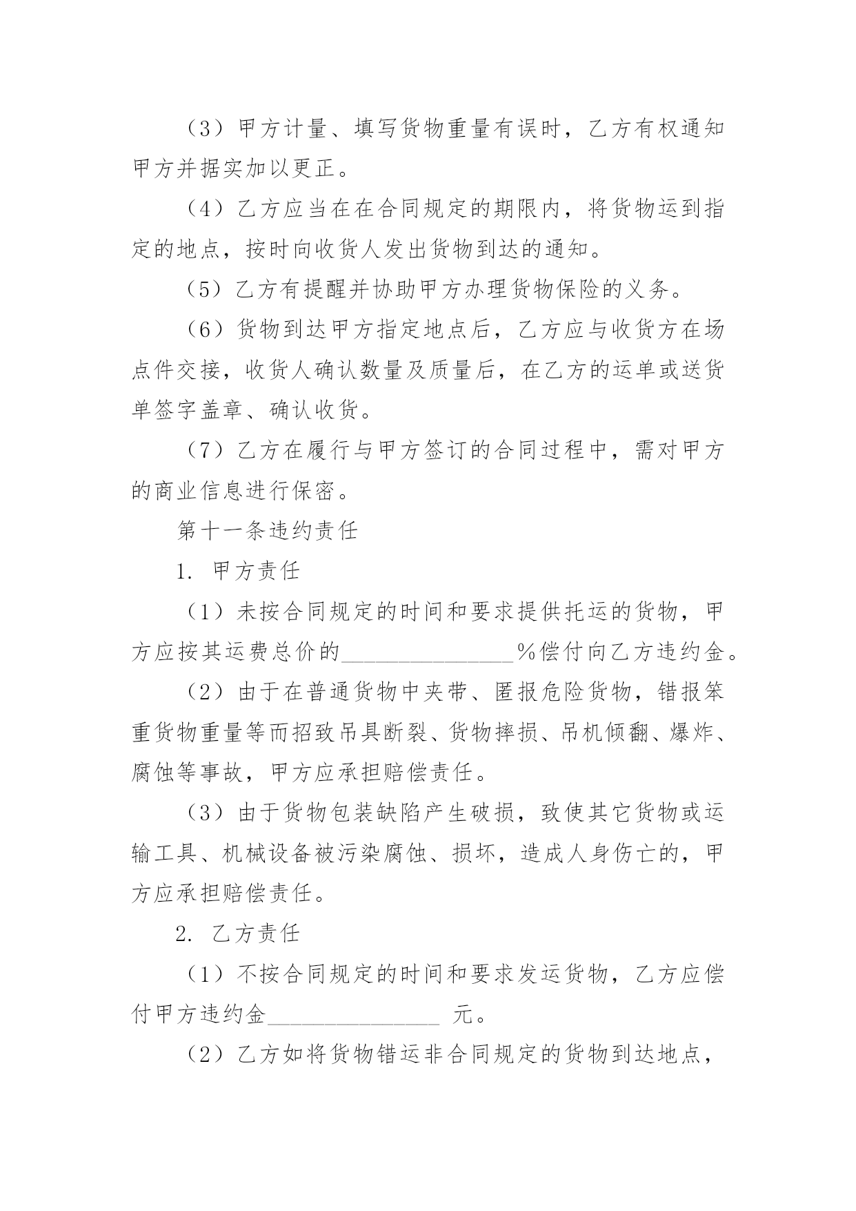 物流运输服务合同物流运输服务合同(6篇)随着时间的推移,随时随地,各种场景都有可能使用到合同,合同协调着人与人,人与事之间的关系。那么问题来了,到底应如何拟定合同呢?下面是小编为大家整理的物流运输服务合同,仅供参考,欢迎大家阅读。物流运输服务合同1托运方(甲方):_______________法定代表人:_______________法定地址:_______________承运方(乙方):_______________法定代表人:_______________法定地址:_______________合同编号:_______________根据《中华人民共和国合同法》及《中华人民共和国道路运输条例》、《道路货物运输及站场管理规定》等法律、行政法规的规定,双方本着互惠互利的原则,经过友好协商,就乙方向甲方提供运输服务及相关费用结算事宜达成一致,特签订本合同共同遵守。第一条货物名称、规格、数量、价款货物编号品名规格单位单价数量金额(元)第二条运输地点货物起运地点_______________货物到达地点_______________第三条运输日期及方式货物承运日期_______________货物运到期限_______________货物运输方式_______________第四条包装要求甲方必须按照国家主管机关规定的标准包装;没有统一规定包装标准的,应根据保证货物运输安全的原则进行包装,否则乙方有权拒绝承运。第五条运输质量及安全要求_______________第六条货物装卸责任和方法_______________第七条货物受领及验收办法_______________第八条运输费用和结算方式1.运输费用运输费用为_______________。(运输费用计算方式)2.付款方式(可选)(1)甲方应当在_______________前一次性向乙方支付_______________。(2)甲方在_______________期间分_______________次向乙方支付运费,每次支付。(3)甲方在_______________期间分_______________次向乙方支付运费,第_______________次于_______________前支付运费总价的_______________,第_______________次于_______________前支付运费总价的_______________,余款于_______________前全部支付。(4)其他支付方式_______________。3.结算方式结算方式为甲方以银行转帐或其他方式将应付款项付至乙方指定帐户。乙方在收到甲方付款后应当开具发票。(账户信息)第九条保险理赔1.保险办理和费用承担为规避运输途中因自然灾害等不可抗力因素和意外事件可能带来的风险,甲方委托乙方向保险公司购买保险,保险费用由甲方承担,保险费率为货物声明价值的______%。2.理赔规则甲方已委托乙方购买保险,货物因乙方责任发生丢失、毁损或短少时,甲方有义务按照保险公司的要求提供理赔资料,甲方损失金额以保险公司最终确定的损失金额为准,乙方在确定保险公司赔偿金额后,可先行赔付,甲方在乙方赔偿后,根据最终的赔偿结果来决定货物残值的归属权。第十条各方的权利义务1.甲方的`权利义务(1)要求乙方按照合同规定的时间、地点,把货物运输到目的地。(2)货物托运后,甲方需要变更到货地点或收货人,或者取消托运时,有权向乙方提出变更合同的内容或解除合同的要求。但必须在货物未运到目的地之前通知乙方,并应按有关规定付给乙方所需费用。(3)甲方应当按本合同约定向乙方支付相关费用。(4)甲方应如实填写乙方提供的运输单据,在必要时应向乙方提供与货物运输有关的资料和文件。(5)甲方应遵守国家对于禁运货物的有关规定,并保证所交付的货物及货物中所夹带的物件不属于国家法律、法规、规章规定的禁止或限制运输货物及其他危害运输安全的物品。(6)甲方如采用到付时,因收件人拒绝付费时甲方应承担此运费及其他费用的责任。(7)甲方提供的收货人资料不全而造成乙方不能及时送达的,相关责任及费用由甲方承担。2.乙方的权利义务(1)乙方享有依照本合同约定向甲方收取运费的权利。(2)乙方享有核查甲方发运货物包装及货物合法性的权利。(3)甲方计量、填写货物重量有误时,乙方有权通知甲方并据实加以更正。(4)乙方应当在在合同规定的期限内,将货物运到指定的地点,按时向收货人发出货物到达的通知。(5)乙方有提醒并协助甲方办理货物保险的义务。(6)货物到达甲方指定地点后,乙方应与收货方在场点件交接,收货人确认数量及质量后,在乙方的运单或送货单签字盖章、确认收货。(7)乙方在履行与甲方签订的合同过程中,需对甲方的商业信息进行保密。第十一条违约责任1.甲方责任(1)未按合同规定