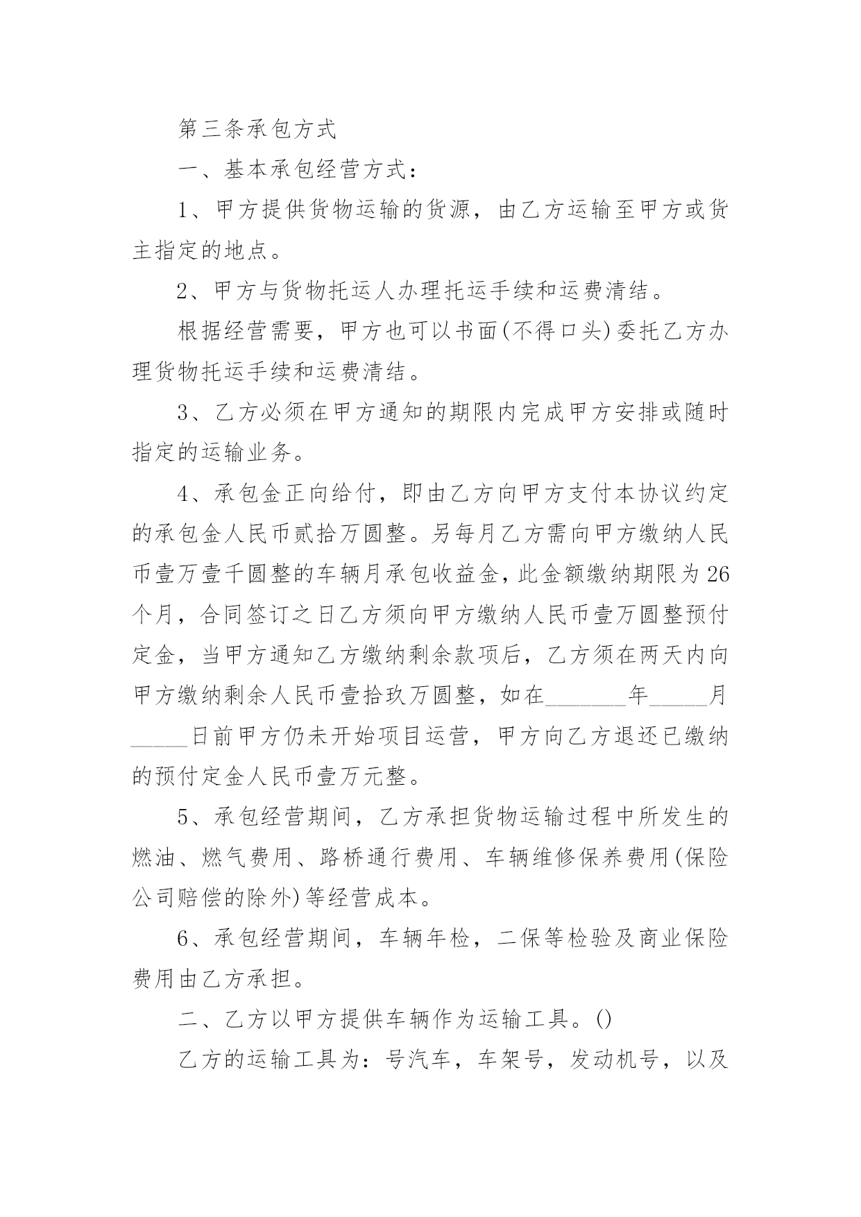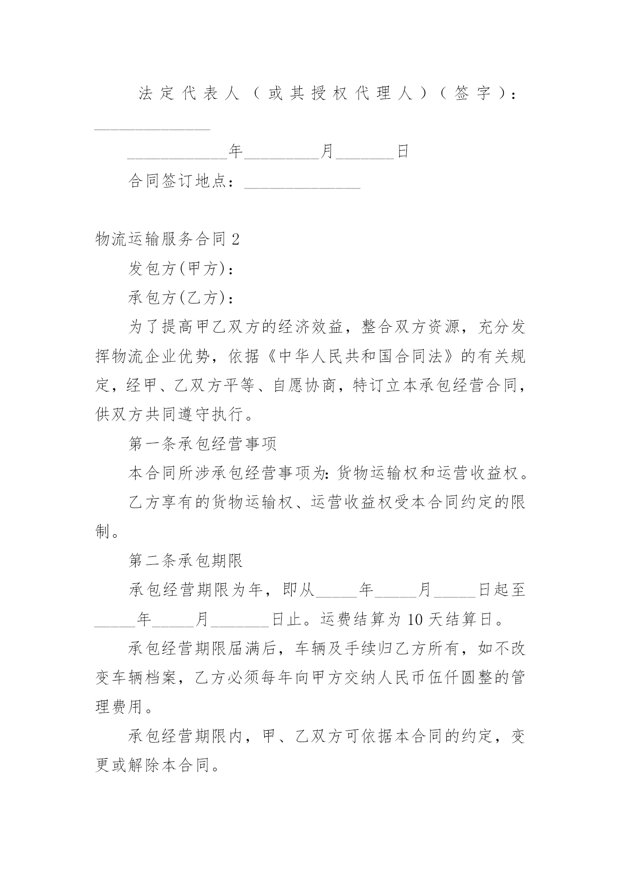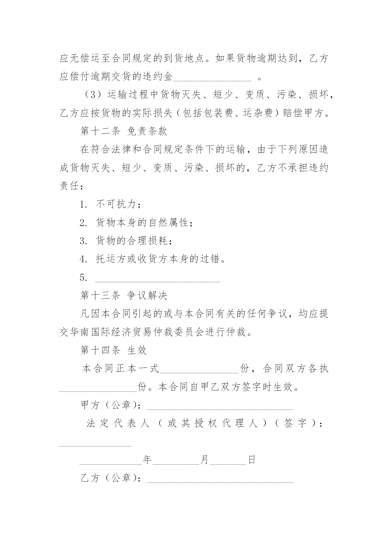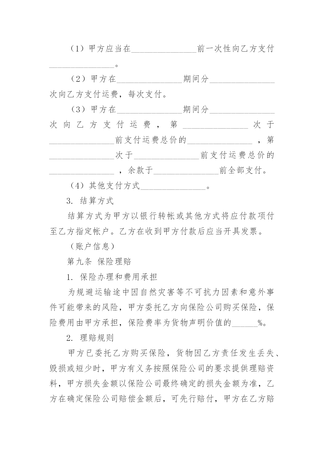 物流运输服务合同物流运输服务合同(6篇)随着时间的推移,随时随地,各种场景都有可能使用到合同,合同协调着人与人,人与事之间的关系。那么问题来了,到底应如何拟定合同呢?下面是小编为大家整理的物流运输服务合同,仅供参考,欢迎大家阅读。物流运输服务合同1托运方(甲方):_______________法定代表人:_______________法定地址:_______________承运方(乙方):_______________法定代表人:_______________法定地址:_______________合同编号:_______________根据《中华人民共和国合同法》及《中华人民共和国道路运输条例》、《道路货物运输及站场管理规定》等法律、行政法规的规定,双方本着互惠互利的原则,经过友好协商,就乙方向甲方提供运输服务及相关费用结算事宜达成一致,特签订本合同共同遵守。第一条货物名称、规格、数量、价款货物编号品名规格单位单价数量金额(元)第二条运输地点货物起运地点_______________货物到达地点_______________第三条运输日期及方式货物承运日期_______________货物运到期限_______________货物运输方式_______________第四条包装要求甲方必须按照国家主管机关规定的标准包装;没有统一规定包装标准的,应根据保证货物运输安全的原则进行包装,否则乙方有权拒绝承运。第五条运输质量及安全要求_______________第六条货物装卸责任和方法_______________第七条货物受领及验收办法_______________第八条运输费用和结算方式1.运输费用运输费用为_______________。(运输费用计算方式)2.付款方式(可选)(1)甲方应当在_______________前一次性向乙方支付_______________。(2)甲方在_______________期间分_______________次向乙方支付运费,每次支付。(3)甲方在_______________期间分_______________次向乙方支付运费,第_______________次于_______________前支付运费总价的_______________,第_______________次于_______________前支付运费总价的_______________,余款于_______________前全部支付。(4)其他支付方式_______________。3.结算方式结算方式为甲方以银行转帐或其他方式将应付款项付至乙方指定帐户。乙方在收到甲方付款后应当开具发票。(账户信息)第九条保险理赔1.保险办理和费用承担为规避运输途中因自然灾害等不可抗力因素和意外事件可能带来的风险,甲方委托乙方向保险公司购买保险,保险费用由甲方承担,保险费率为货物声明价值的______%。2.理赔规则甲方已委托乙方购买保险,货物因乙方责任发生丢失、毁损或短少时,甲方有义务按照保险公司的要求提供理赔资料,甲方损失金额以保险公司最终确定的损失金额为准,乙方在确定保险公司赔偿金额后,可先行赔付,甲方在乙方赔偿后,根据最终的赔偿结果来决定货物残值的归属权。第十条各方的权利义务1.甲方的`权利义务(1)要求乙方按照合同规定的时间、地点,把货物运输到目的地。(2)货物托运后,甲方需要变更到货地点或收货人,或者取消托运时,有权向乙方提出变更合同的内容或解除合同的要求。但必须在货物未运到目的地之前通知乙方,并应按有关规定付给乙方所需费用。(3)甲方应当按本合同约定向乙方支付相关费用。(4)甲方应如实填写乙方提供的运输单据,在必要时应向乙方提供与货物运输有关的资料和文件。(5)甲方应遵守国家对于禁运货物的有关规定,并保证所交付的货物及货物中所夹带的物件不属于国家法律、法规、规章规定的禁止或限制运输货物及其他危害运输安全的物品。(6)甲方如采用到付时,因收件人拒绝付费时甲方应承担此运费及其他费用的责任。(7)甲方提供的收货人资料不全而造成乙方不能及时送达的,相关责任及费用由甲方承担。2.乙方的权利义务(1)乙方享有依照本合同约定向甲方收取运费的权利。(2)乙方享有核查甲方发运货物包装及货物合法性的权利。(3)甲方计量、填写货物重量有误时,乙方有权通知甲方并据实加以更正。(4)乙方应当在在合同规定的期限内,将货物运到指定的地点,按时向收货人发出货物到达的通知。(5)乙方有提醒并协助甲方办理货物保险的义务。(6)货物到达甲方指定地点后,乙方应与收货方在场点件交接,收货人确认数量及质量后,在乙方的运单或送货单签字盖章、确认收货。(7)乙方在履行与甲方签订的合同过程中,需对甲方的商业信息进行保密。第十一条违约责任1.甲方责任(1)未按合同规定