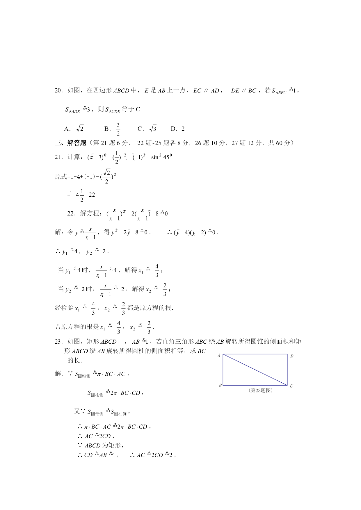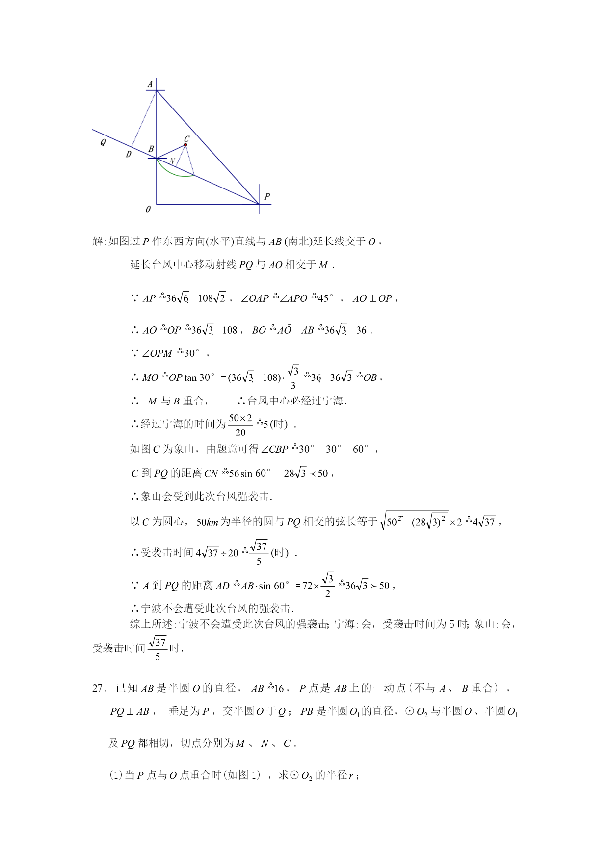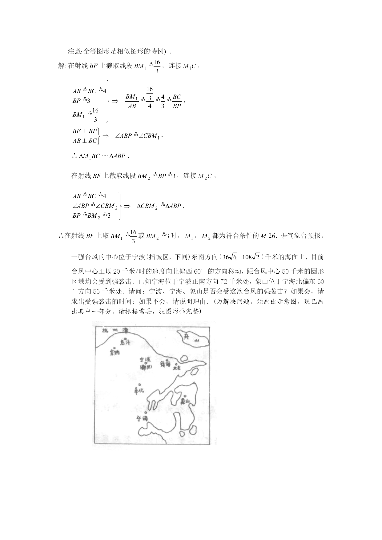 高中段招生考试数学模拟试题考生须知:1.全卷分试题和答题卷,试题卷,有三个大题,27个小题。满分为120分。考试时间为120分钟。2.答卷必须使用蓝色或黑色墨水钢笔(或圆珠笔),画图可用铅笔,答卷必须做在答题卷相应的位置上,做在试题卷上无效。3.请将县(市)、区、学校、姓名、准考证号分别填写在答题卷的规定位置上。一、填空题(每小题3分,共36分)1.如果,那么_____.2.在函数中,自变量的取值范围是________.3.已知,且,则__6_.4.据《2003年宁波市水资源公报》:2003年末我市大中型水库蓄水总量仅为293500000,比2002年末蓄水总量减少341900000.用科学记数法表示2002年末蓄水总量为__6.354___.5.如图,∥,平分交于,°,则等于_31___度.6.如图为宁波港1998年~2003年集装箱吞吐量统计图,根据图中信息可得宁波港2003年集装箱吞吐量是1999年集装箱吞吐量的___4.6___倍(结果保留两个有效数字).7.初三(1)班共有48名团员要求参加青年志愿者活动,根据实际需要,团支部从中随机选择12名团员参加这次活动,该班团员李明能参加这次活动的概率是_____.8.如图,切⊙于,=66°,则=__147____度.9.等腰三角形中,,、的长是关于的方程的两根,则的值是___25或16____.10.仔细观察下列图案,并按规律在横线上画出合适的图形.11.已知:,化简__-2__.12.已知二次函数的图象交轴于、两点,交轴于点,且是直角三角形,请写出符合要求的一个二次函数的解析式:___:__.二、选择题(每小题3分,共24分。在每小题给出的四个选项中,只有一项符合题目要求)13.抛物线的顶点坐标为AA.(2,1)B.(2,-1)C.(-2,-1)D.(-2,1)14.如图,在中,、分别是、边的中点,且,,,则等于CA.5B.7C.8D.1215.当时,点在DA.第一象限B.第二象限C.第三象限D.第四象限16.已知关于的方程有两个不相等的实根,那么的最大整数是DA.2B.-1C.0D.117.电压一定时,电流与电阻的函数图象大致是A18.如图,切⊙于,割线经过圆心,交⊙于B、C两点,若,,则的值为BA.B.C.D.19.已知、为实数,且,设,,则、的大小关系是BA.B.C.D.不确定20.如图,在四边形中,是上一点,∥,∥,若,,则等于CA.B.C.D.2三、解答题(第21题6分,22题~25题各8分,26题10分,27题12分,共60分)21.计算:原式=1-4+(-1)-=2222.解方程:解:令,得.∴.∴,.当时,,解得;当时,,解得;经检验,都是原方程的根.∴原方程的根是,.23.如图,矩形中,,若直角三角形绕旋转所得圆锥的侧面积和矩形绕旋转所得圆柱的侧面积相等,求的长.解:∵,,又∵,∴,∴.∵为矩形,∴,∴,在,,∴.24.为缓解用电紧张矛盾,某电力公司特制定了新的用电收费标准,每月用电量(度)与应付电费(元)的关系如图所示.(1)根据图象,请分别求出当和时,与的函数关系式.当月用电量时,是的正比例函数.设,∵当时,,∴,∴.∴当月用电量时,是的一次函数.设,∵当时,;当时,.∴∴∴(2)请回答:当每月用电量不超过50度时,收费标准是_每度0.50元_;当每月用电量超过50度时,收费标准是_其中的50度每度0.5元,超过部分每度0.9元__.25.如图,已知点是边长为4的正方形内一点,且,,垂足是.请在射线上找一点,使以点、、为顶点的三角形与相似(请注意:全等图形是相似图形的特例).解:在射线上截取线段,连接,,,∴~.在射线上截取线段,连接,.∴在射线上取或时,,都为符合条件的26.据气象台预报,一强台风的中心位于宁波(指城区,下同)东南方向()千米的海面上,目前台风中心正以20千米/时的速度向北偏西60°的方向移动,距台风中心50千米的圆形区域均会受到强袭击.已知宁海位于宁波正南方向72千米处,象山位于宁海北偏东60°方向56千米处.请问:宁波、宁海、象山是否会受这次台风的强袭击?如果会,请求出受强袭击的时间;如果不会,请说明理由.(为解决问题,须画出示意图,现已画出其中一部分,请根据需要,把图形画完整)解:如图过作东西方向(水平)直线与(南北)延长线交于,延长台风中心移动射线与相交于.∵,45°,,∴,.∵30°,∴30°=,∴与重合,∴台风中心必经过宁海.∴经过宁海的时间为(时).如图为