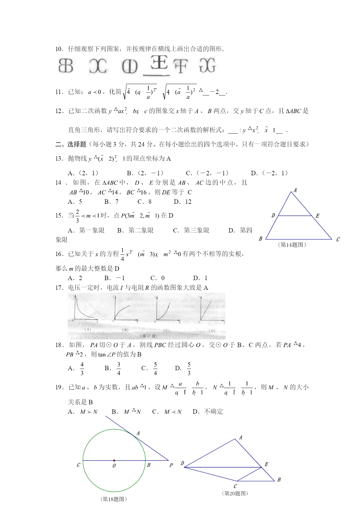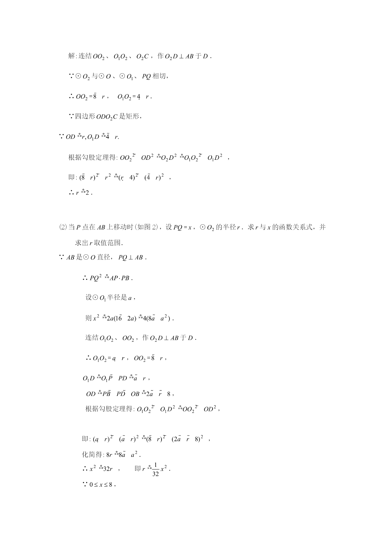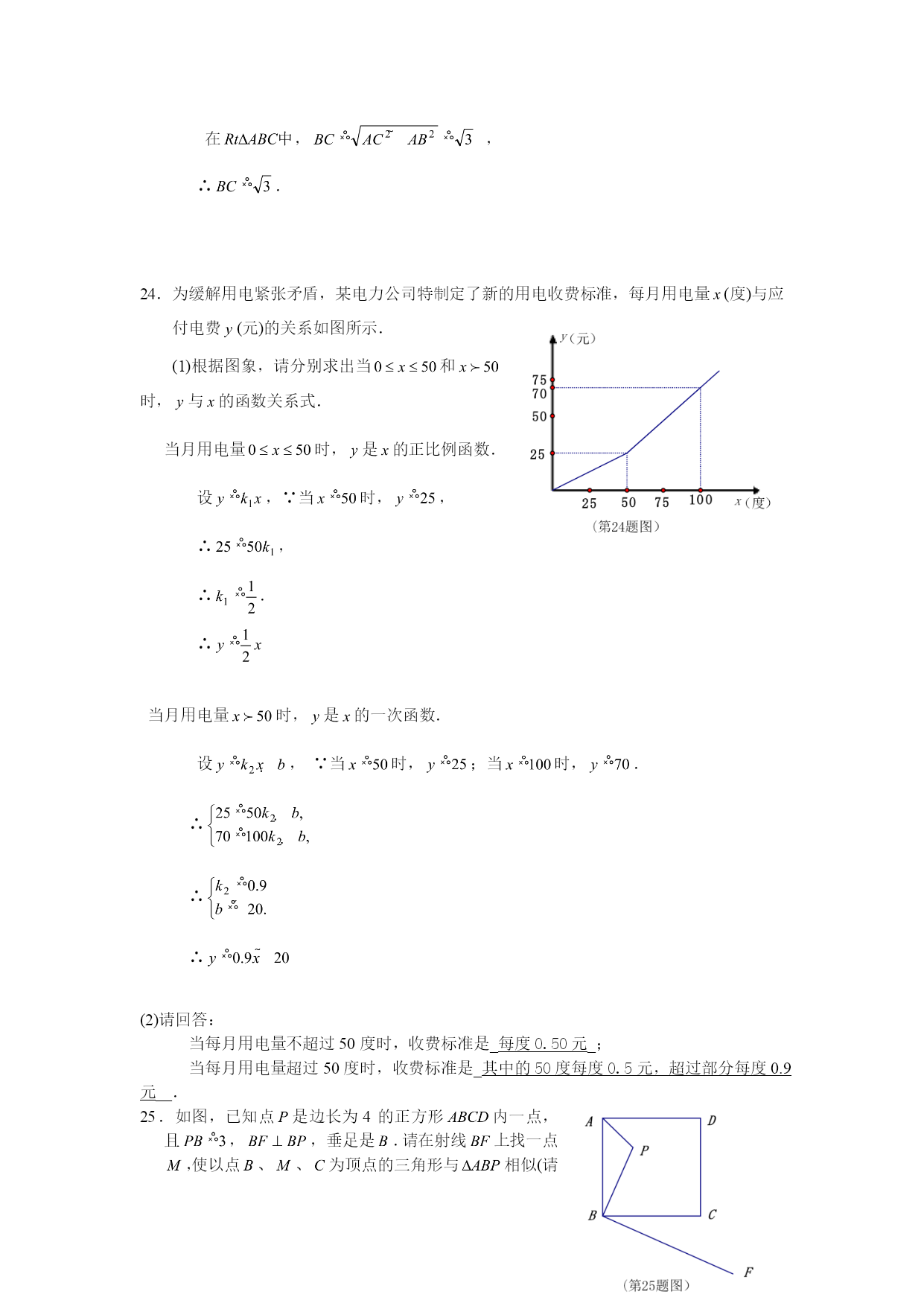 高中段招生考试数学模拟试题考生须知:1.全卷分试题和答题卷,试题卷,有三个大题,27个小题。满分为120分。考试时间为120分钟。2.答卷必须使用蓝色或黑色墨水钢笔(或圆珠笔),画图可用铅笔,答卷必须做在答题卷相应的位置上,做在试题卷上无效。3.请将县(市)、区、学校、姓名、准考证号分别填写在答题卷的规定位置上。一、填空题(每小题3分,共36分)1.如果,那么_____.2.在函数中,自变量的取值范围是________.3.已知,且,则__6_.4.据《2003年宁波市水资源公报》:2003年末我市大中型水库蓄水总量仅为293500000,比2002年末蓄水总量减少341900000.用科学记数法表示2002年末蓄水总量为__6.354___.5.如图,∥,平分交于,°,则等于_31___度.6.如图为宁波港1998年~2003年集装箱吞吐量统计图,根据图中信息可得宁波港2003年集装箱吞吐量是1999年集装箱吞吐量的___4.6___倍(结果保留两个有效数字).7.初三(1)班共有48名团员要求参加青年志愿者活动,根据实际需要,团支部从中随机选择12名团员参加这次活动,该班团员李明能参加这次活动的概率是_____.8.如图,切⊙于,=66°,则=__147____度.9.等腰三角形中,,、的长是关于的方程的两根,则的值是___25或16____.10.仔细观察下列图案,并按规律在横线上画出合适的图形.11.已知:,化简__-2__.12.已知二次函数的图象交轴于、两点,交轴于点,且是直角三角形,请写出符合要求的一个二次函数的解析式:___:__.二、选择题(每小题3分,共24分。在每小题给出的四个选项中,只有一项符合题目要求)13.抛物线的顶点坐标为AA.(2,1)B.(2,-1)C.(-2,-1)D.(-2,1)14.如图,在中,、分别是、边的中点,且,,,则等于CA.5B.7C.8D.1215.当时,点在DA.第一象限B.第二象限C.第三象限D.第四象限16.已知关于的方程有两个不相等的实根,那么的最大整数是DA.2B.-1C.0D.117.电压一定时,电流与电阻的函数图象大致是A18.如图,切⊙于,割线经过圆心,交⊙于B、C两点,若,,则的值为BA.B.C.D.19.已知、为实数,且,设,,则、的大小关系是BA.B.C.D.不确定20.如图,在四边形中,是上一点,∥,∥,若,,则等于CA.B.C.D.2三、解答题(第21题6分,22题~25题各8分,26题10分,27题12分,共60分)21.计算:原式=1-4+(-1)-=2222.解方程:解:令,得.∴.∴,.当时,,解得;当时,,解得;经检验,都是原方程的根.∴原方程的根是,.23.如图,矩形中,,若直角三角形绕旋转所得圆锥的侧面积和矩形绕旋转所得圆柱的侧面积相等,求的长.解:∵,,又∵,∴,∴.∵为矩形,∴,∴,在,,∴.24.为缓解用电紧张矛盾,某电力公司特制定了新的用电收费标准,每月用电量(度)与应付电费(元)的关系如图所示.(1)根据图象,请分别求出当和时,与的函数关系式.当月用电量时,是的正比例函数.设,∵当时,,∴,∴.∴当月用电量时,是的一次函数.设,∵当时,;当时,.∴∴∴(2)请回答:当每月用电量不超过50度时,收费标准是_每度0.50元_;当每月用电量超过50度时,收费标准是_其中的50度每度0.5元,超过部分每度0.9元__.25.如图,已知点是边长为4的正方形内一点,且,,垂足是.请在射线上找一点,使以点、、为顶点的三角形与相似(请注意:全等图形是相似图形的特例).解:在射线上截取线段,连接,,,∴~.在射线上截取线段,连接,.∴在射线上取或时,,都为符合条件的26.据气象台预报,一强台风的中心位于宁波(指城区,下同)东南方向()千米的海面上,目前台风中心正以20千米/时的速度向北偏西60°的方向移动,距台风中心50千米的圆形区域均会受到强袭击.已知宁海位于宁波正南方向72千米处,象山位于宁海北偏东60°方向56千米处.请问:宁波、宁海、象山是否会受这次台风的强袭击?如果会,请求出受强袭击的时间;如果不会,请说明理由.(为解决问题,须画出示意图,现已画出其中一部分,请根据需要,把图形画完整)解:如图过作东西方向(水平)直线与(南北)延长线交于,延长台风中心移动射线与相交于.∵,45°,,∴,.∵30°,∴30°=,∴与重合,∴台风中心必经过宁海.∴经过宁海的时间为(时).如图为