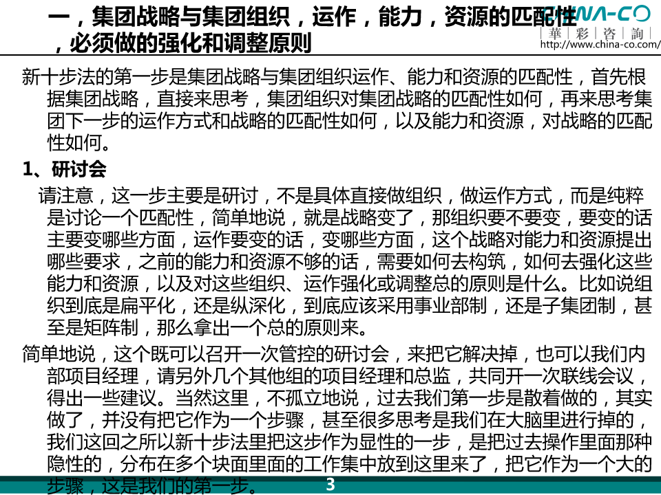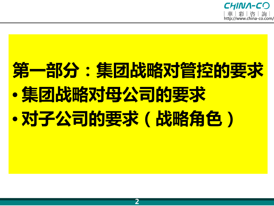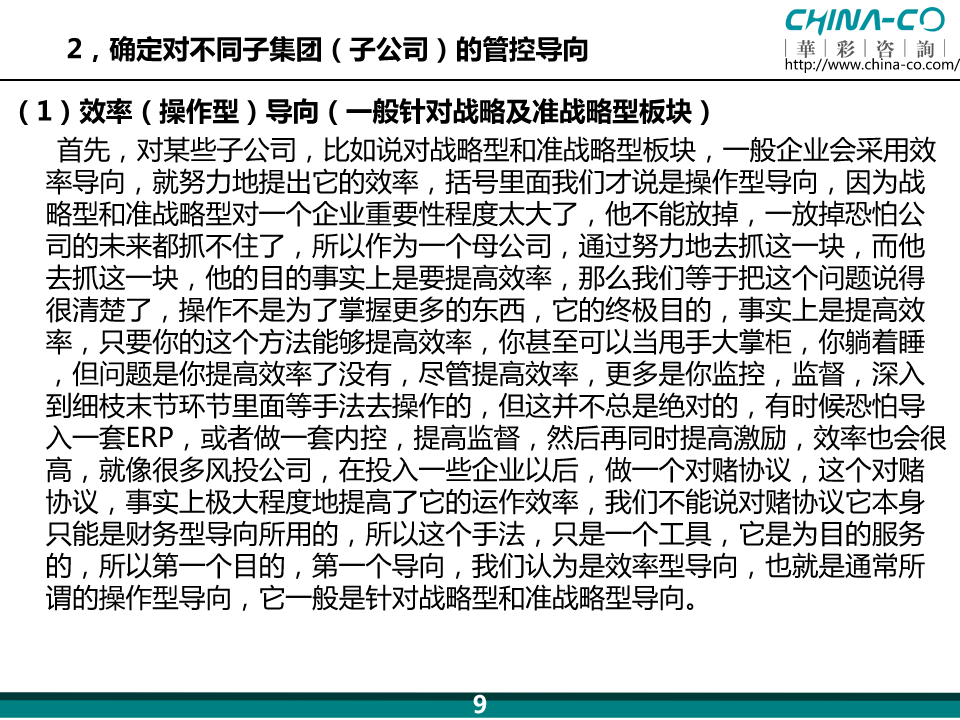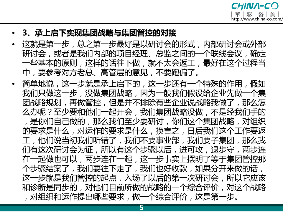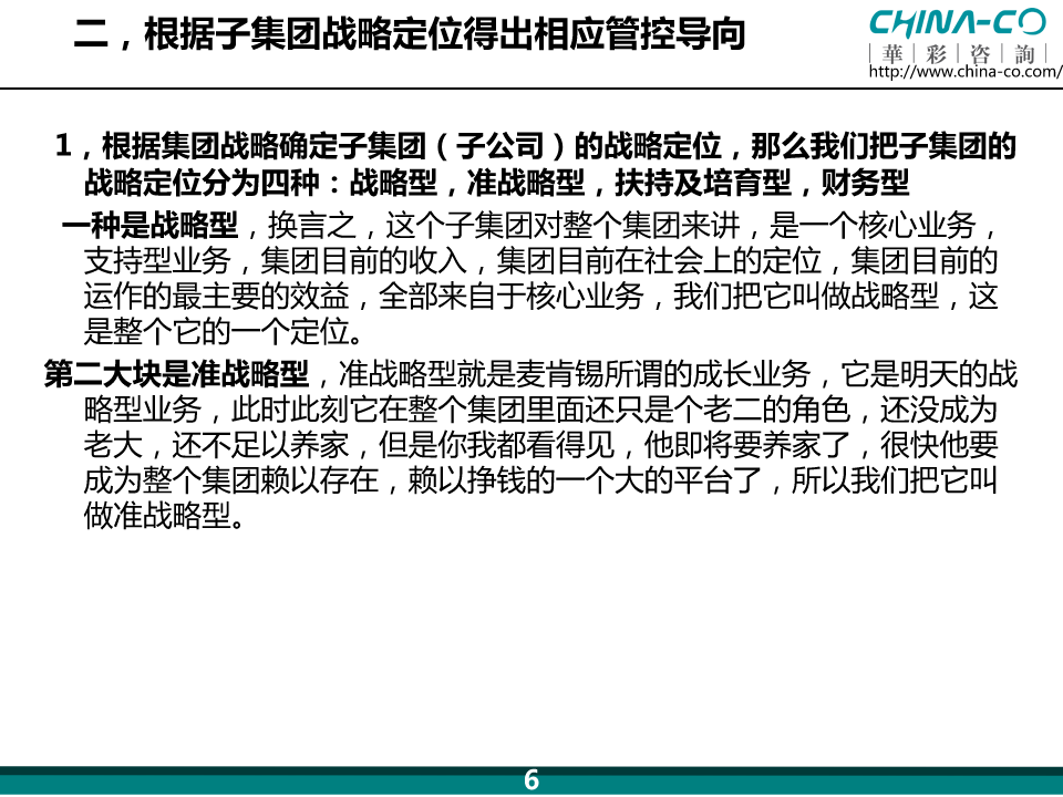 与管理者们谈谈管控最新发展白万纲博士http://www.china-co.com/1http://www.china-co.com/第一部分:集团战略对管控的要求•集团战略对母公司的要求•对子公司的要求(战略角色)2一,集团战略与集团组织,运作,能力,资源的匹配性,必须做的强化和调整原则http://www.china-co.com/新十步法的第一步是集团战略与集团组织运作、能力和资源的匹配性,首先根据集团战略,直接来思考,集团组织对集团战略的匹配性如何,再来思考集团下一步的运作方式和战略的匹配性如何,以及能力和资源,对战略的匹配性如何。1、研讨会请注意,这一步主要是研讨,不是具体直接做组织,做运作方式,而是纯粹是讨论一个匹配性,简单地说,就是战略变了,那组织要不要变,要变的话主要变哪些方面,运作要变的话,变哪些方面,这个战略对能力和资源提出哪些要求,之前的能力和资源不够的话,需要如何去构筑,如何去强化这些能力和资源,以及对这些组织、运作强化或调整总的原则是什么。比如说组织到底是扁平化,还是纵深化,到底应该采用事业部制,还是子集团制,甚至是矩阵制,那么拿出一个总的原则来。简单地说,这个既可以召开一次管控的研讨会,来把它解决掉,也可以我们内部项目经理,请另外几个其他组的项目经理和总监,共同开一次联线会议,得出一些建议。当然这里,不孤立地说,过去我们第一步是散着做的,其实做了,并没有把它作为一个步骤,甚至很多思考是我们在大脑里进行掉的,我们这回之所以新十步法里把这步作为显性的一步,是把过去操作里面那种隐性的,分布在多个块面里面的工作集中放到这里来了,把它作为一个大的步骤,这是我们的第一步。3http://www.china-co.com/2、形成集团组织管控的总体大原则那第一步的总体文案,就应该是一个PPT,来揭示出来。比如说在组织上面,我们提出来,至少要提出来一个大的概念,采用事业部还是子集团,甚至是矩阵式,或者维持原状不动,或者要把下面的四级、五级法人要迅速削减掉,你至少对组织应该有这么一个要求,或者就要求相同板块放到同一个框框里,在之上建设一个子集团,或者同一个太大的板块一切为二,为三,裂解成几个子集团,等等,你本身要有一个大的原则出来。大家不要害怕这一步,这一步怎么一下子能讨论清楚这个馒头是不是太大,因为这个总体原则,如果对方参与进来,我们就可以把对方的很多意图提前摸清楚,对方倾向于什么,但同时不排斥哪些思考,这是总的一个思考。而运作的思考上来,你至少要拿出一个概念来,比如说对方对强势总部这个概念接不接受,对方对子公司的改造,到底下手狠到什么程度,到底能不能最终把它搞成成本中心,实在不能搞成成本中心的话,那么哪些动手术狠一点,哪些对手术轻一点,另外从老总,从整个集团来看的话,哪个板块不易动手术动得太狠,甚至是单列,不纳入到这个管控体系里来,这都属于在运作方面,你要得出的一些原则,要做的一些思考。4http://www.china-co.com/•3、承上启下实现集团战略与集团管控的对接•这就是第一步,总之第一步最好是以研讨会的形式,内部研讨会或外部研讨会,或者是我们内部的项目经理、总监之间的一个联线会议,确定一些基本的原则,这样的话往下做,就不太会返工,最好在这个过程当中,要参考对方老总、高管层的意见,不要跑偏了。•简单地说,这一步就是承上启下的,这一步还有一个特殊的作用,假如我们只做这一步,没做集团战略,因为一般我们假设给企业先做一个集团战略规划,再做管控,但是并不排除有些企业说战略我做了,那么怎么办呢?至少要和他们一起开会,我们集团战略没做,不是经我们手的,是你们自己做的,那么我们至少要研讨,你们这个集团战略,对组织的要求是什么,对运作的要求是什么,换言之,日后我们这个工作要返工,他们说当初我们听错了,我们不要事业部,我们要子集团,那么我们有这次研讨会为证,所以有这个步骤以后,进可攻,退步守,两步连在一起做也可以,两步连在一起,这一步事实上摆明了等于集团管控那个步骤结案了,我们要往下走了,我们也好收款,如果分开来做的话,这一步就是我们管控的起点,入场了以后的第一次研讨会,所以它应该和诊断是同步的,对他们目前所做的战略的一个综合评价,对这个战略,对组织和运作提出哪些要求,做一个综合评价,这是第一步。5二,根据子集团战略定位得出相应管控导向http://www.china-co.com/1,根据集团战略确定子集团(子公司)的战略定位,那么我们把子集团的战略定位分为四种:战略型,准战略型,扶持及培育型,财务型一种是战略型,换言之,这个