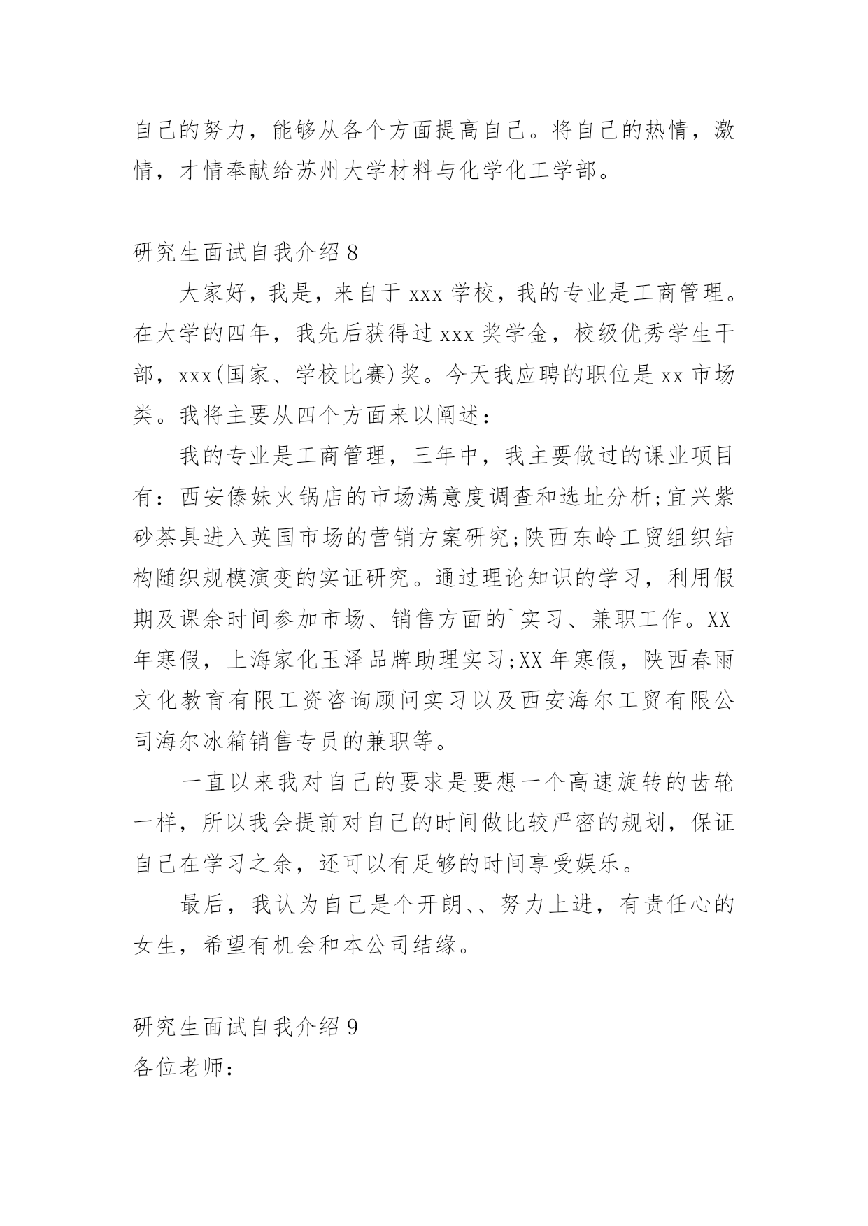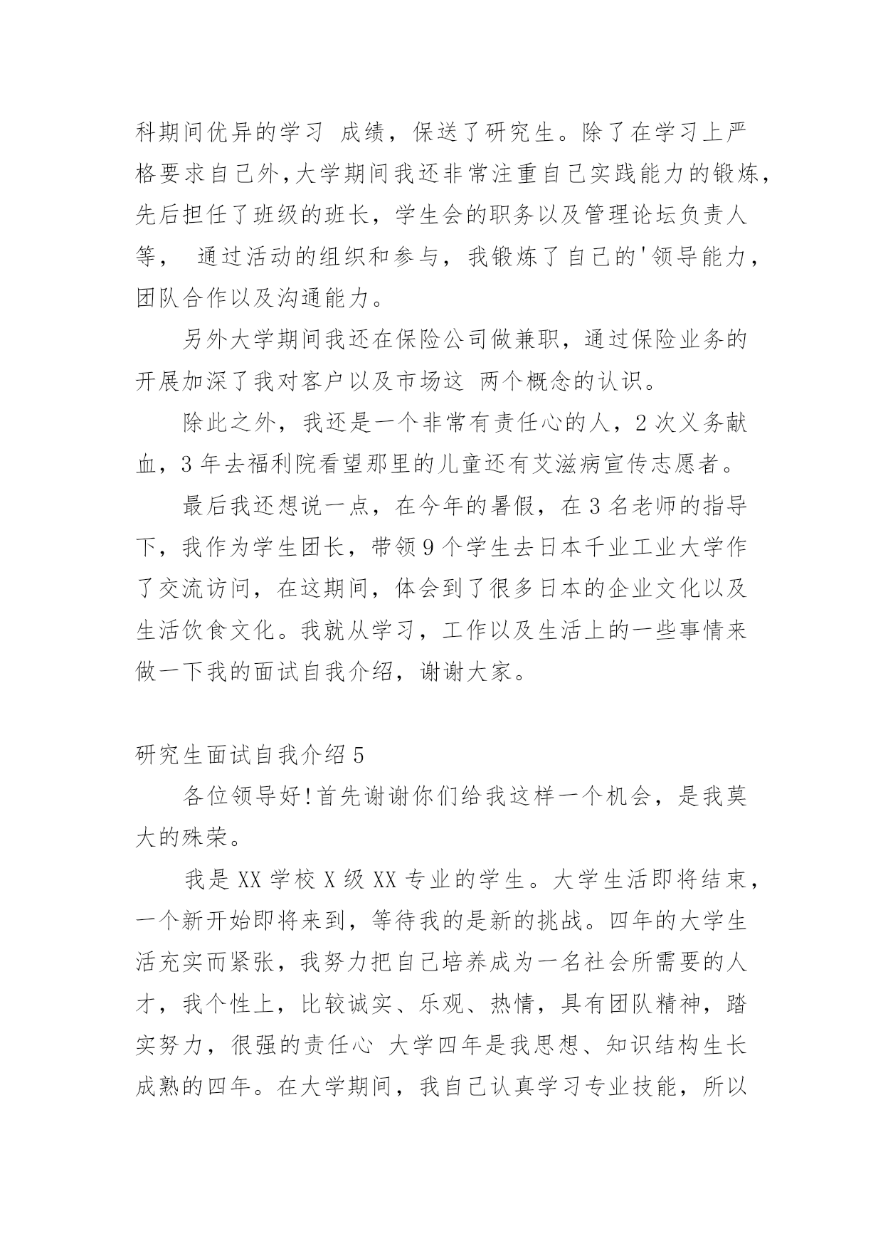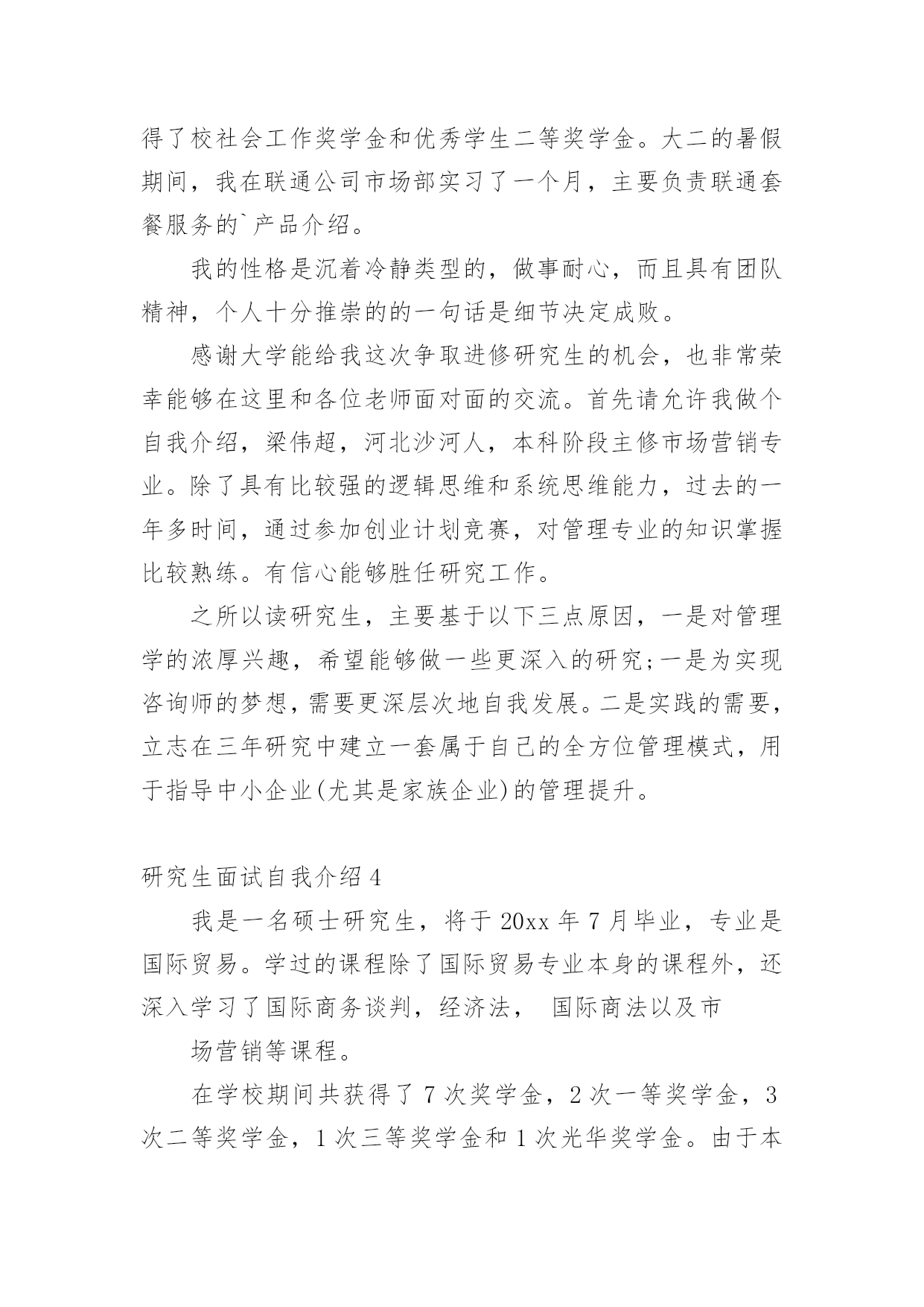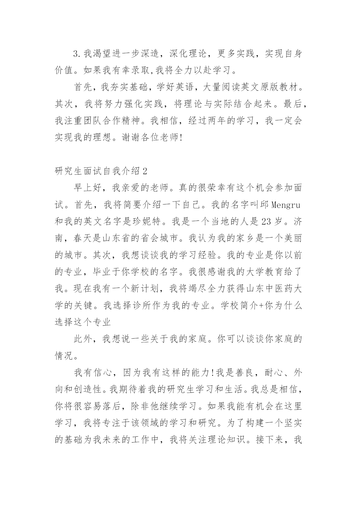 研究生面试自我介绍来到一个新的地方后,常常需要我们进行自我介绍,自我介绍可以唤起他人对我们的兴趣。那么什么样的自我介绍才合适呢?下面是小编帮大家整理的研究生面试自我介绍,希望能够帮助到大家。研究生面试自我介绍1各位老师:你们好!我很荣幸能参加这次面试,我渴望在各位老师的指导下进一步成长。我叫xx,x人,xxx大学xxx专业应届本科生,大学四年的本科课程以xxx为核心开展。我认真负责,吃苦耐劳,对生活充满热情,业余爱好:写作、篮球、羽毛球和旅行。为了感受东部的繁荣,20xx年暑假经历了南京、上海、杭州、厦门和深圳的东部之旅。我选择xxx的.理由:1.大学是一所历史悠久、学术氛围浓厚的学校,作为我国最著名的大学,她能为学生进一步成长提供广阔的发展空间。学生以求实创新而闻名海内外。xx学系创始于1936年,历经xx等老一代和在座各位老师一代代的传承发扬,已成为我国顶尖的xx系。2.我对xx研究具有浓厚的兴趣。(跨考建议考生这里可以自由扩散一些)3.我渴望进一步深造,深化理论,更多实践,实现自身价值。如果我有幸录取,我将全力以赴学习。首先,我夯实基础,学好英语,大量阅读英文原版教材。其次,我将努力强化实践,将理论与实际结合起来。最后,我注重团队合作精神。我相信,经过两年的学习,我一定会实现我的理想。谢谢各位老师!研究生面试自我介绍2早上好,我亲爱的老师。真的很荣幸有这个机会参加面试。首先,我将简要介绍一下自己。我的名字叫邱Mengru和我的英文名字是珍妮特。我是一个当地的人是23岁。济南,春天是山东省的省会城市。我认为我的家乡是一个美丽的城市。其次,我想谈谈我的学习经验。我的专业是你以前的专业,毕业于你学校的名字。我很感谢我的大学教育给了我。现在我有一个新计划,我将竭尽全力获得山东中医药大学的关键。我选择诊所作为我的专业。学校简介+你为什么选择这个专业此外,我想说一些关于我的家庭。你可以谈谈你家庭的情况。我有信心,因为我有这样的能力!我是善良,耐心、外向和创造性。我期待着我的研究生学习和生活。我总是相信,你将很容易落后,除非他继续学习。如果我能有机会在这里学习,我将专注于该领域的学习和研究。为了构建一个坚实的基础为我未来的工作中,我将关注理论知识。接下来,我想做一些实际工作与我的导师和同学的'帮助。通过这个,我肯定会不能从教科书上获得的东西。此外,我将参加研究生考试的几个原因。首先,我热爱我的专业。我是一个努力工作的学生尤其是做我感兴趣的东西。我将尽我最大努力解决任何问题,无论多么困难。我着迷于大师的清爽和深刻的风格。其次,我喜欢在大学的感觉。它充满了朝气。我的学术氛围深深吸引。最重要的是,它是我的荣幸开放给你的教学我的耳朵。此外,更多的学习经历不等于成功,而这是完全成功的一种方式。这是我的简单而清晰的原因我把研究生考试。在业余时间,我喜欢阅读书籍,在网上冲浪,听音乐喜欢流行,经典,或轻音乐,因为他们可以让我感到放松。没有人能保持工作效率,因此适当的娱乐是必须的。此外,我坚持做一些体育锻炼,比如跑步,游泳和羽毛球。通过这样做,我们能够始终保持健康。这是所有。谢谢你给我这样一个宝贵的机会!研究生面试自我介绍3我叫xx-x,是本科应届毕业生,就读于浙江财经学院,所学专业是信息管理与信息系统。大学学习期间,我担任班长一职,经常组织班级活动,培养了良好的人际交往能力。同时,在大学里,我又积极参加各种活动,在浙江省电子商务竞赛中,我所在的队伍的作品获得的优异的成绩。另外,我没有放松课程的学习,曾获得了校社会工作奖学金和优秀学生二等奖学金。大二的暑假期间,我在联通公司市场部实习了一个月,主要负责联通套餐服务的`产品介绍。我的性格是沉着冷静类型的,做事耐心,而且具有团队精神,个人十分推崇的的一句话是细节决定成败。感谢大学能给我这次争取进修研究生的机会,也非常荣幸能够在这里和各位老师面对面的交流。首先请允许我做个自我介绍,梁伟超,河北沙河人,本科阶段主修市场营销专业。除了具有比较强的逻辑思维和系统思维能力,过去的一年多时间,通过参加创业计划竞赛,对管理专业的知识掌握比较熟练。有信心能够胜任研究工作。之所以读研究生,主要基于以下三点原因,一是对管理学的浓厚兴趣,希望能够做一些更深入的研究;一是为实现咨询师的梦想,需要更深层次地自我发展。二是实践的需要,立志在三年研究中建立一套属于自己的全方位管理模式,用于指导中小企业(尤其是家族企业)的管理提升。研究生面试自我介绍4我是一名硕士研究生,将于20xx年7月毕业,专业是国际贸易。学过的课程除了国际贸易专业本身的课程外,还深入学习了国际商务谈判,经济法,国际商法以及市场营销等课程。在学校期间共获得了7次奖学金,2次一等奖学金,3次二等奖学金,1次三等奖学金和1次光华奖学金。由于本科期间优异的学习成绩,保送