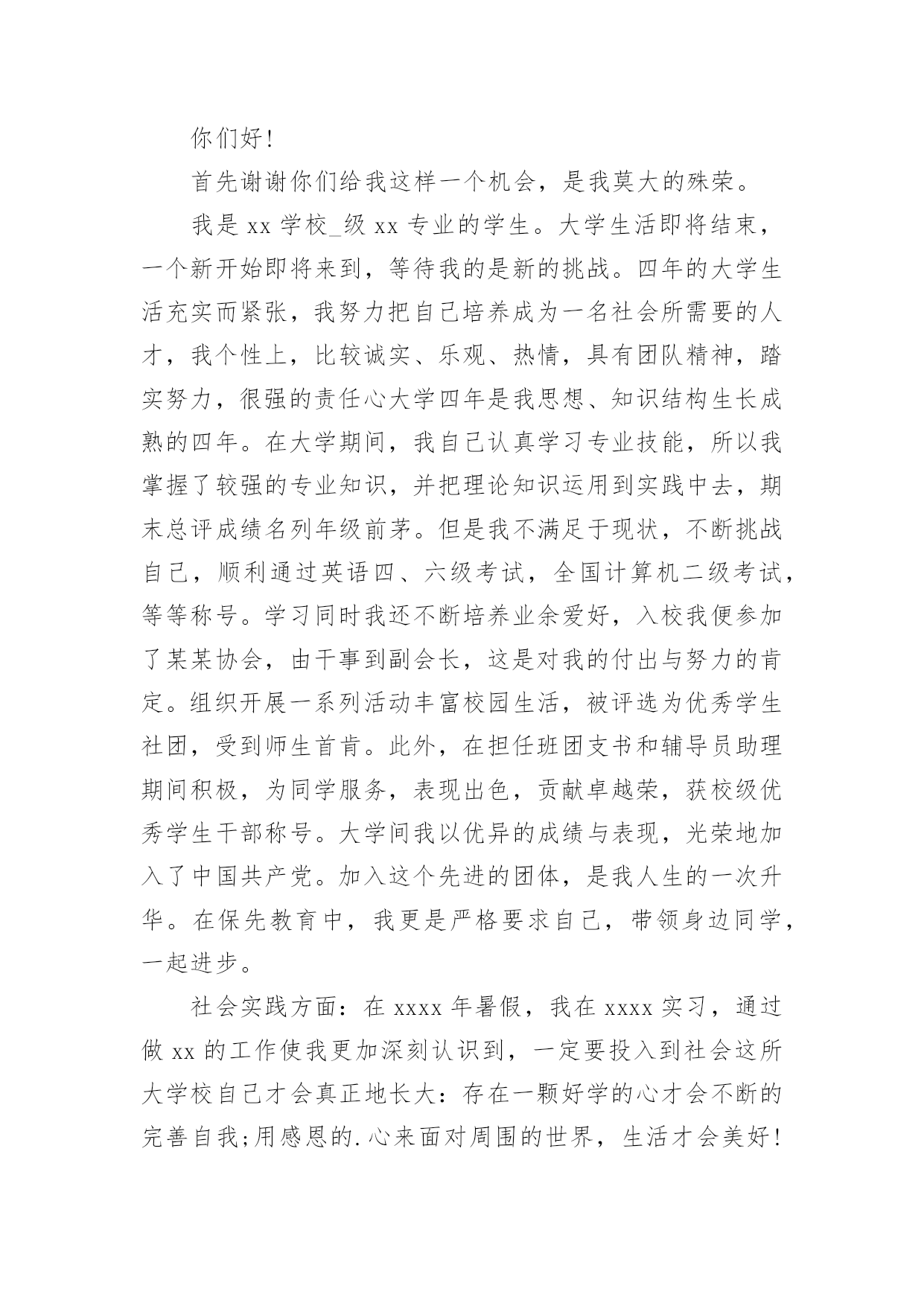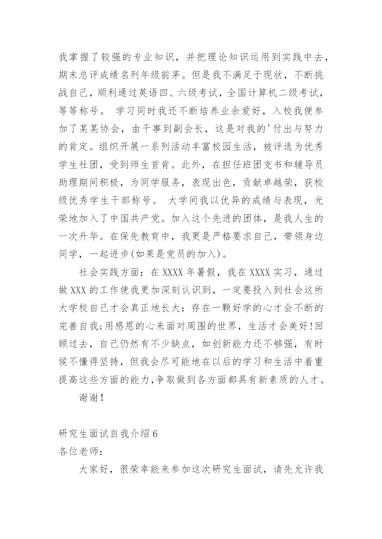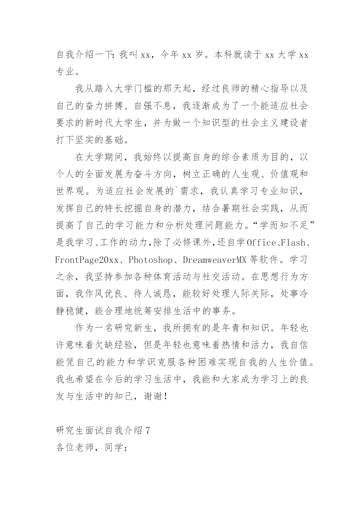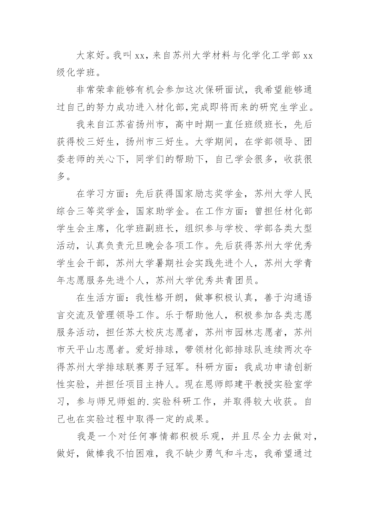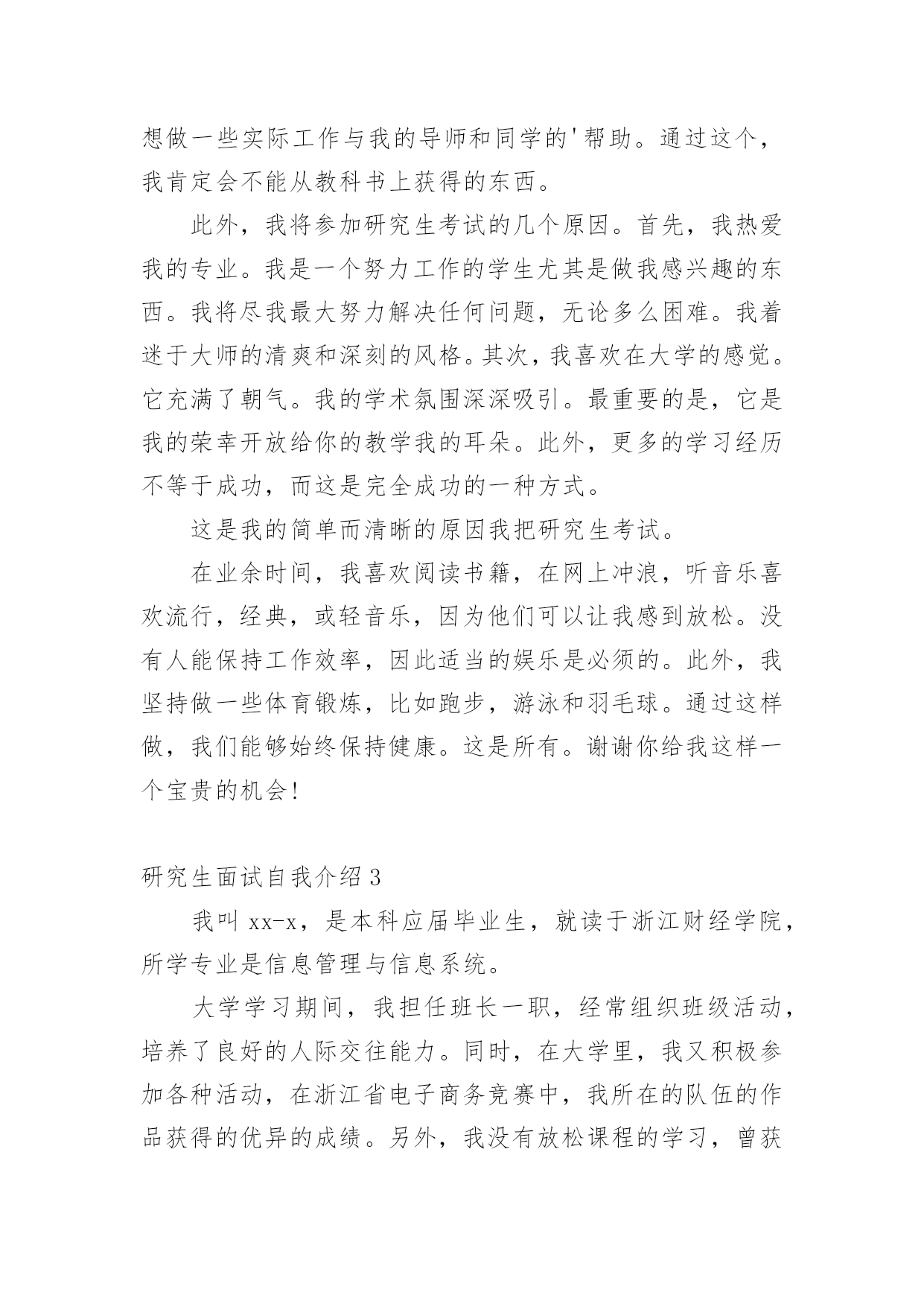 研究生面试自我介绍来到一个新的地方后,常常需要我们进行自我介绍,自我介绍可以唤起他人对我们的兴趣。那么什么样的自我介绍才合适呢?下面是小编帮大家整理的研究生面试自我介绍,希望能够帮助到大家。研究生面试自我介绍1各位老师:你们好!我很荣幸能参加这次面试,我渴望在各位老师的指导下进一步成长。我叫xx,x人,xxx大学xxx专业应届本科生,大学四年的本科课程以xxx为核心开展。我认真负责,吃苦耐劳,对生活充满热情,业余爱好:写作、篮球、羽毛球和旅行。为了感受东部的繁荣,20xx年暑假经历了南京、上海、杭州、厦门和深圳的东部之旅。我选择xxx的.理由:1.大学是一所历史悠久、学术氛围浓厚的学校,作为我国最著名的大学,她能为学生进一步成长提供广阔的发展空间。学生以求实创新而闻名海内外。xx学系创始于1936年,历经xx等老一代和在座各位老师一代代的传承发扬,已成为我国顶尖的xx系。2.我对xx研究具有浓厚的兴趣。(跨考建议考生这里可以自由扩散一些)3.我渴望进一步深造,深化理论,更多实践,实现自身价值。如果我有幸录取,我将全力以赴学习。首先,我夯实基础,学好英语,大量阅读英文原版教材。其次,我将努力强化实践,将理论与实际结合起来。最后,我注重团队合作精神。我相信,经过两年的学习,我一定会实现我的理想。谢谢各位老师!研究生面试自我介绍2早上好,我亲爱的老师。真的很荣幸有这个机会参加面试。首先,我将简要介绍一下自己。我的名字叫邱Mengru和我的英文名字是珍妮特。我是一个当地的人是23岁。济南,春天是山东省的省会城市。我认为我的家乡是一个美丽的城市。其次,我想谈谈我的学习经验。我的专业是你以前的专业,毕业于你学校的名字。我很感谢我的大学教育给了我。现在我有一个新计划,我将竭尽全力获得山东中医药大学的关键。我选择诊所作为我的专业。学校简介+你为什么选择这个专业此外,我想说一些关于我的家庭。你可以谈谈你家庭的情况。我有信心,因为我有这样的能力!我是善良,耐心、外向和创造性。我期待着我的研究生学习和生活。我总是相信,你将很容易落后,除非他继续学习。如果我能有机会在这里学习,我将专注于该领域的学习和研究。为了构建一个坚实的基础为我未来的工作中,我将关注理论知识。接下来,我想做一些实际工作与我的导师和同学的'帮助。通过这个,我肯定会不能从教科书上获得的东西。此外,我将参加研究生考试的几个原因。首先,我热爱我的专业。我是一个努力工作的学生尤其是做我感兴趣的东西。我将尽我最大努力解决任何问题,无论多么困难。我着迷于大师的清爽和深刻的风格。其次,我喜欢在大学的感觉。它充满了朝气。我的学术氛围深深吸引。最重要的是,它是我的荣幸开放给你的教学我的耳朵。此外,更多的学习经历不等于成功,而这是完全成功的一种方式。这是我的简单而清晰的原因我把研究生考试。在业余时间,我喜欢阅读书籍,在网上冲浪,听音乐喜欢流行,经典,或轻音乐,因为他们可以让我感到放松。没有人能保持工作效率,因此适当的娱乐是必须的。此外,我坚持做一些体育锻炼,比如跑步,游泳和羽毛球。通过这样做,我们能够始终保持健康。这是所有。谢谢你给我这样一个宝贵的机会!研究生面试自我介绍3我叫xx-x,是本科应届毕业生,就读于浙江财经学院,所学专业是信息管理与信息系统。大学学习期间,我担任班长一职,经常组织班级活动,培养了良好的人际交往能力。同时,在大学里,我又积极参加各种活动,在浙江省电子商务竞赛中,我所在的队伍的作品获得的优异的成绩。另外,我没有放松课程的学习,曾获得了校社会工作奖学金和优秀学生二等奖学金。大二的暑假期间,我在联通公司市场部实习了一个月,主要负责联通套餐服务的`产品介绍。我的性格是沉着冷静类型的,做事耐心,而且具有团队精神,个人十分推崇的的一句话是细节决定成败。感谢大学能给我这次争取进修研究生的机会,也非常荣幸能够在这里和各位老师面对面的交流。首先请允许我做个自我介绍,梁伟超,河北沙河人,本科阶段主修市场营销专业。除了具有比较强的逻辑思维和系统思维能力,过去的一年多时间,通过参加创业计划竞赛,对管理专业的知识掌握比较熟练。有信心能够胜任研究工作。之所以读研究生,主要基于以下三点原因,一是对管理学的浓厚兴趣,希望能够做一些更深入的研究;一是为实现咨询师的梦想,需要更深层次地自我发展。二是实践的需要,立志在三年研究中建立一套属于自己的全方位管理模式,用于指导中小企业(尤其是家族企业)的管理提升。研究生面试自我介绍4我是一名硕士研究生,将于20xx年7月毕业,专业是国际贸易。学过的课程除了国际贸易专业本身的课程外,还深入学习了国际商务谈判,经济法,国际商法以及市场营销等课程。在学校期间共获得了7次奖学金,2次一等奖学金,3次二等奖学金,1次三等奖学金和1次光华奖学金。由于本科期间优异的学习成绩,保送