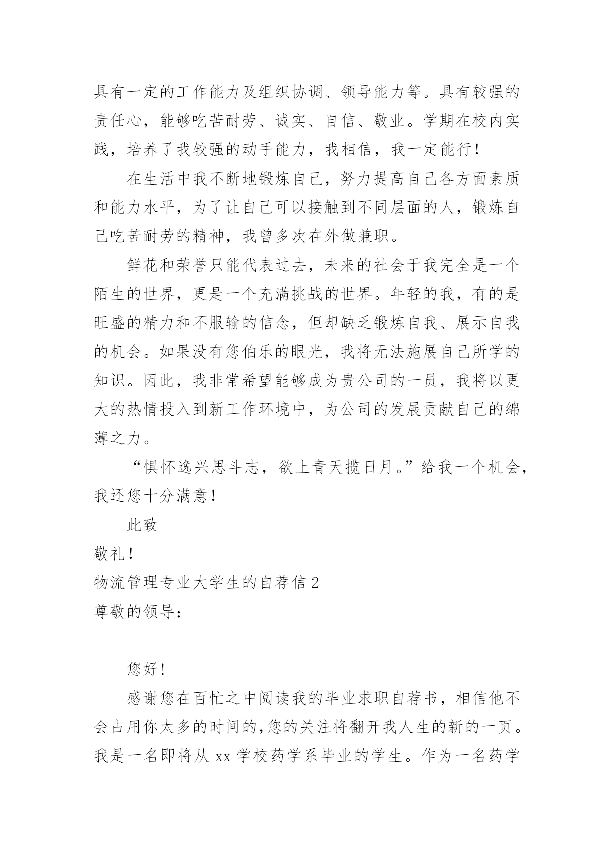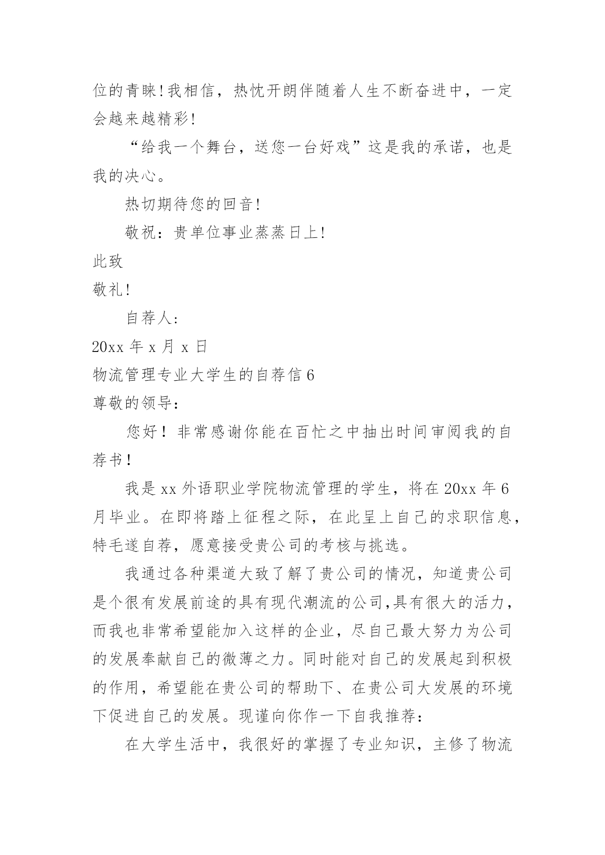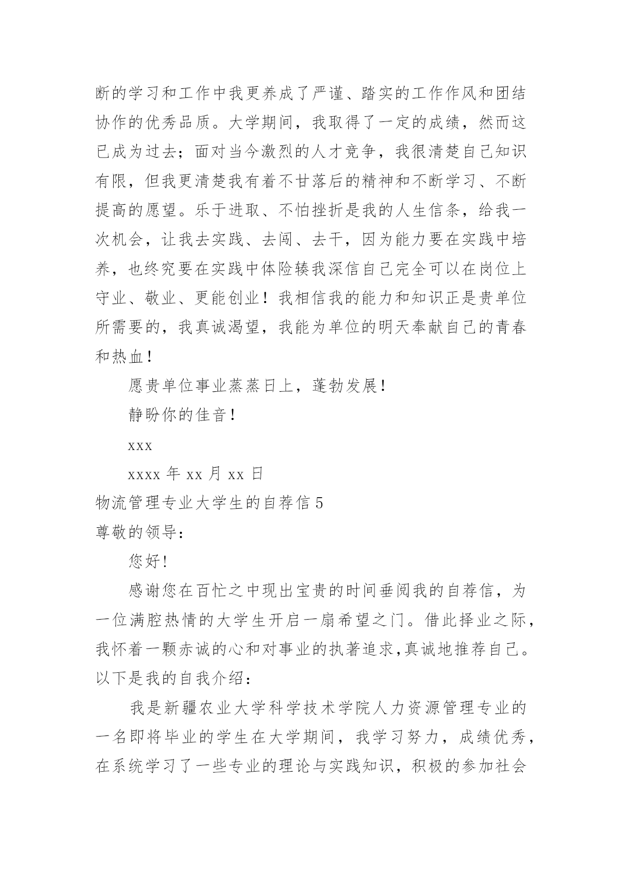 物流管理专业大学生的自荐信物流管理专业大学生的自荐信我们眼下的社会,自荐信出现的次数越来越多,自荐信也有着不同的类型。那么问题来了,自荐信应该怎么写?下面是小编帮大家整理的物流管理专业大学生的自荐信,希望能够帮助到大家。物流管理专业大学生的自荐信1尊敬的领导:您好!首先请允许我向您致以真诚的问候及良好的祝愿,非常感谢您在百忙之中垂读我的自荐信。当您亲手打开这份自荐信的那一刻,也许将会是对我人生的旅程起着决定性的一刻。我叫林玉峰,就读于江西供销商业学校物流管理专业。在校学习期间,我严格要求自己,认真遵守学校各项规章制度,集体观念强。对待学习,态度端正,刻苦努力,提高自身道德修养、行为规范,并且以社会对人才的需求为向导,努力使自己向复合型人才方向发展。在课余时间,学习计算机知识,能熟练操作办公自动化软件,并且努力培训参加了与本专业相关的技能鉴定考试及普通话水平测试,并获得二-级乙等资格证书。在校积极参加学生会,并且担任学生会秘书处秘书长一职。在班上,长期担任本班的团支部书记。具有一定的工作能力及组织协调、领导能力等。具有较强的责任心,能够吃苦耐劳、诚实、自信、敬业。学期在校内实践,培养了我较强的动手能力,我相信,我一定能行!在生活中我不断地锻炼自己,努力提高自己各方面素质和能力水平,为了让自己可以接触到不同层面的人,锻炼自己吃苦耐劳的精神,我曾多次在外做兼职。鲜花和荣誉只能代表过去,未来的社会于我完全是一个陌生的世界,更是一个充满挑战的世界。年轻的我,有的是旺盛的精力和不服输的信念,但却缺乏锻炼自我、展示自我的机会。如果没有您伯乐的眼光,我将无法施展自己所学的知识。因此,我非常希望能够成为贵公司的一员,我将以更大的热情投入到新工作环境中,为公司的发展贡献自己的绵薄之力。“惧怀逸兴思斗志,欲上青天揽日月。”给我一个机会,我还您十分满意!此致敬礼!物流管理专业大学生的自荐信2尊敬的领导:您好!感谢您在百忙之中阅读我的毕业求职自荐书,相信他不会占用你太多的时间的,您的关注将翻开我人生的新的一页。我是一名即将从xx学校药学系毕业的学生。作为一名药学专业的学生,我热爱我的专业,并未其投入巨大的热情和精力。在校期间,我努力的学习基础课,钻研专业知识,系统的学习了药理学、药剂学、药物分析、天然药化、中药学、药事管理等课程,通过学习这些知识,不仅学到了专业知识,增强了综合素质,更重要的事教会了怎么做人,培养了我严谨务实、求索创新的个人素养,为以后的职业需求打下了扎实的基础。英语能力一般,熟练的掌握计算机的一般理论与技术操作。为了使专业知识与实际工作联系紧密,暑假期间曾去医院药房见习了几周,在见习的过程中,我学会了如何发药,盘药,如何与患者交流,理论联系实际,把全心全意为人民服务牢记心中,以礼待人,热情服务,耐心解答问题,在不断的实践中增强自身素质和工作水准,让患者能够用到安全有效,稳定的药品而不断努力。作为一位刚走出校门的大学生,我认为最缺乏的是丰富的社会实践和工作经验,这或许会让您犹豫不决,但我有着青年人的热情和赤诚,希望能在更广阔的天地里展露自己的才能,我不满足于现在的水平,期望在实践中得到增强,我期望加入你们的团队,用我自己的聪明才智,来做好每一份工作,我相信经过自己的努力和奋斗,一定会有所收获。最后我希望贵公司能够聘用我,也祝贵公司蒸蒸日上,百尺竿头,希望各位领导能够对我给予认真考虑,静候您的佳音。此致敬礼!自荐人:xxx20xx年x月x日物流管理专业大学生的自荐信3尊敬的贵领导:您好!我的名字,我是xx外语外贸职业学院成教学院的物流管理专业的一名学生,即将面临毕业。三年来,在师友的严格教益及个人的努力下,我具备了扎实的专业基础知识,系统地掌握了《管理学基础》、《统计学基础》、《经济学基础》、《基础会计》、《货物学》、《供应链管理物流信息技术》等有关理论;熟悉涉外工作常用礼仪;具备较好的英语听、说、读、写、译等能力;能熟练操作计算机办公软件。此外我还积极地参加各种社会活动,抓住每一个机会,锻炼自己。大学三年,我深深地感受到,与优秀学生共事,使我在竞争中获益;向实际困难挑战,让我在挫折中成长。十多年的寒窗苦读,现在的我已豪情满怀、信心十足。事业上的成功需要知识、毅力、汗水、机会的完美结合。同样,一个单位的荣誉需要承载她的载体——人的无私奉献。我恳请贵单位给我一个机会,让我有幸成为你们中的一员,我将以百倍的热情和勤奋踏实的工作来回报您的知遇之恩。期盼能得到您的回音!此致敬礼!自荐人:物流管理专业大学生的自荐信4尊敬的领导:你好!我是xx外语职业学院物流管理的学生,将在20xx年x月毕业。在即将踏上征程之际,在此呈上自己的求职信息,特毛遂自荐,愿意接受贵公司的考核与挑选。我通过各种渠道大致了解了贵公司的情况,知道贵公司是个很有发展前途的具有